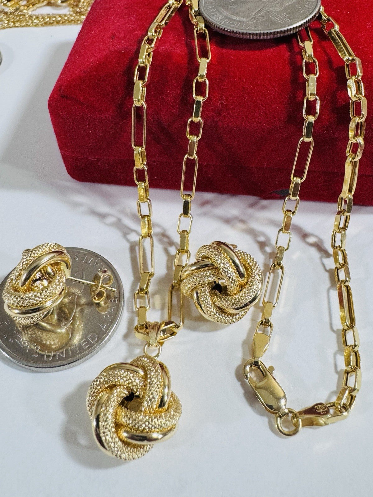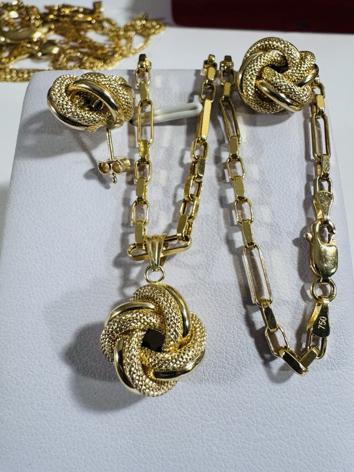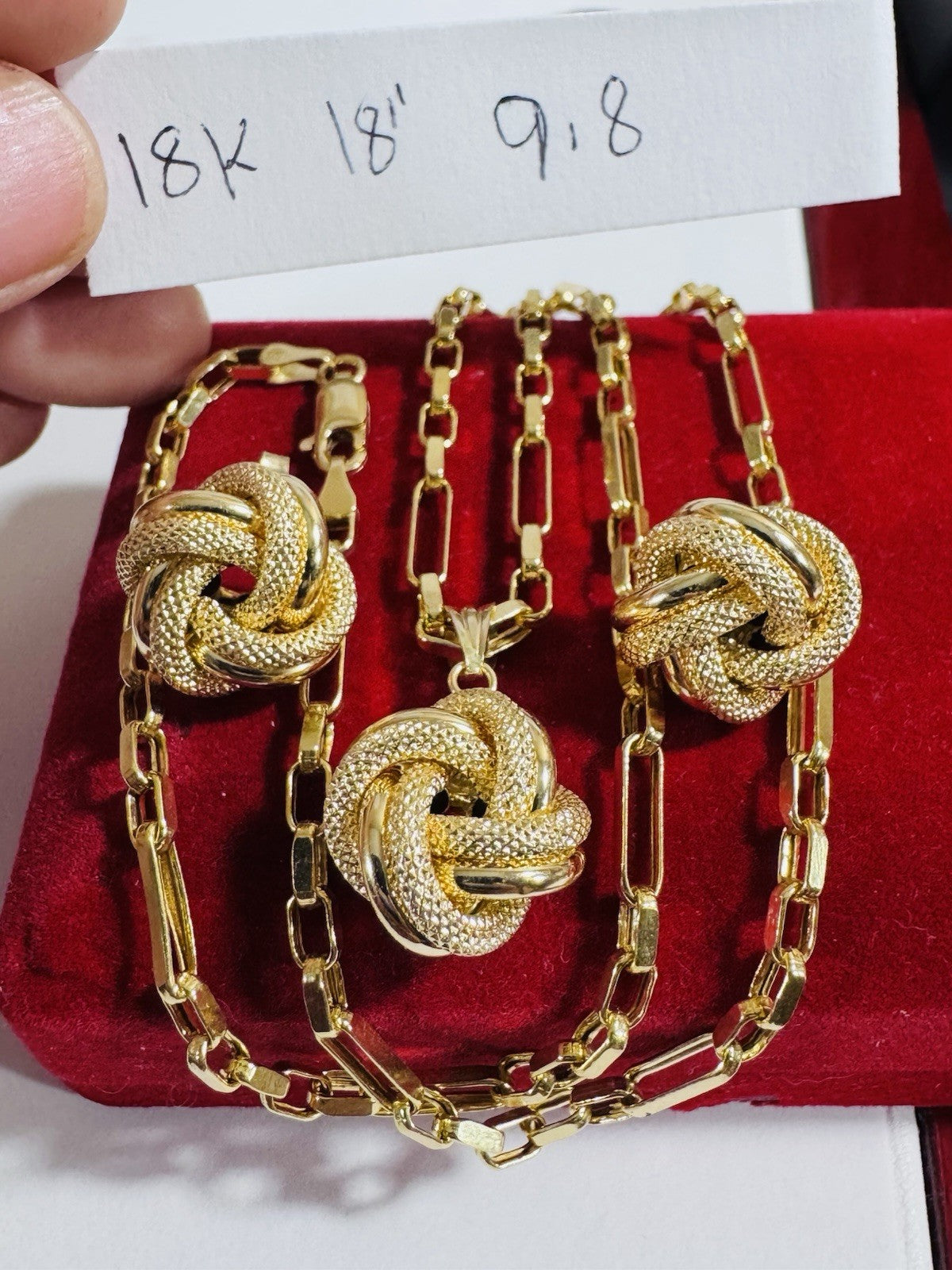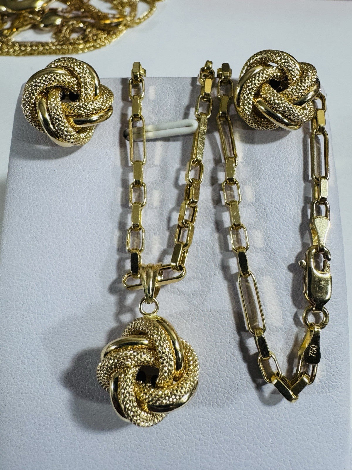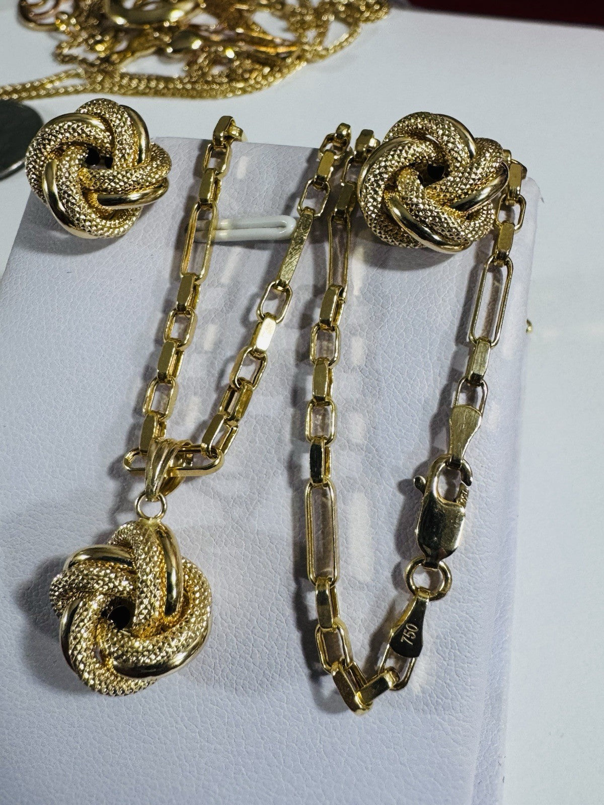 18K 750 Real Genuine Gold Knot Earring & Necklace 18” Inch Long 9.8g 3.2mm