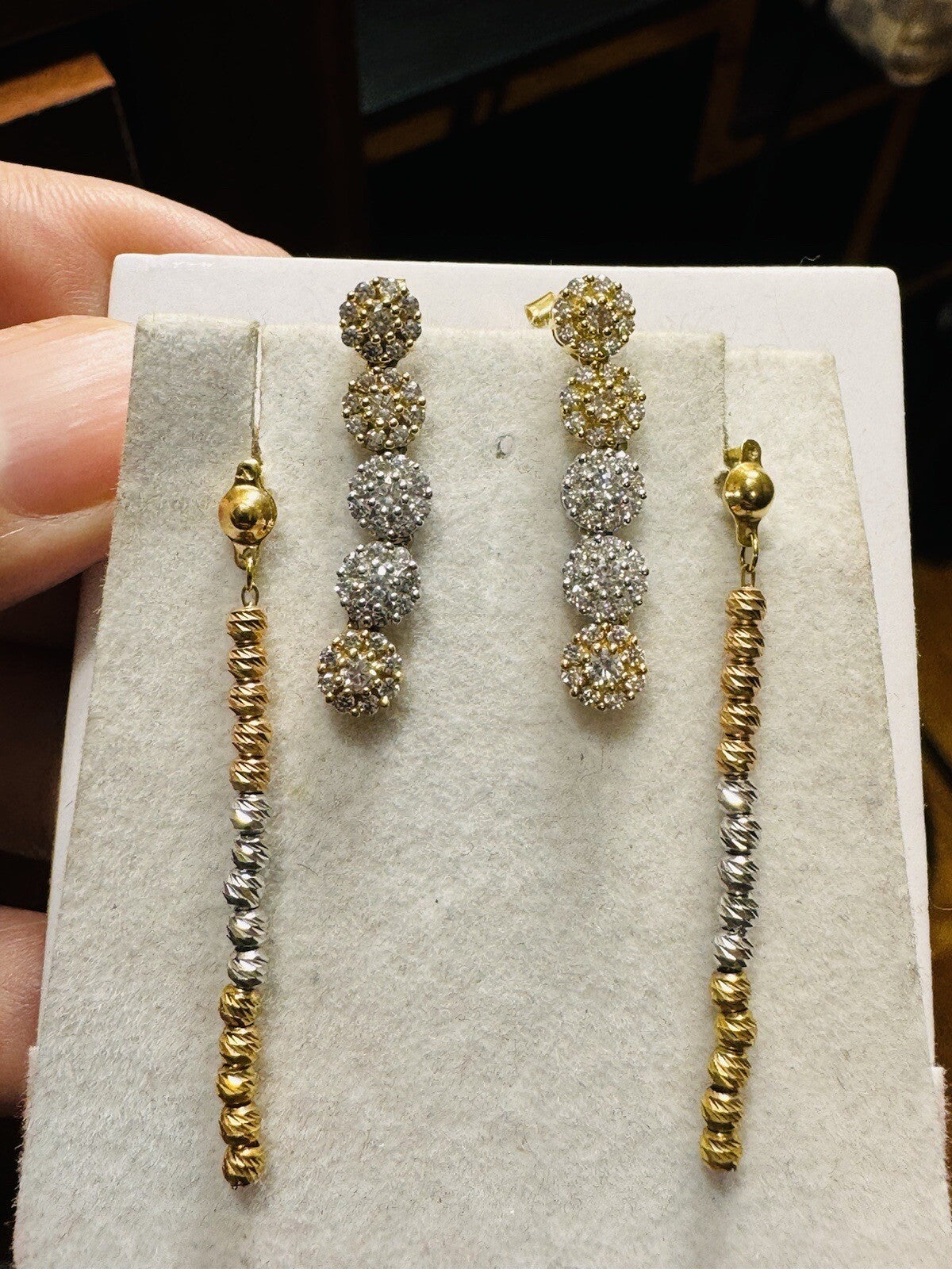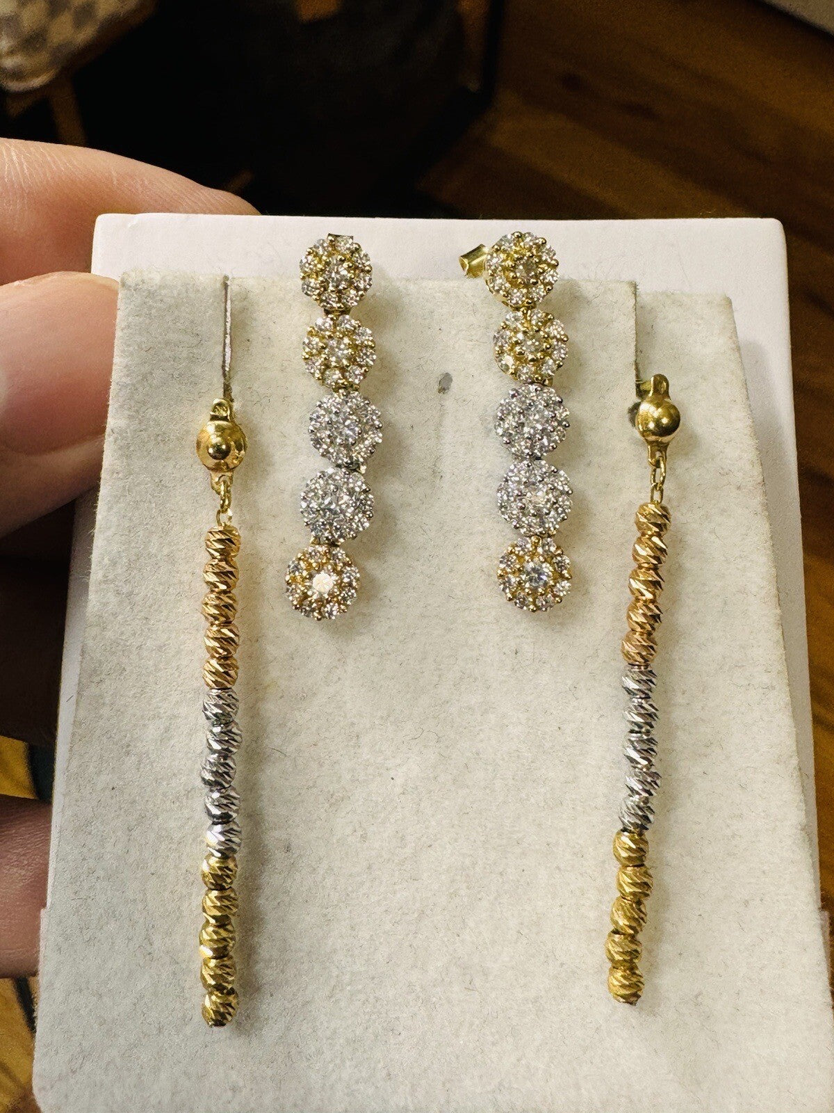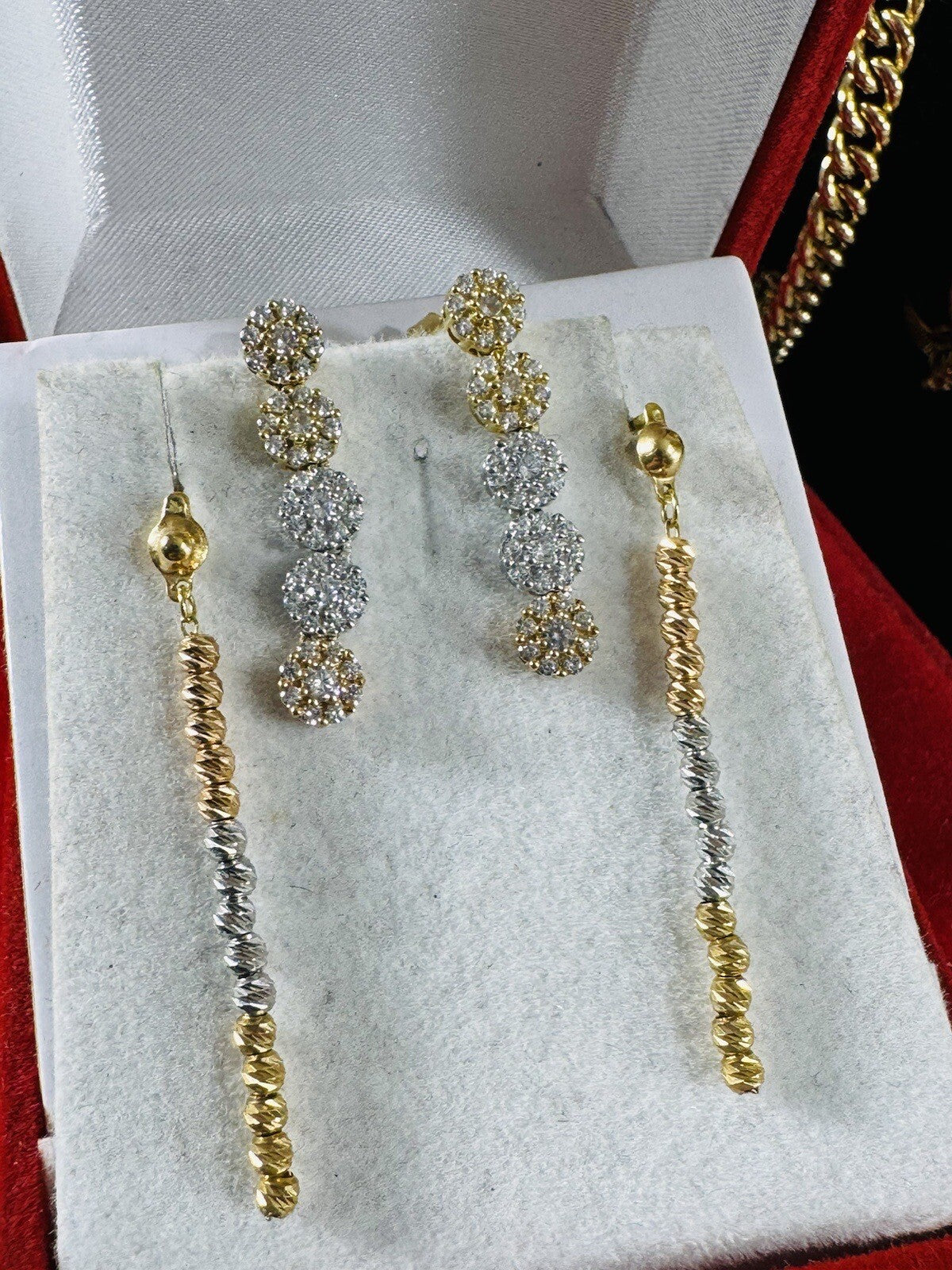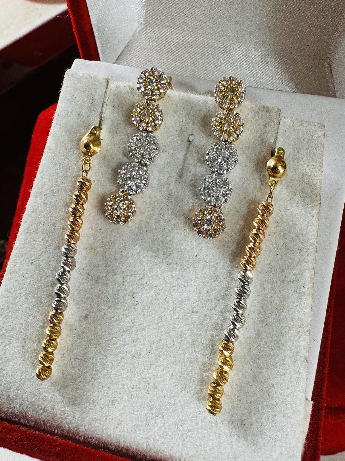 You are buying Beautiful Solid 18K Earring 750 Fine Saudi Real Gold Women’s 2 set Dangle Earrings 5.4g Stone is Not real diamond. Tricolors- Fast Ship!