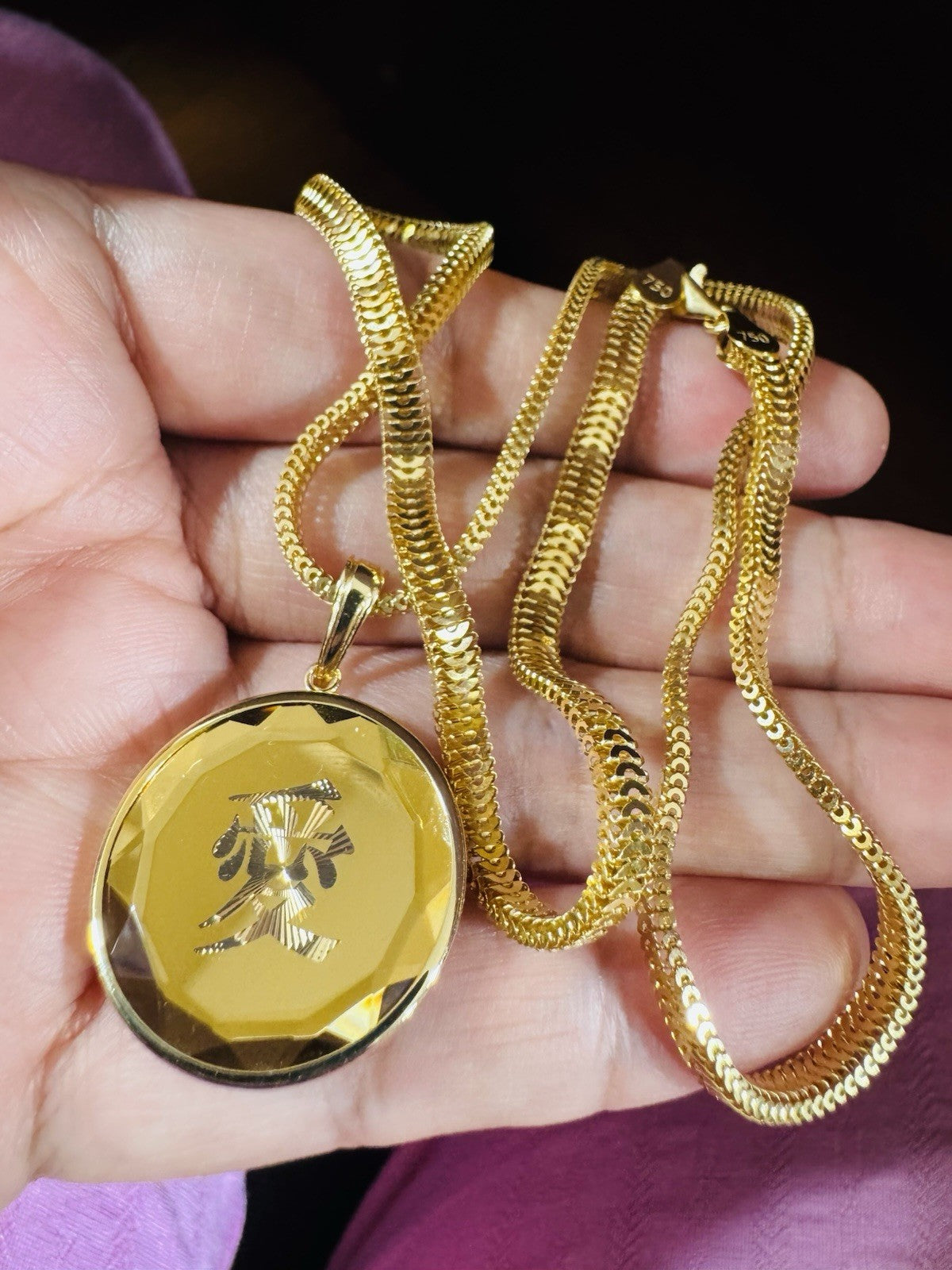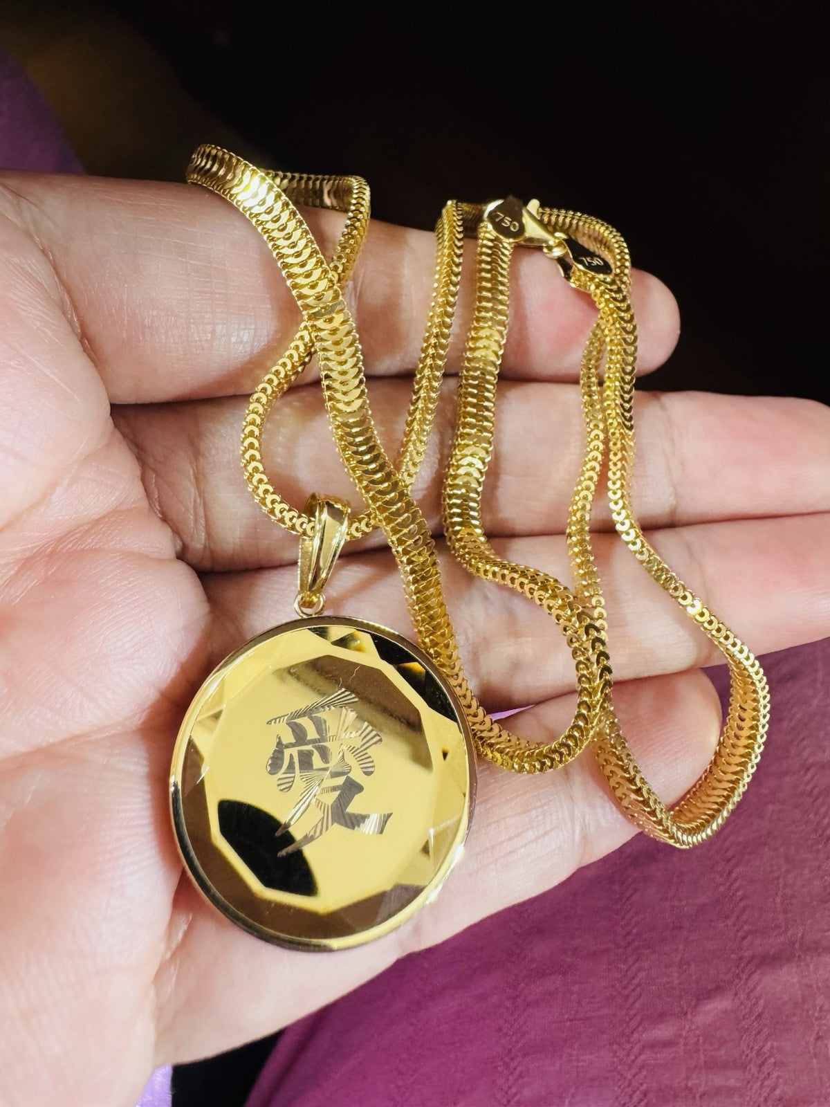 • Its reversible Pendant its Japan gold Pendant has glass on top. Avoid water for moist! But Chain is Dubai UAE maker.