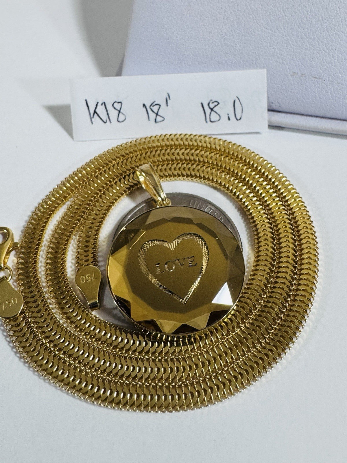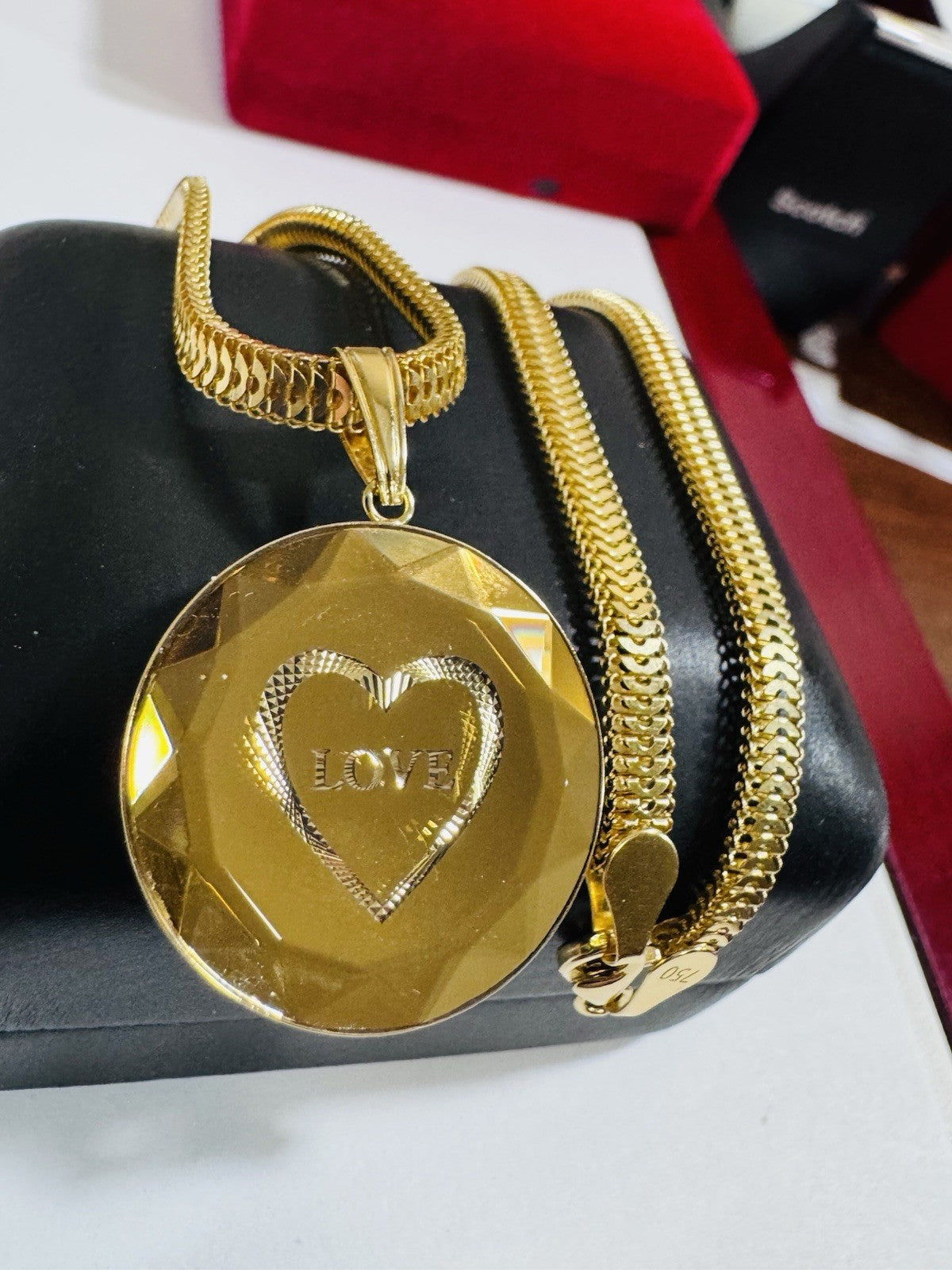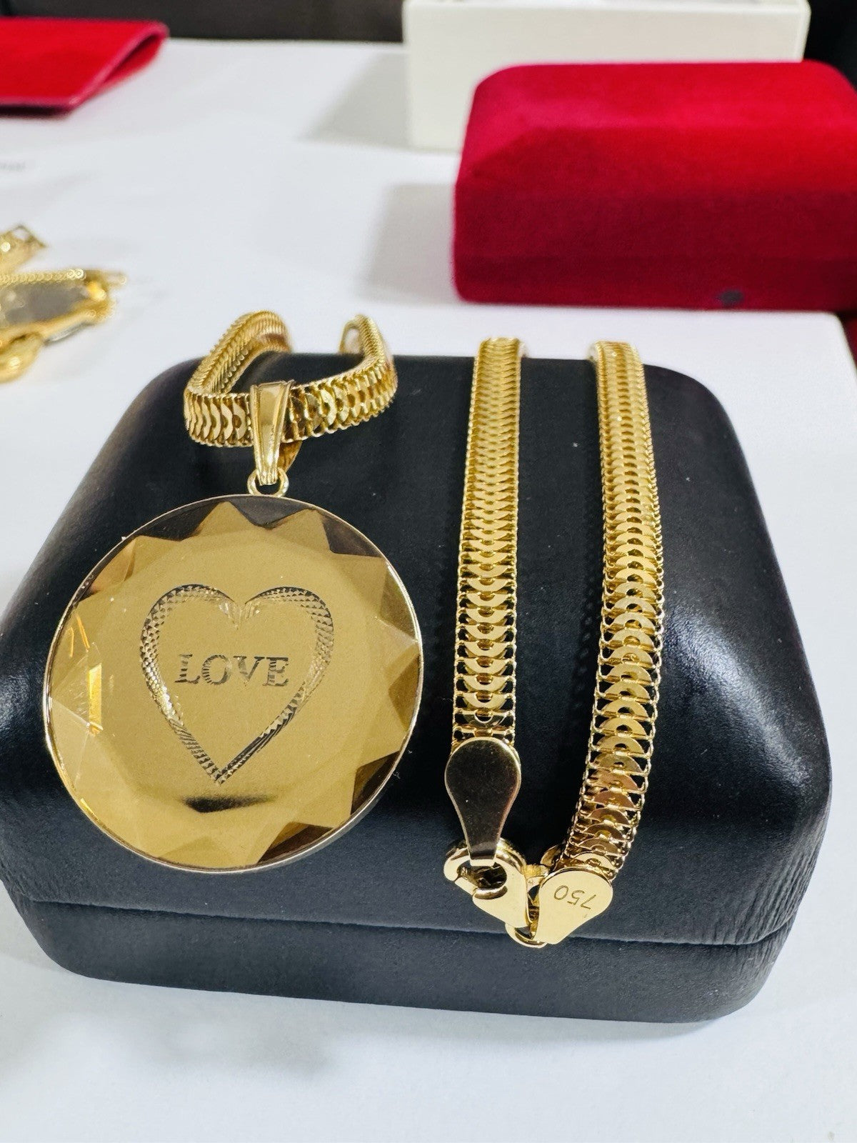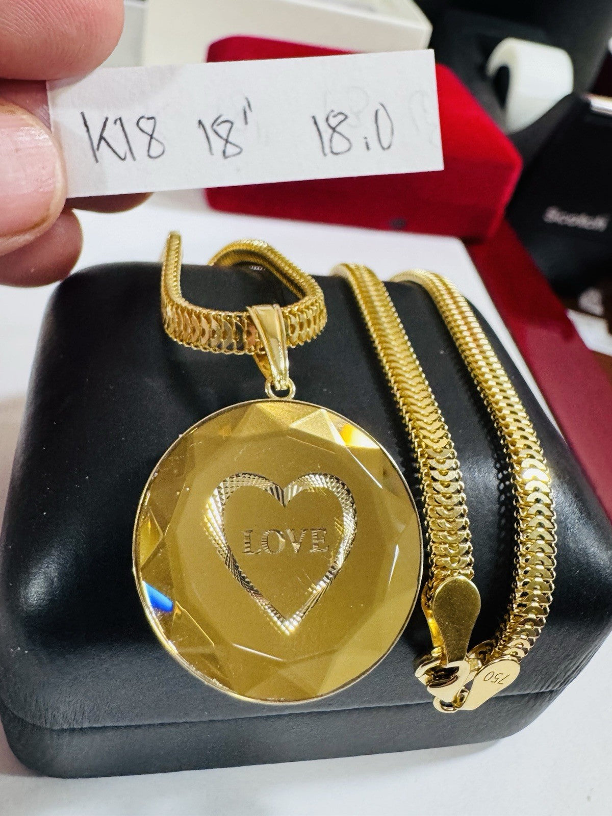 This beautiful Set Necklace is expertly crafted in K18 18K 750 with Yellow Gold Love Pendant features a stunning 18” inch chain with a secured clasp with 3.2mm wide. 18 grams Reversible pendant.