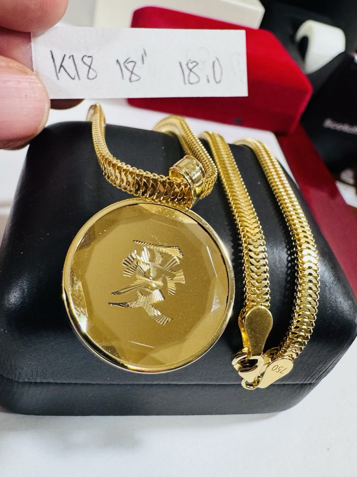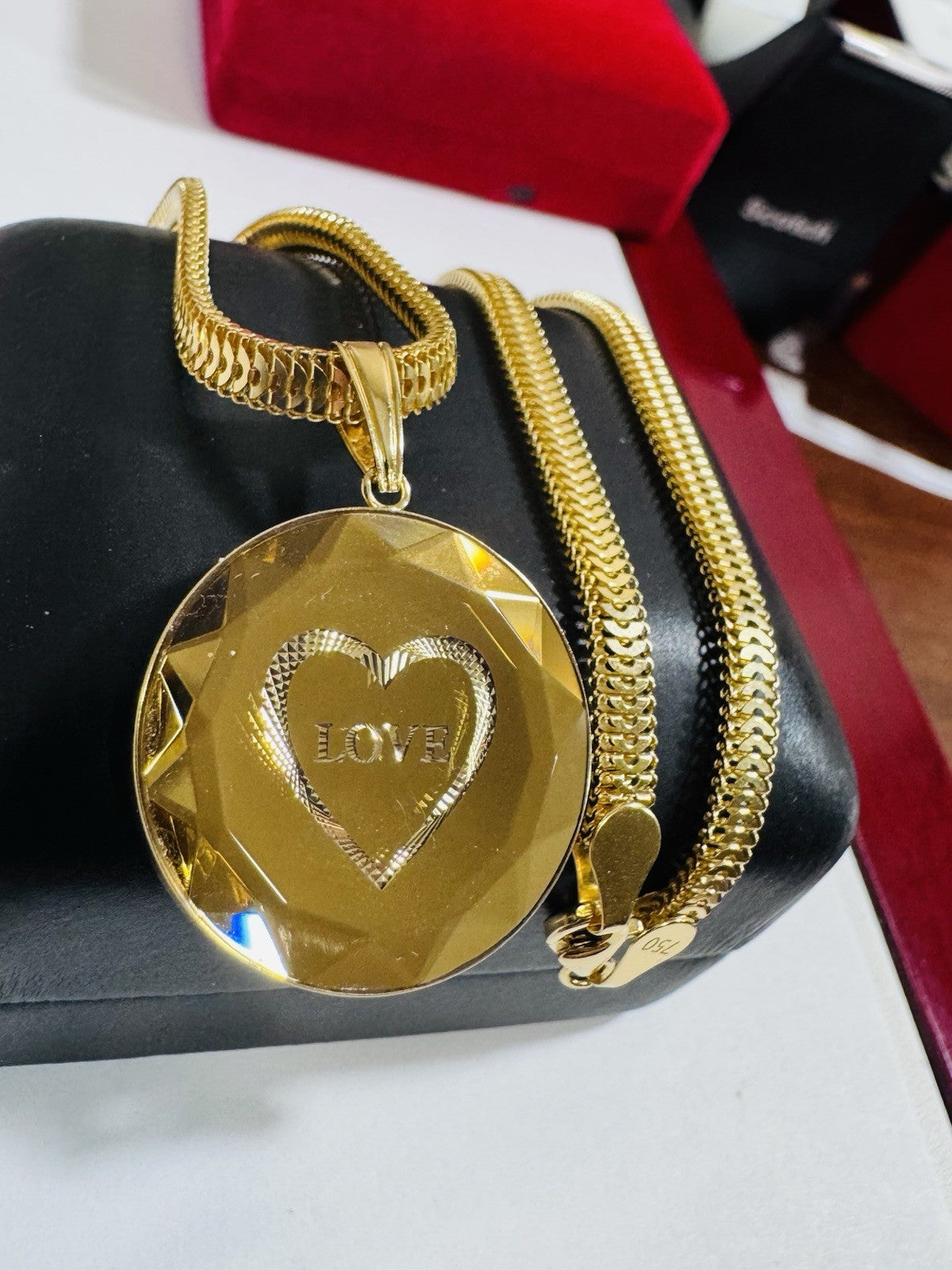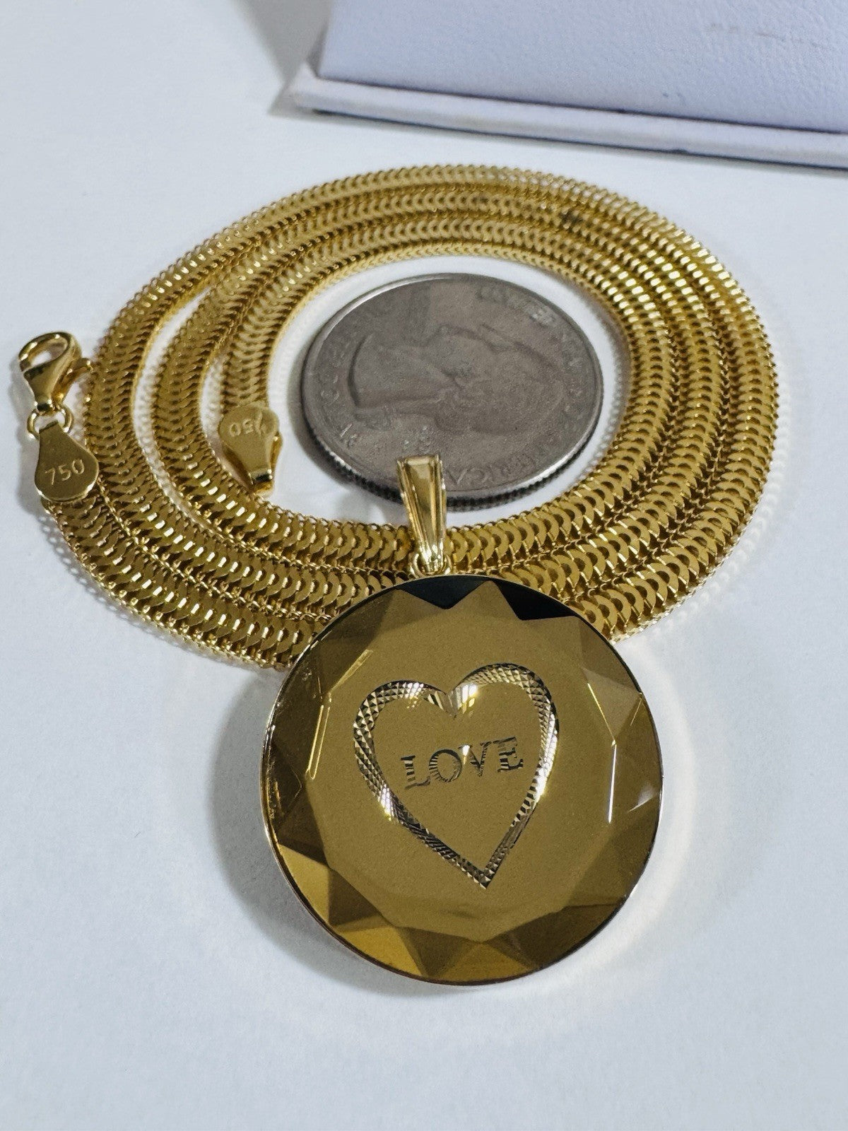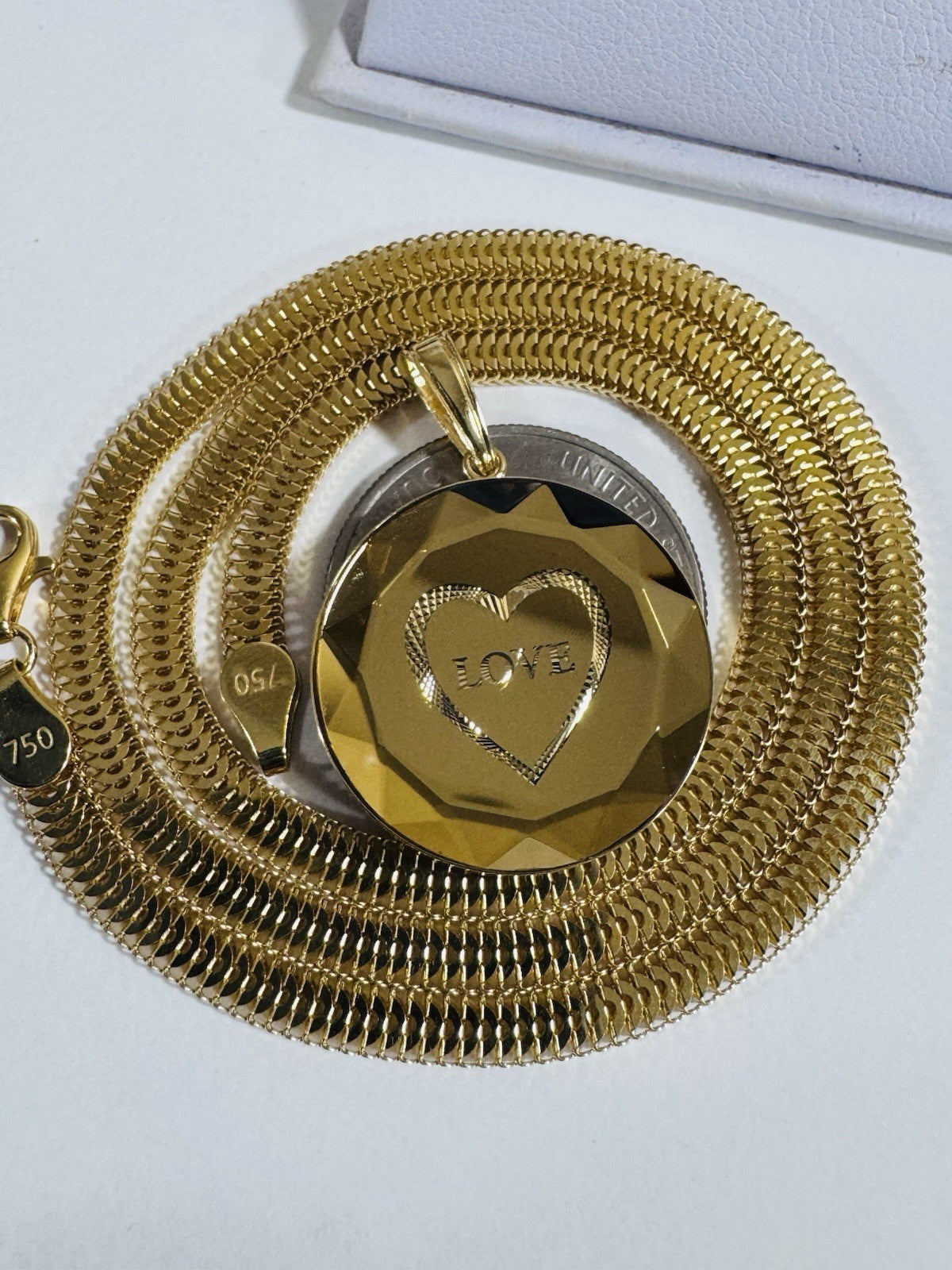 This beautiful Set Necklace is expertly crafted in K18 18K 750 with Yellow Gold Love Pendant features a stunning 18” inch chain with a secured clasp with 3.2mm wide. 18 grams Reversible pendant.