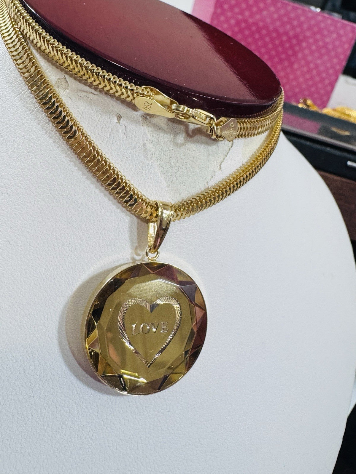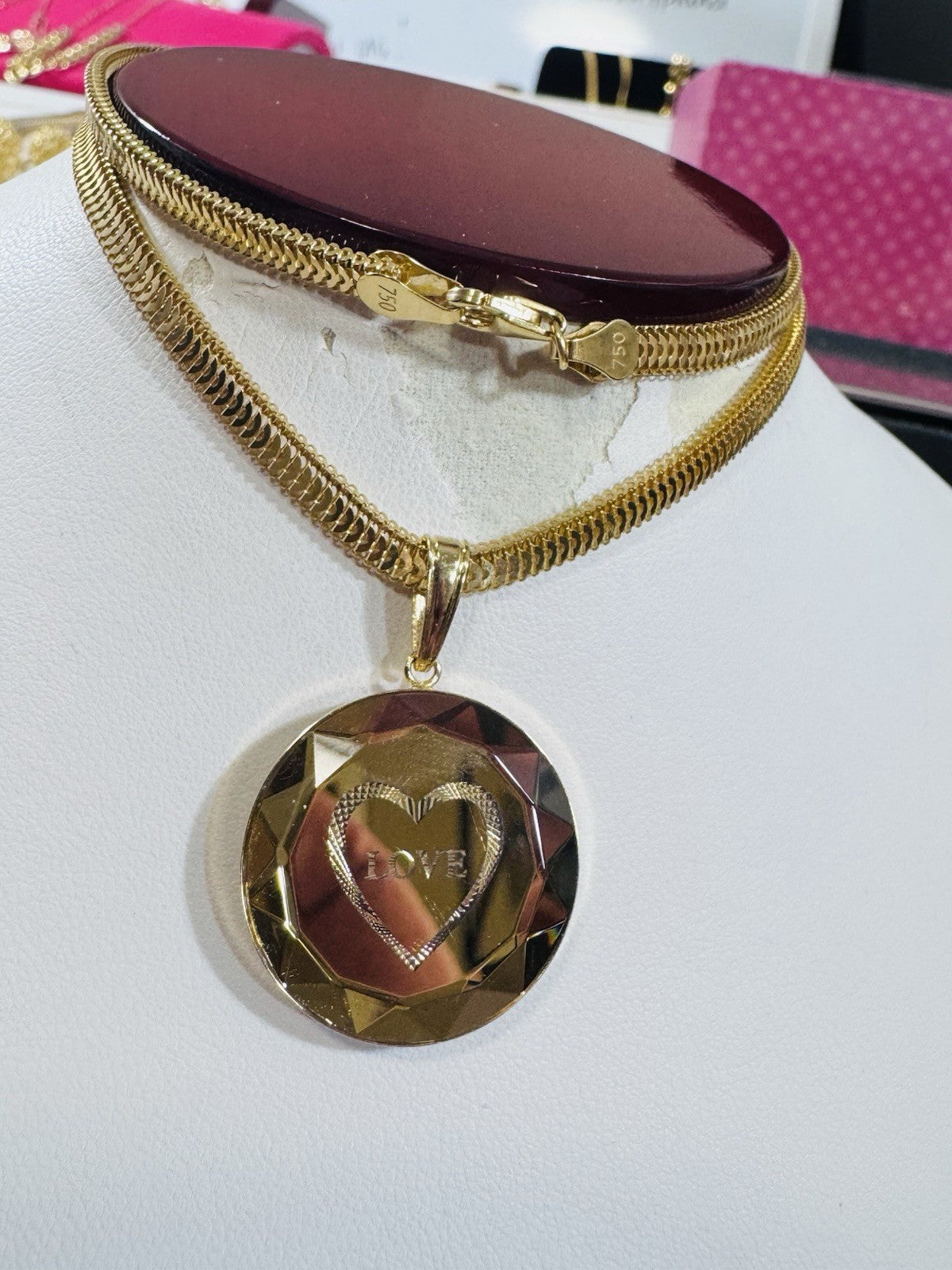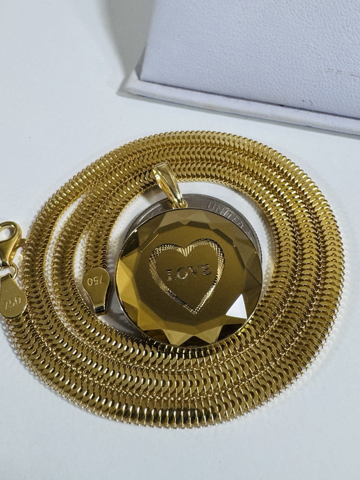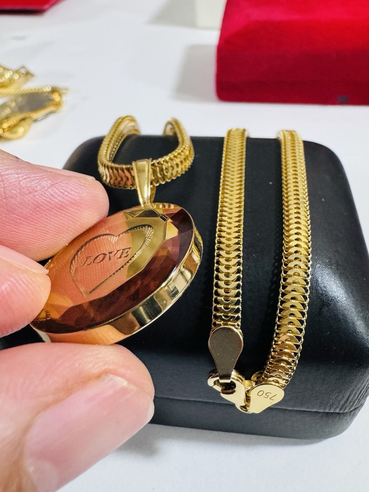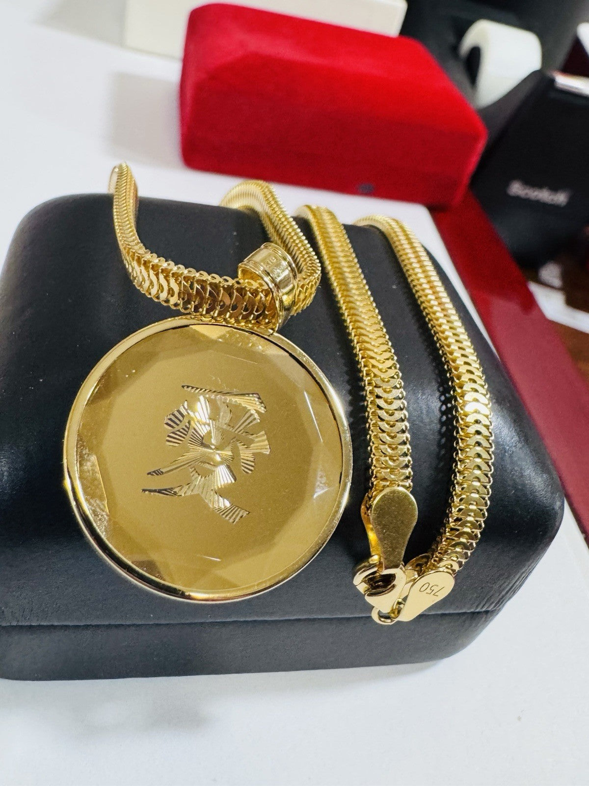 This beautiful Set Necklace is expertly crafted in K18 18K 750 with Yellow Gold Love Pendant features a stunning 18” inch chain with a secured clasp with 3.2mm wide. 18 grams Reversible pendant.