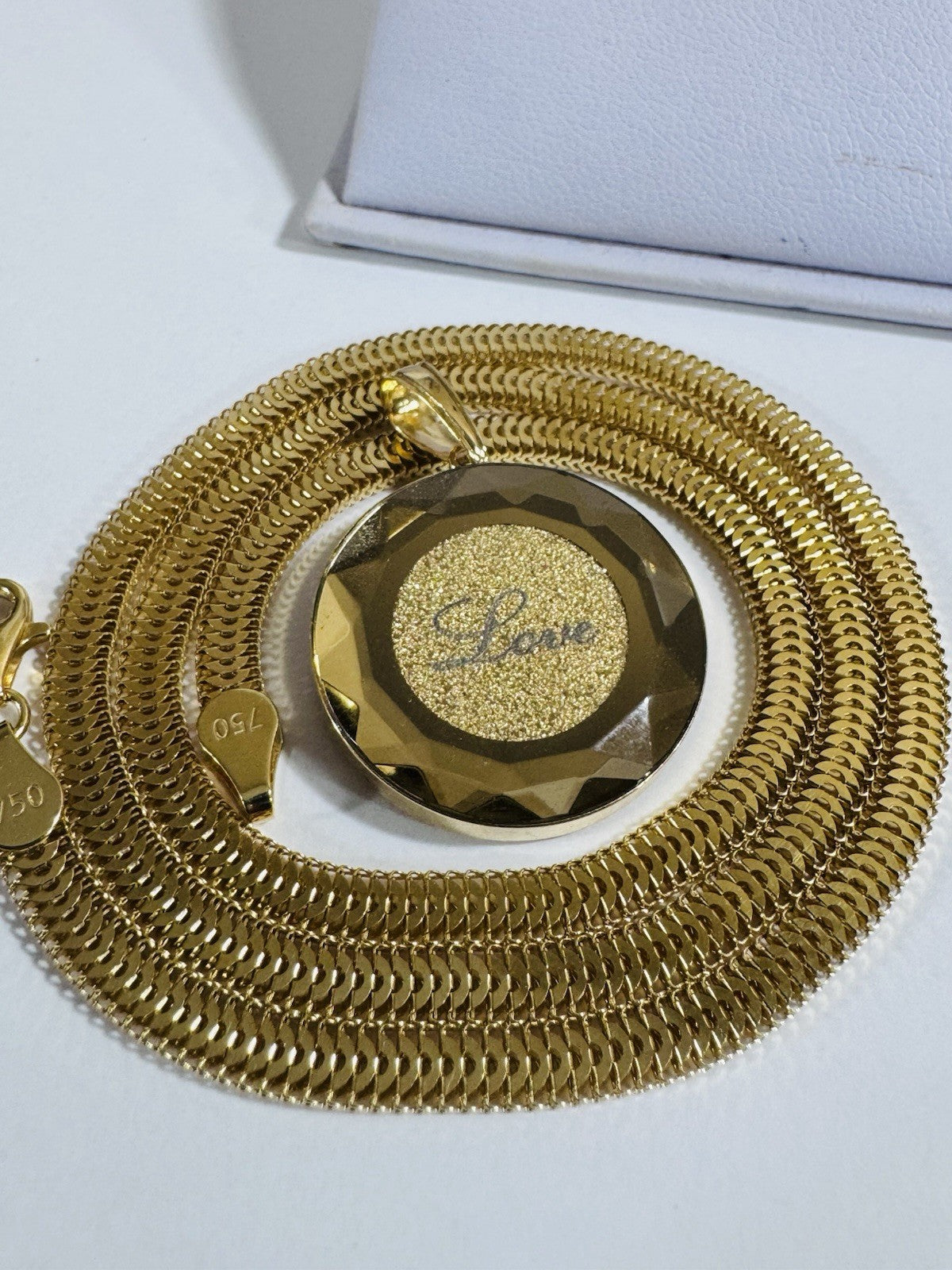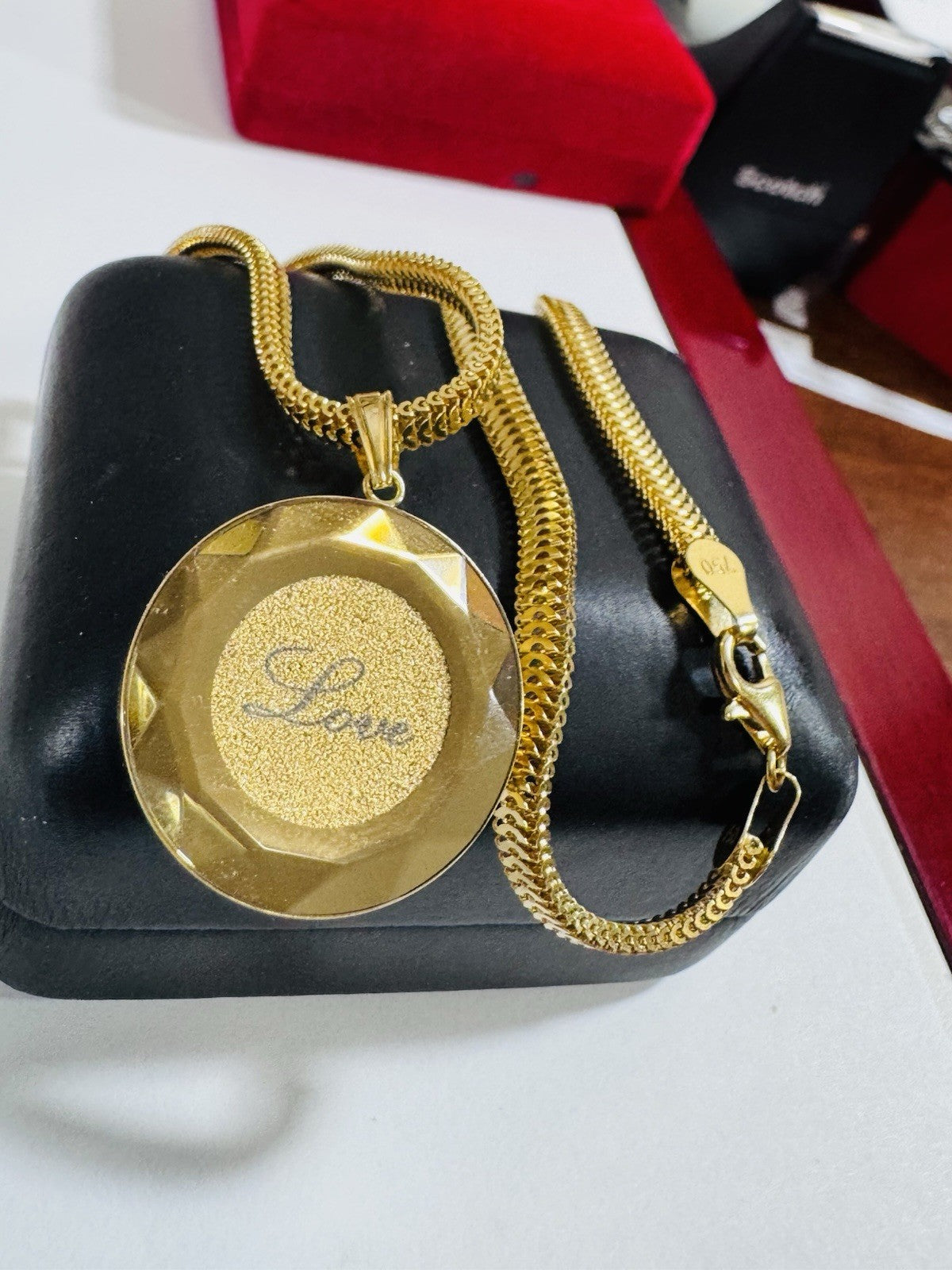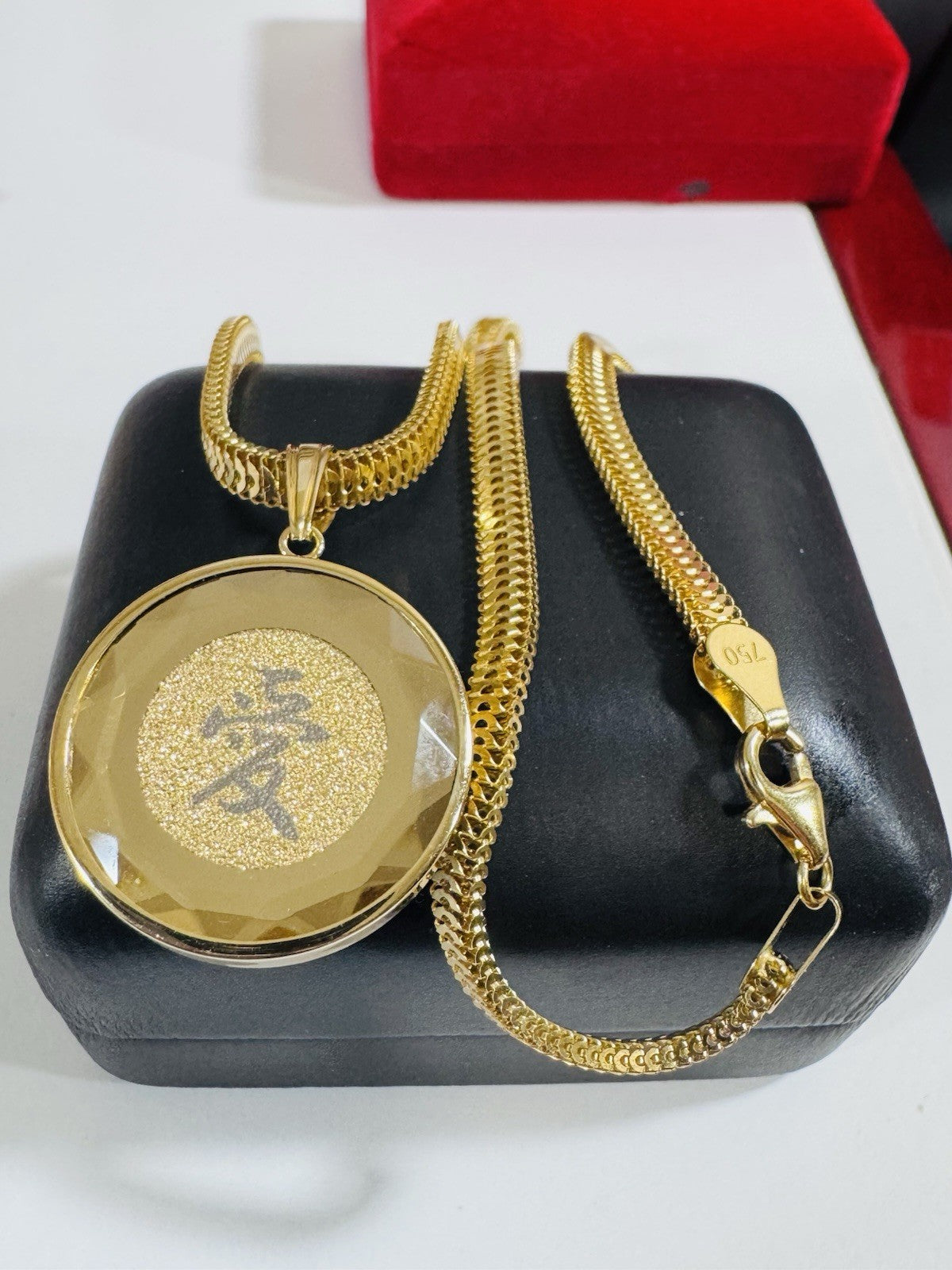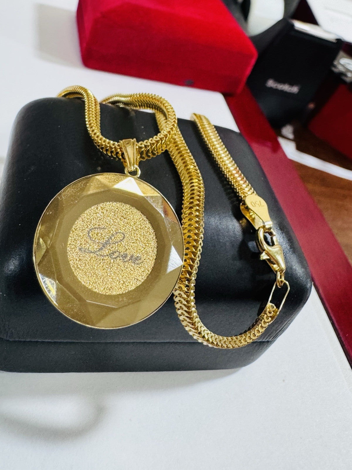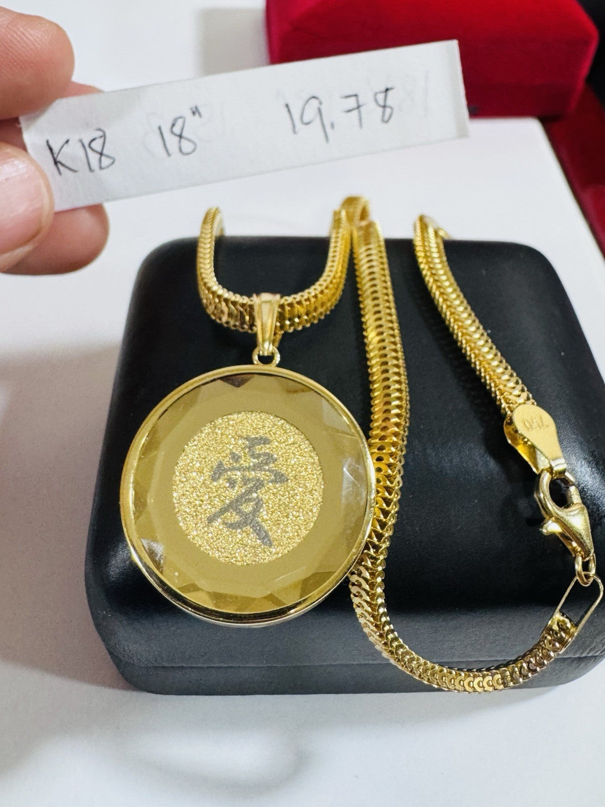 This beautiful Set Necklace is expertly crafted in K18 18K 750 with Yellow Gold Love Pendant features a stunning 18” inch chain with a secured clasp with 3.2mm wide. 19.78 grams Reversible pendant.