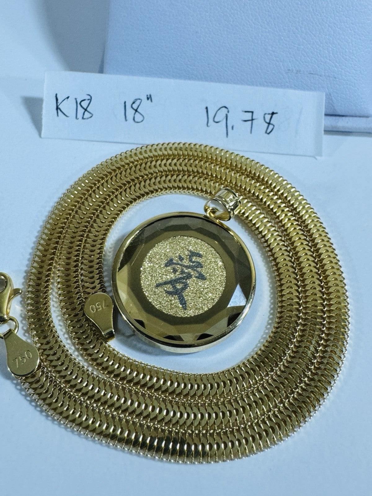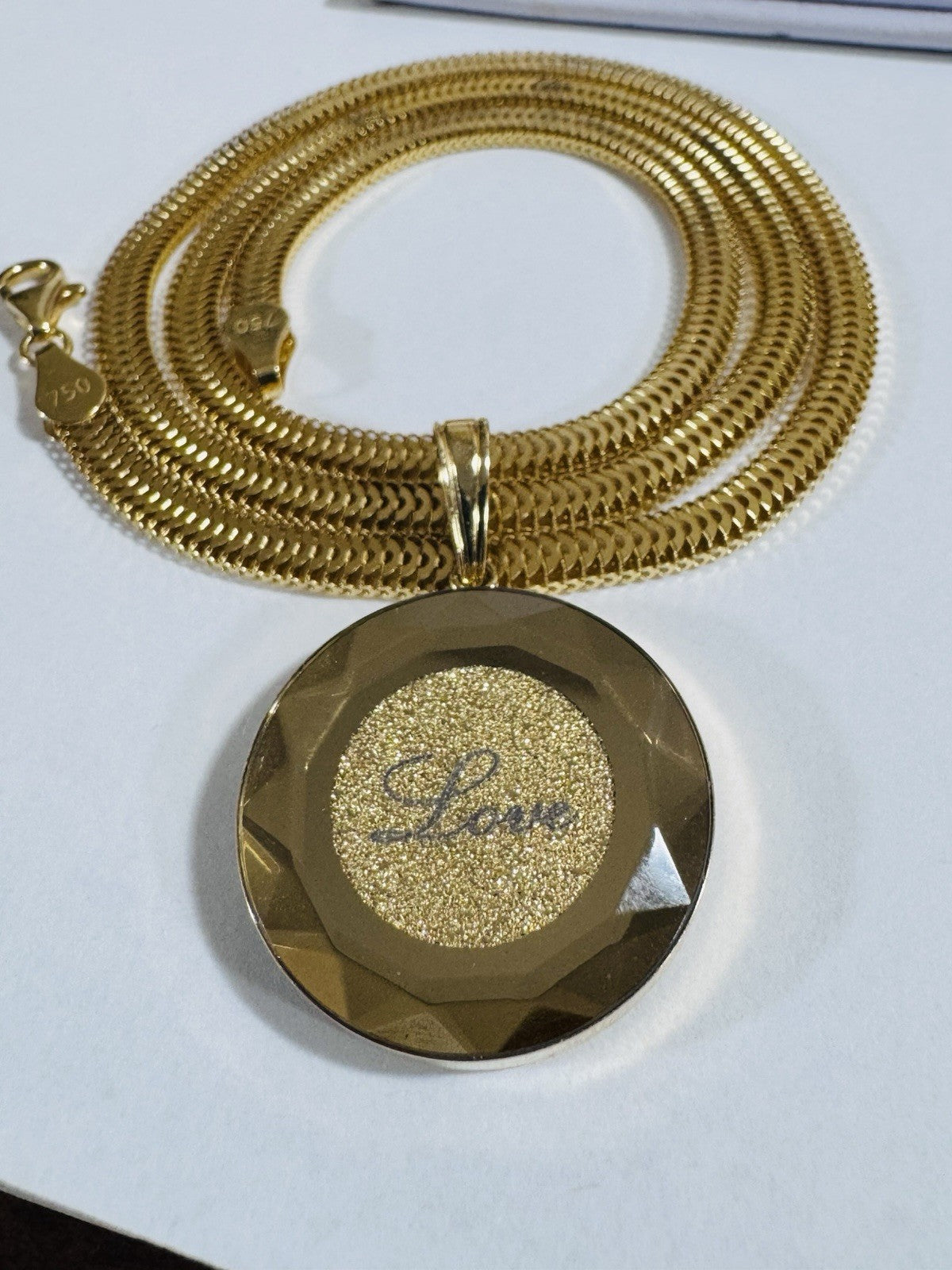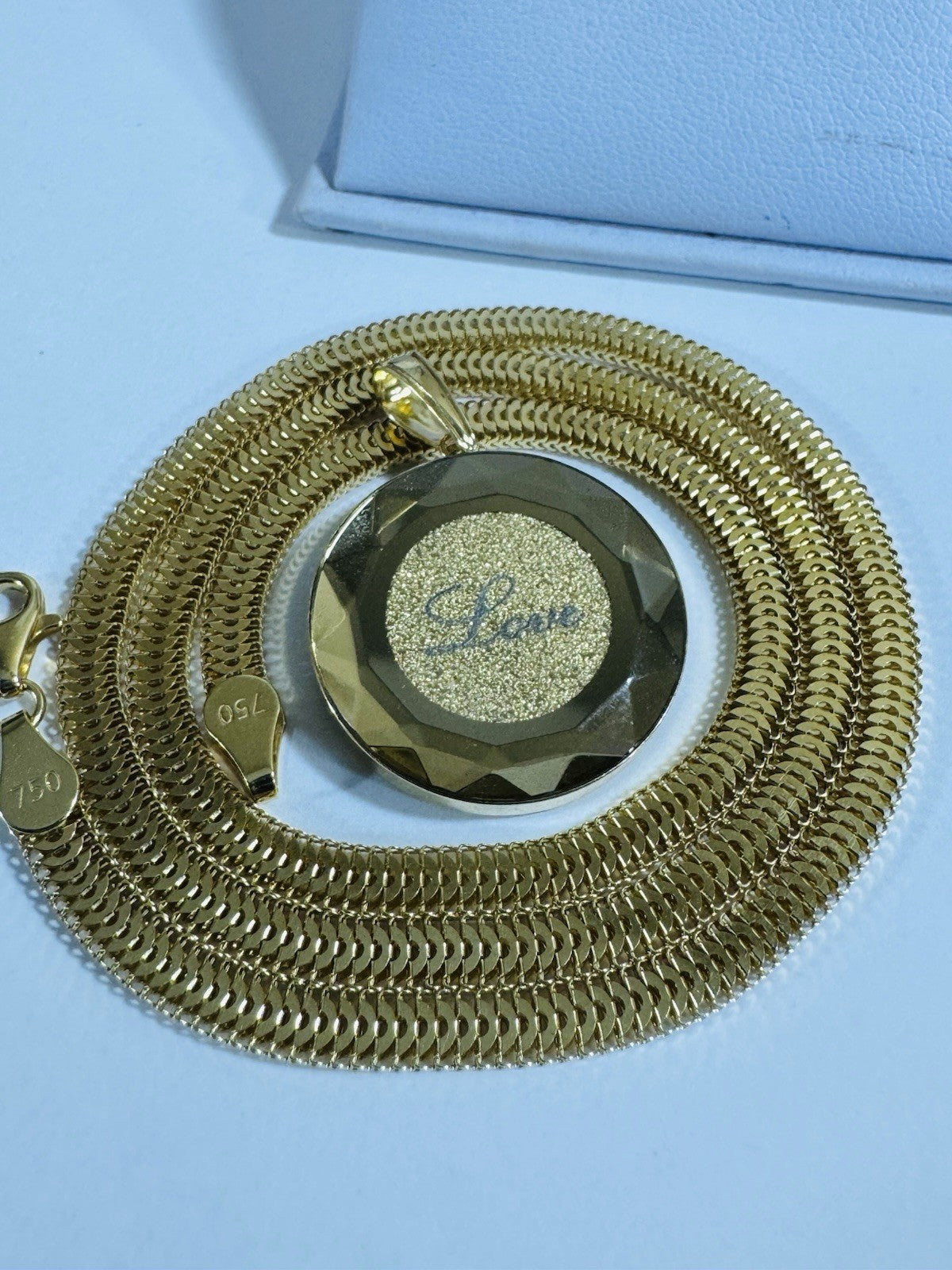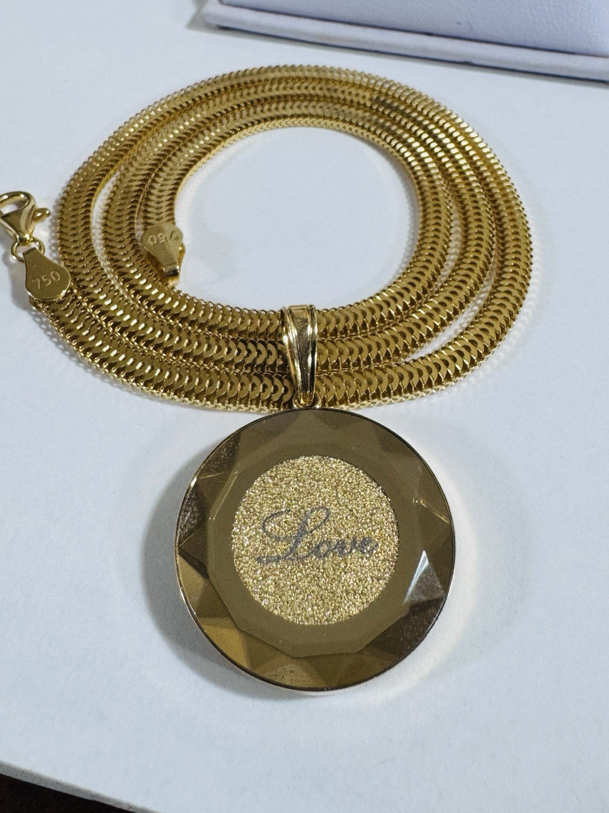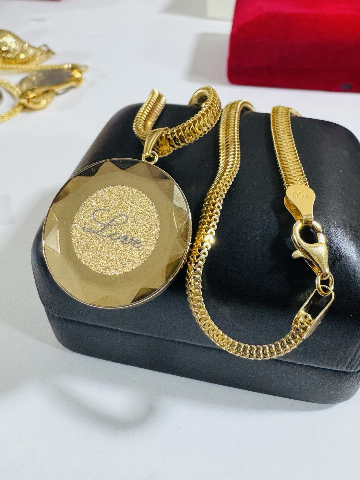 This beautiful Set Necklace is expertly crafted in K18 18K 750 with Yellow Gold Love Pendant features a stunning 18” inch chain with a secured clasp with 3.2mm wide. 19.78 grams Reversible pendant.