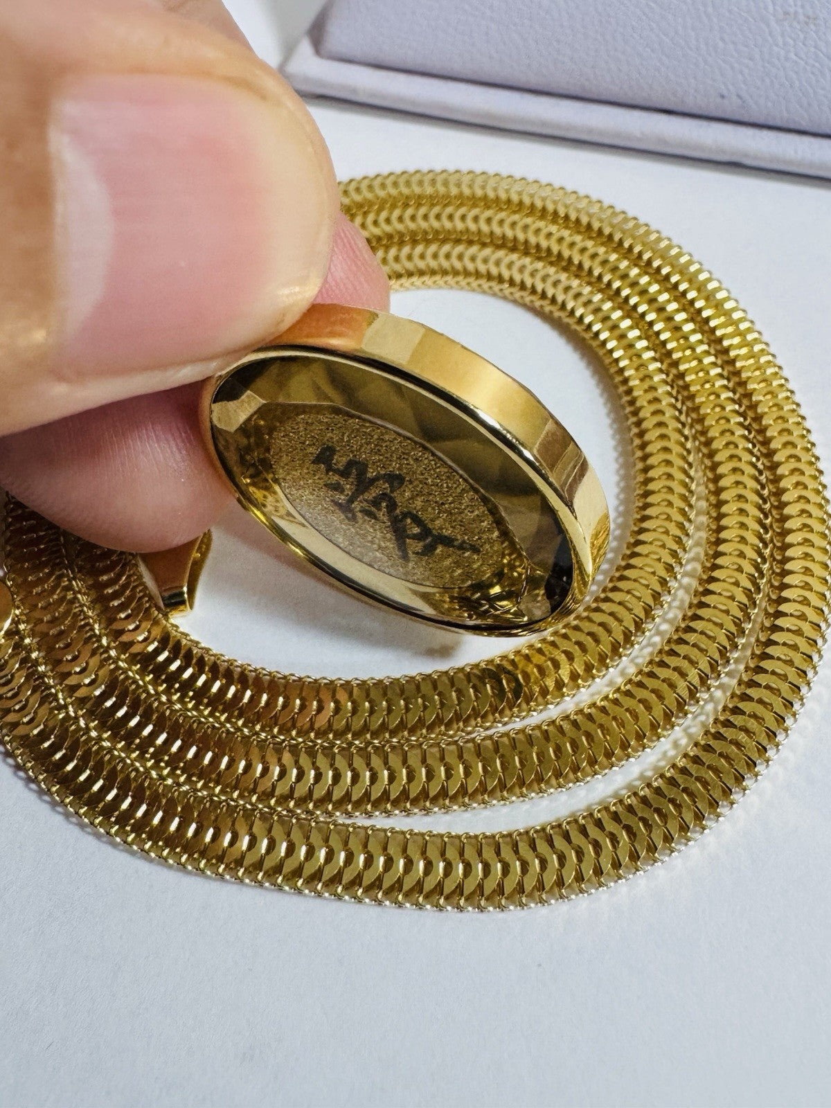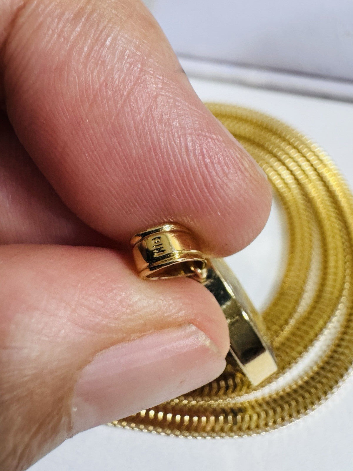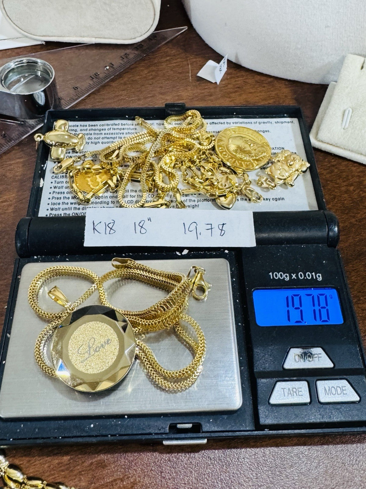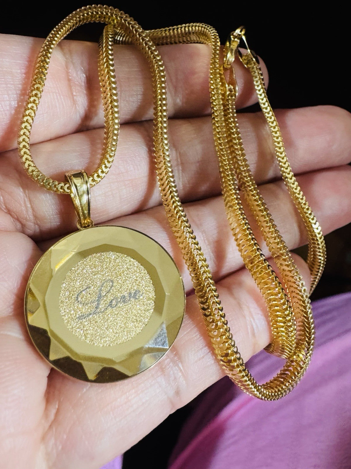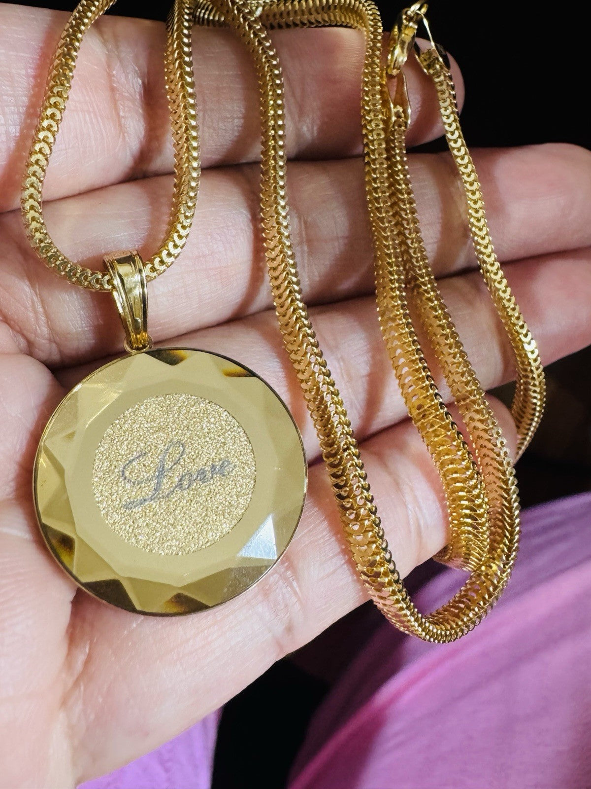 This beautiful Set Necklace is expertly crafted in K18 18K 750 with Yellow Gold Love Pendant features a stunning 18” inch chain with a secured clasp with 3.2mm wide. 19.78 grams Reversible pendant.