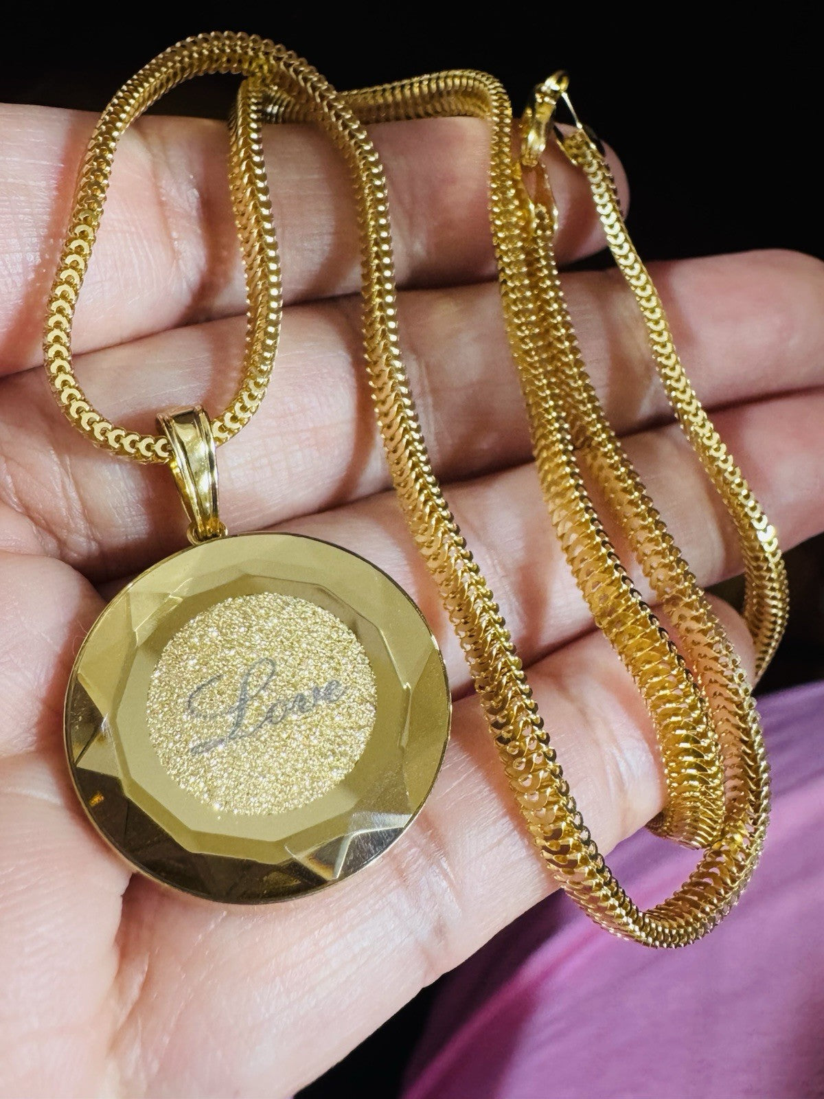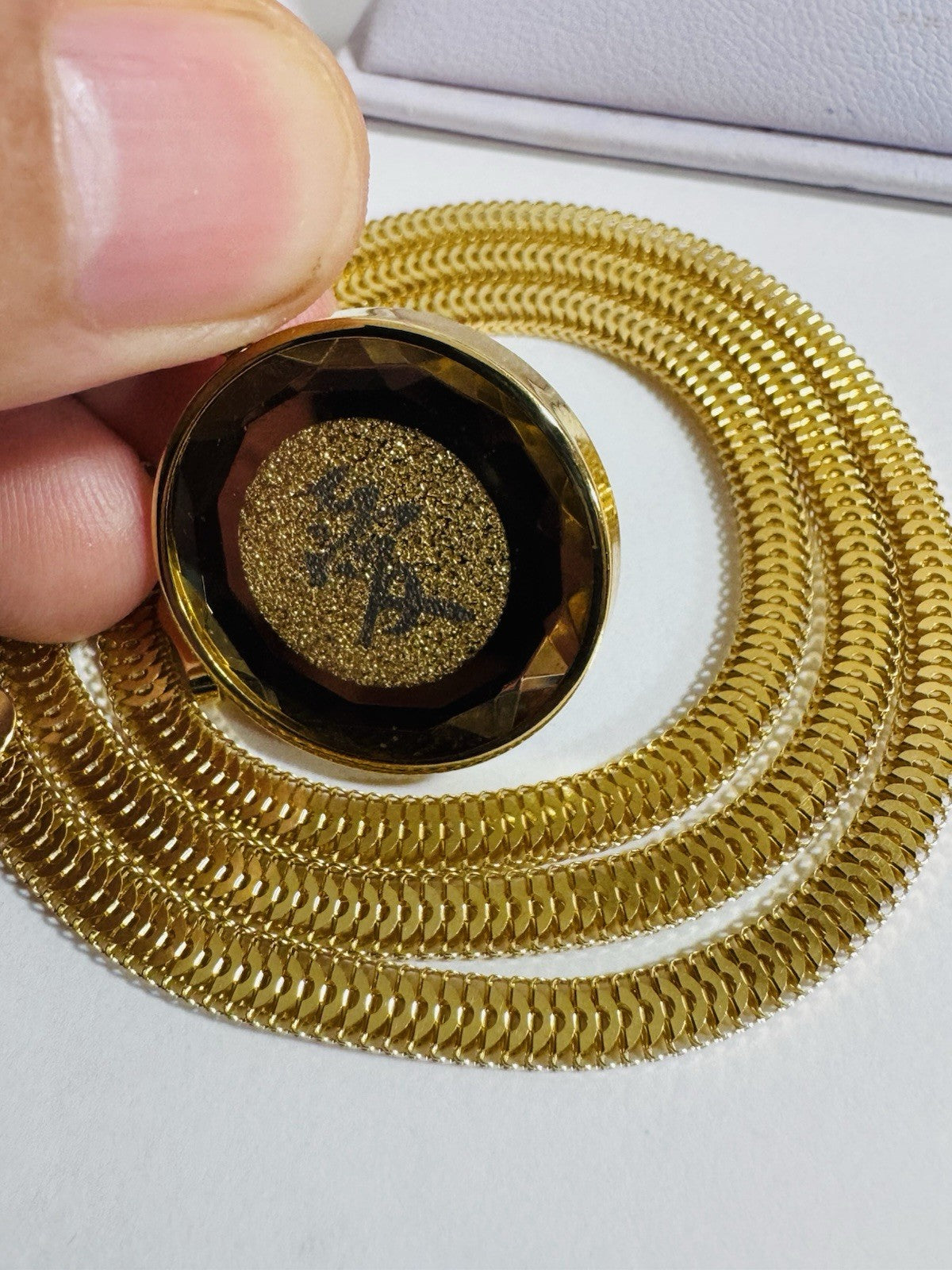 • Its reversible Pendant its Japan gold Pendant has glass on top. Avoid water for moist! But Chain is Dubai UAE maker.