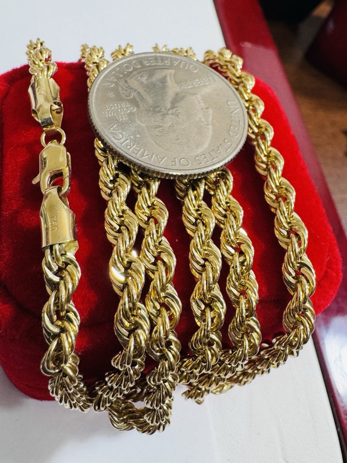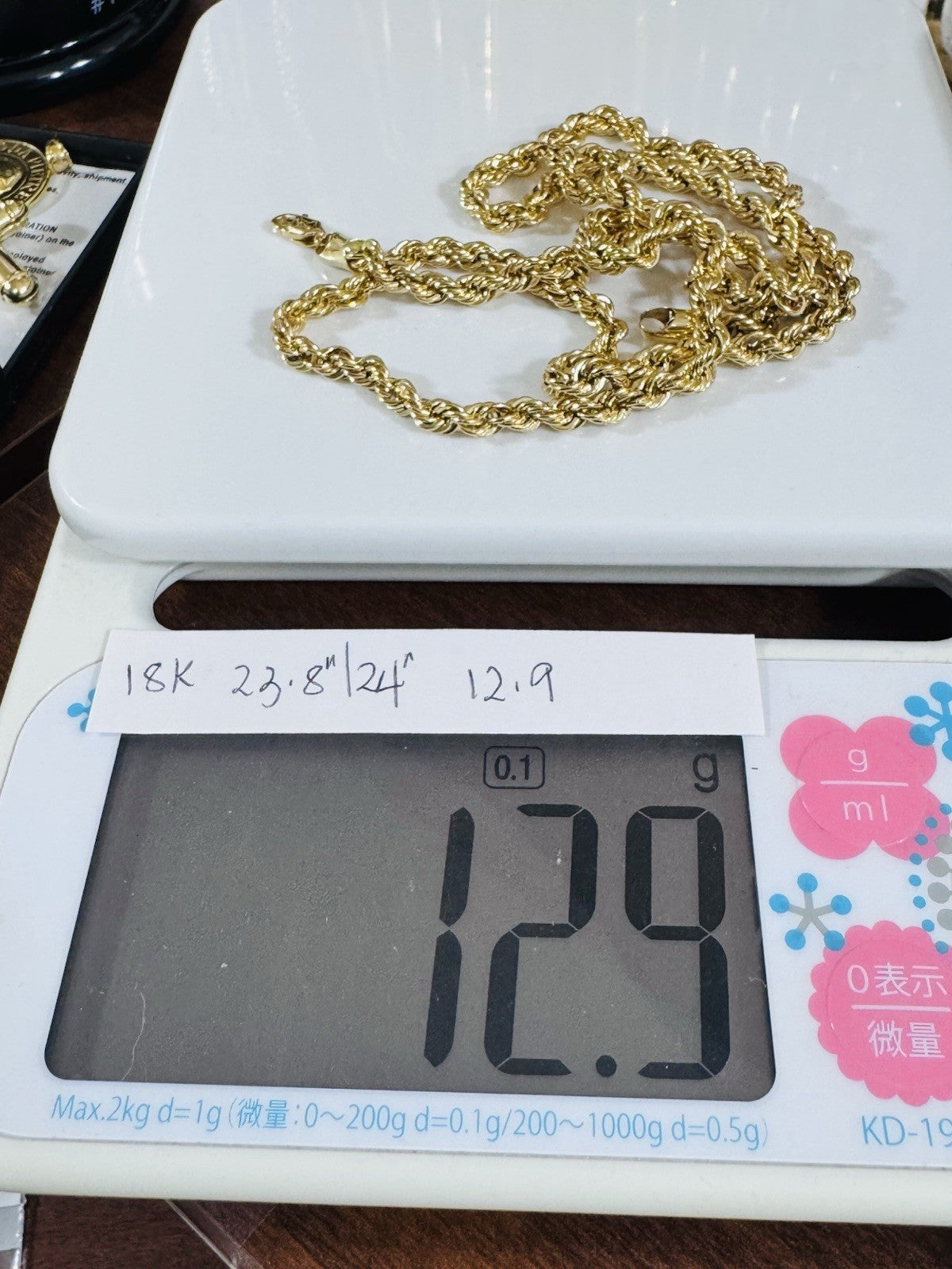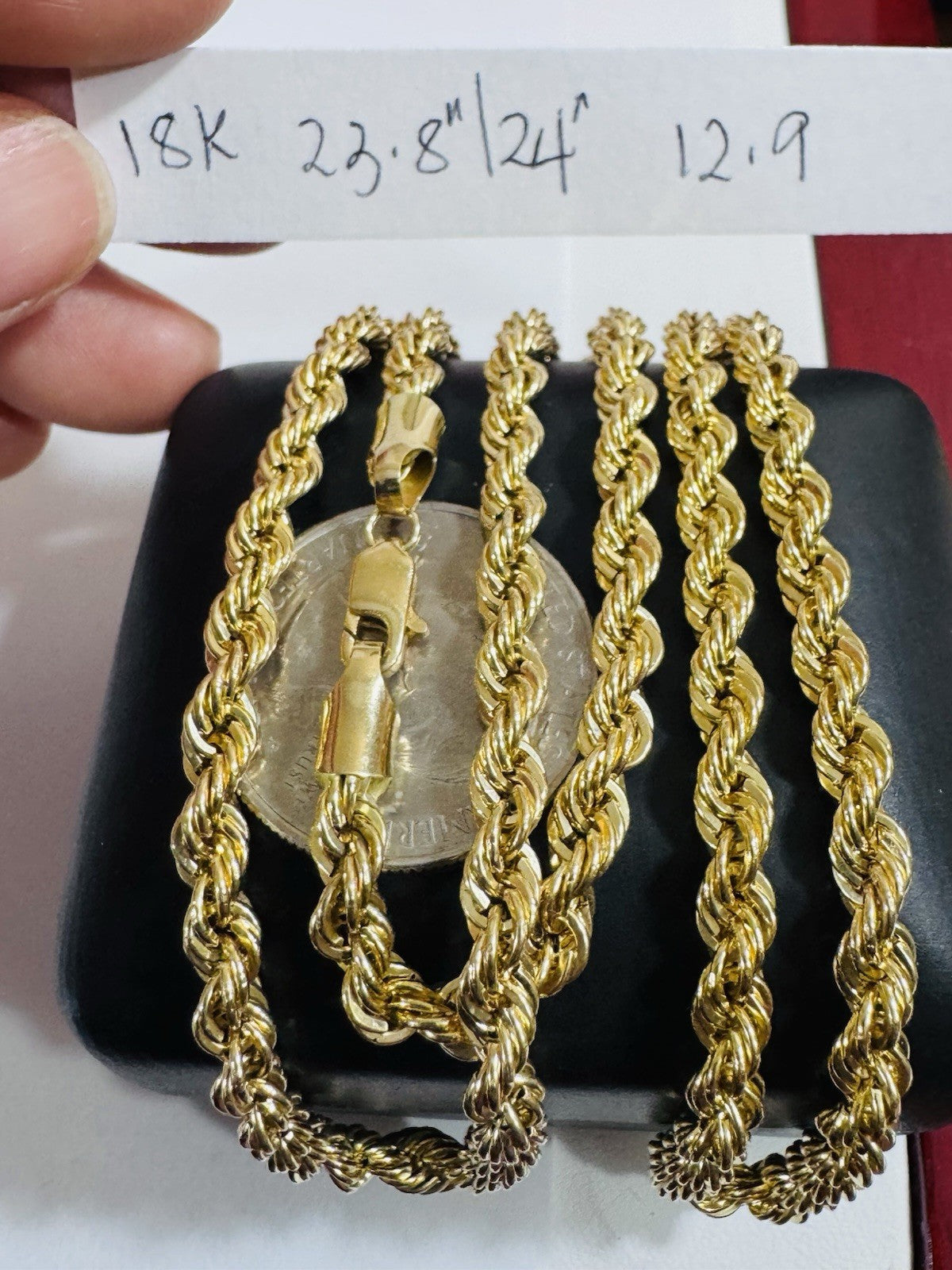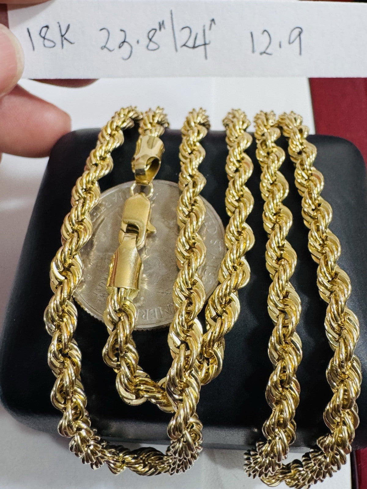 * Hello You are buying Real Brand New 18K 750 Real Fine Yellow Gold Rope Chain Necklace 24.5” Long 4mm 12.9g Fast ship. Good weight Good size yet Hollow inside.