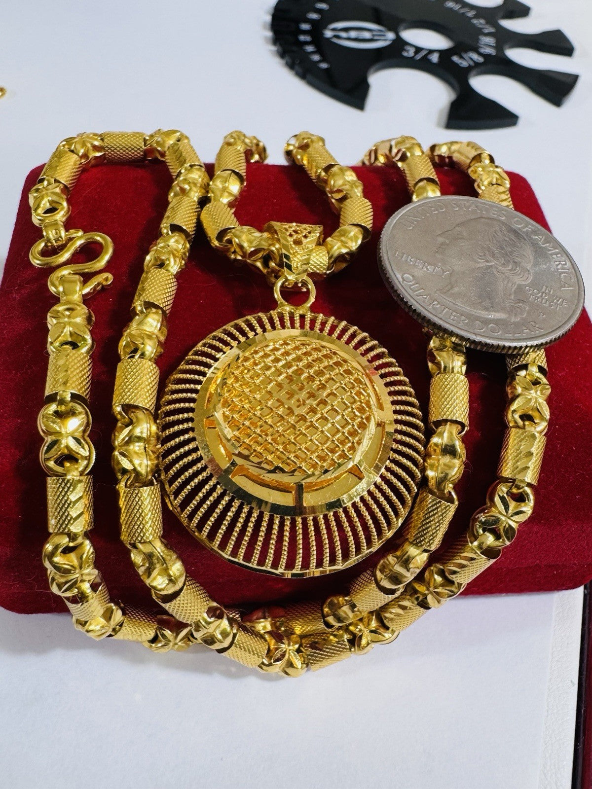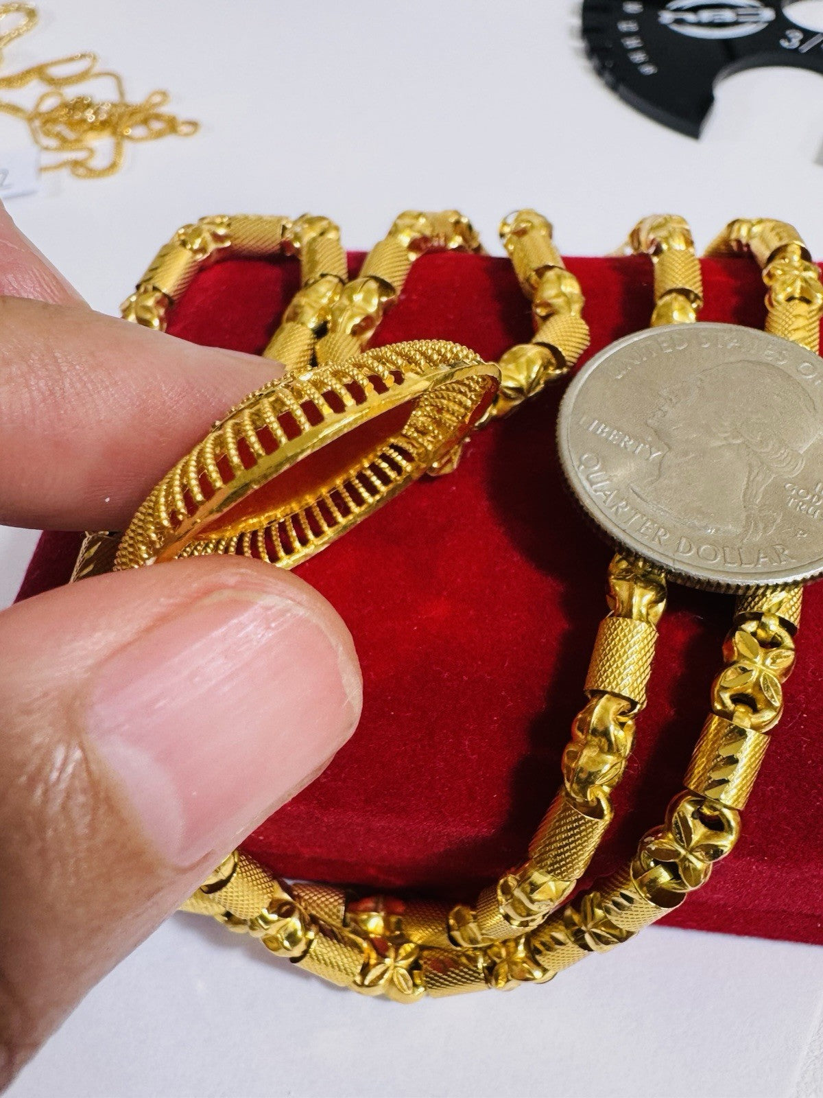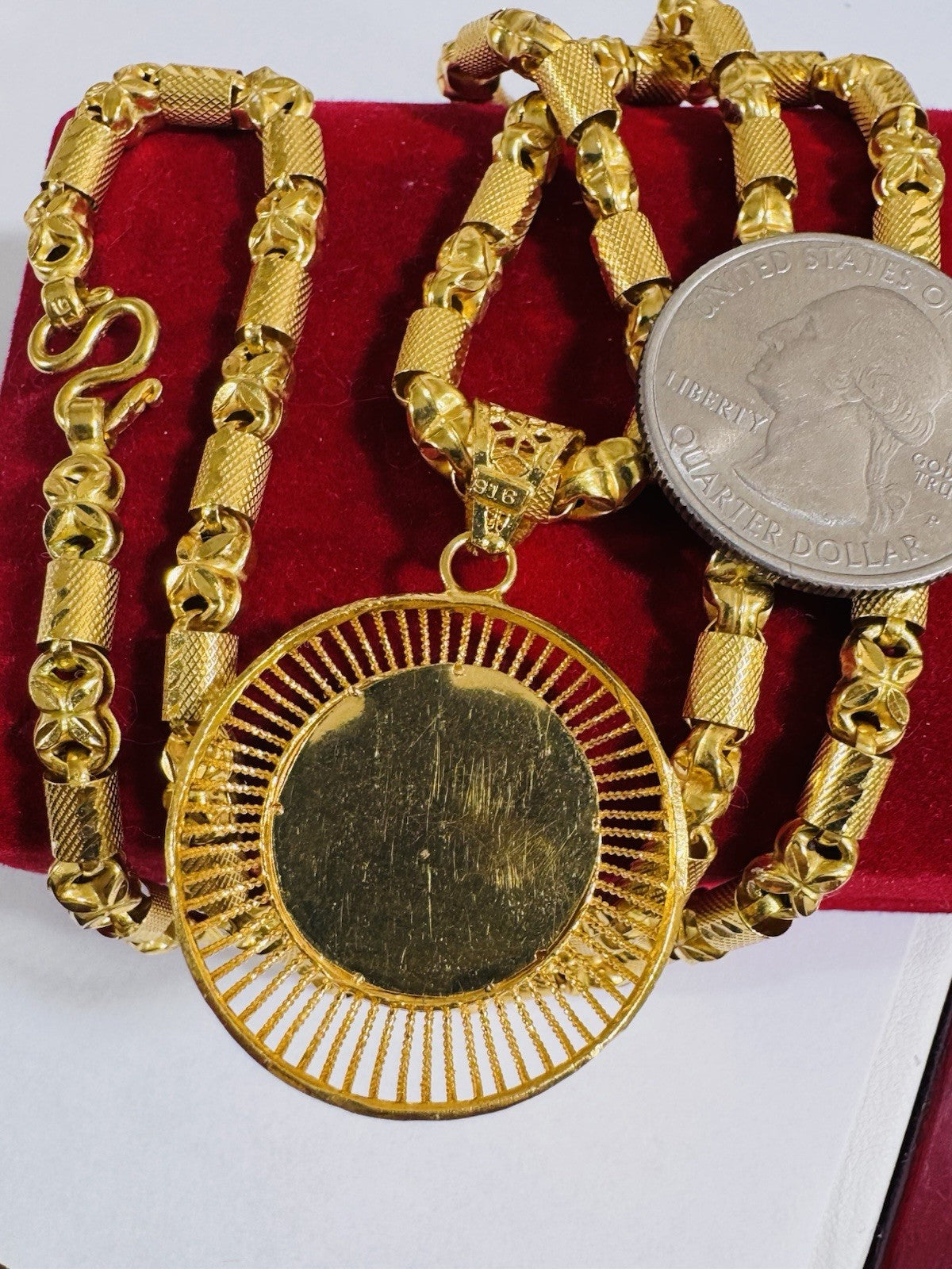 *100% 22C gold "916” equivalent, Mark stamp and tested Saudi gold, Good weight thin size due to Solid type gold inside strong enough to hold.