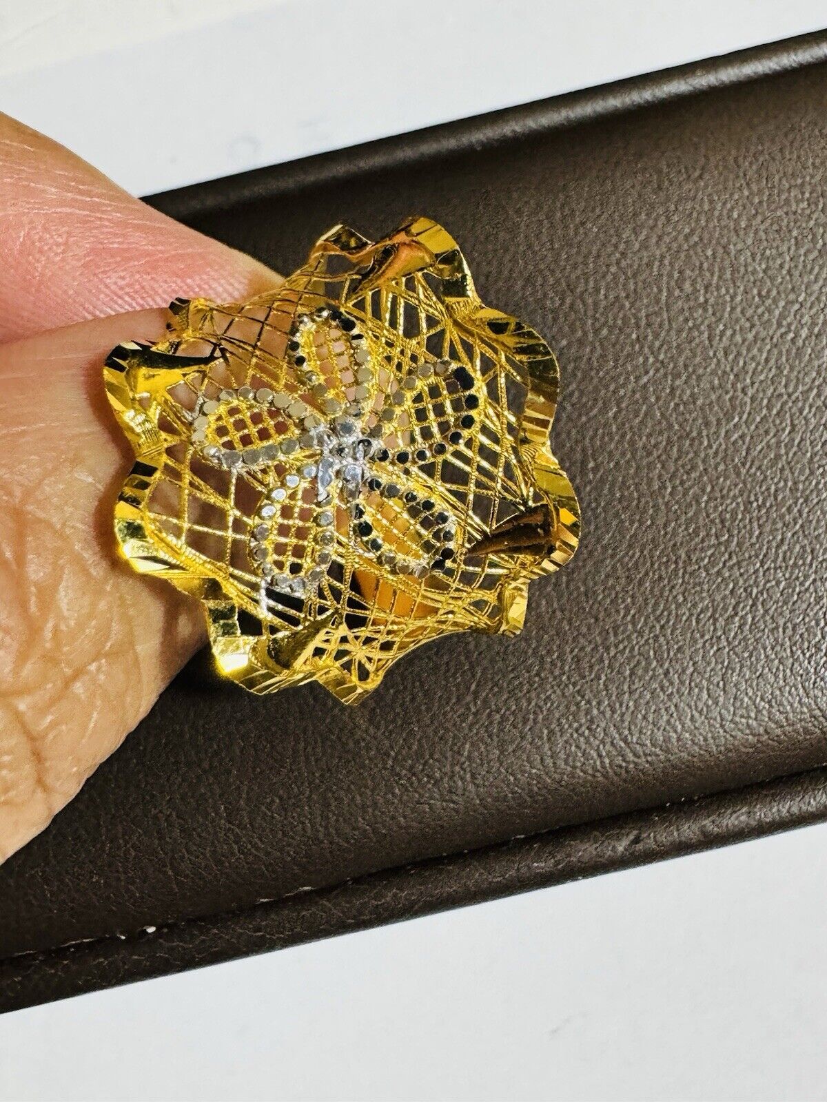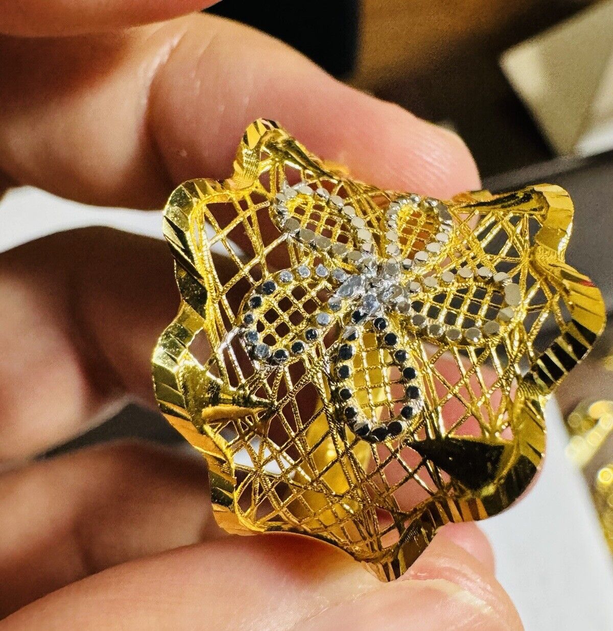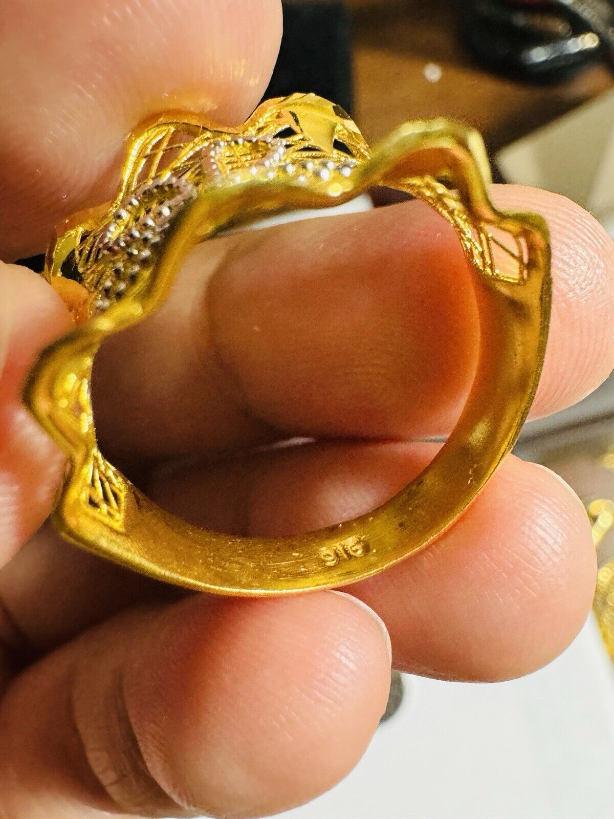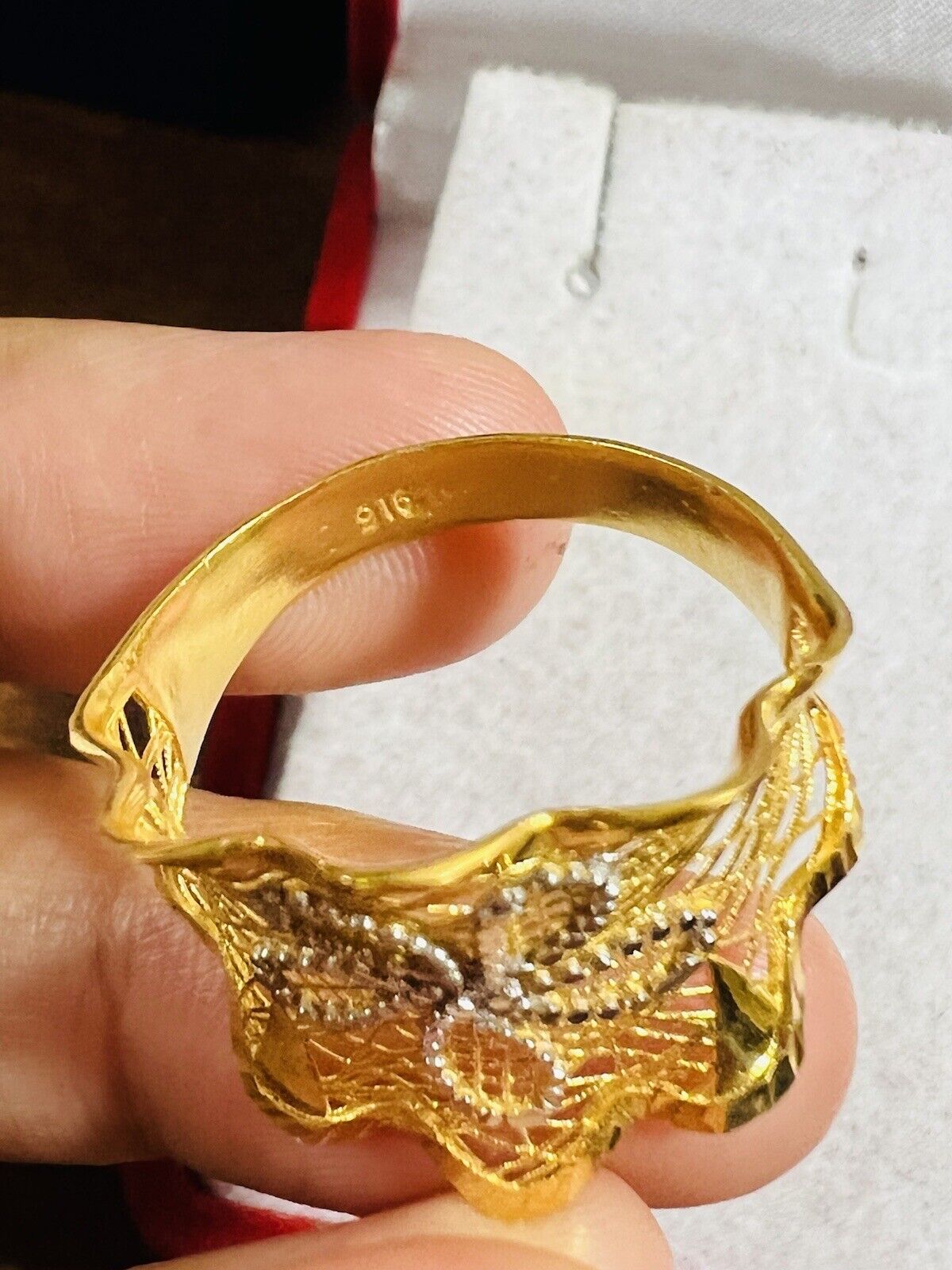 • You are buying Real Beautiful Dubai 22K 916 Yellow Saudi Real UAE Gold Women’s Unique Style Ring 4.5g Fits on 9.5/10” very Rare items hard to find. Two tone colors