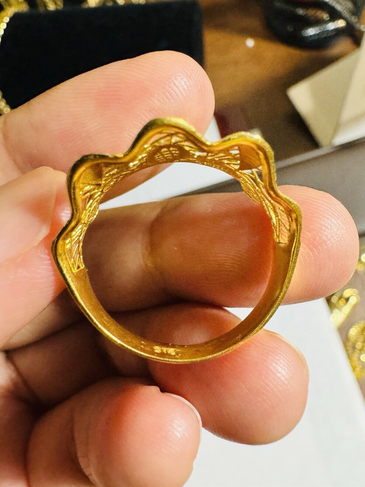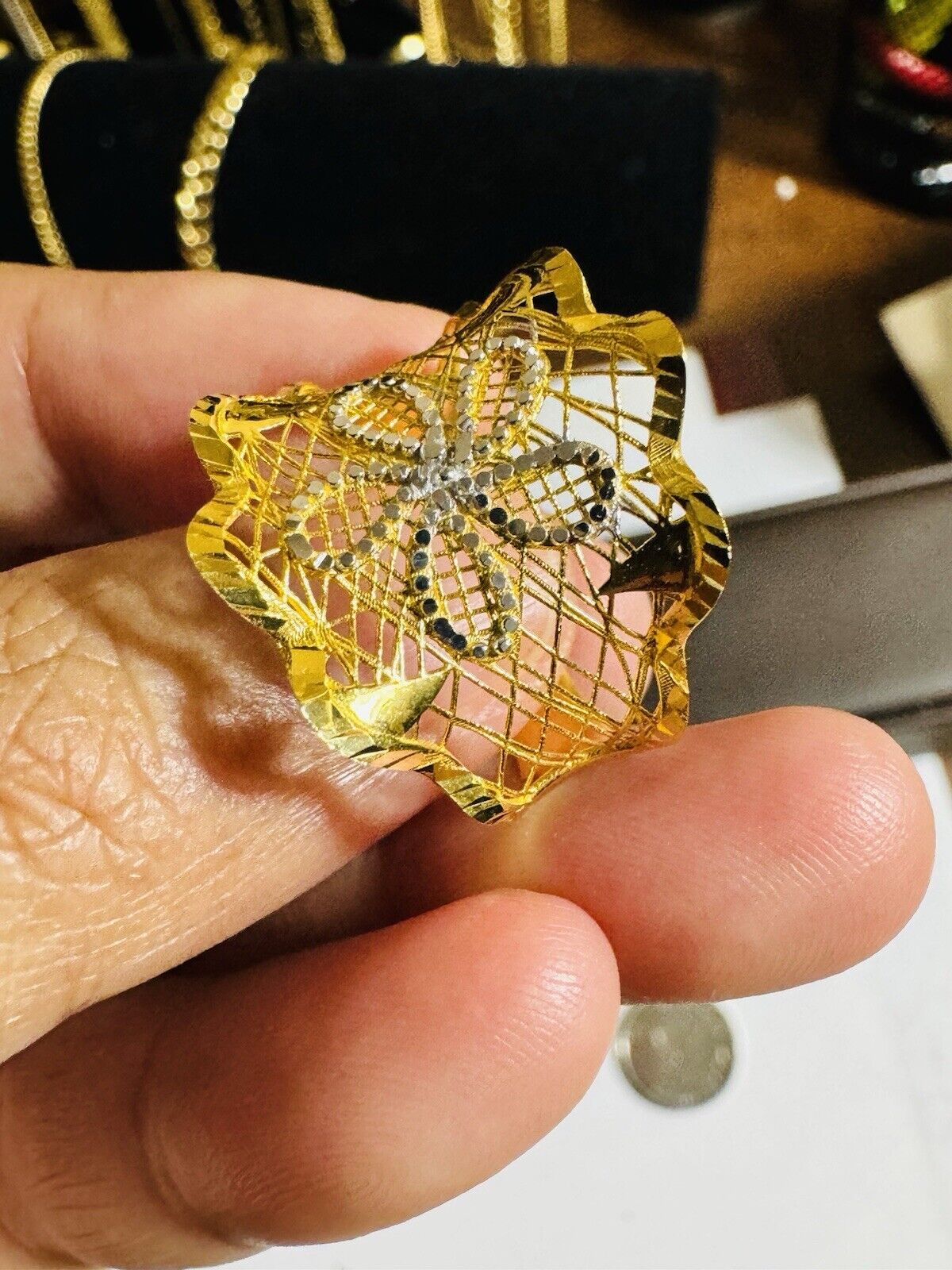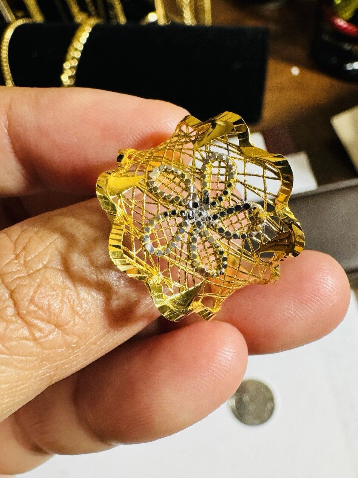 • You are buying Real Beautiful Dubai 22K 916 Yellow Saudi Real UAE Gold Women’s Unique Style Ring 4.5g Fits on 9.5/10” very Rare items hard to find. Two tone colors