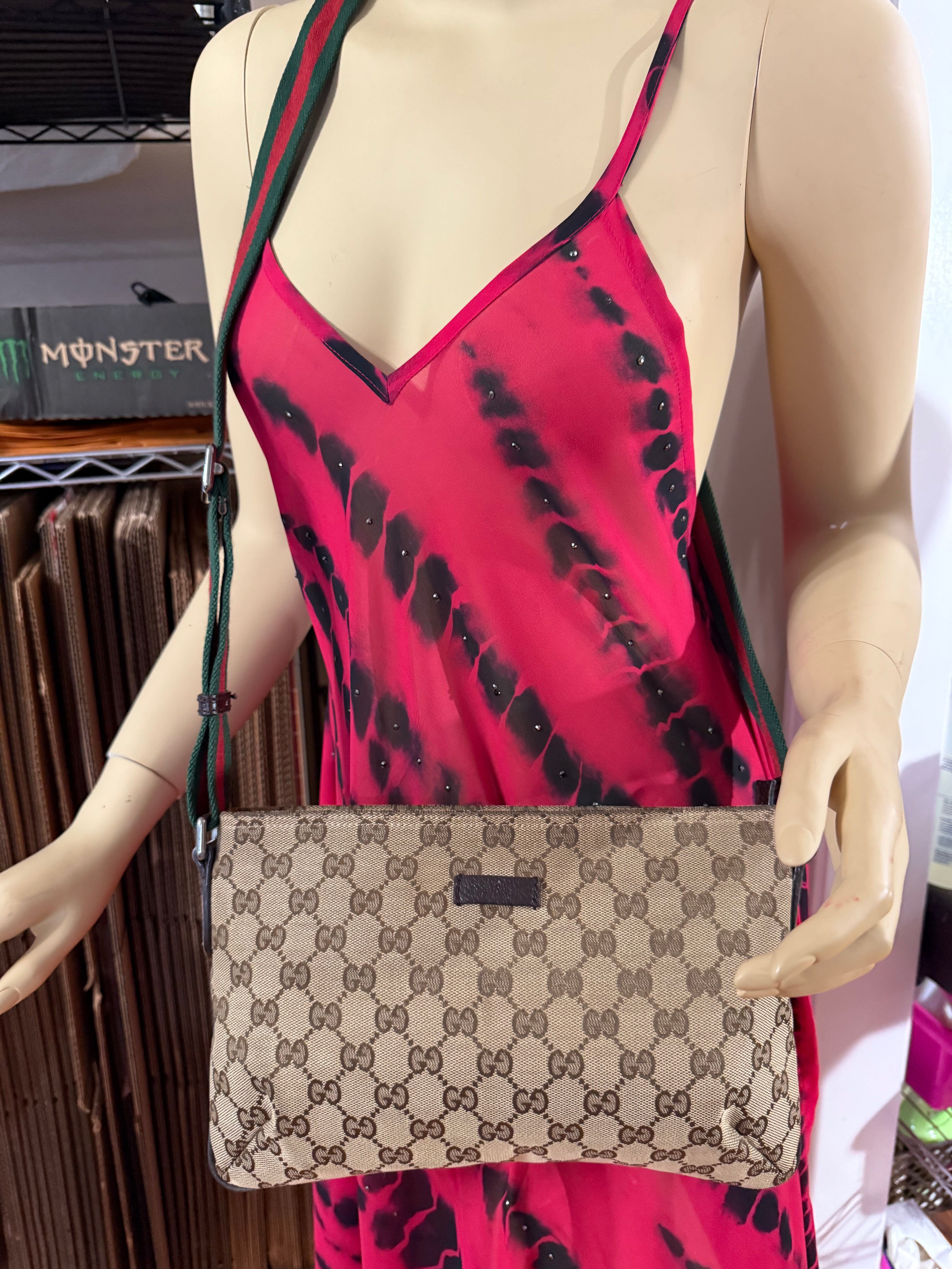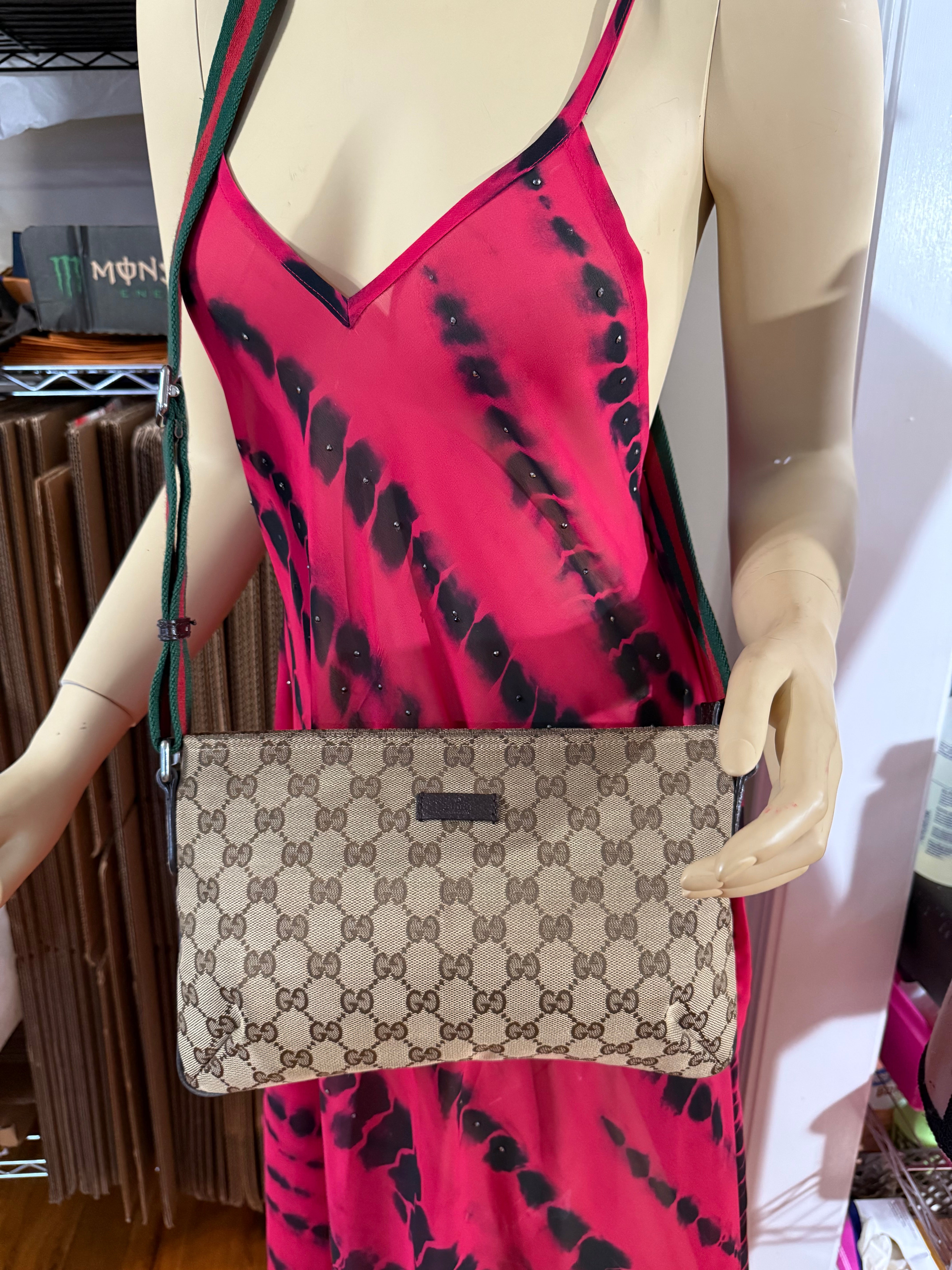This Gucci Cross bag showcases a sophisticated blend of brown and green red, highlighted by the iconic GG monogram pattern. Crafted with a sleek design, it features an adjustable strap and classic red and green webbing detail, making it a stylish accessory for any occasion.