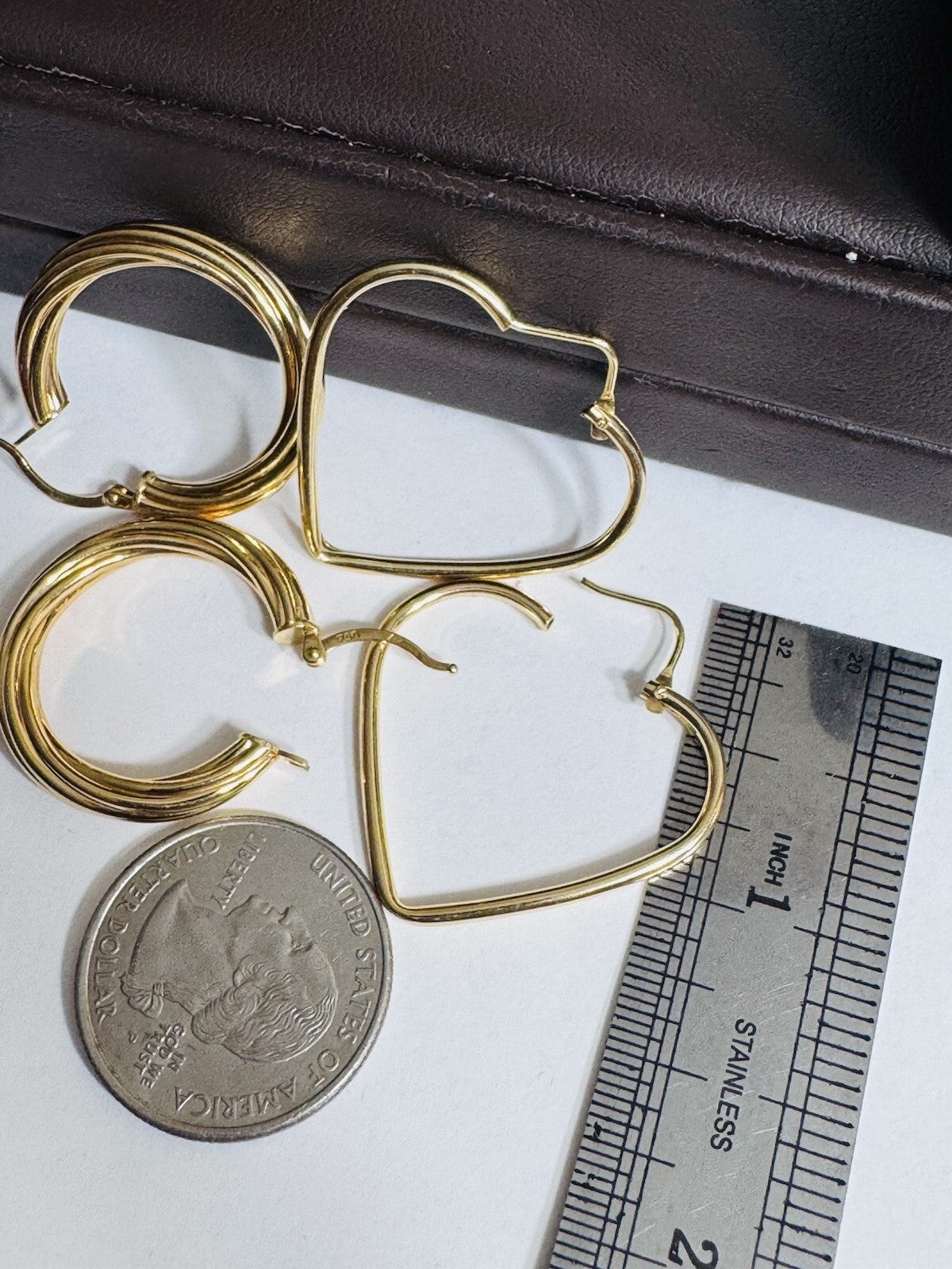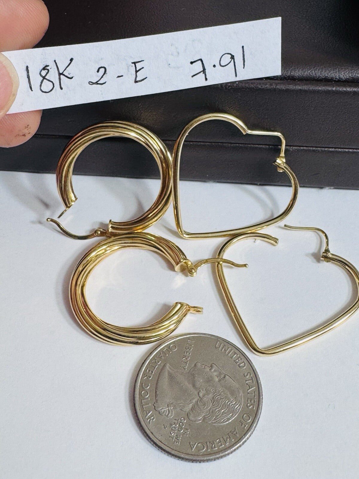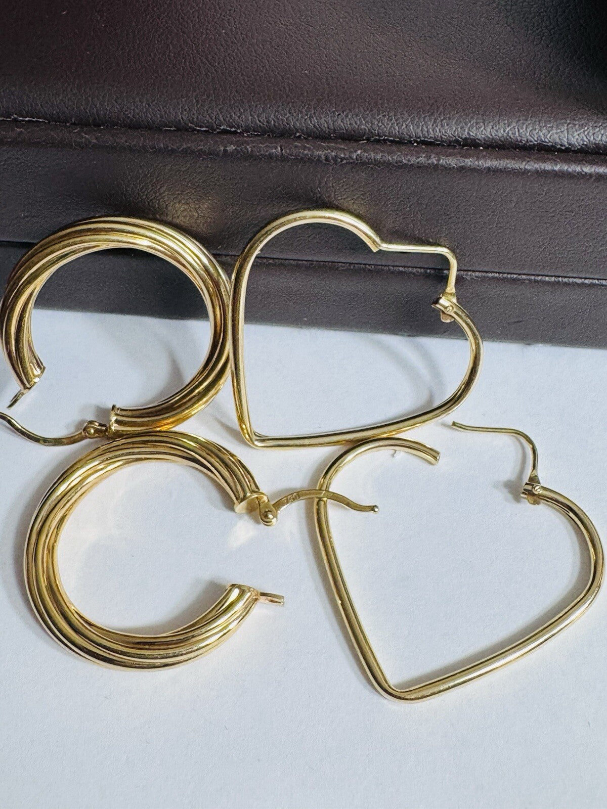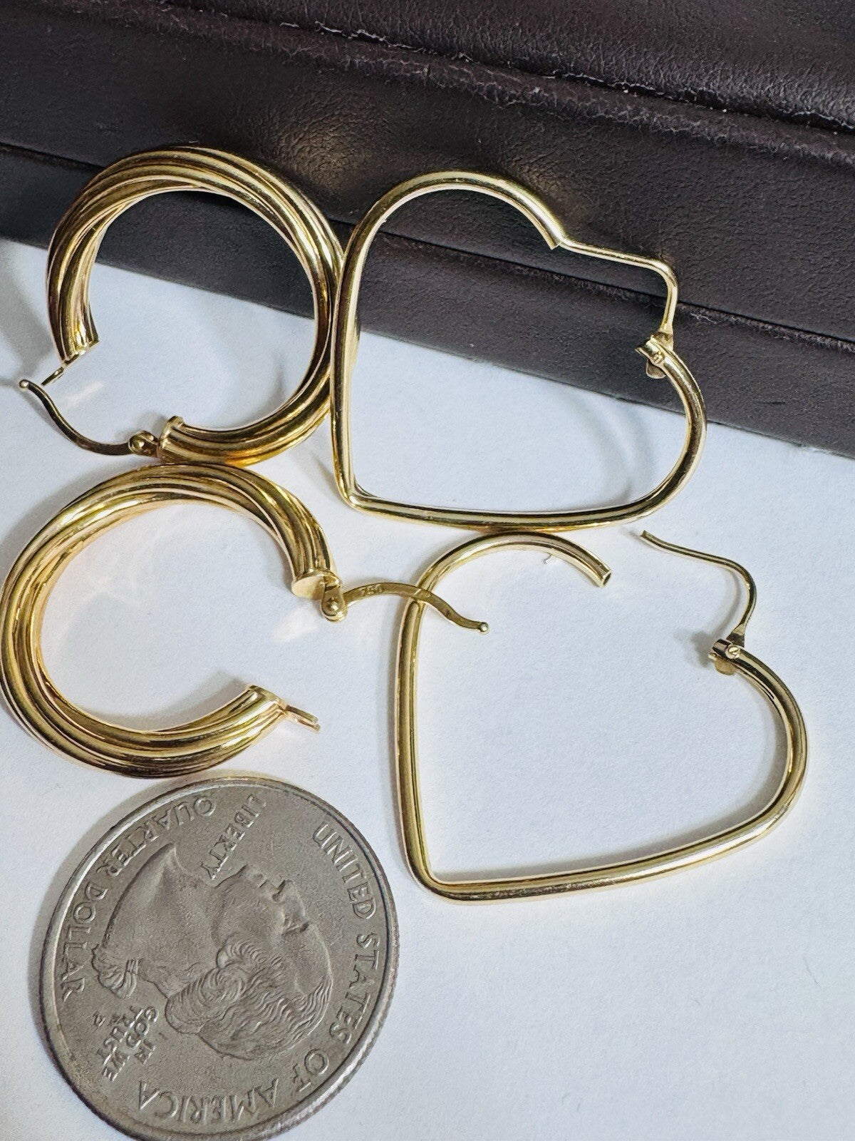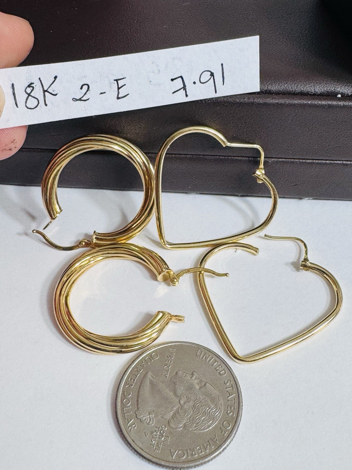18K 750 Fine Yellow Real Genuine Gold Hoop Loop & Heart 2 Set Earrings 7.9g
