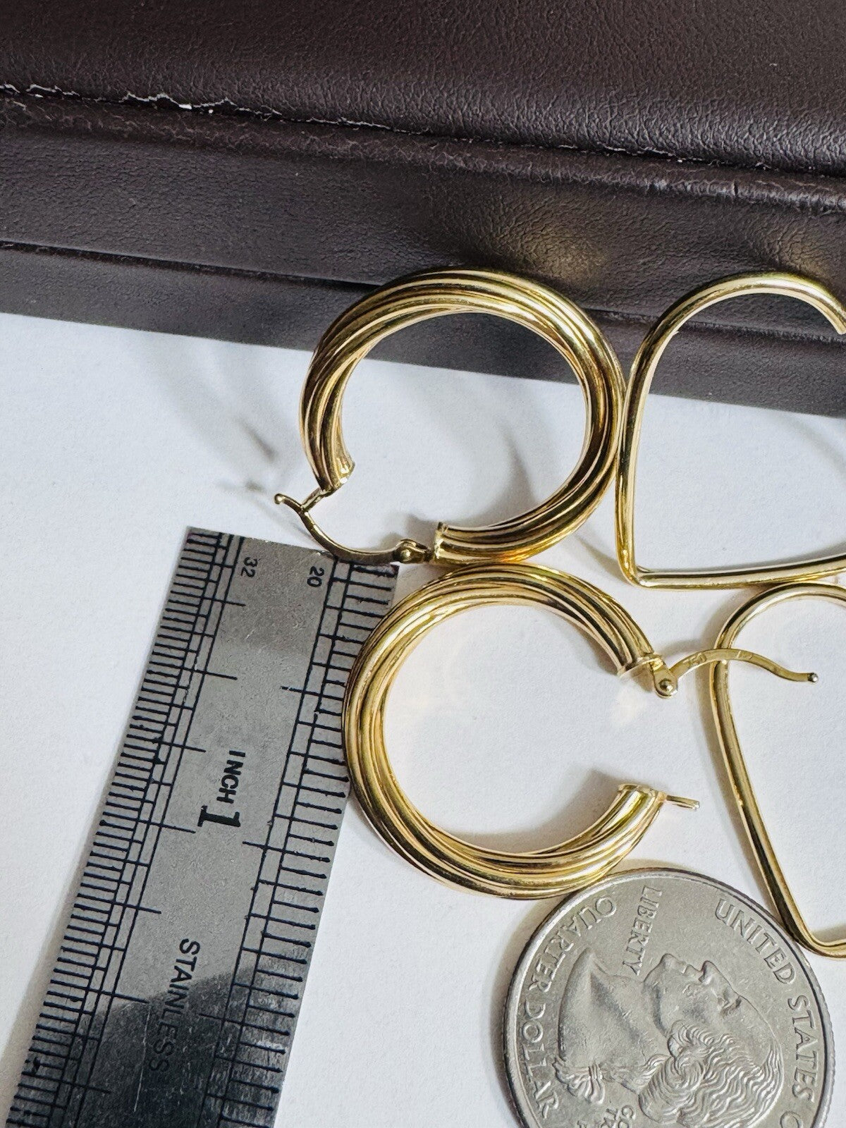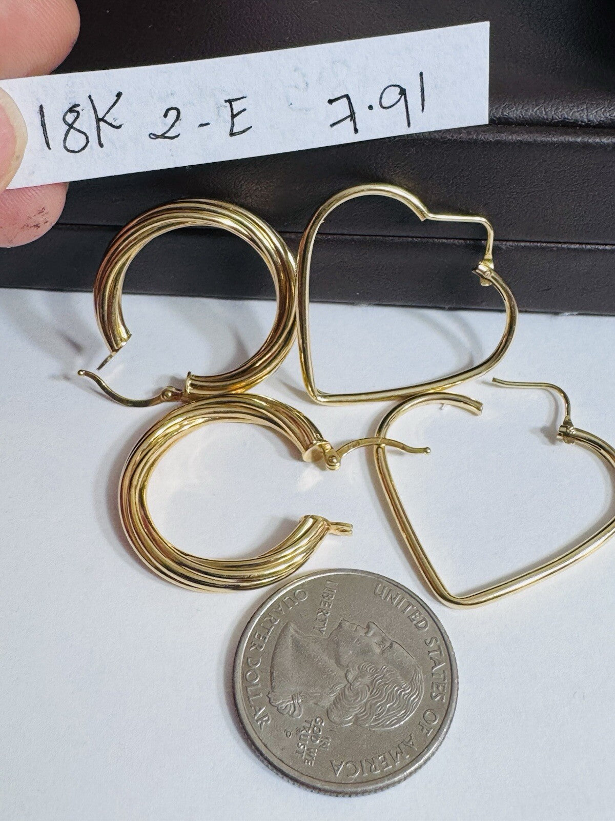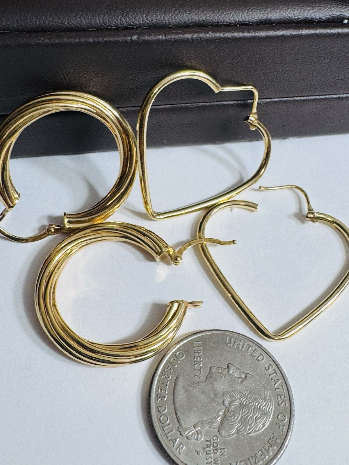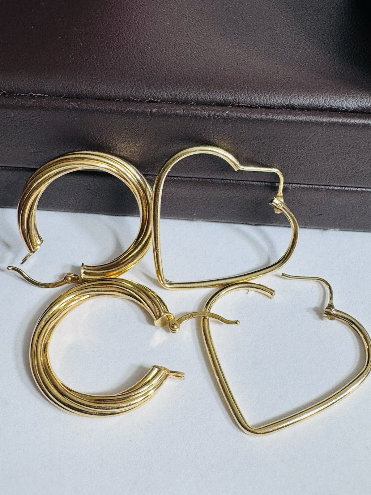 18K 750 Fine Yellow Real Genuine Gold Hoop Loop & Heart 2 Set Earrings 7.9g