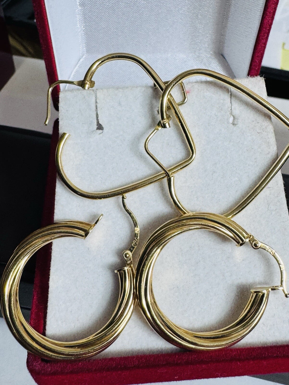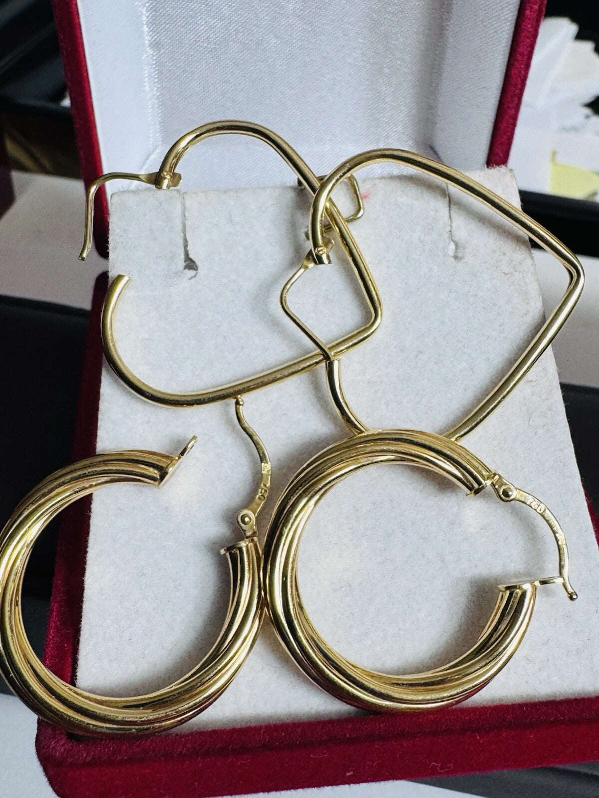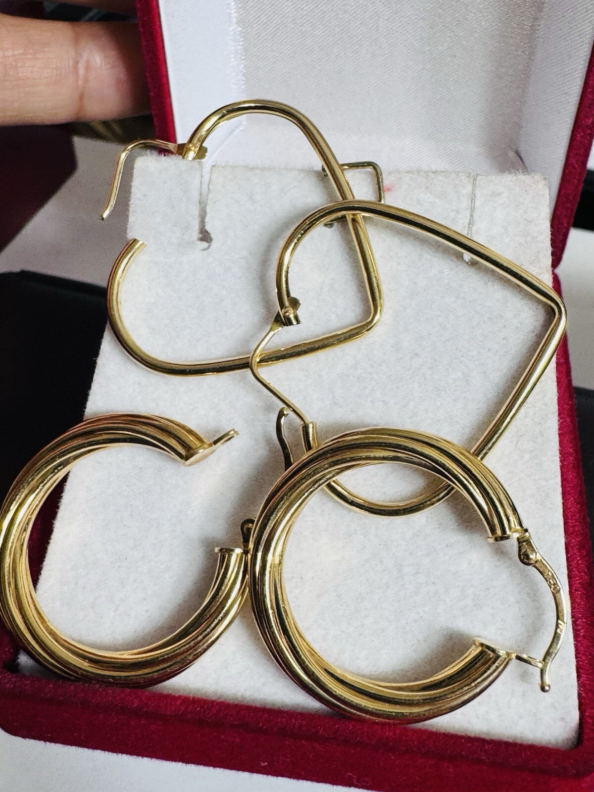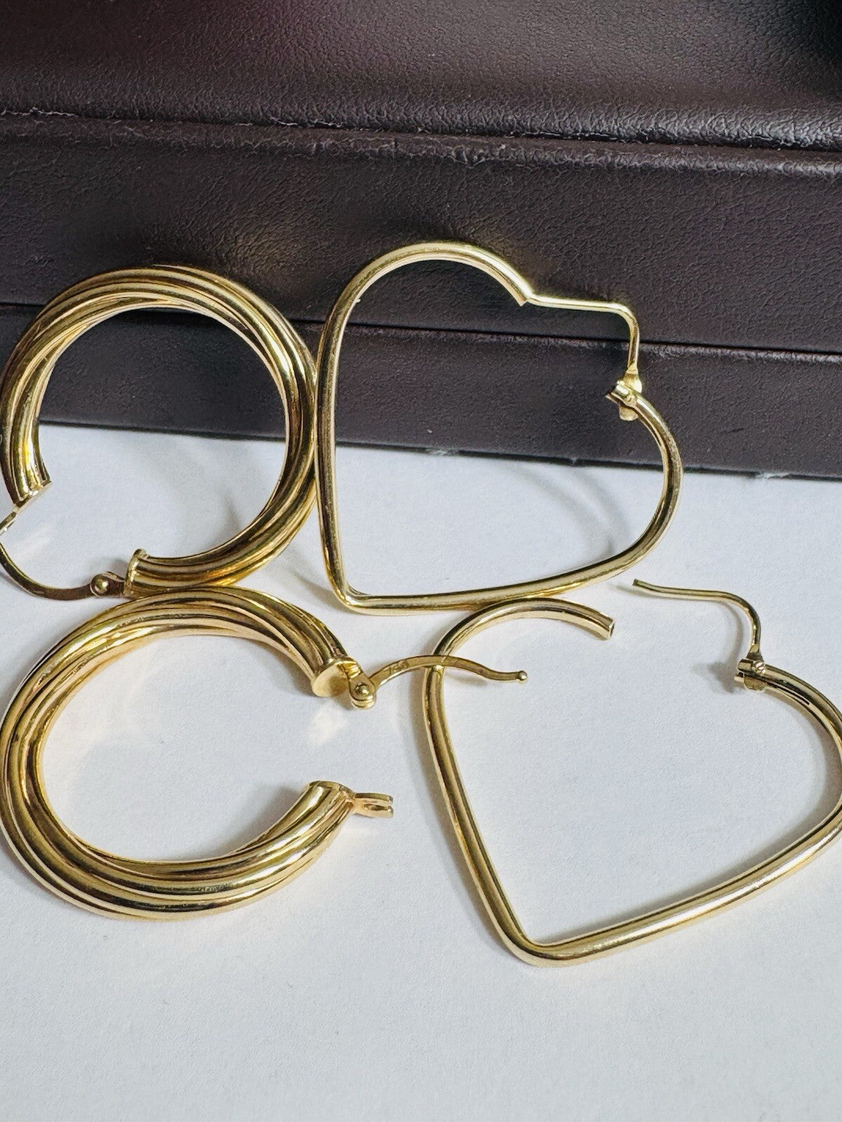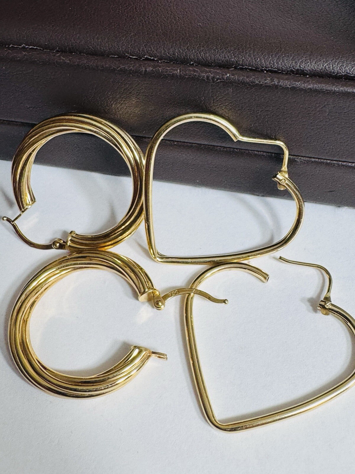 18K 750 Fine Yellow Real Genuine Gold Hoop Loop & Heart 2 Set Earrings 7.9g