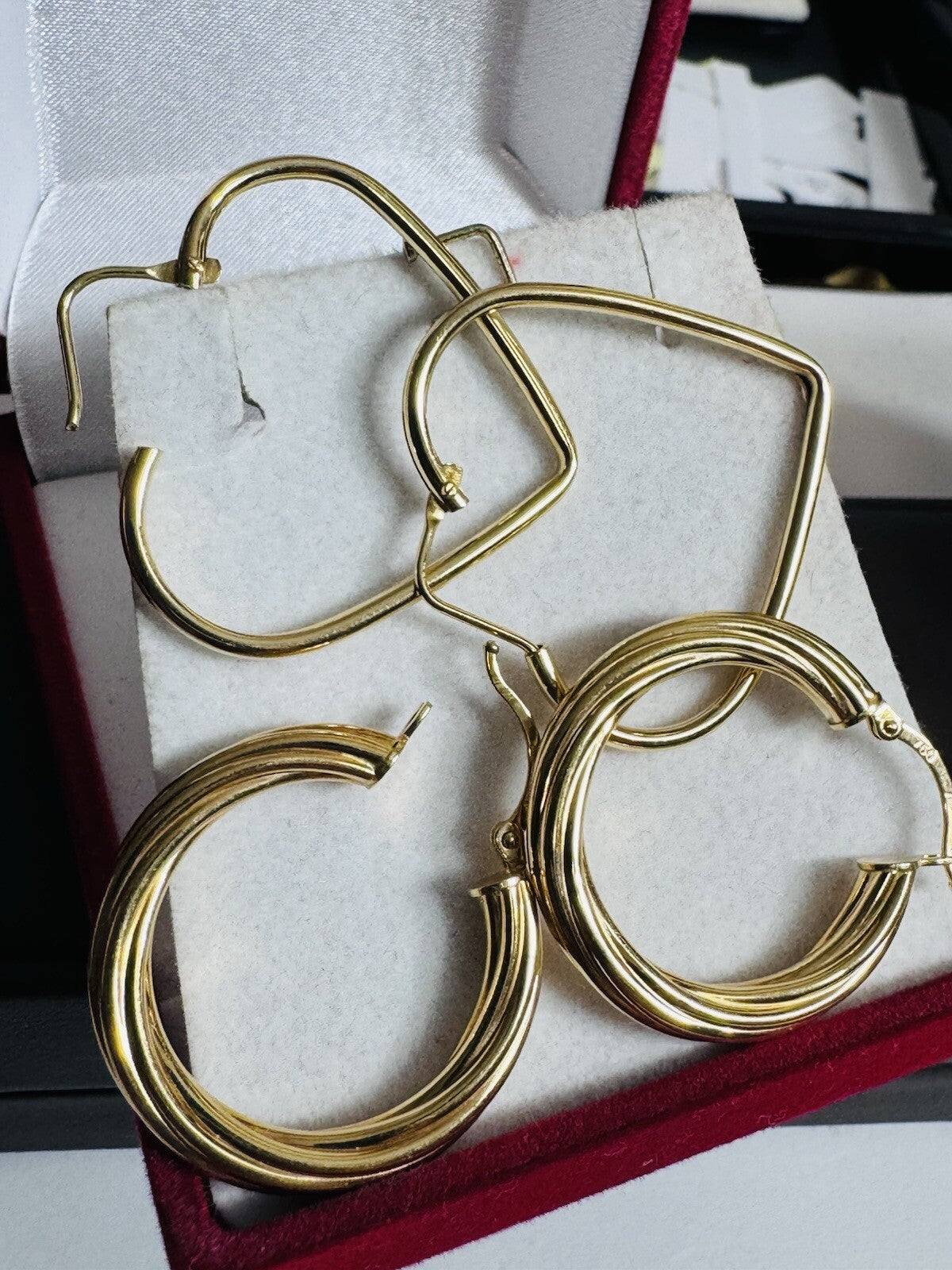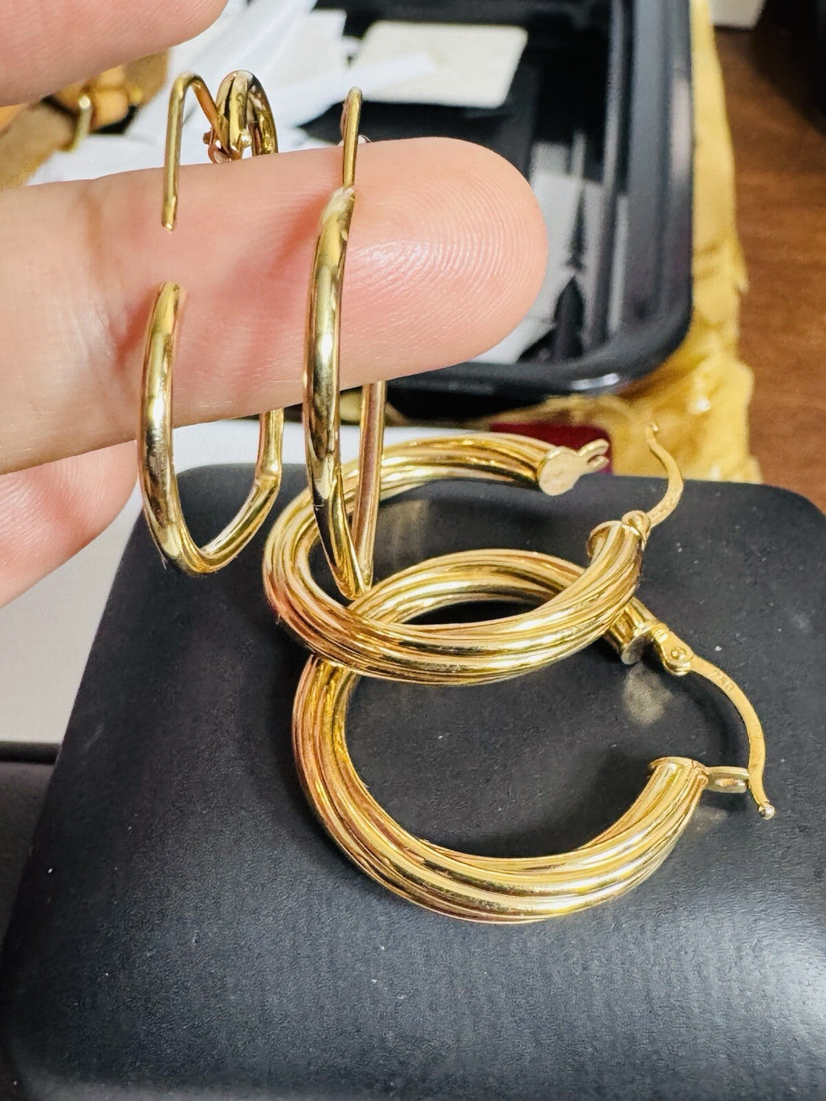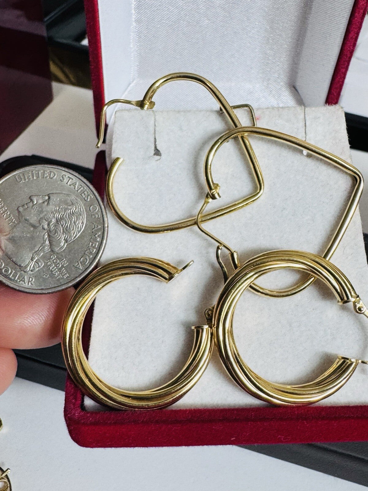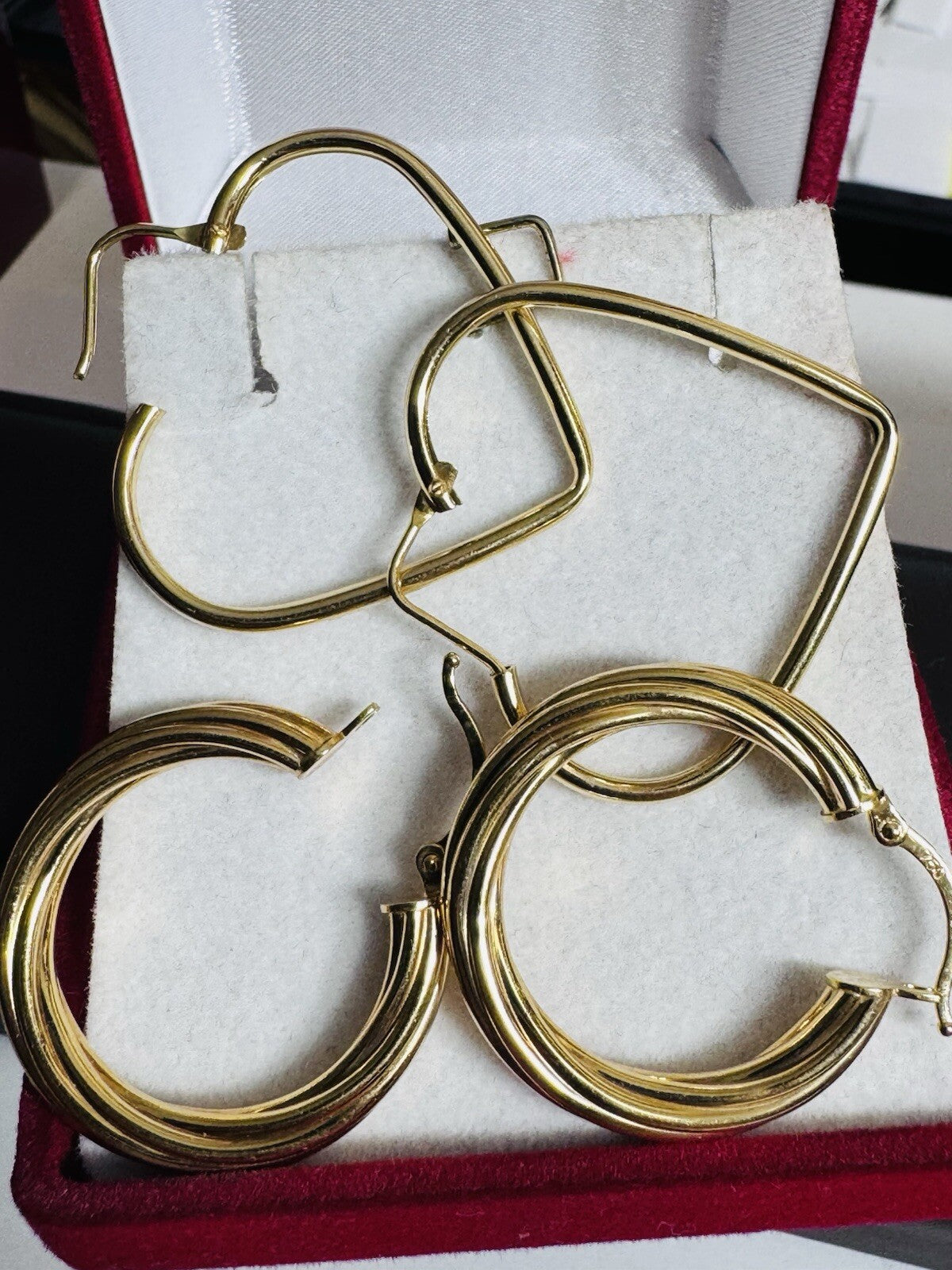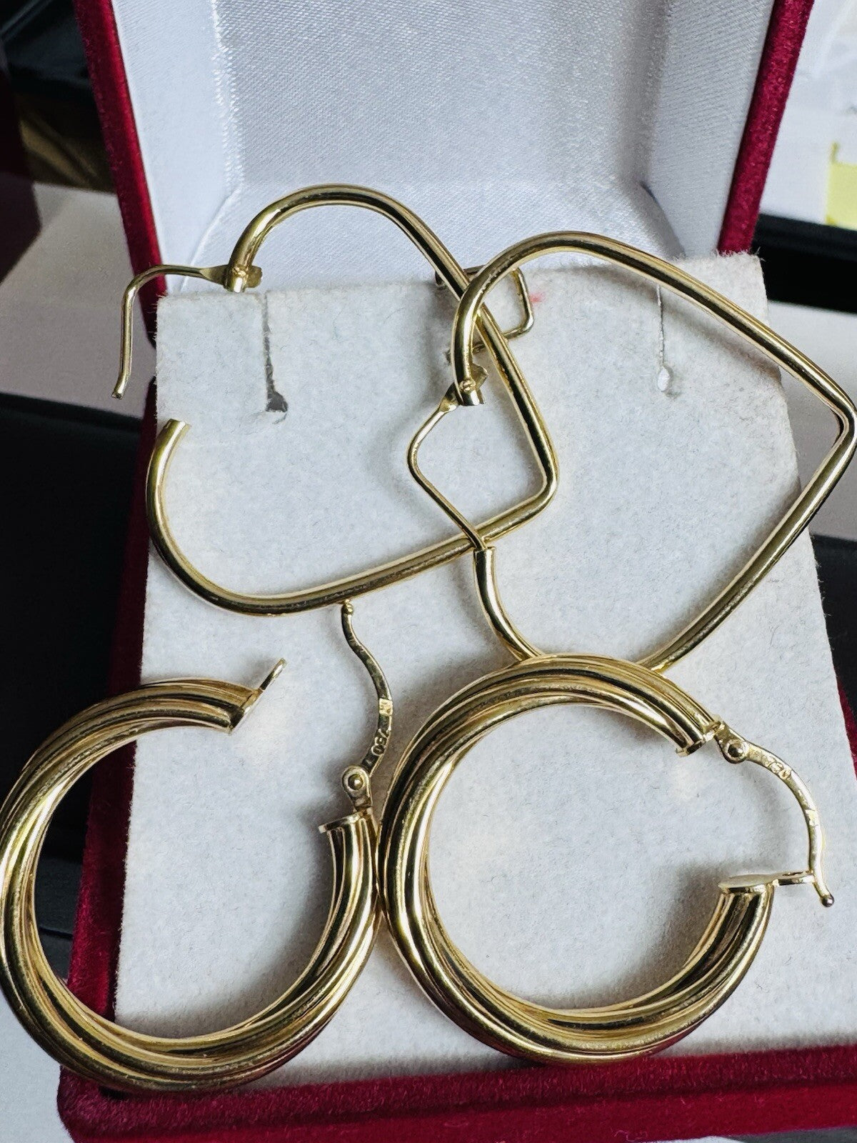 18K 750 Fine Yellow Real Genuine Gold Hoop Loop & Heart 2 Set Earrings 7.9g