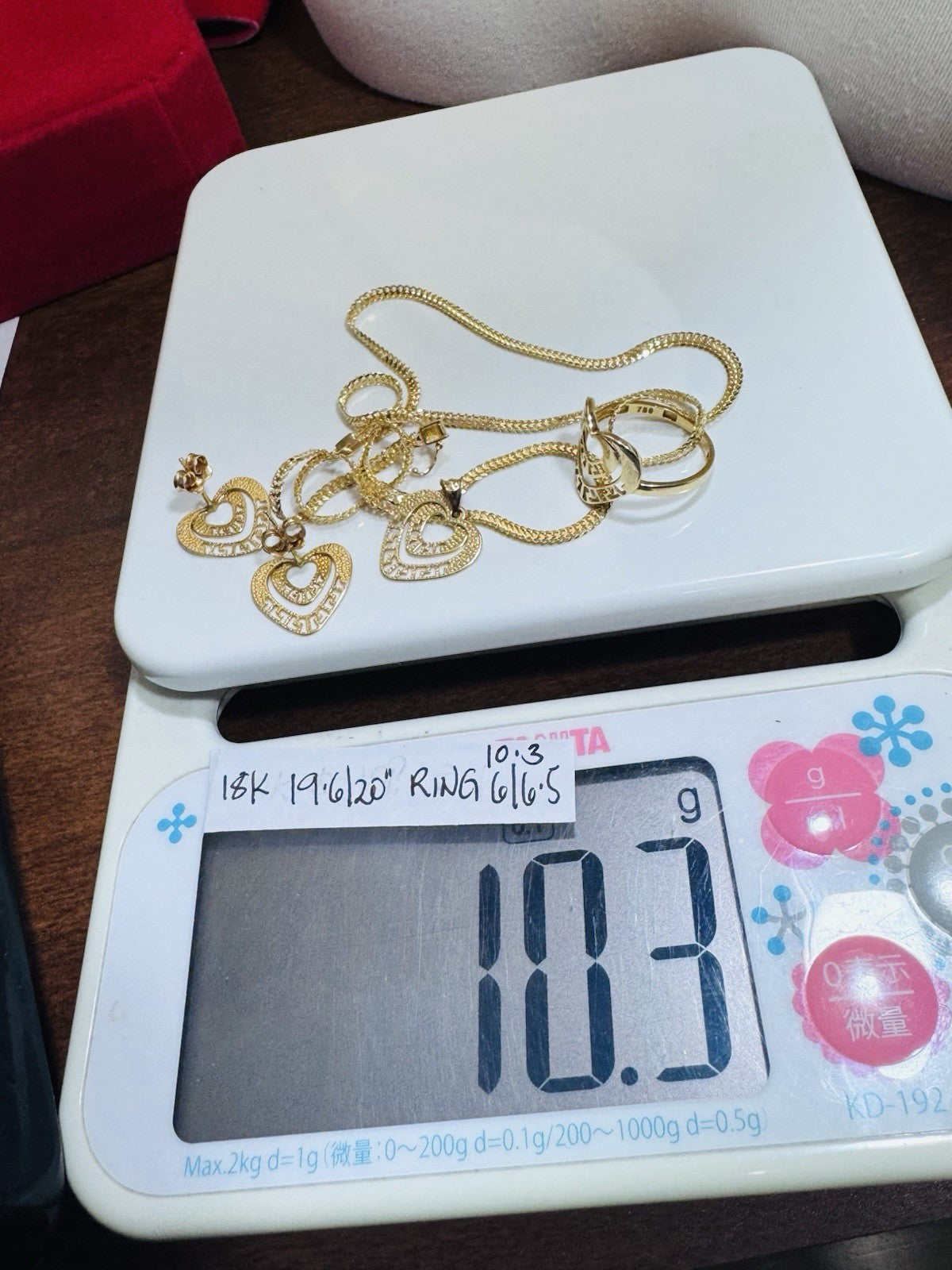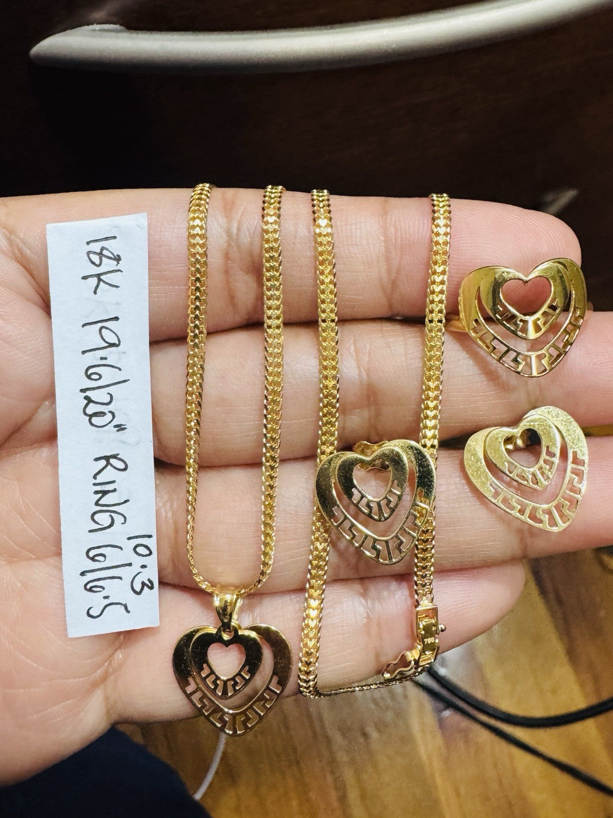 18K 750 Pure Gold Heart Earring Ring 6/6.5” Necklace 19.6/20” Long 10.3g 2.5mm