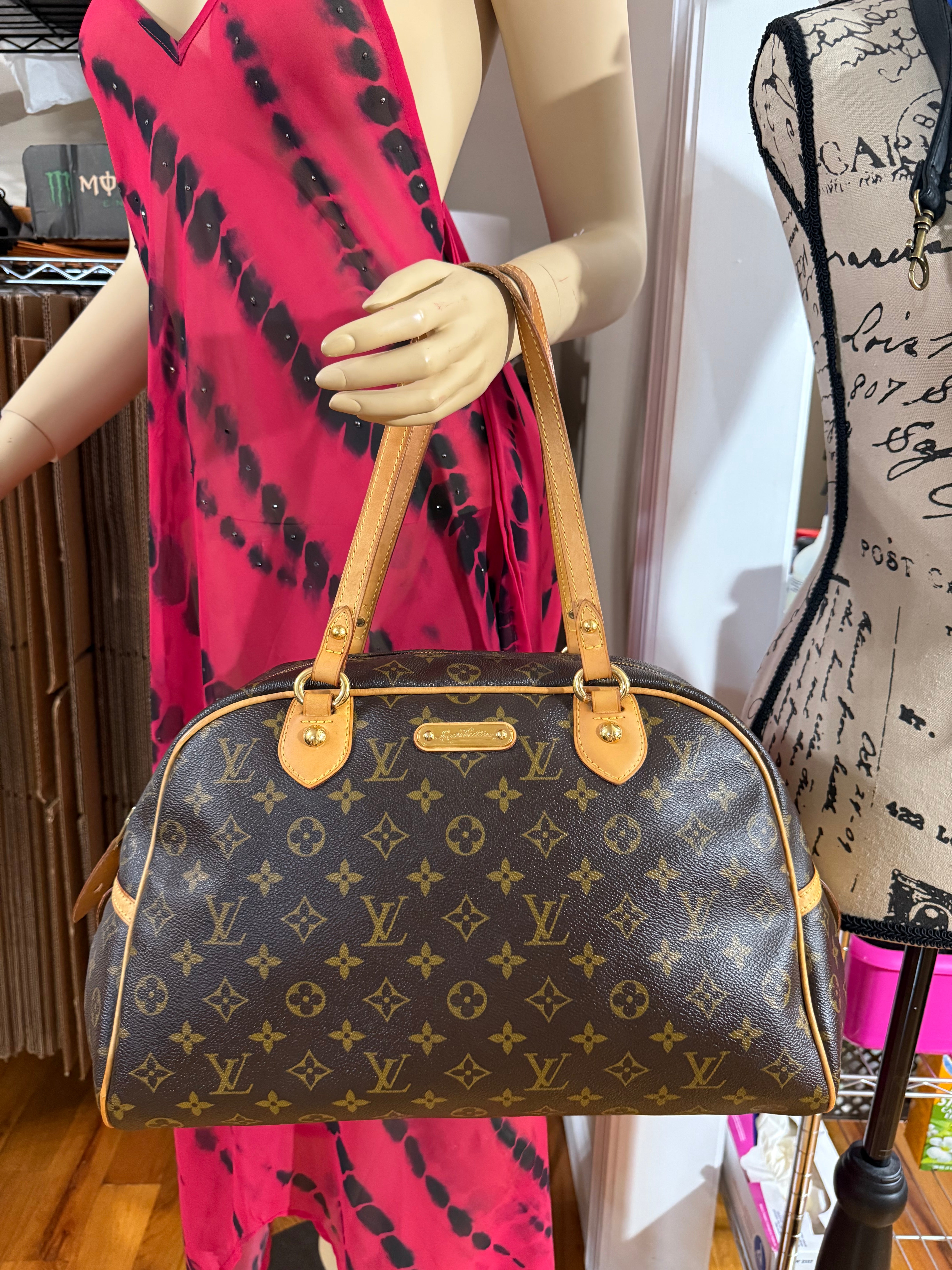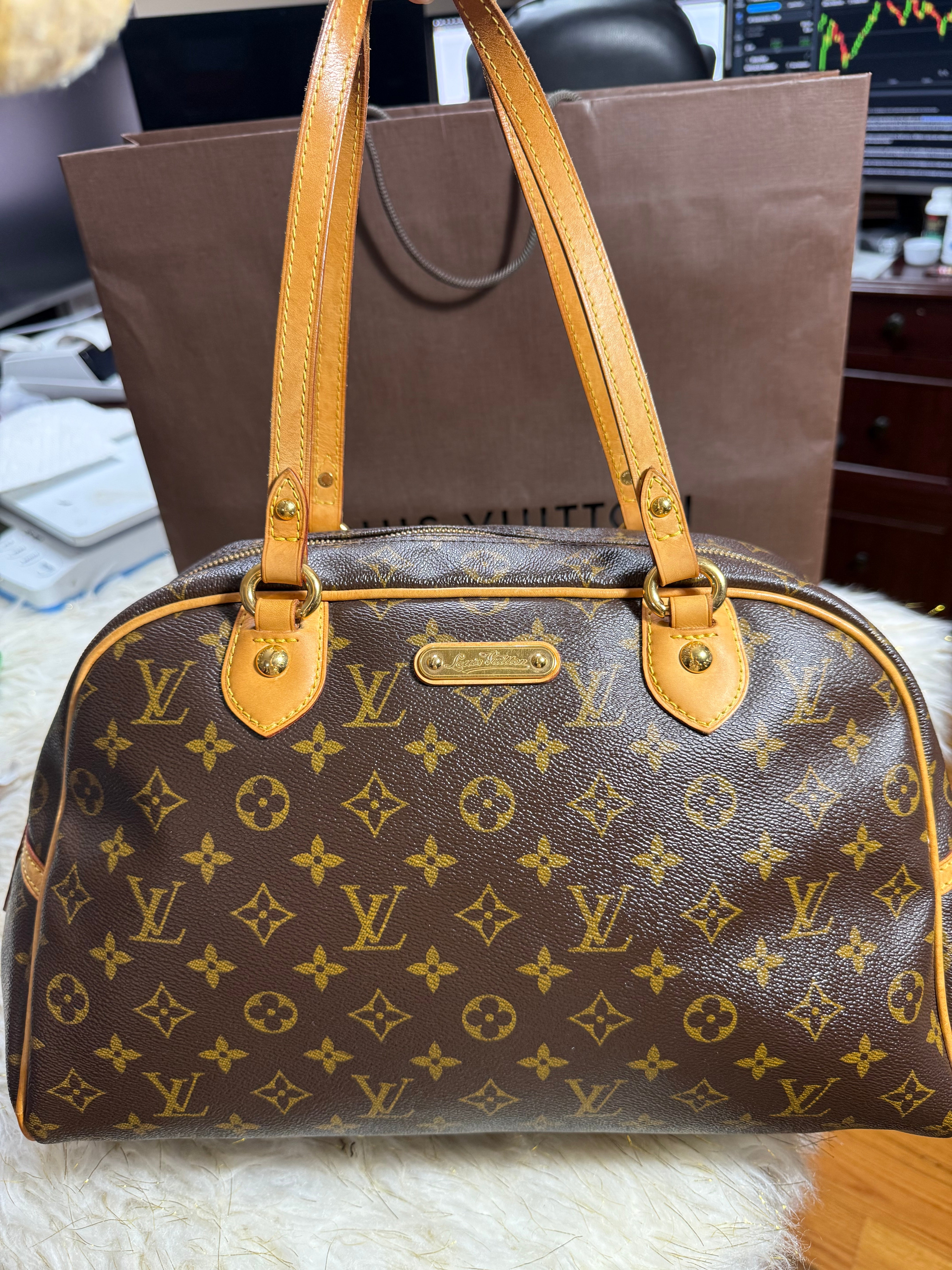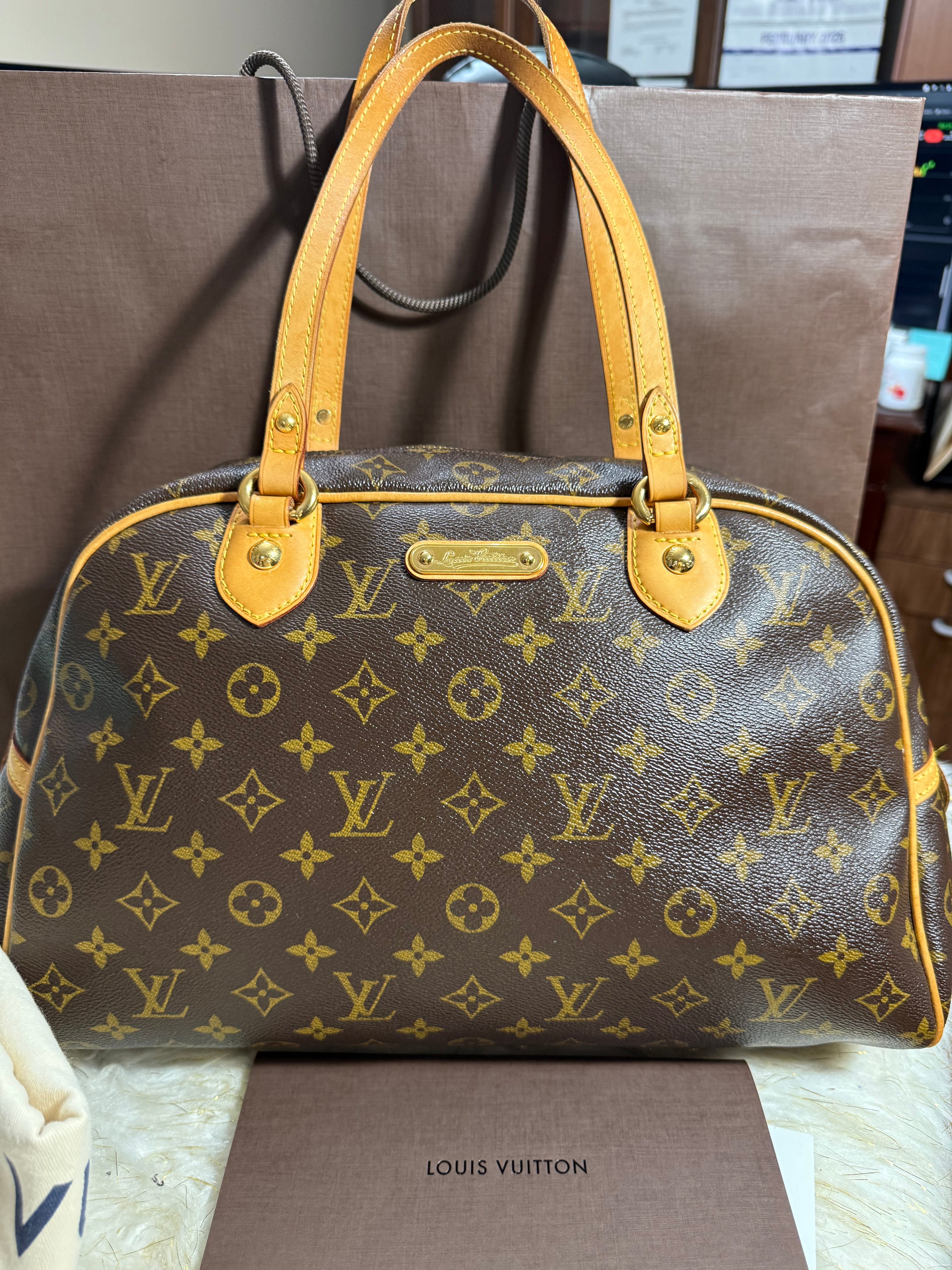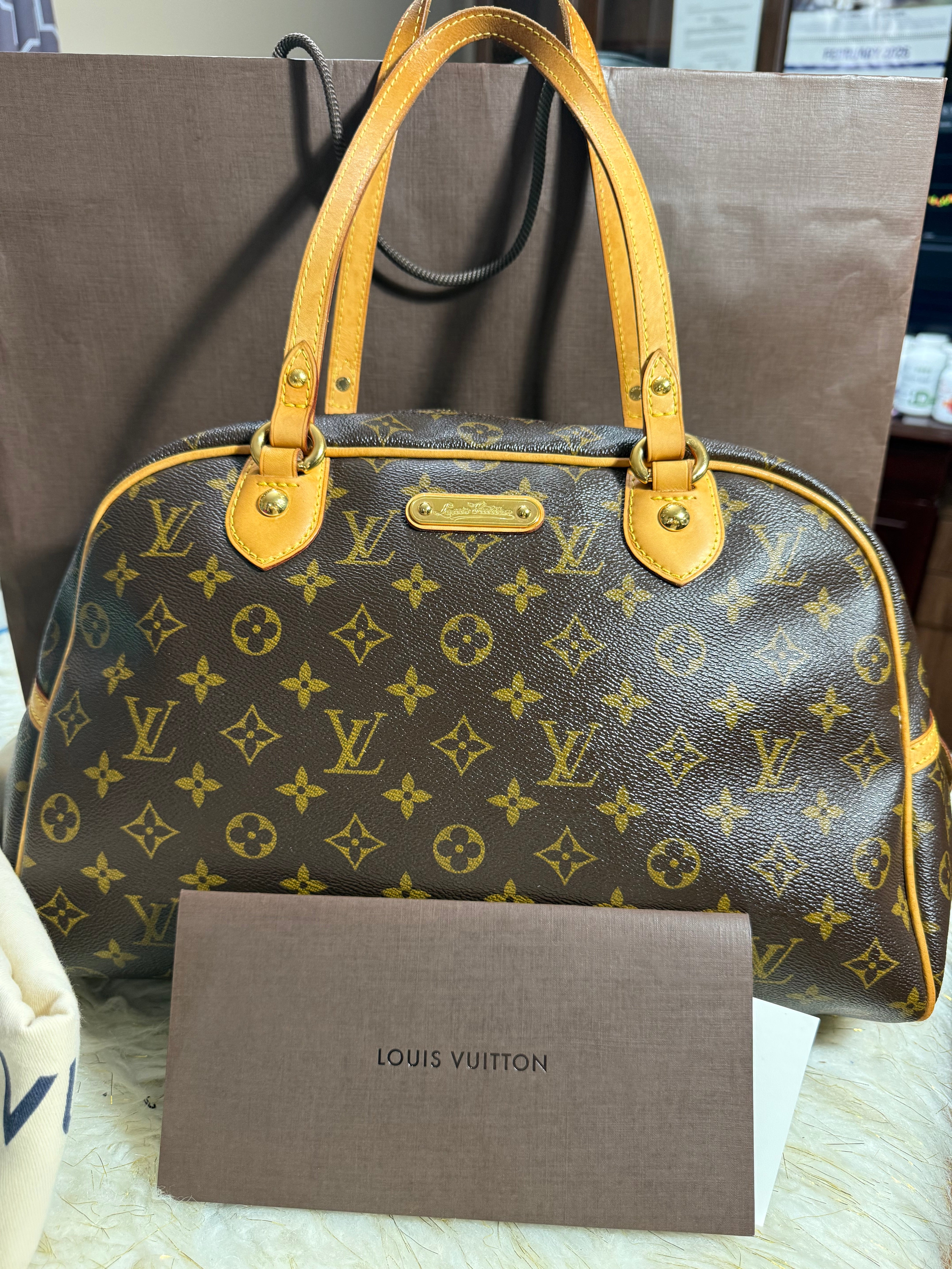Auth. Louis Vuitton Montergueil Gm Monogram handbag shoulder bag with Box and Duster. Authentic only or money back.