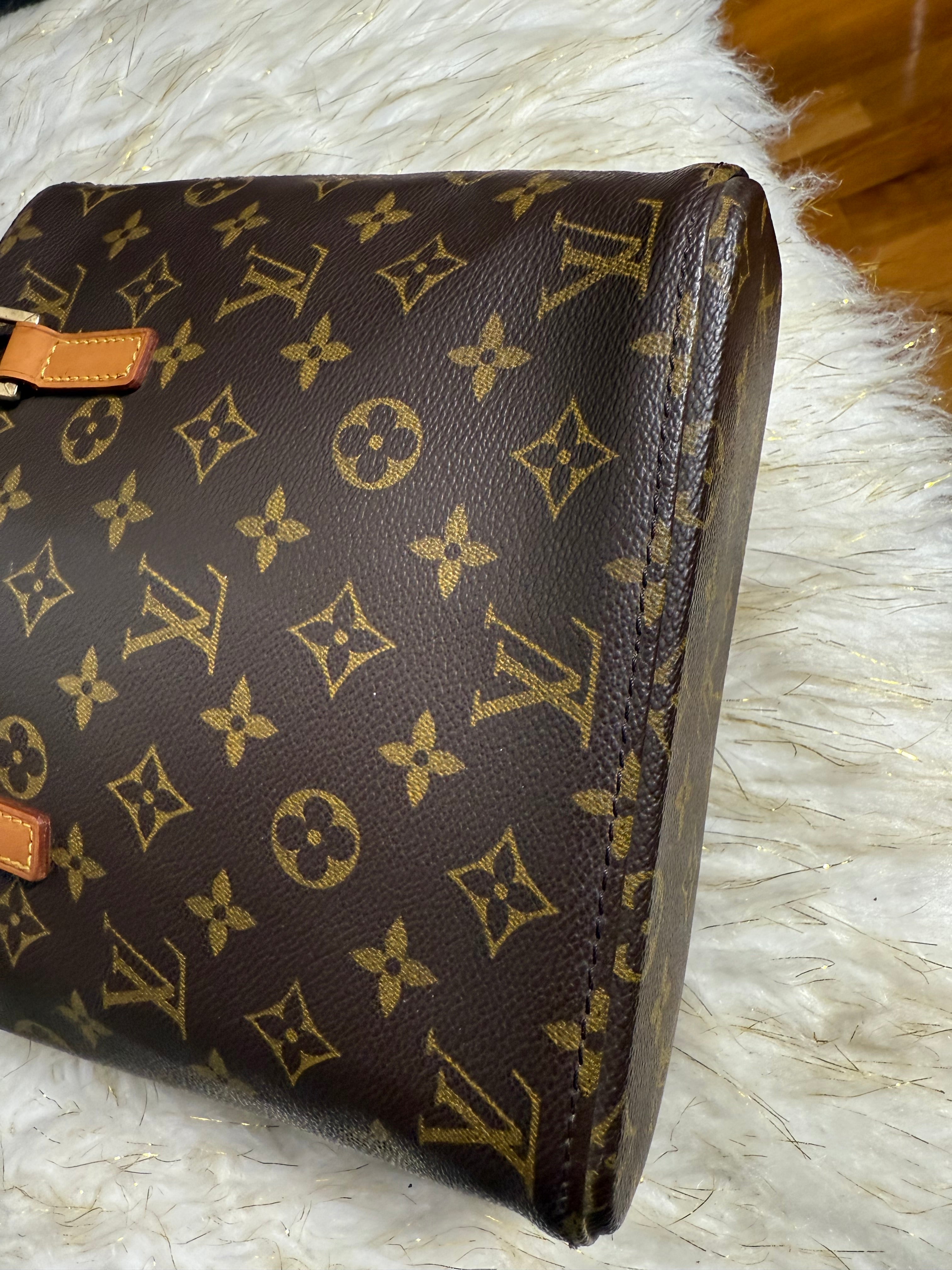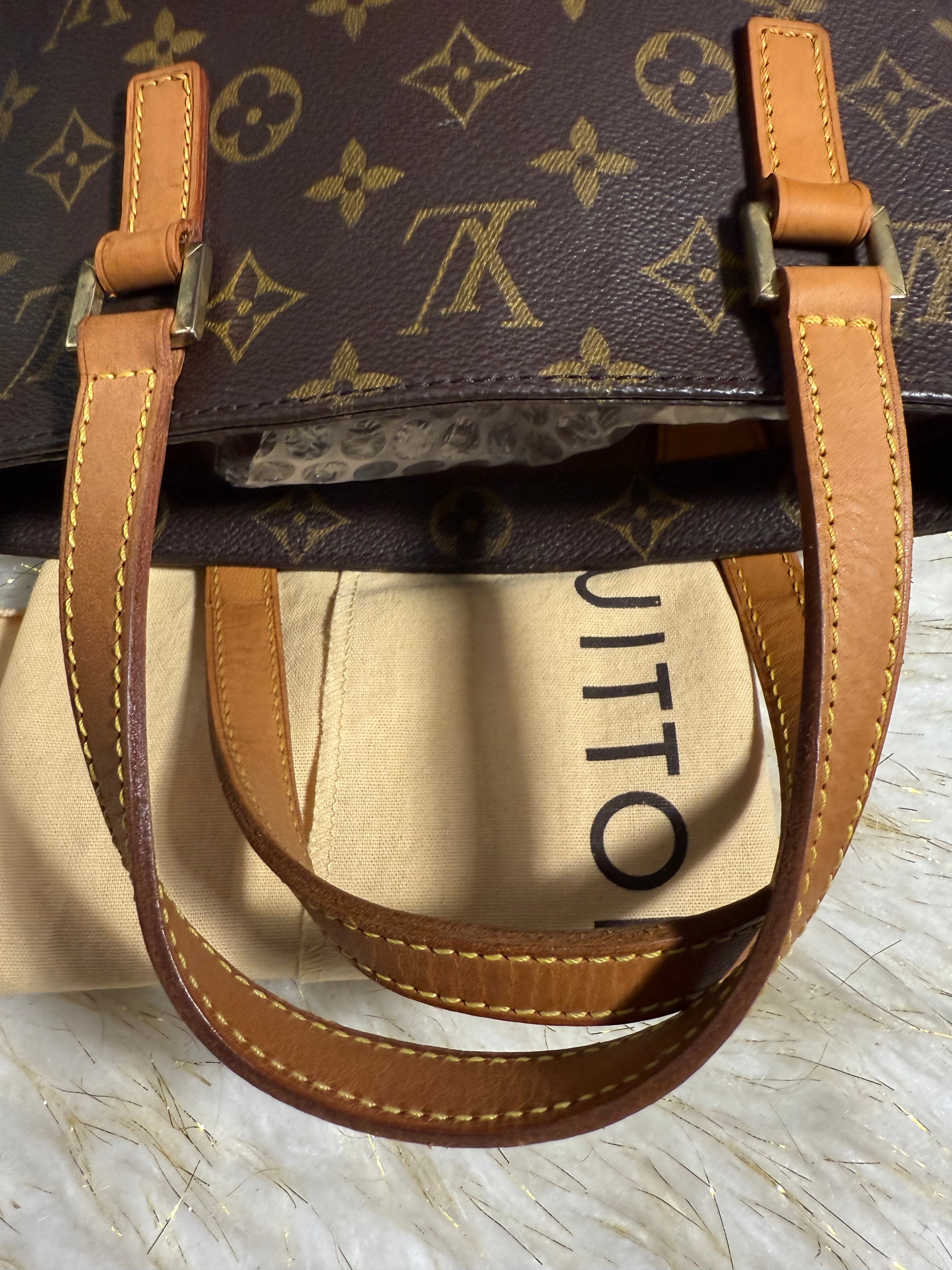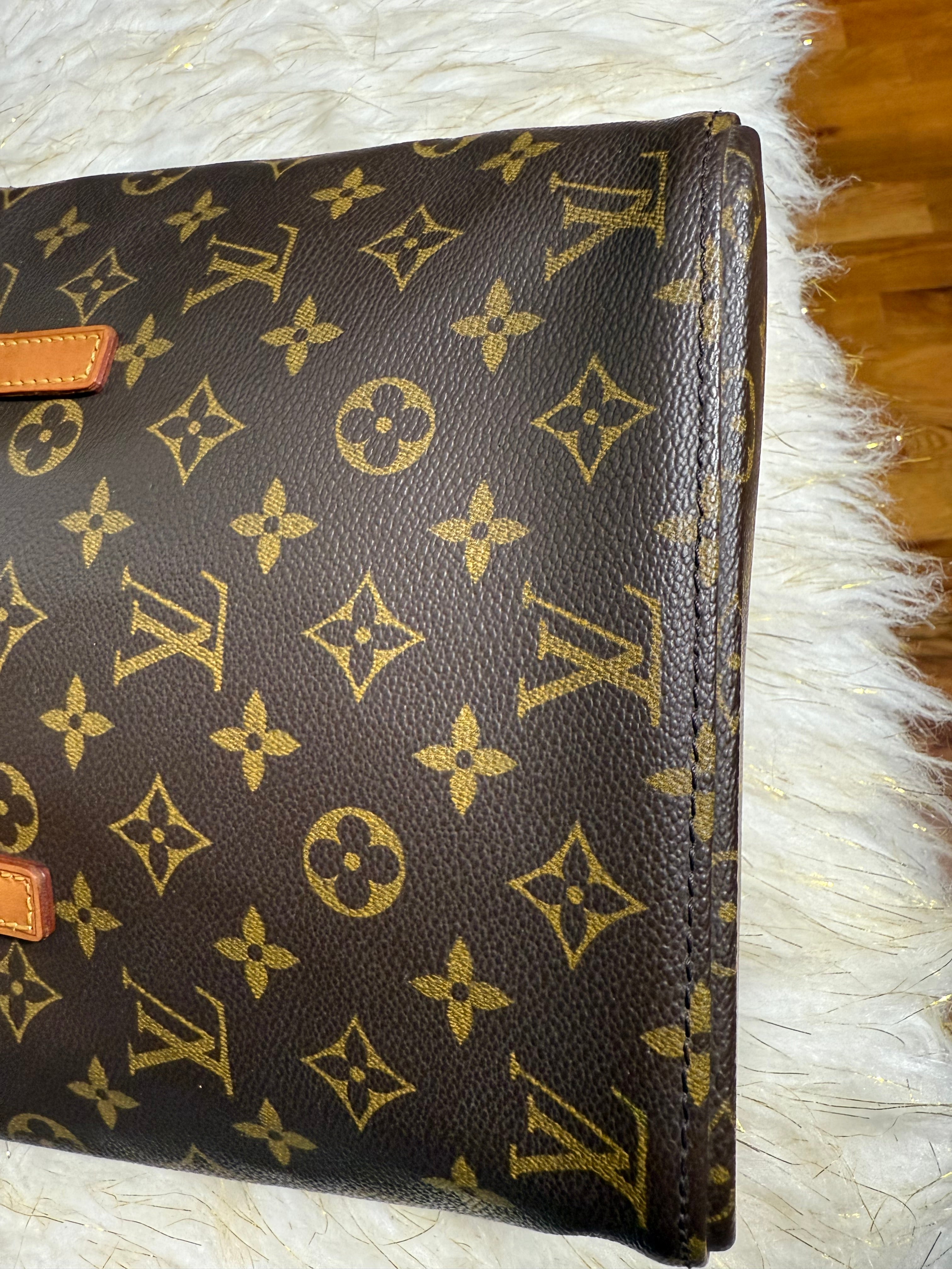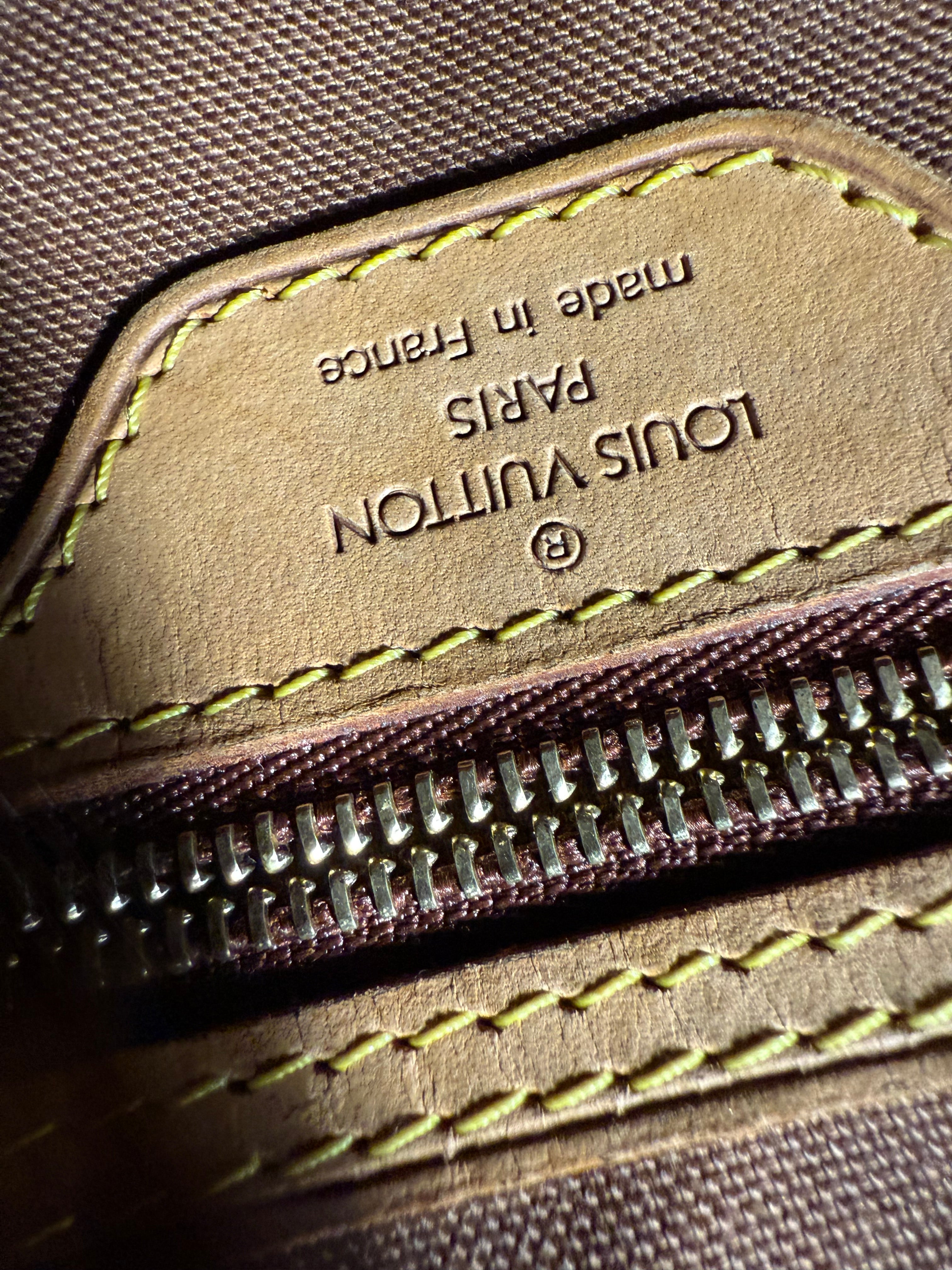 Elegant tote with iconic monogram pattern. Features brown leather and tan accents. Perfect for everyday use.