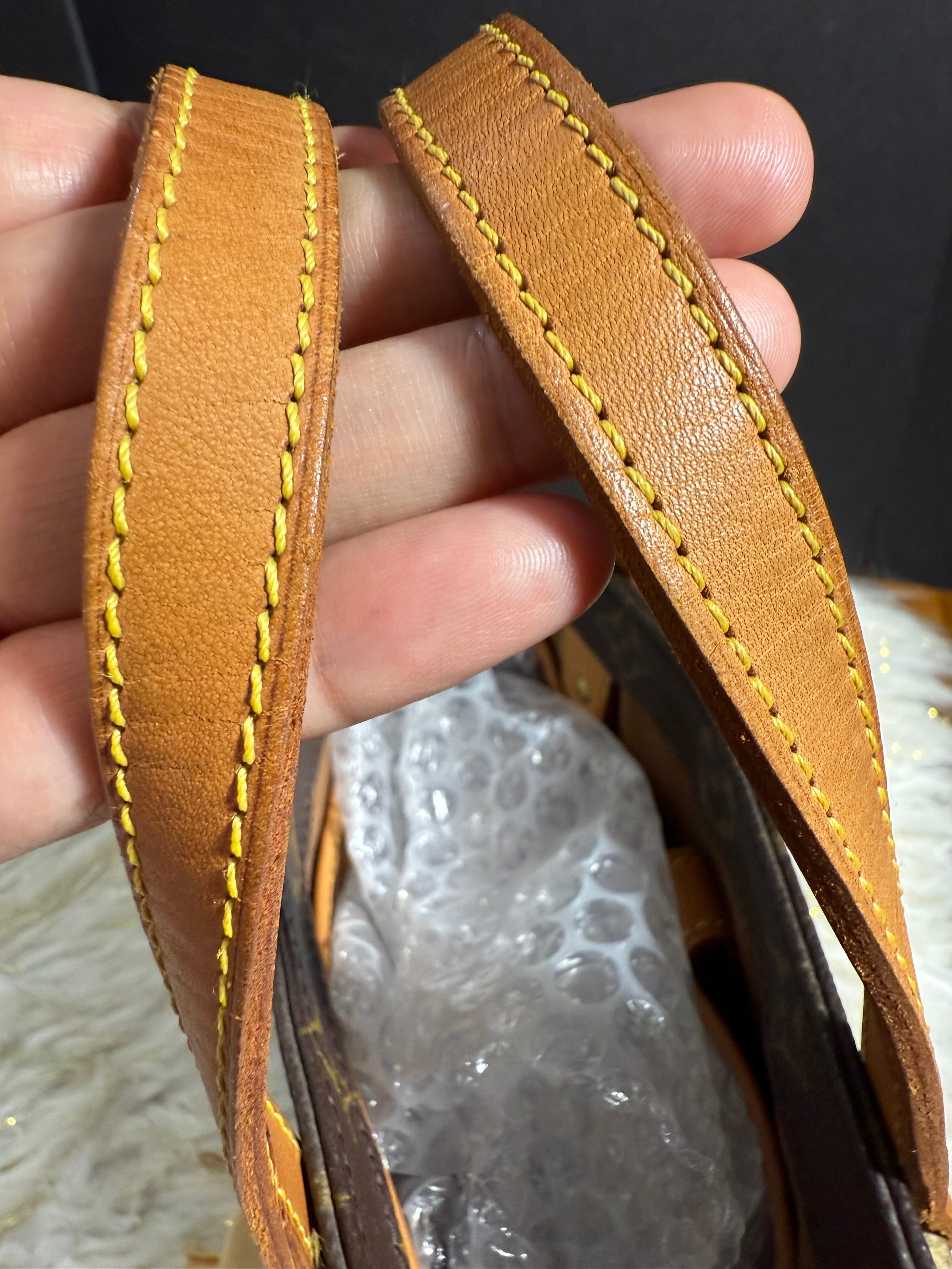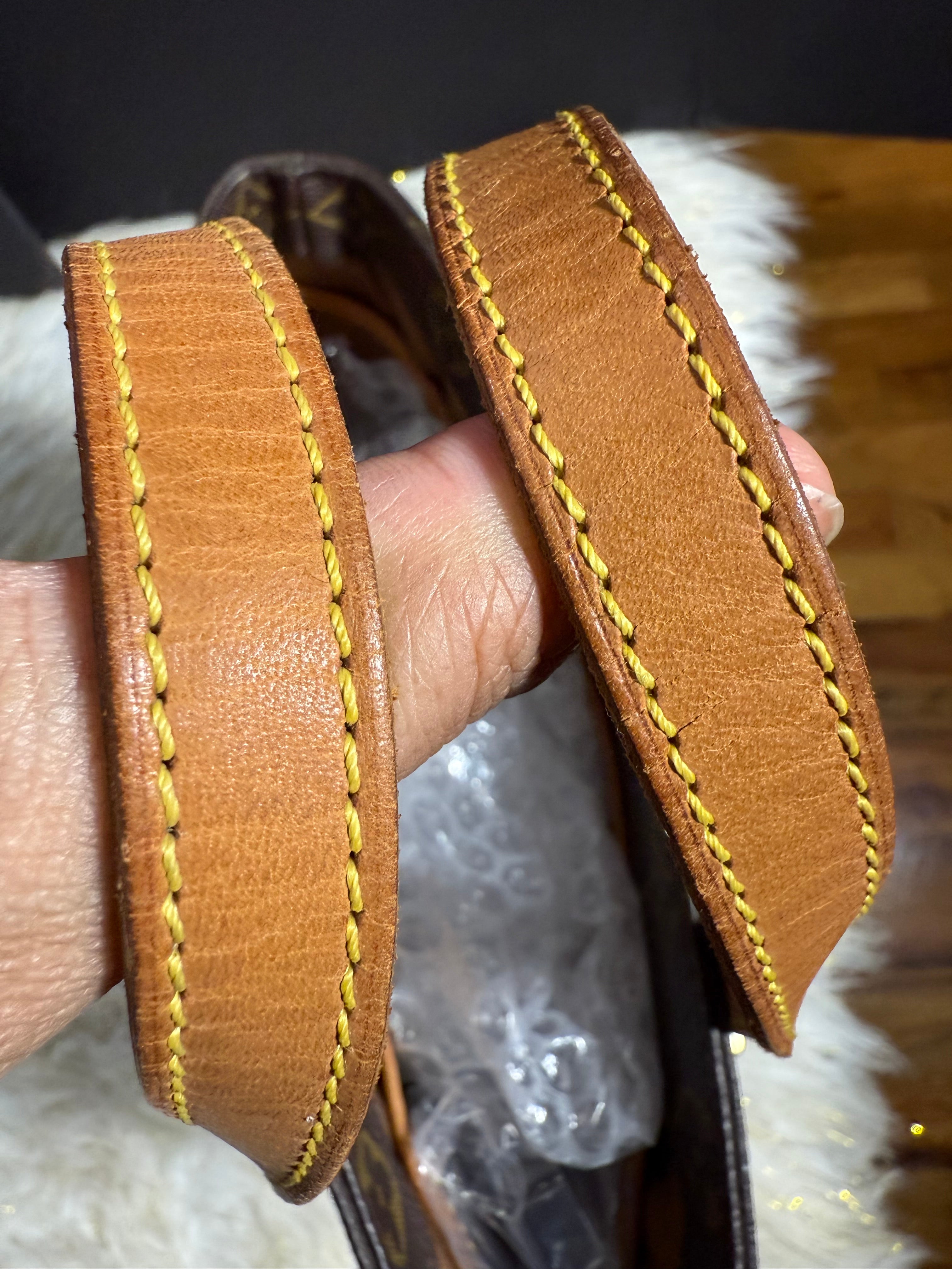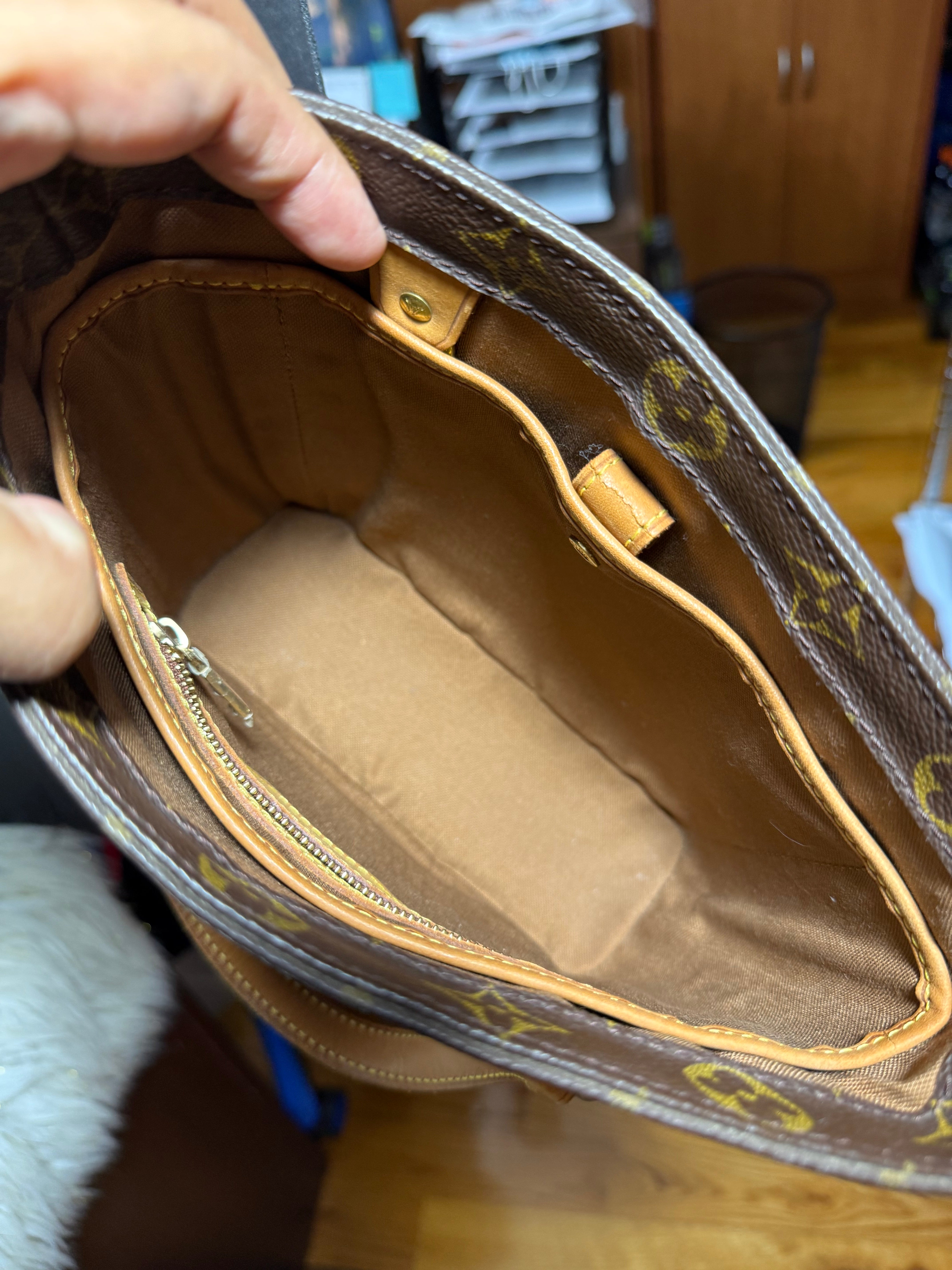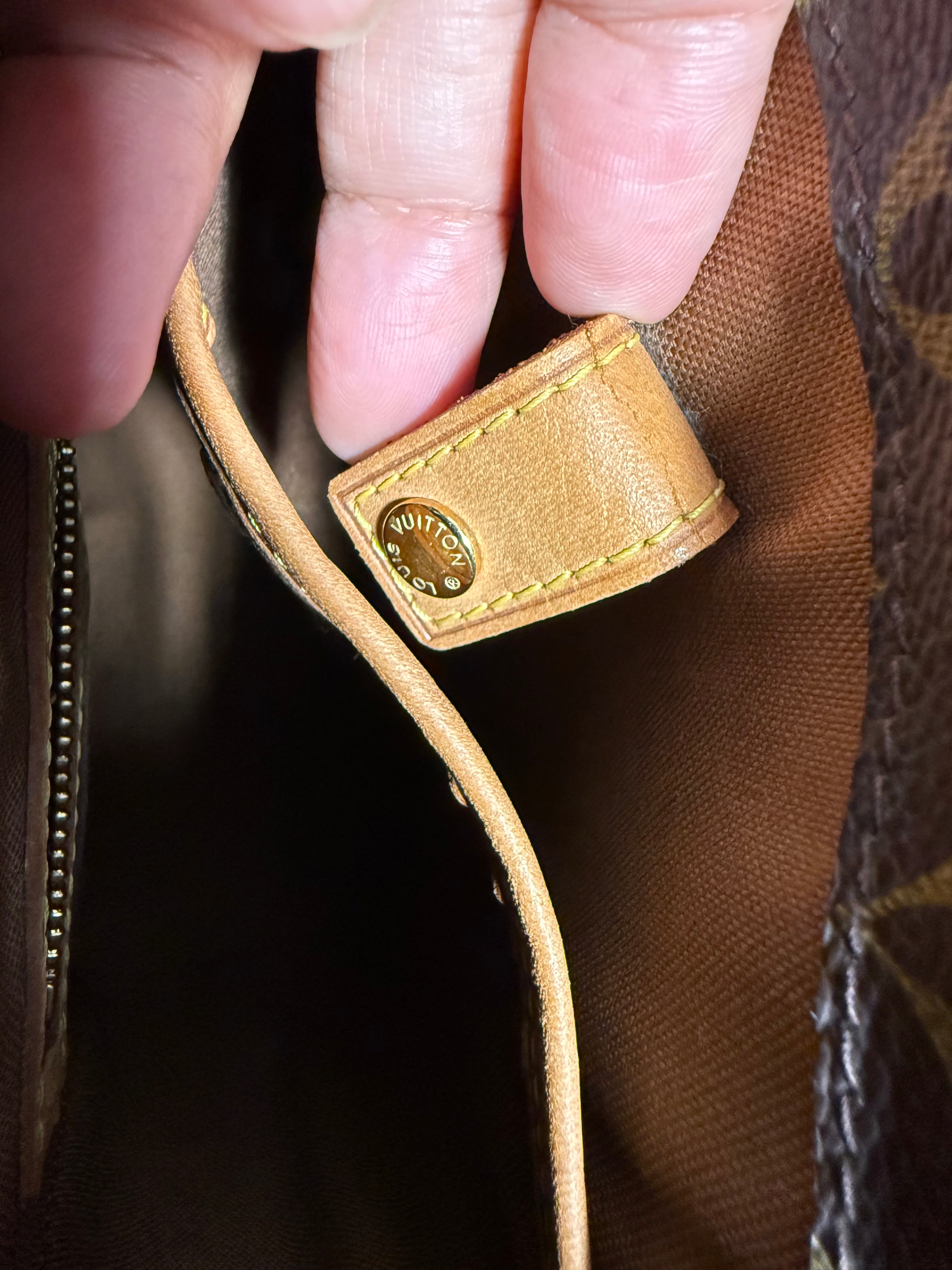 Elegant tote with iconic monogram pattern. Features brown leather and tan accents. Perfect for everyday use.