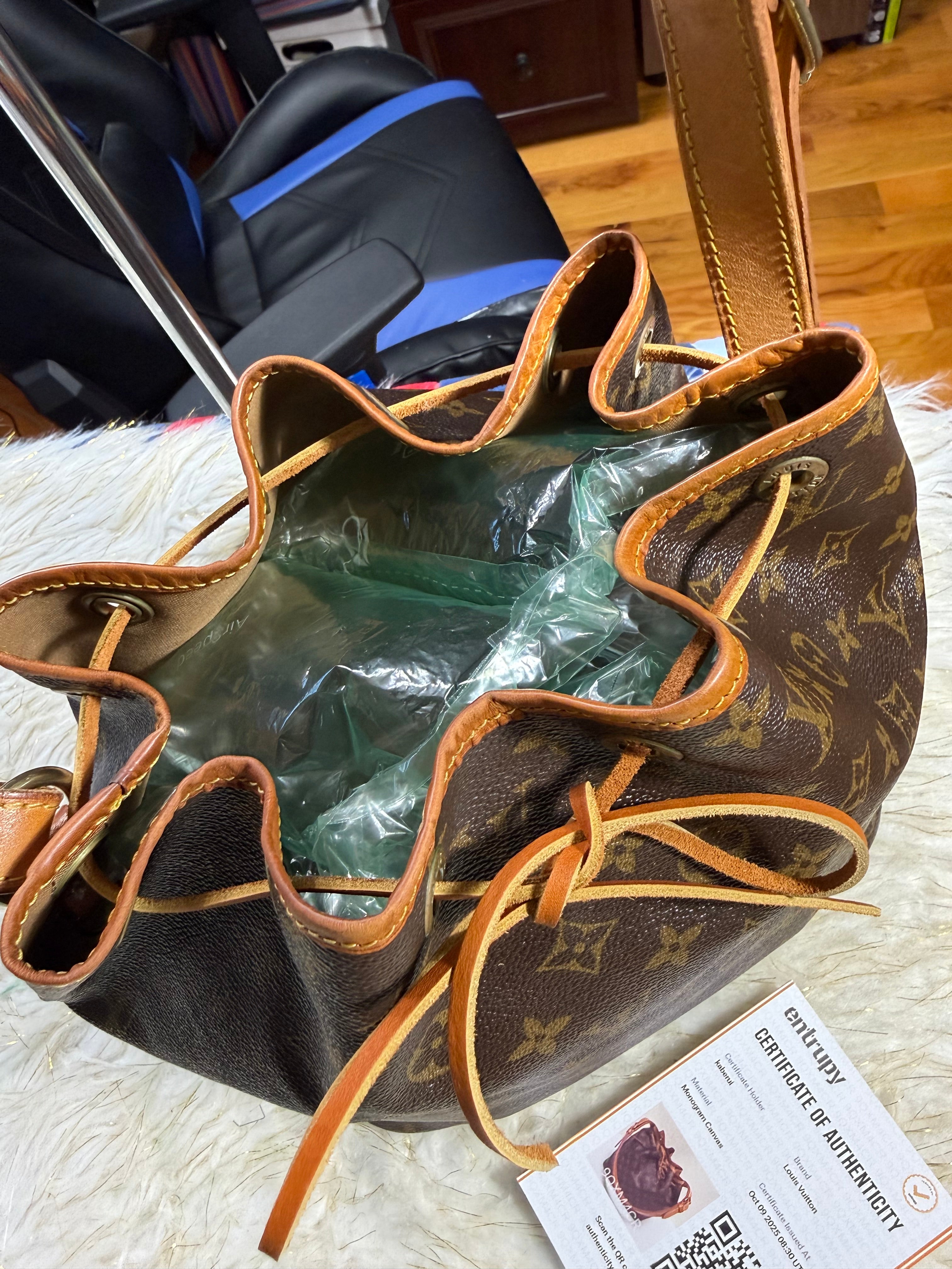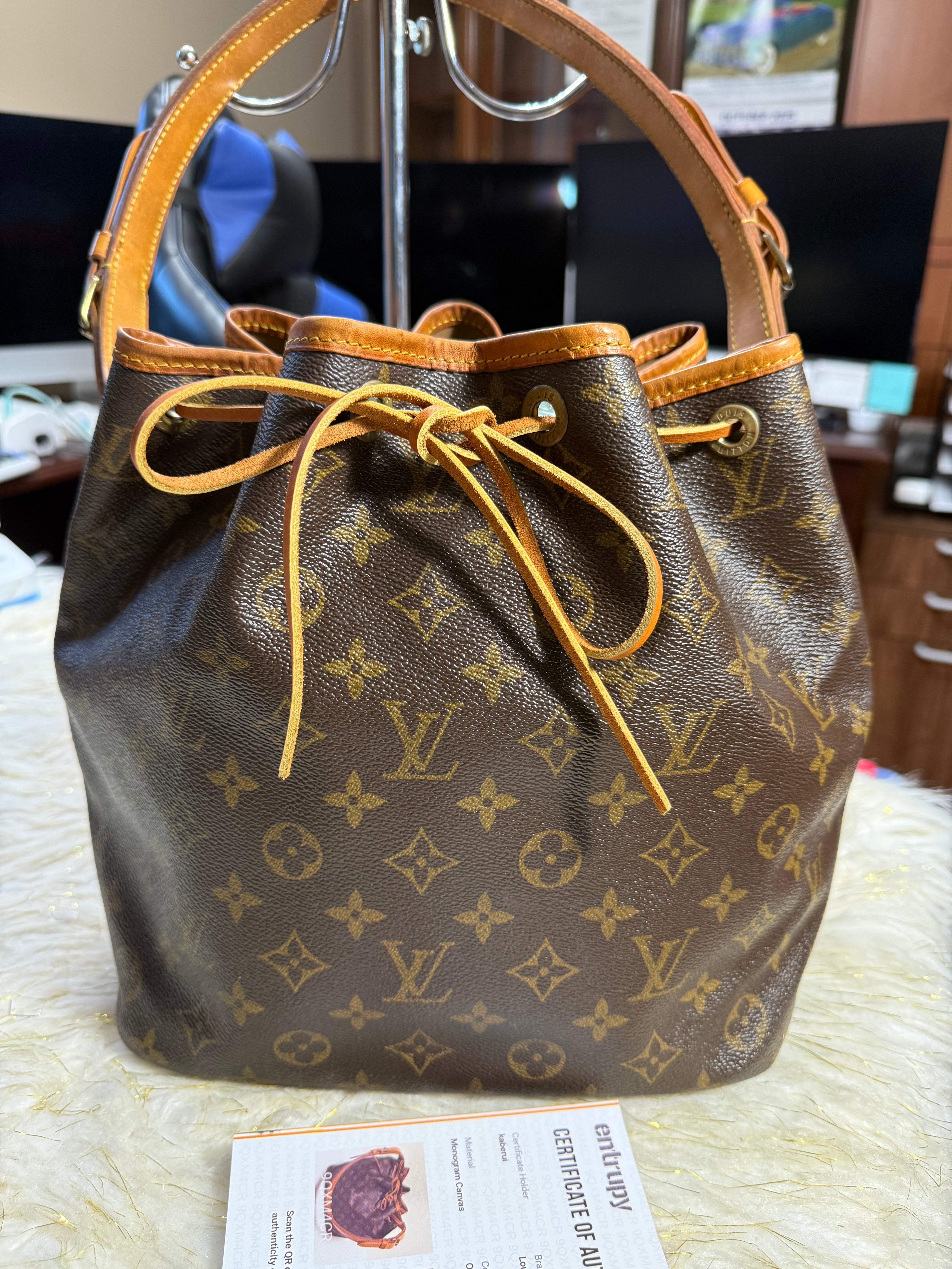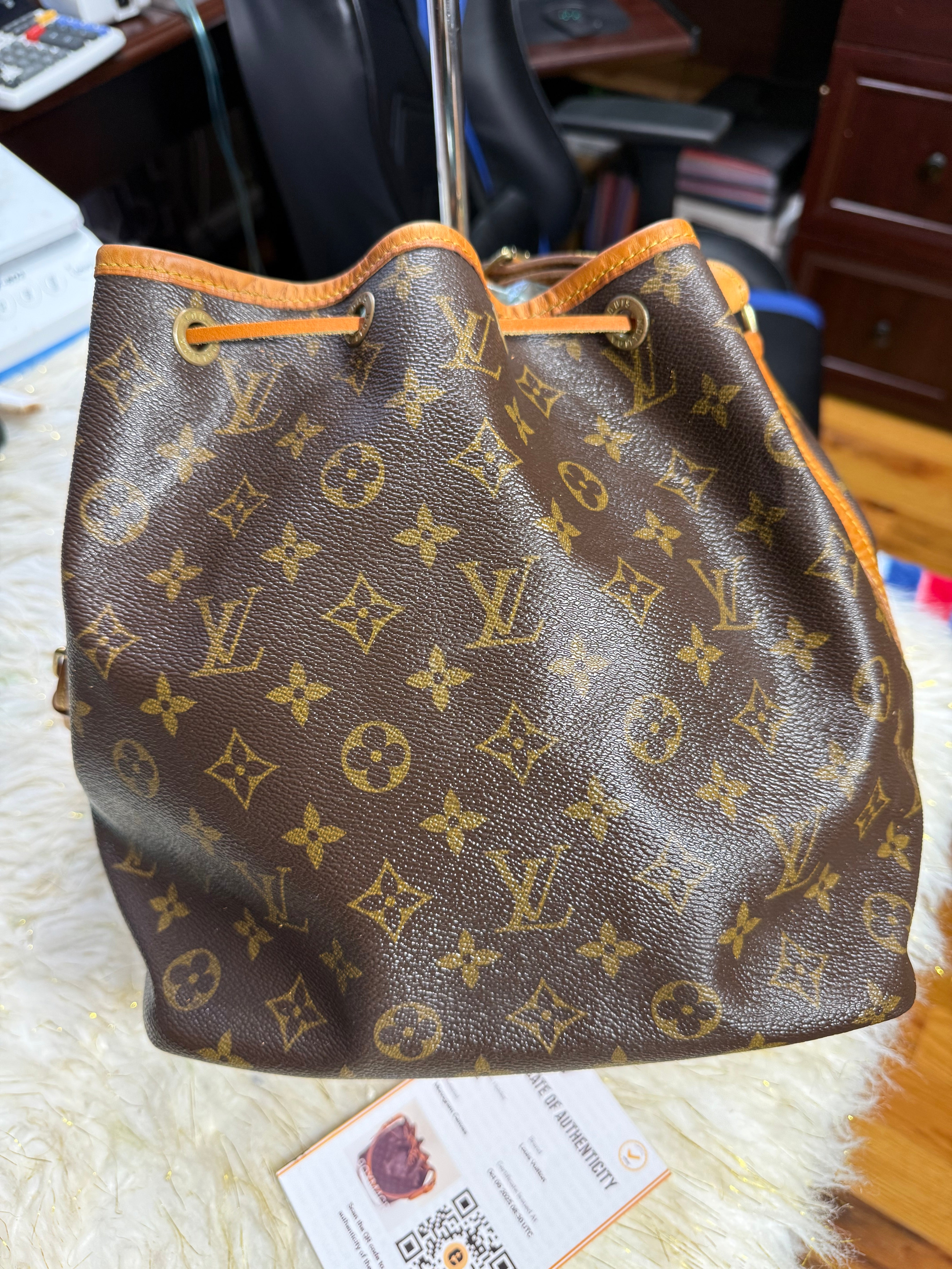 100% Authentic preowned Vintage Louis Vuitton Monogram Petit Noe Drawstring Shoulder Bag & Authentication certificate.