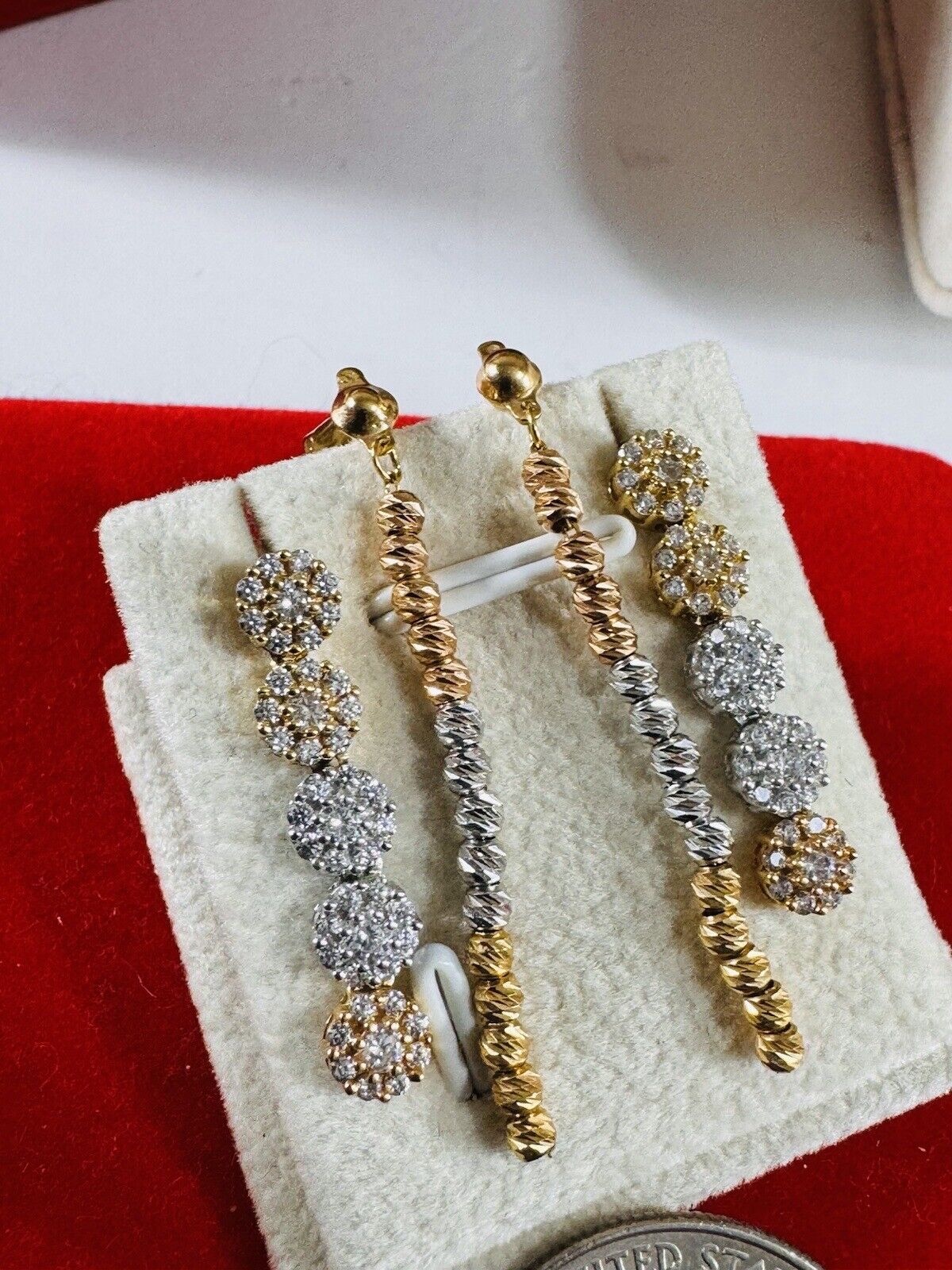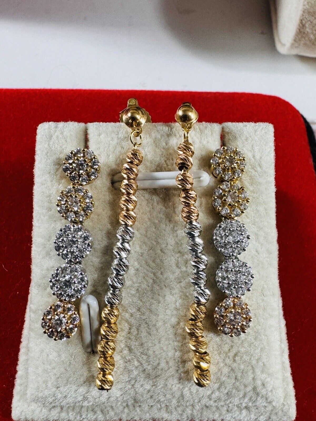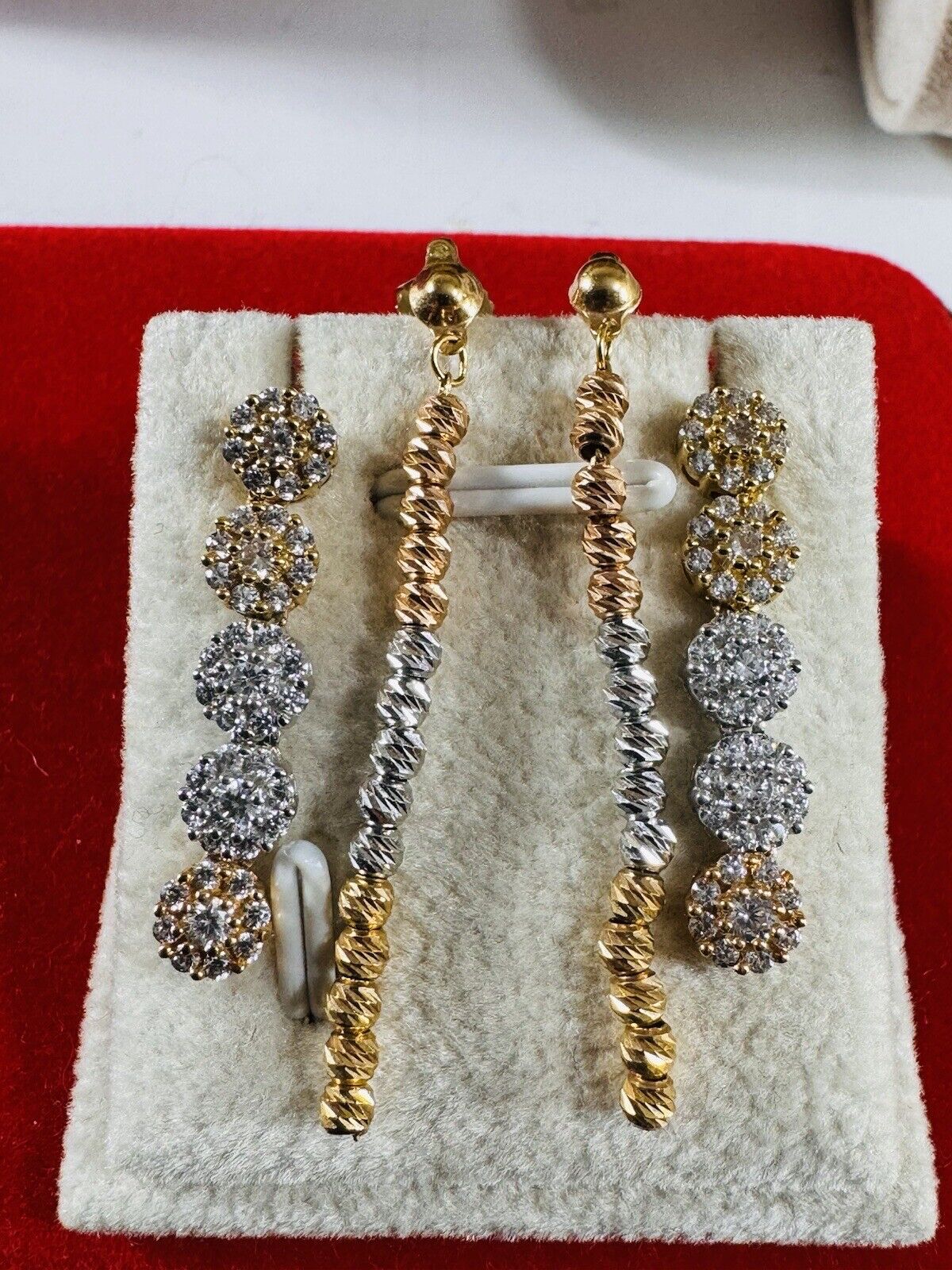You are buying Beautiful Solid 18K Earring 750 Fine Saudi Real Gold Women’s 2 set Dangle Earrings 5.4g Stone is Not real diamond. Tricolors- Fast Ship!