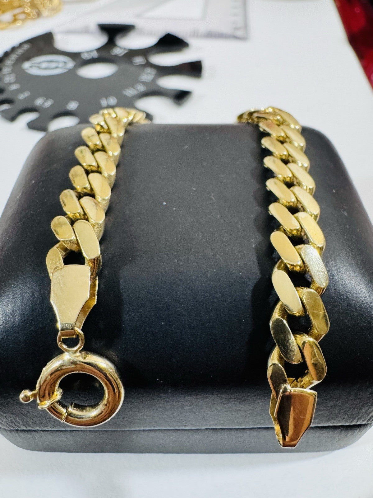 The bracelet is designed with a Cuban secure closure and measures 7.5 inches in length. fits on small