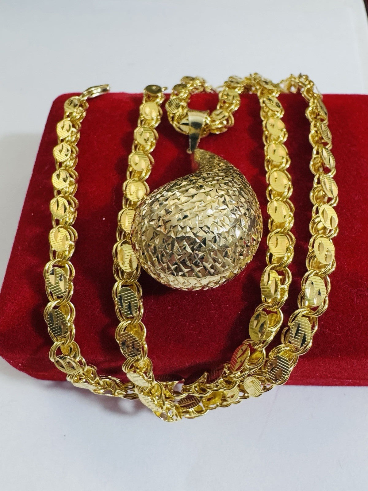 This stunning 18K 750 fine yellow gold chain necklace is a timeless piece perfect for any occasion. The Set necklace is 17.7” inches features a secured closure for easy wear 13.34 grams 5mm chain. Pendant is reversible and hollow inside.