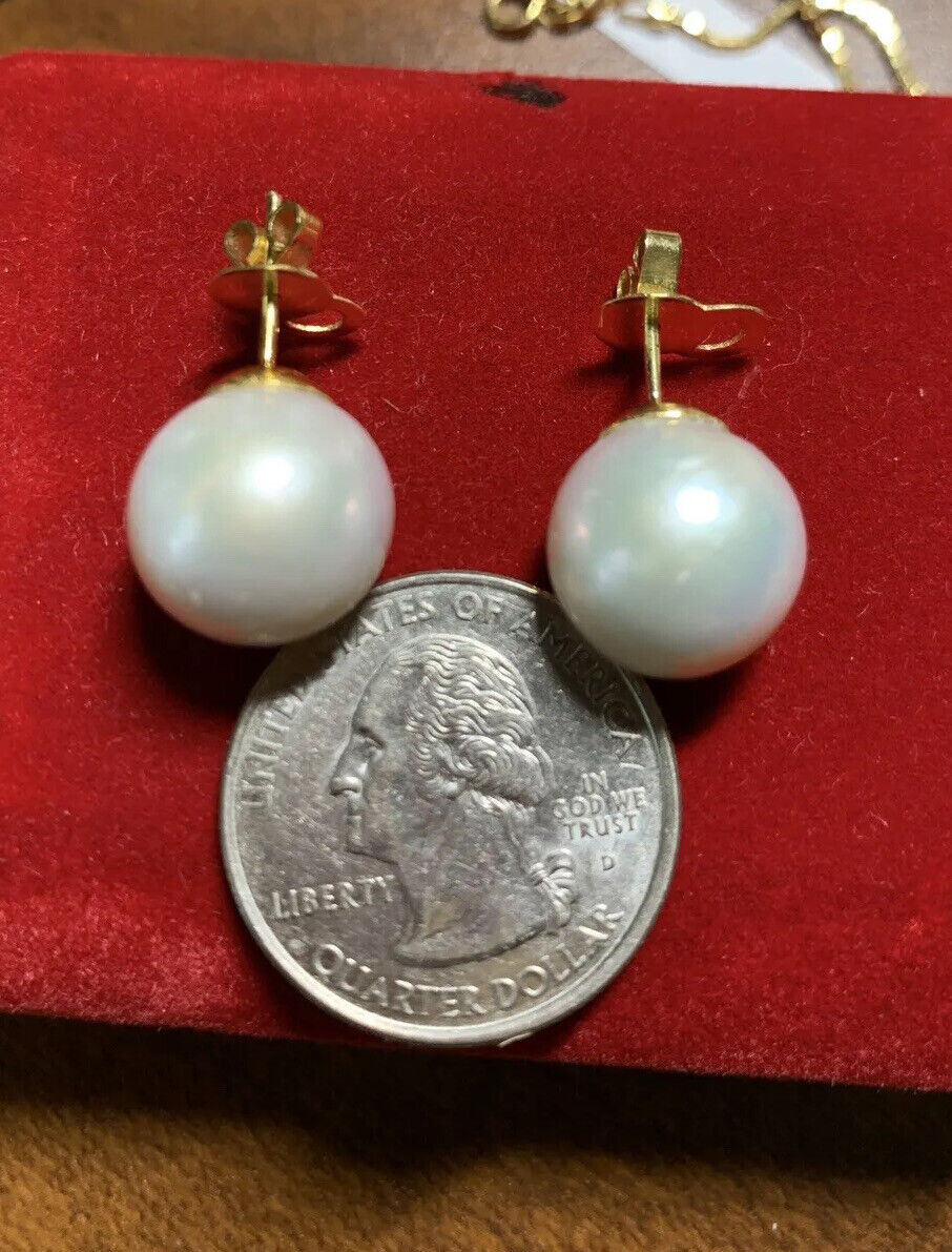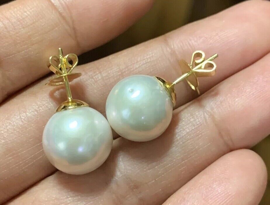 18K Fine Saudi Real Gold Women’s South Sea White Pearl Earring 13mm 7.93g