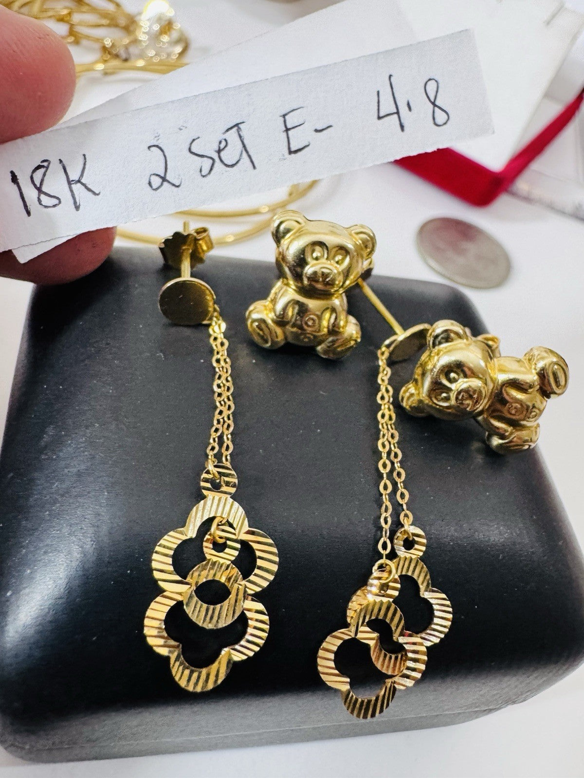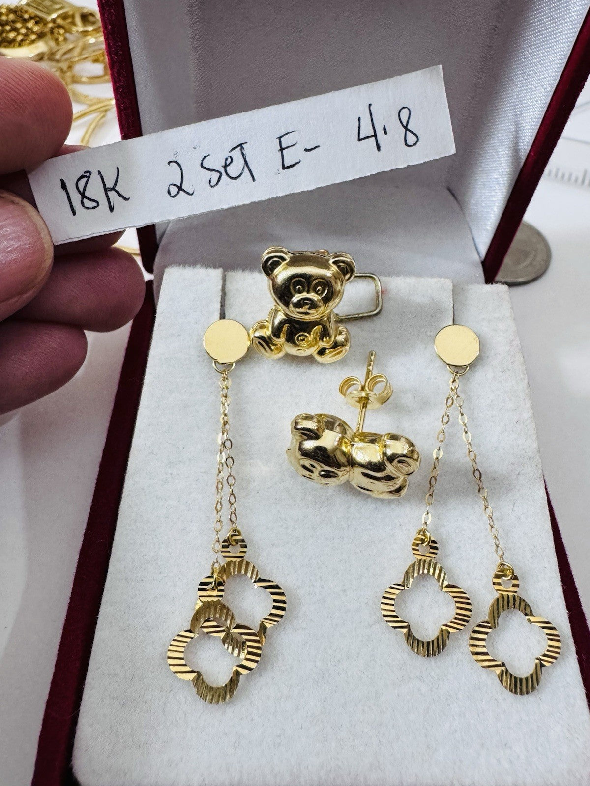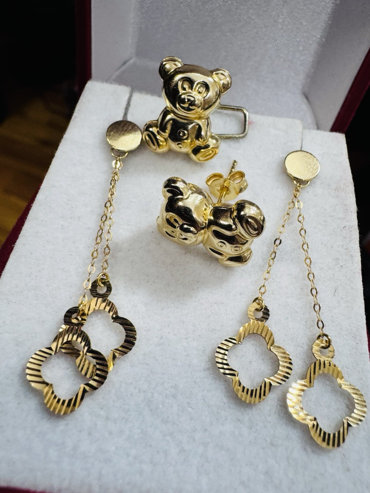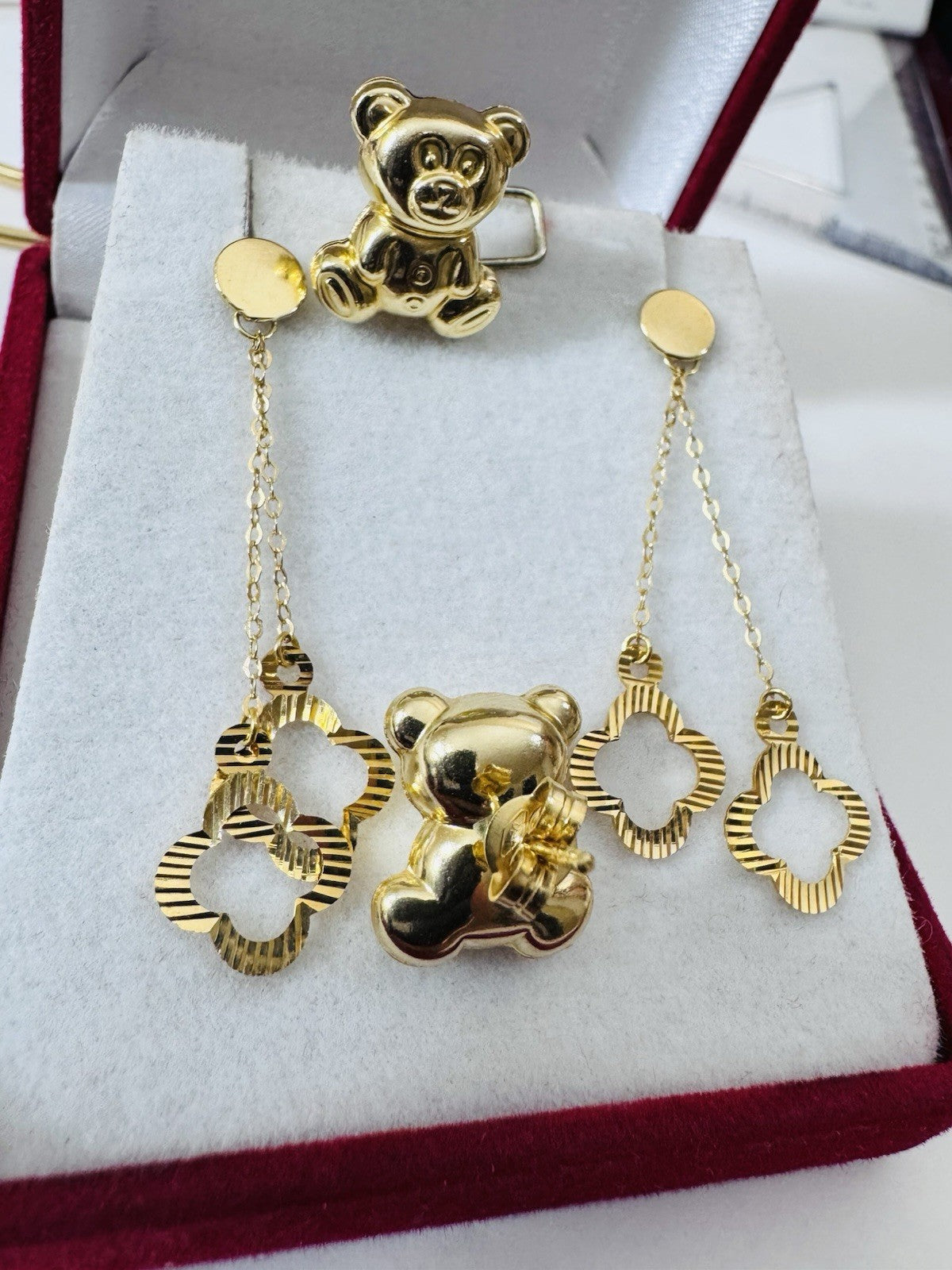 Genuine 18K 750 Fine Real Gold Dangle & Bear ( 2 ) Two Set Earrings 4.8g