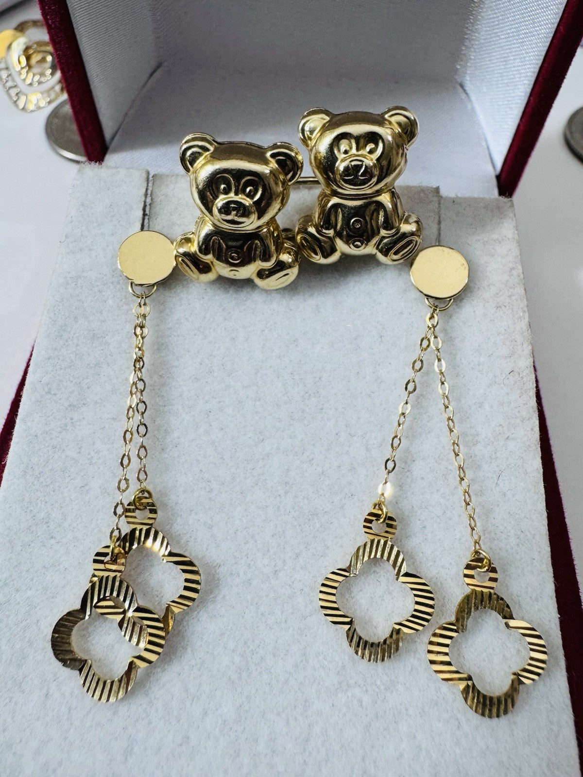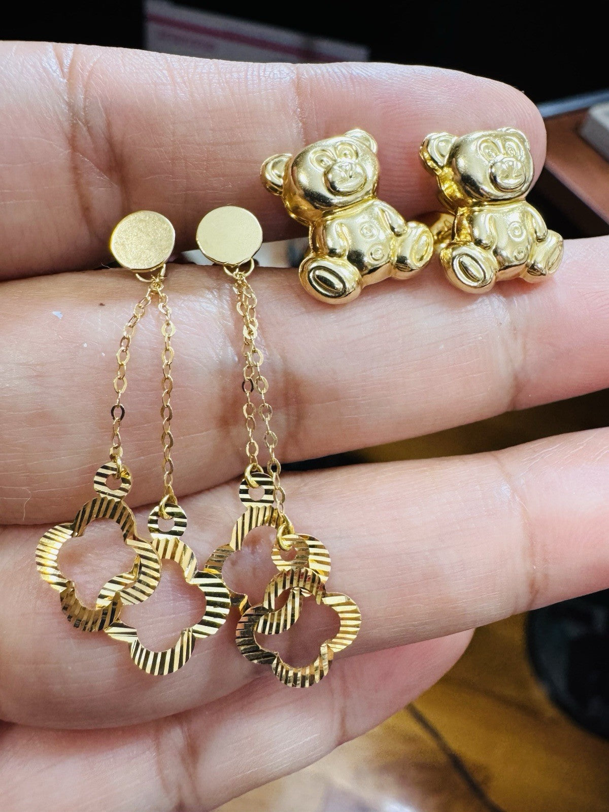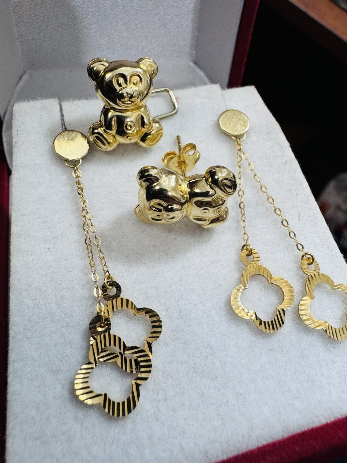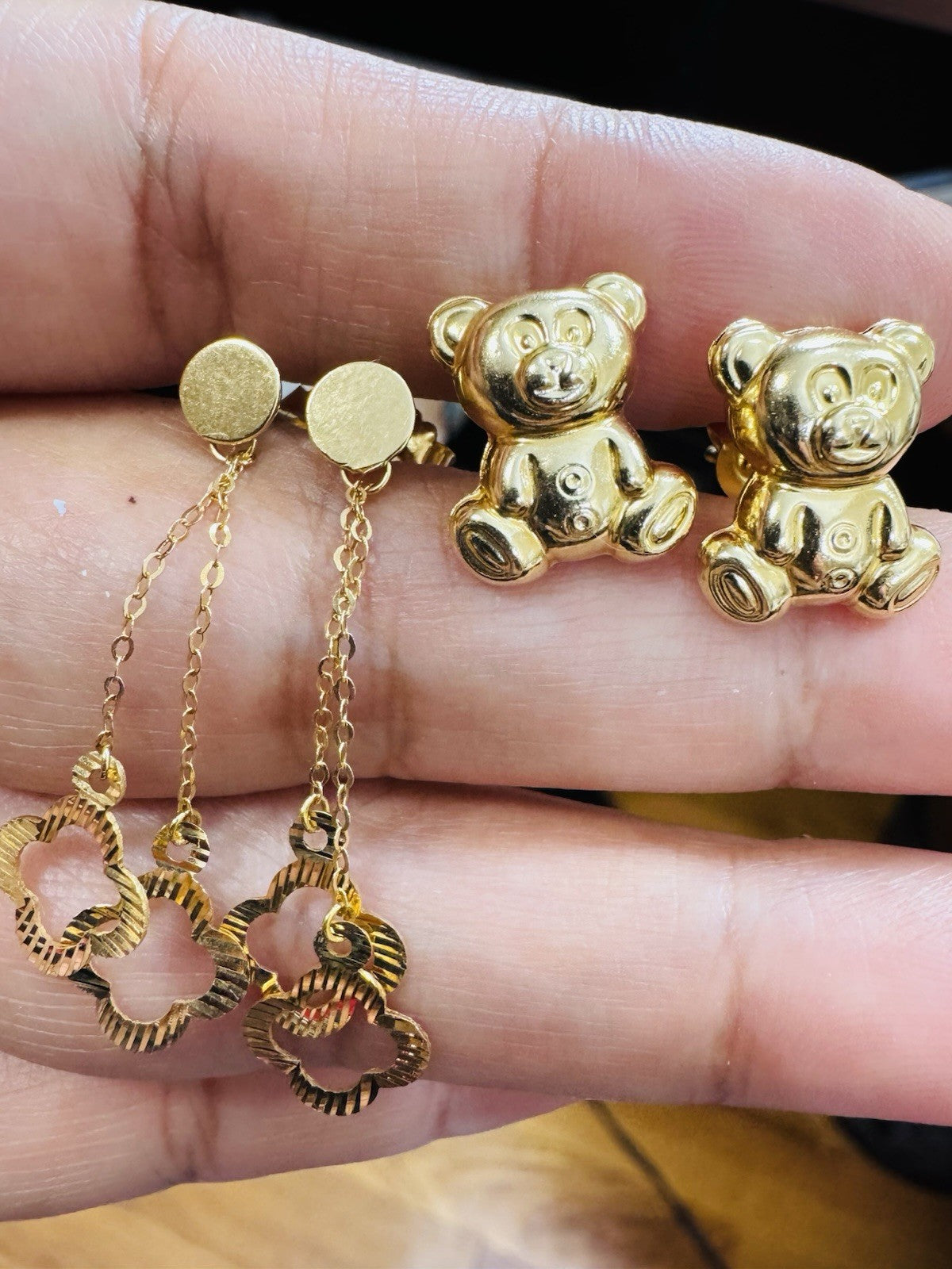 Genuine 18K 750 Fine Real Gold Dangle & Bear ( 2 ) Two Set Earrings 4.8g