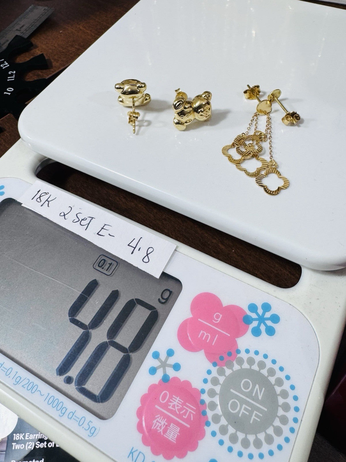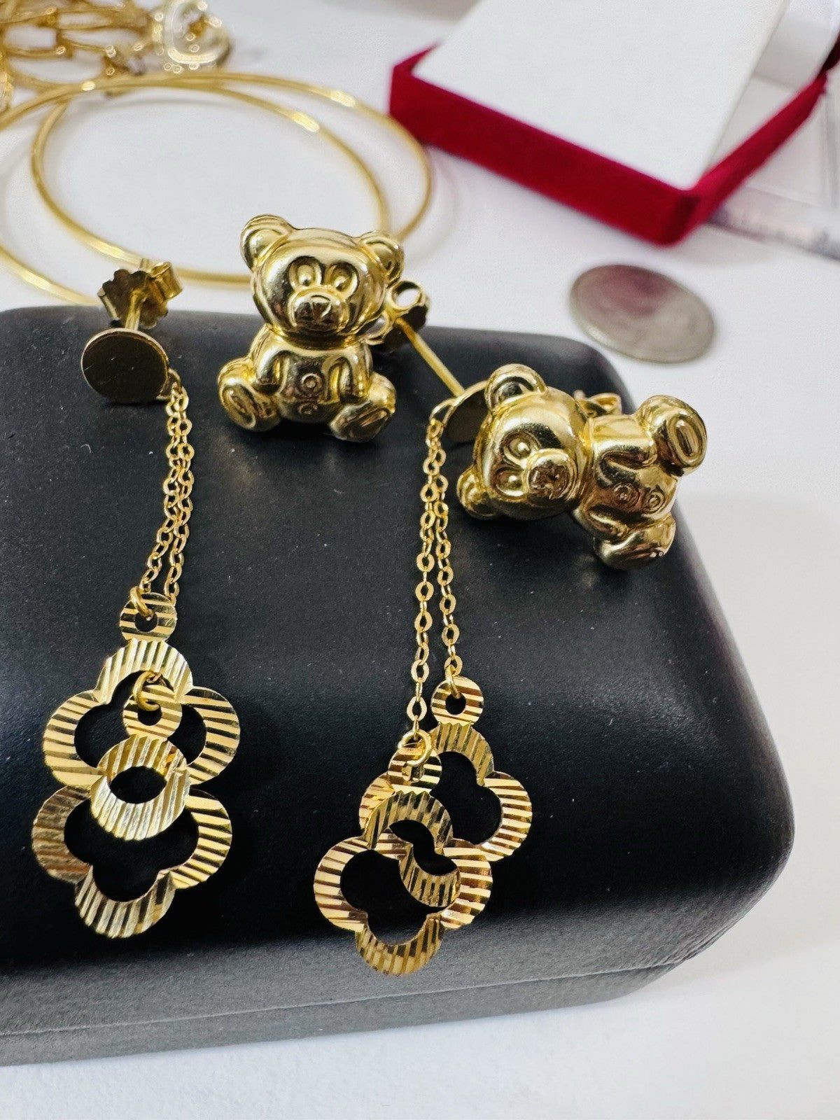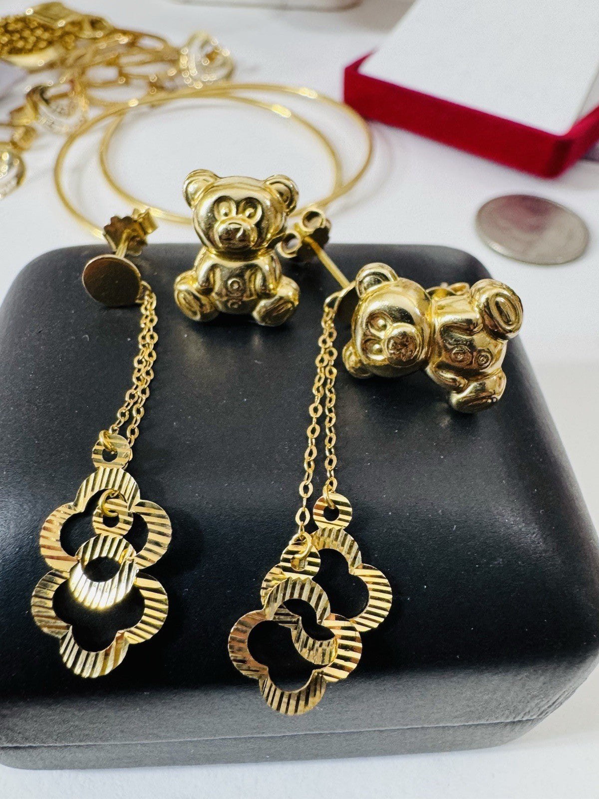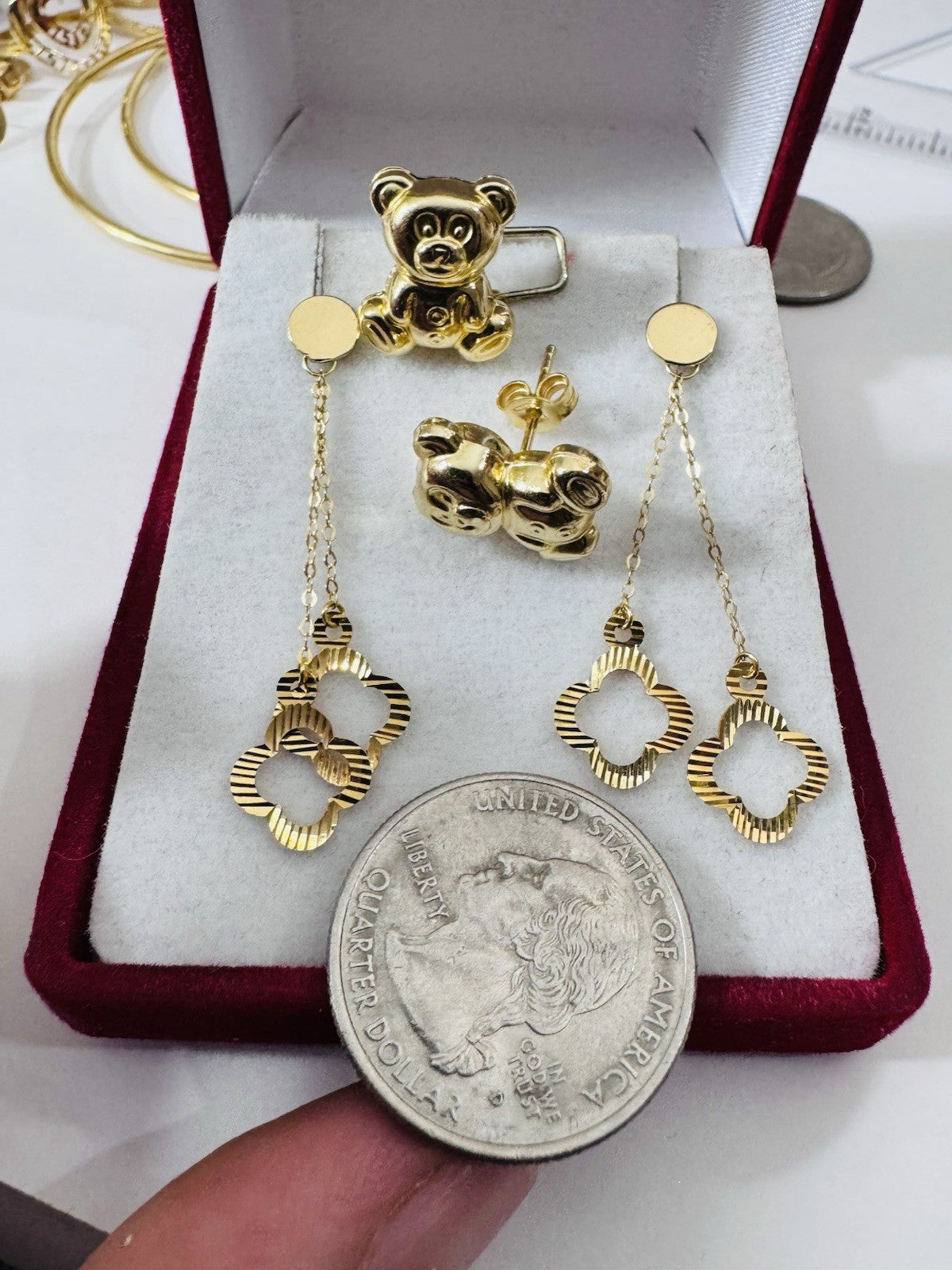 Genuine 18K 750 Fine Real Gold Dangle & Bear ( 2 ) Two Set Earrings 4.8g