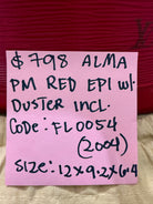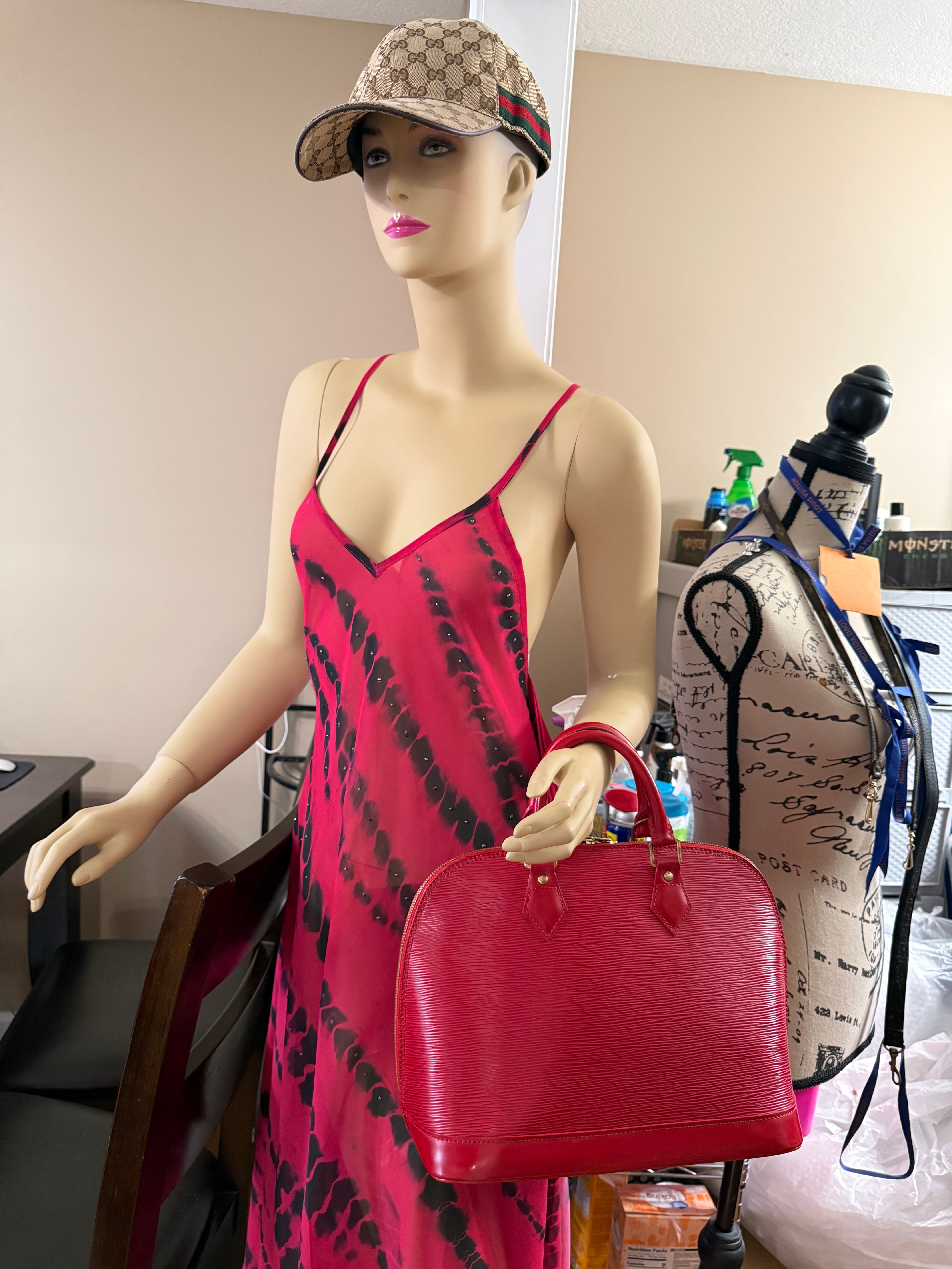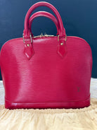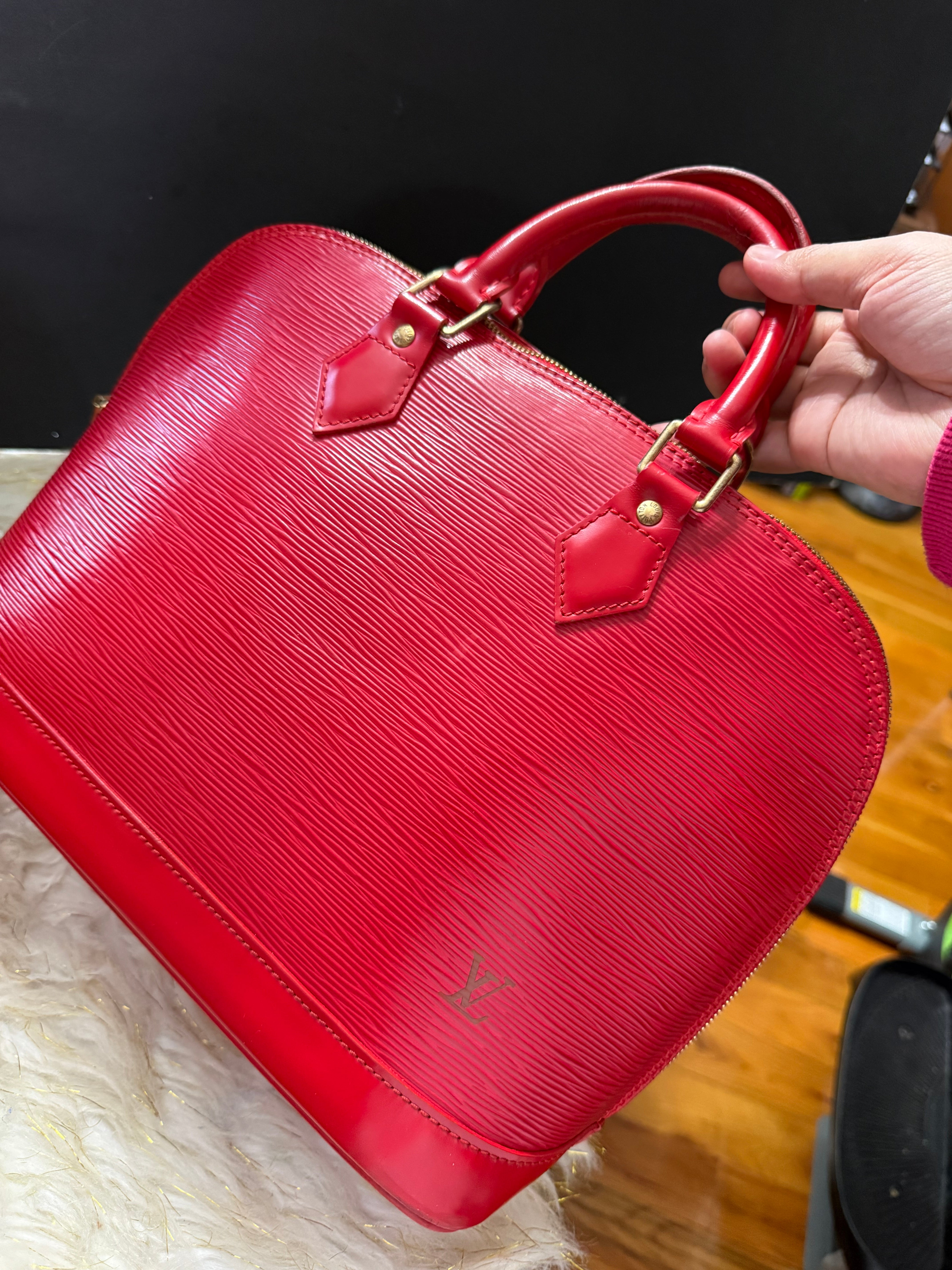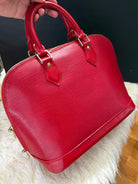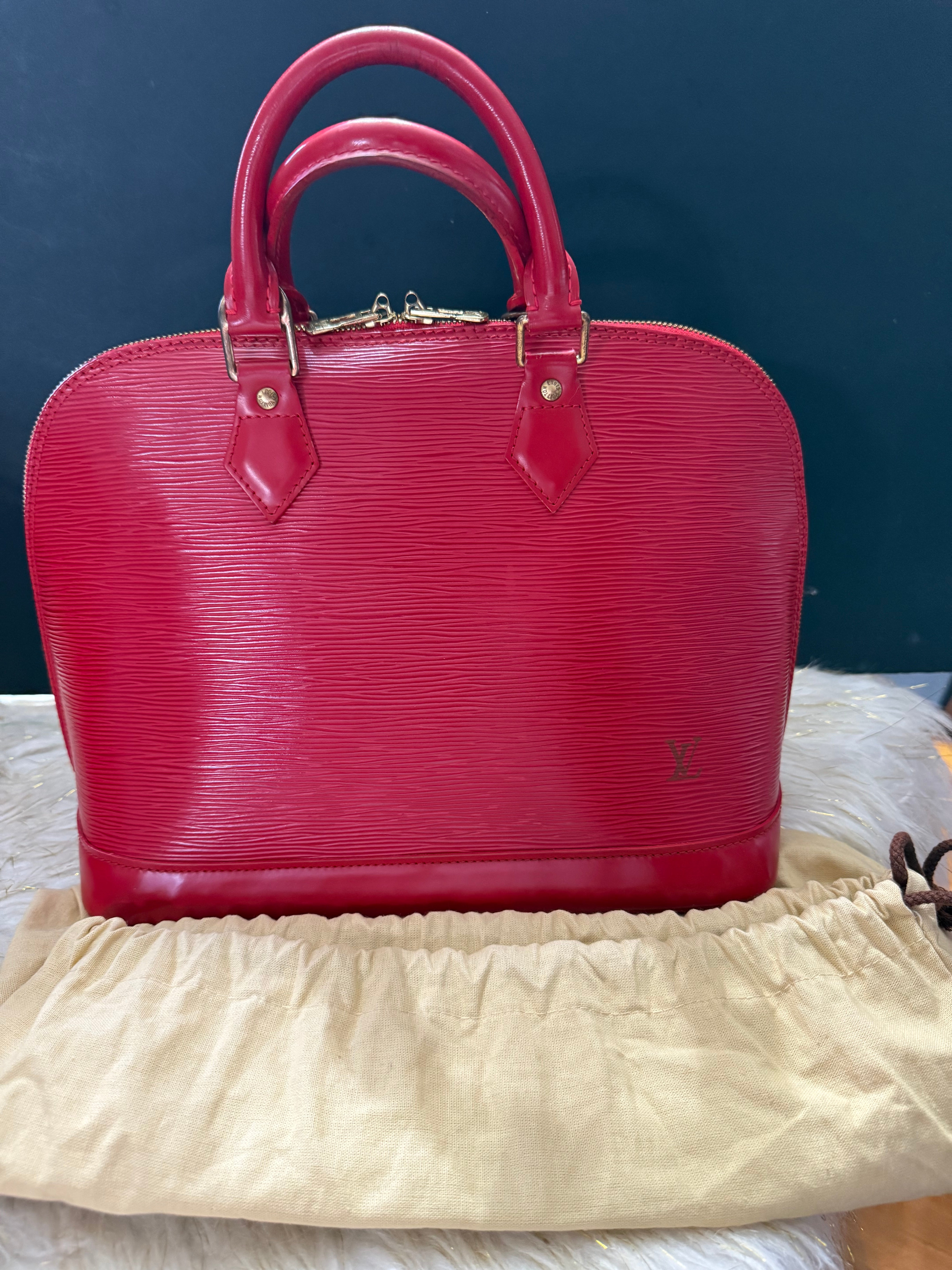 Auth Vintage Louis Vuitton Alma Pm red epi handbag with duster.