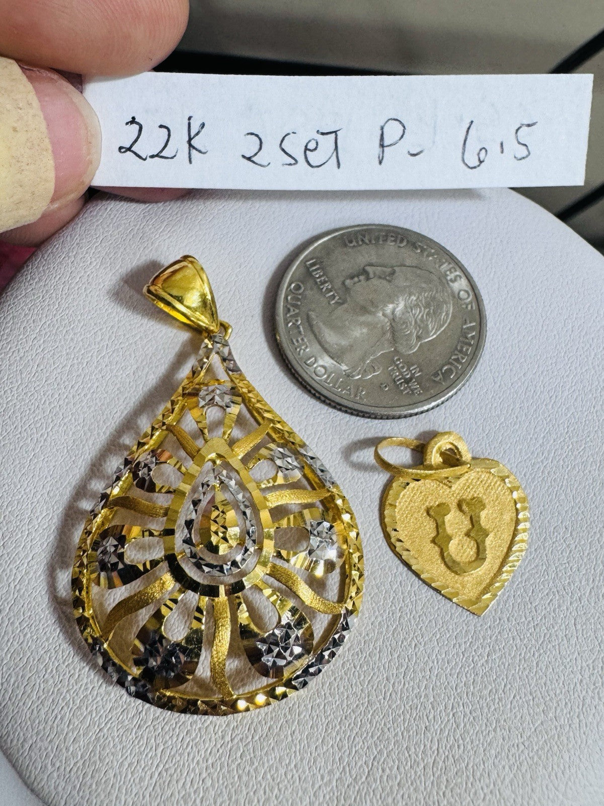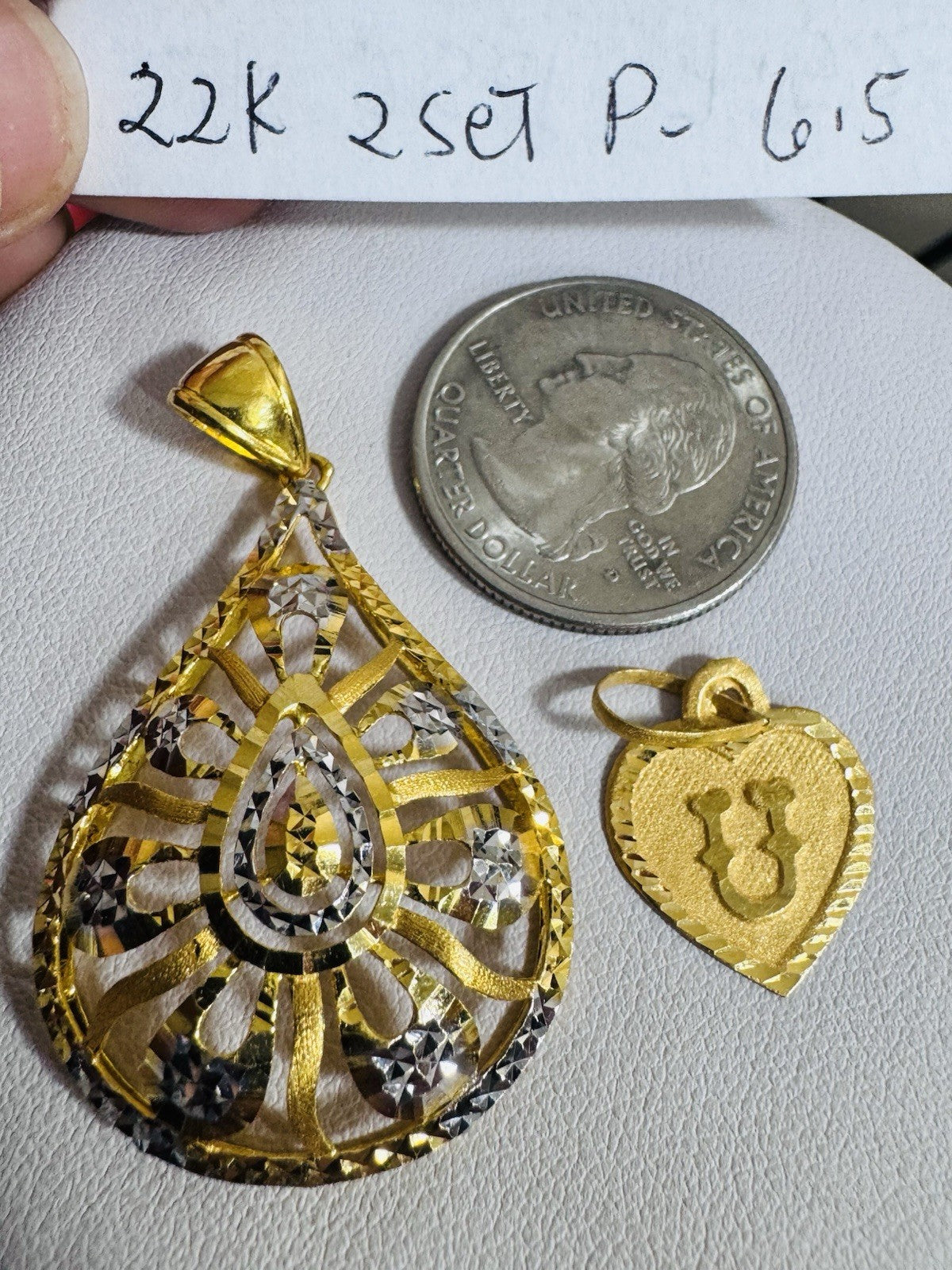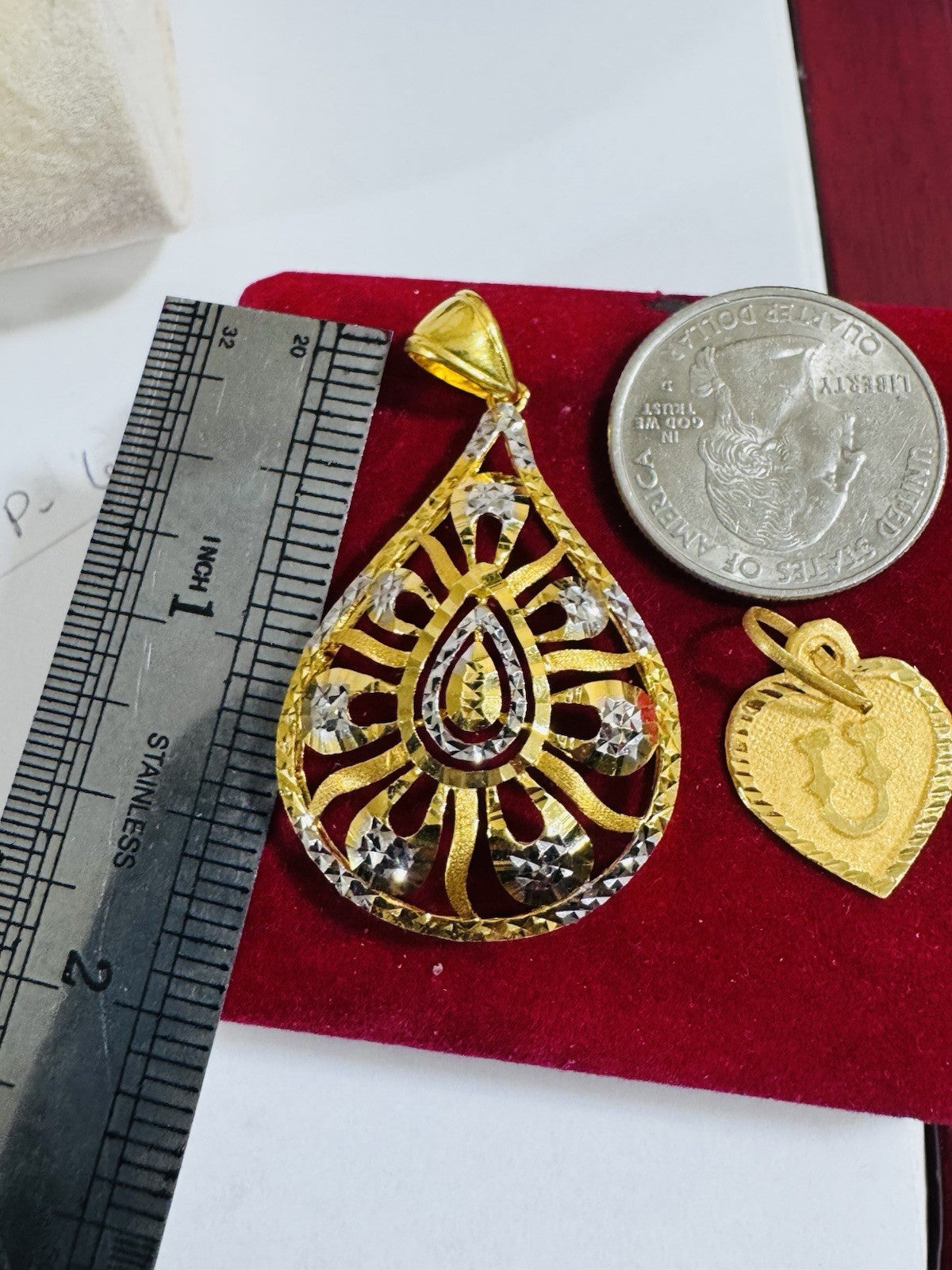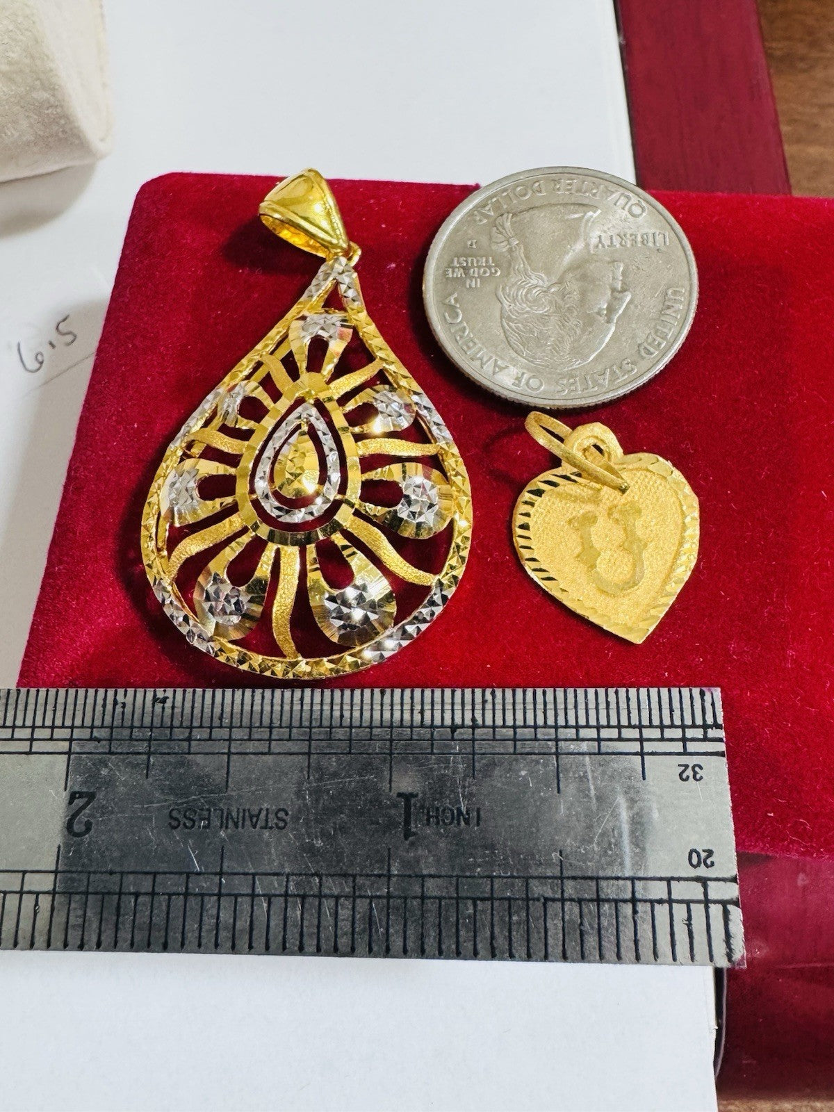 New 22K 916 Fine Real Gold Two (2) Set of Pendant Teardrop & Heart U, 6.5g