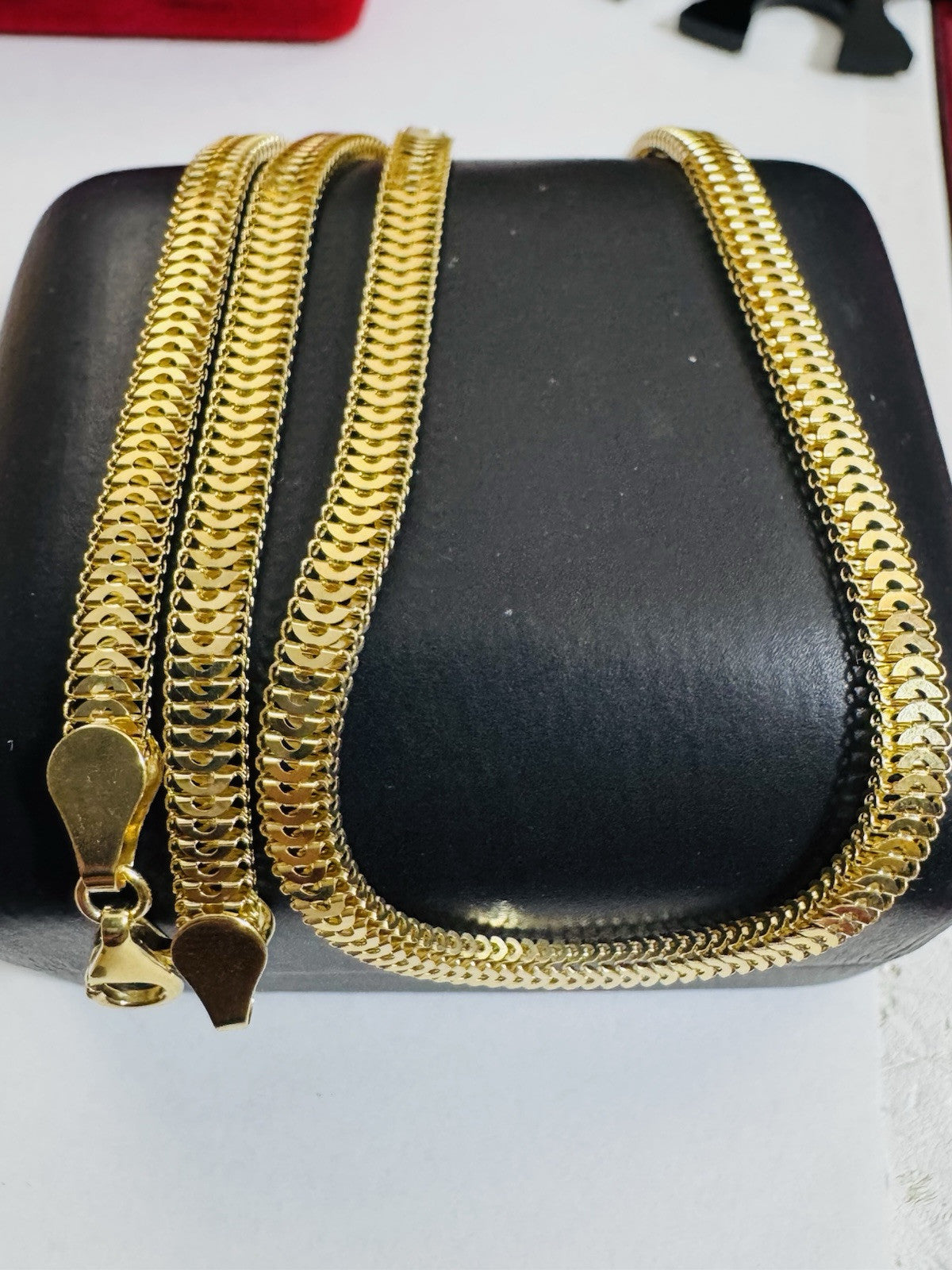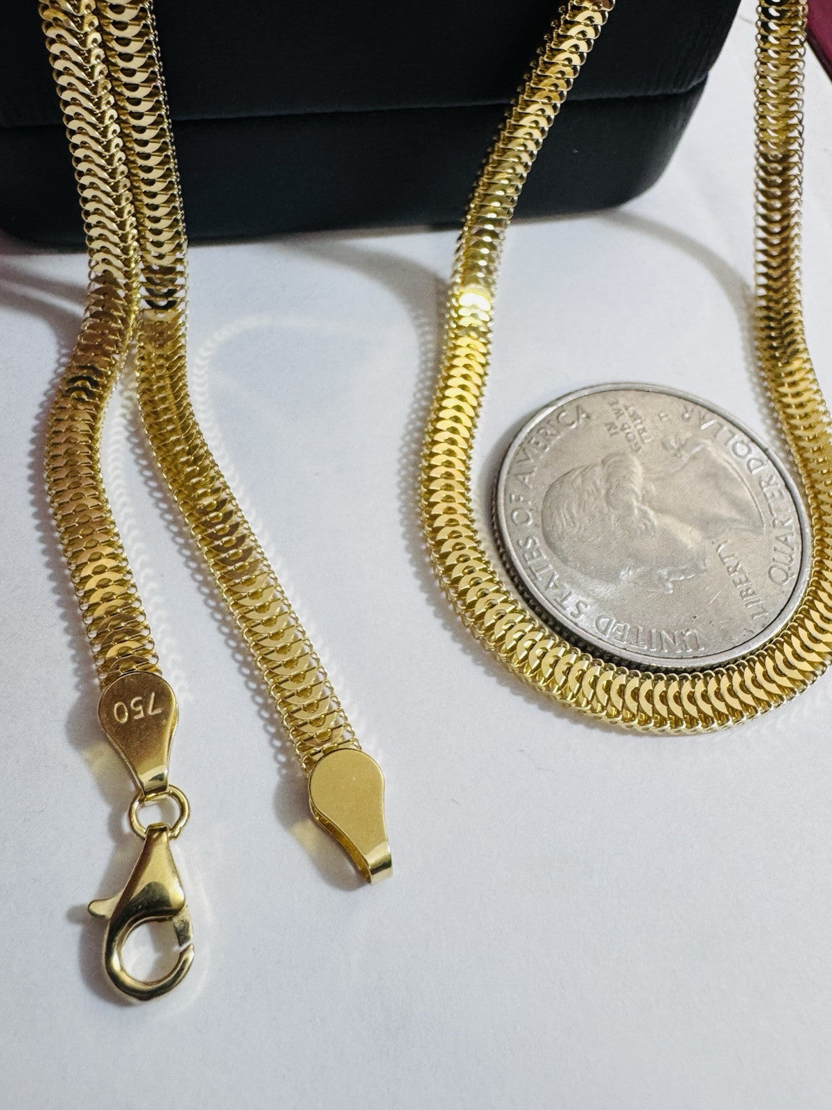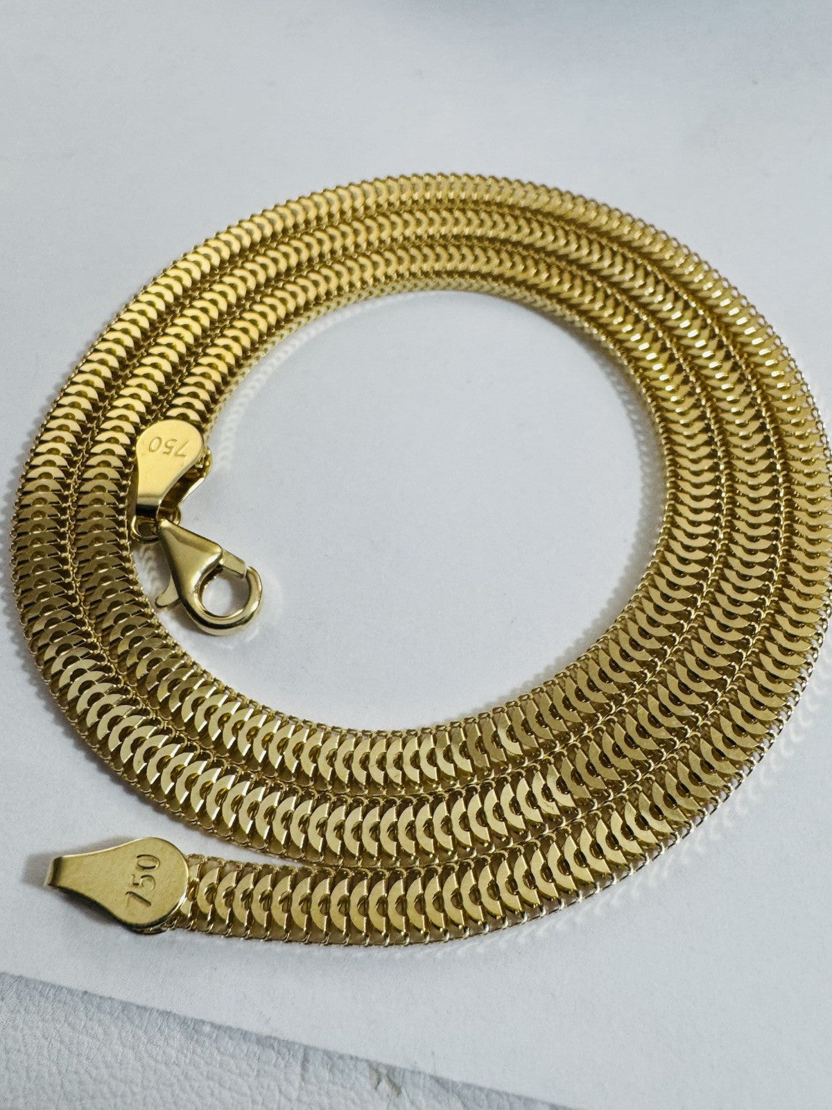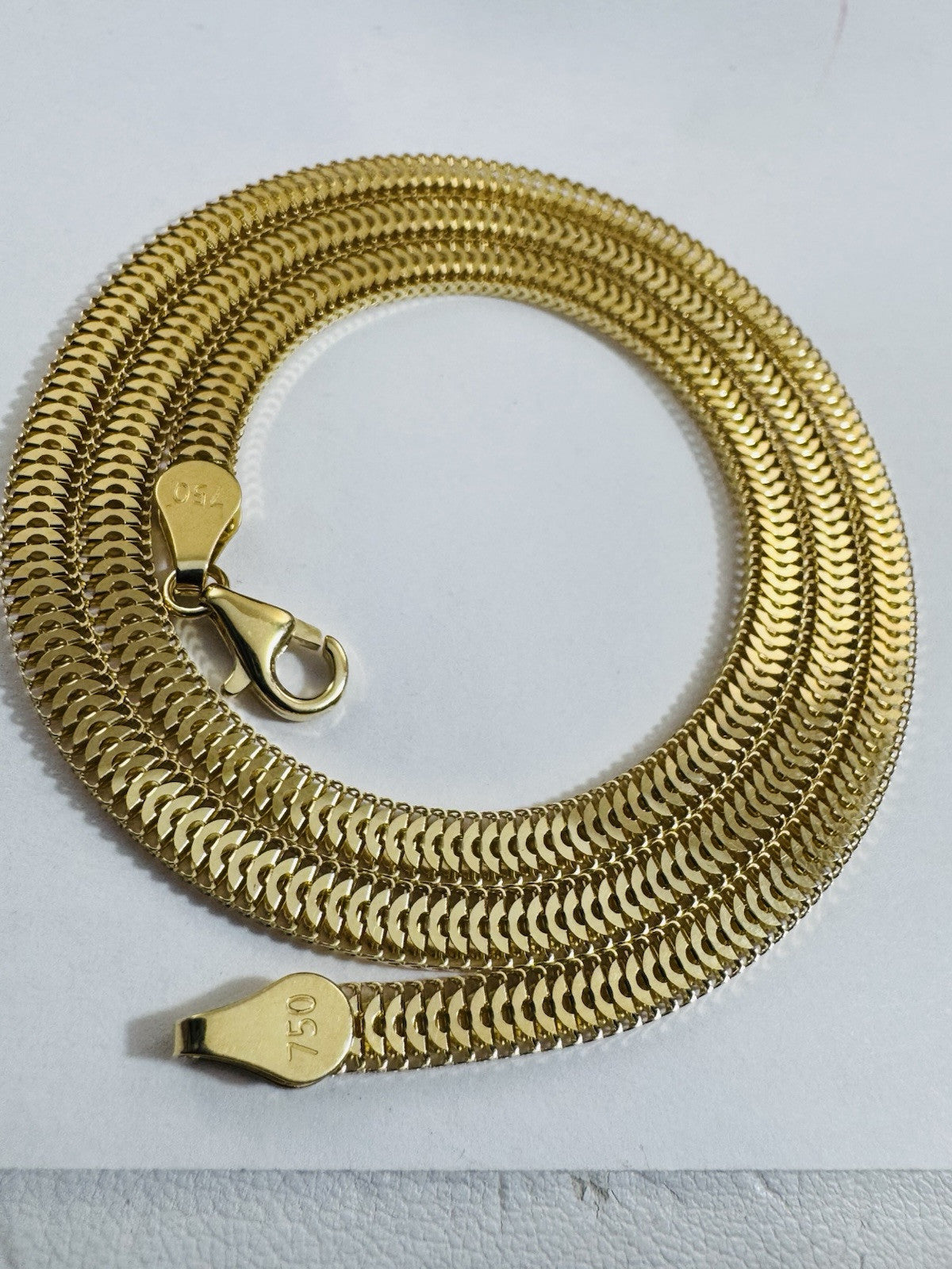 This beautiful necklace is expertly crafted in 18K 750 real yellow gold and features a stunning 18 inch Snake chain with a lobster clasp with 4mm wide. 11.6g