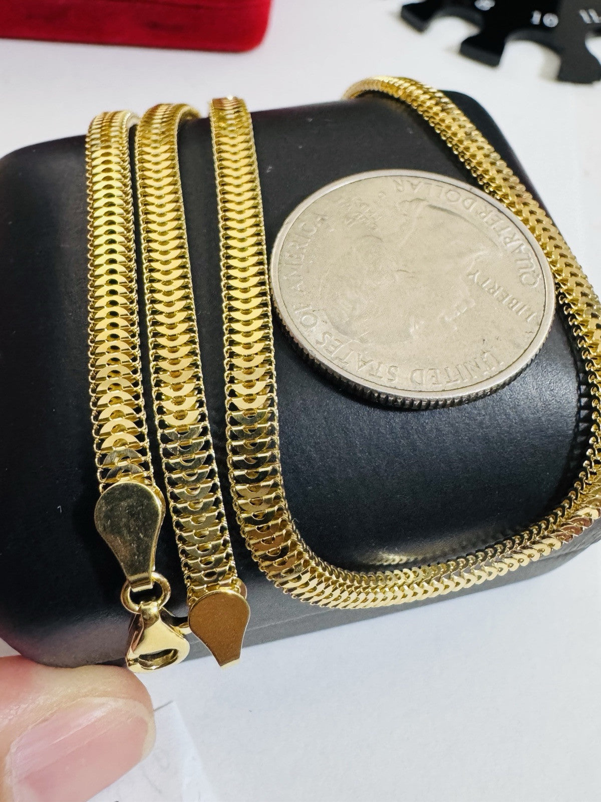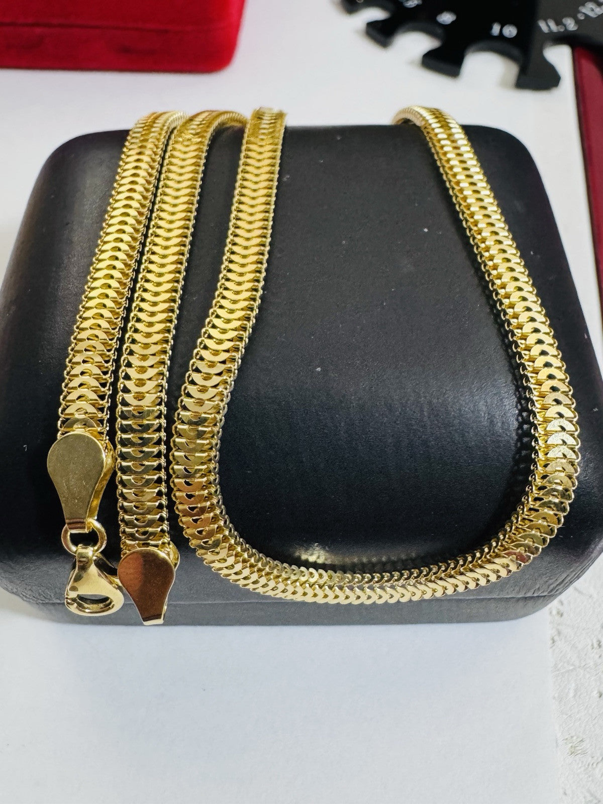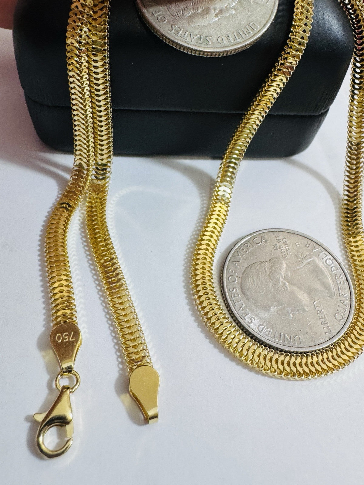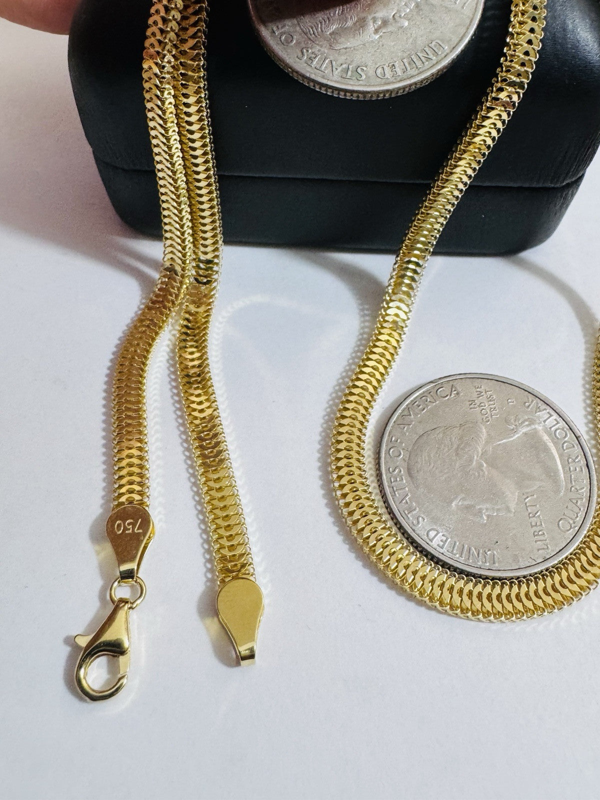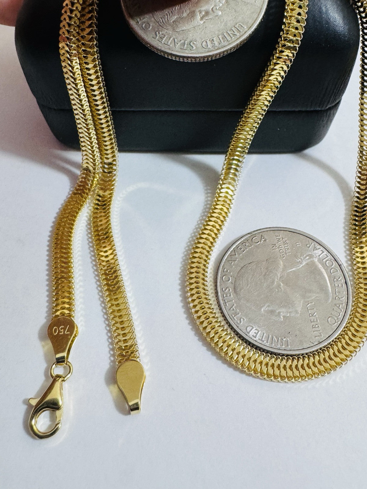 This beautiful necklace is expertly crafted in 18K 750 real yellow gold and features a stunning 18 inch Snake chain with a lobster clasp with 4mm wide. 11.6g