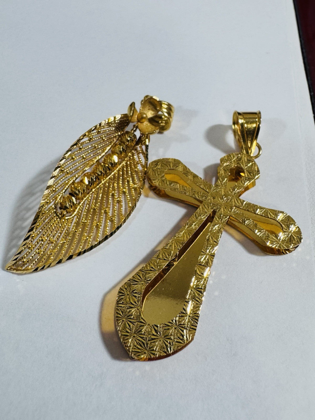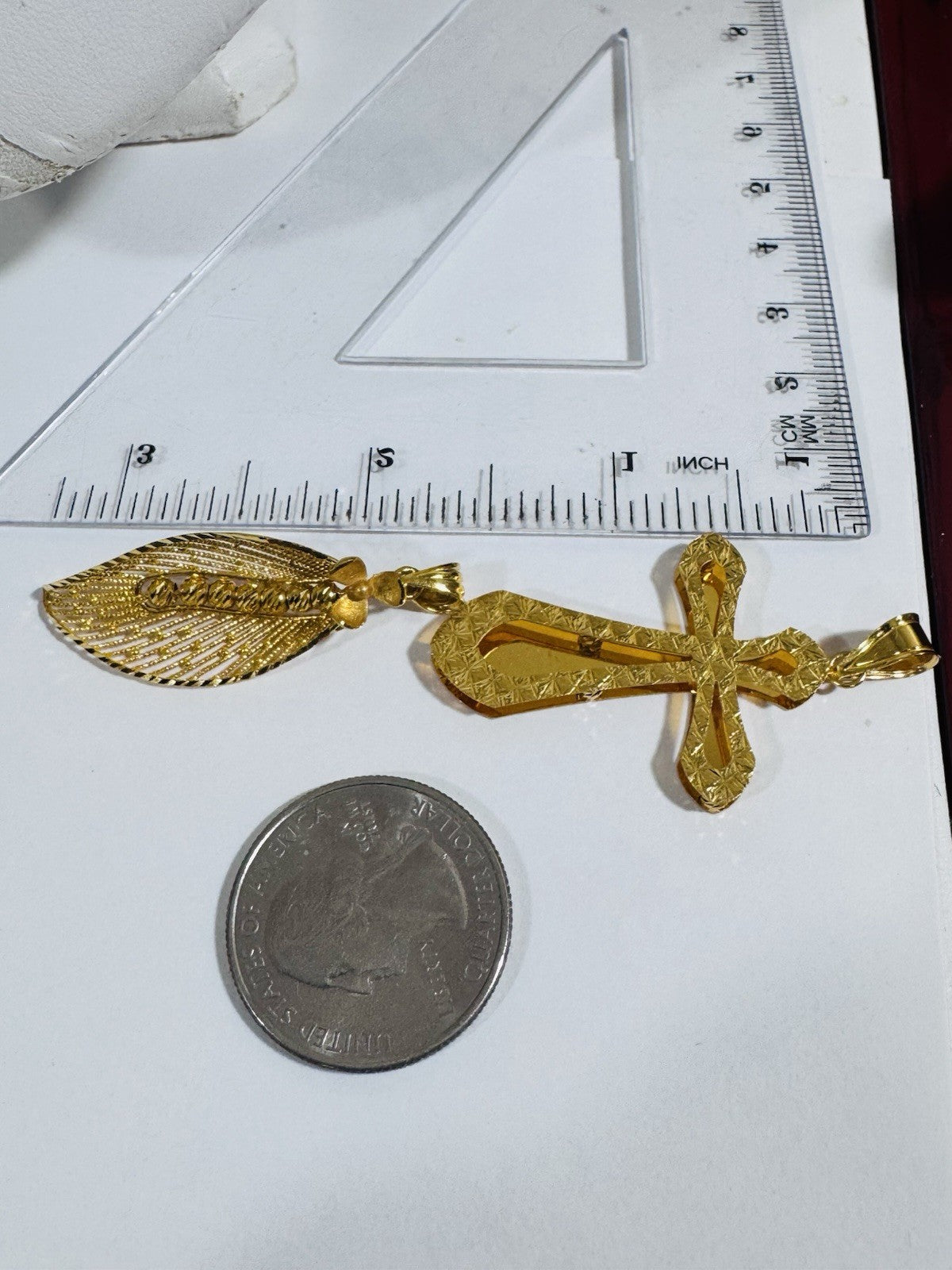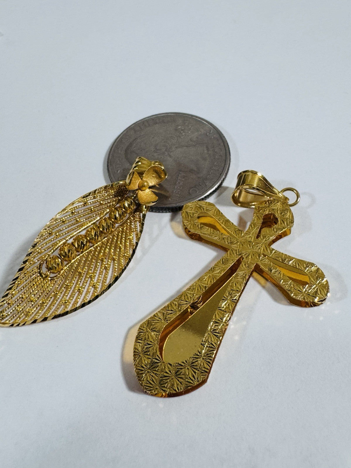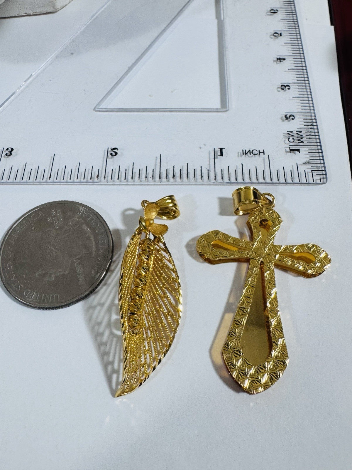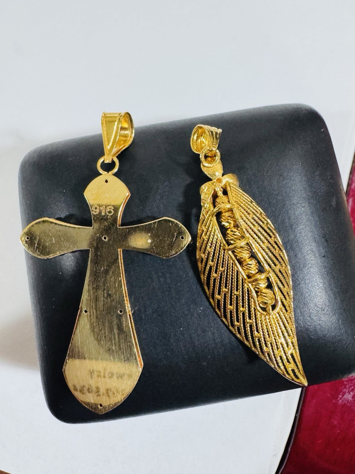 Solid 22K 916 Fine Real Gold Two (2) Set Flower Leaf & Cross Pendant 7.34g