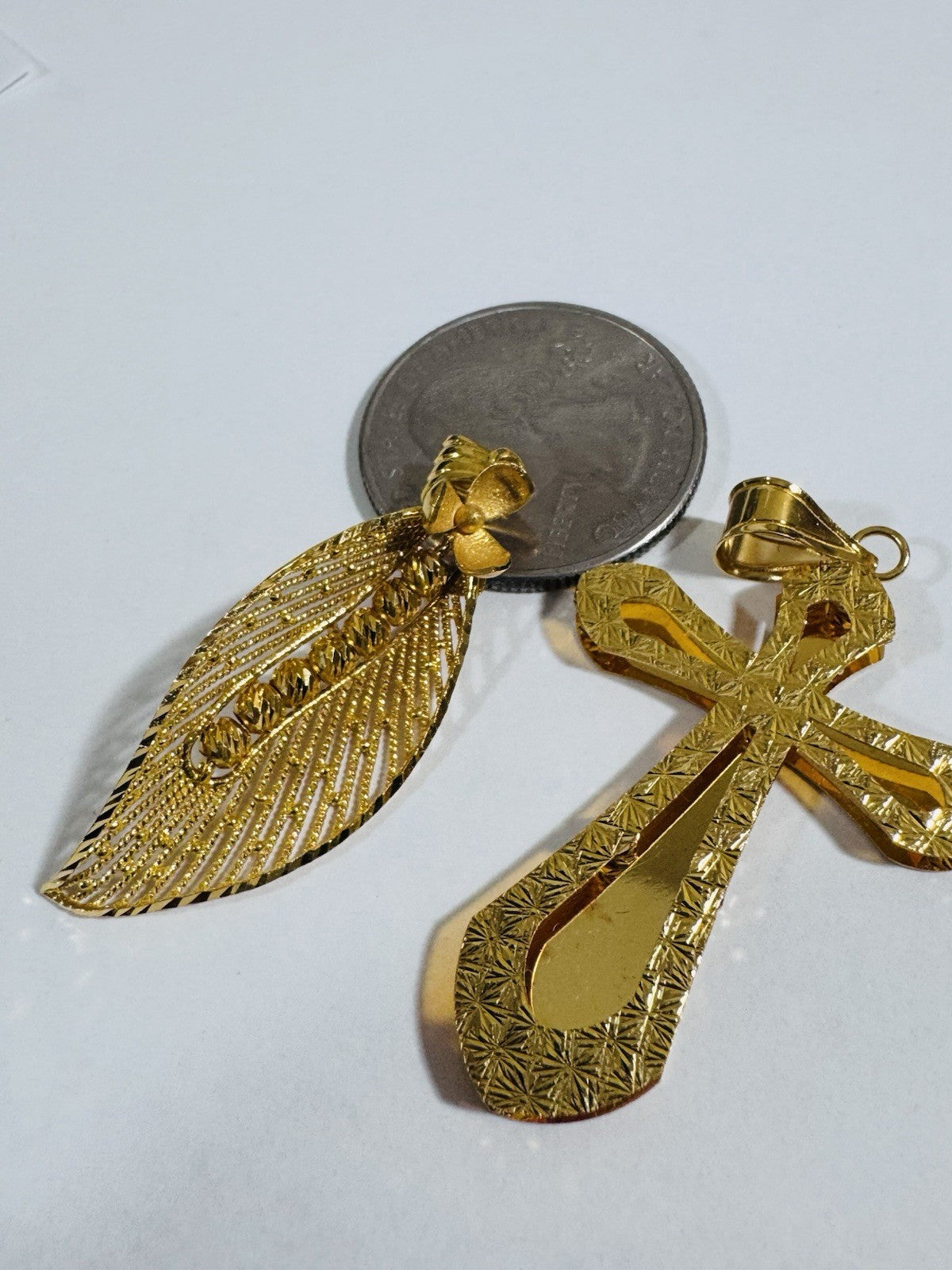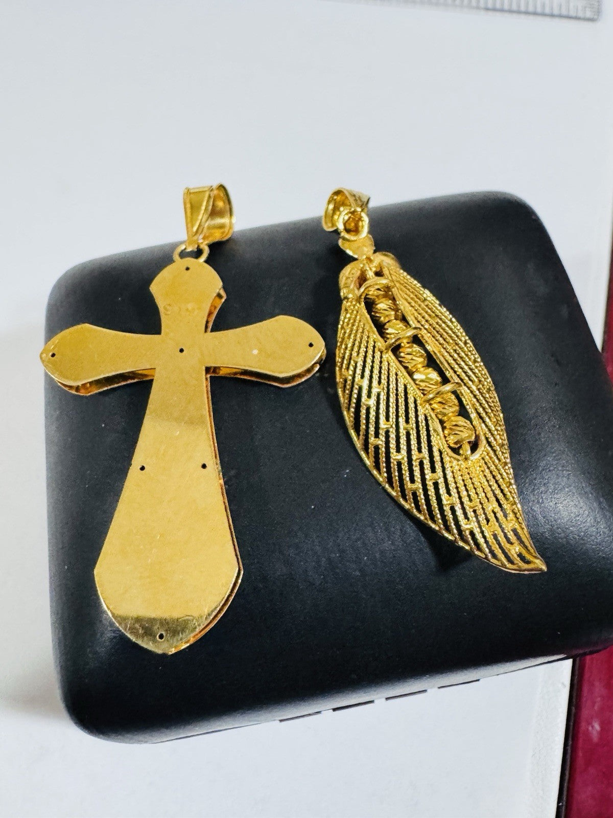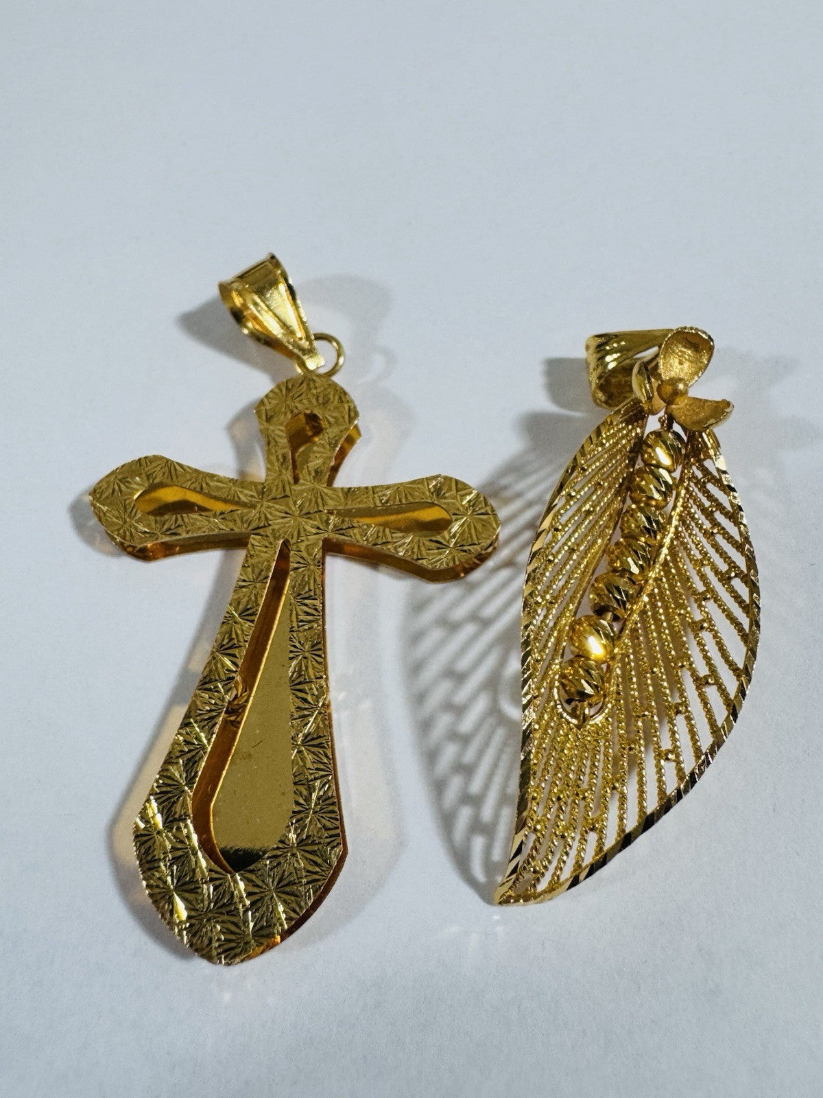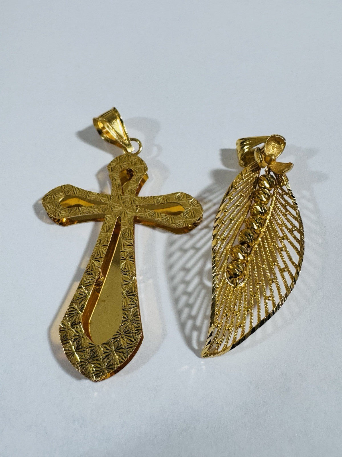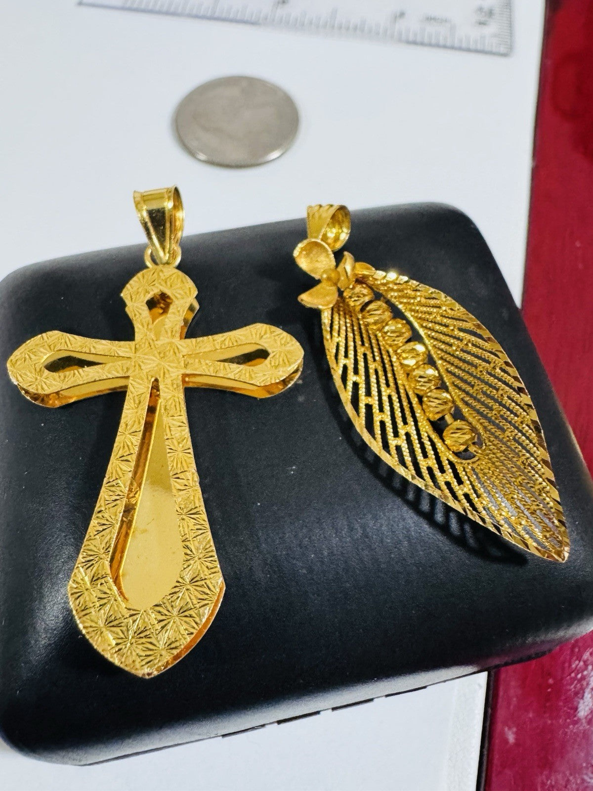 Solid 22K 916 Fine Real Gold Two (2) Set Flower Leaf & Cross Pendant 7.34g