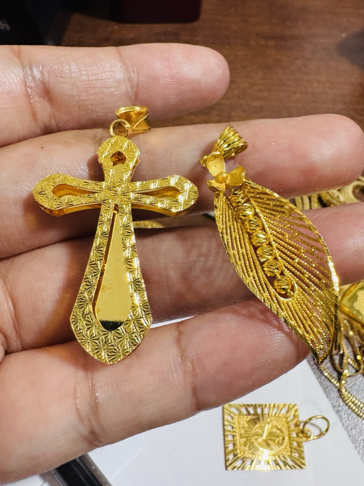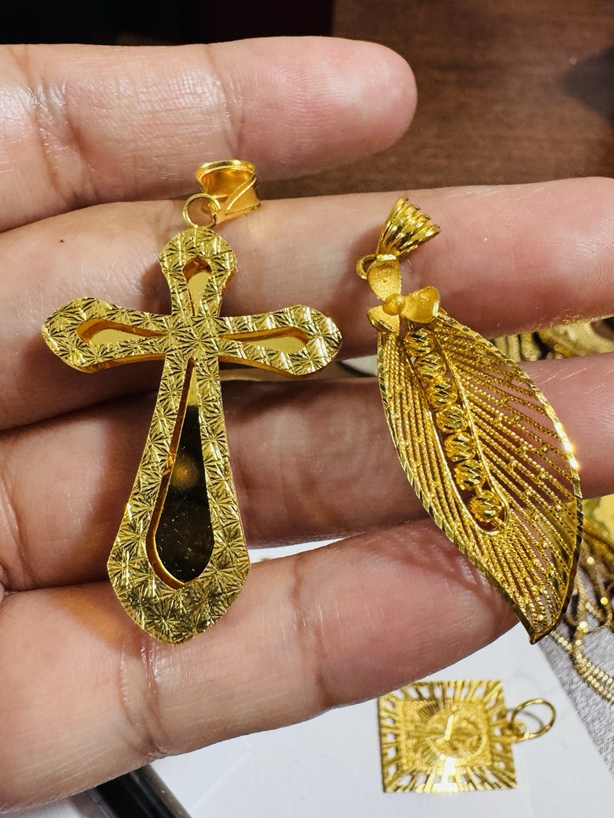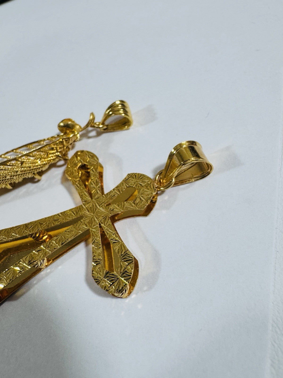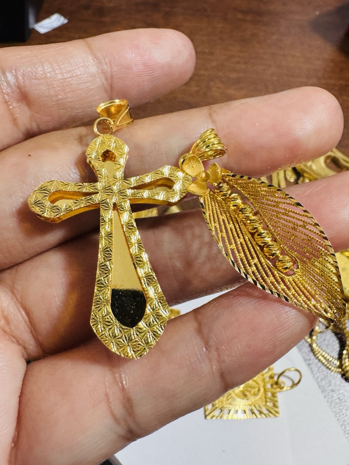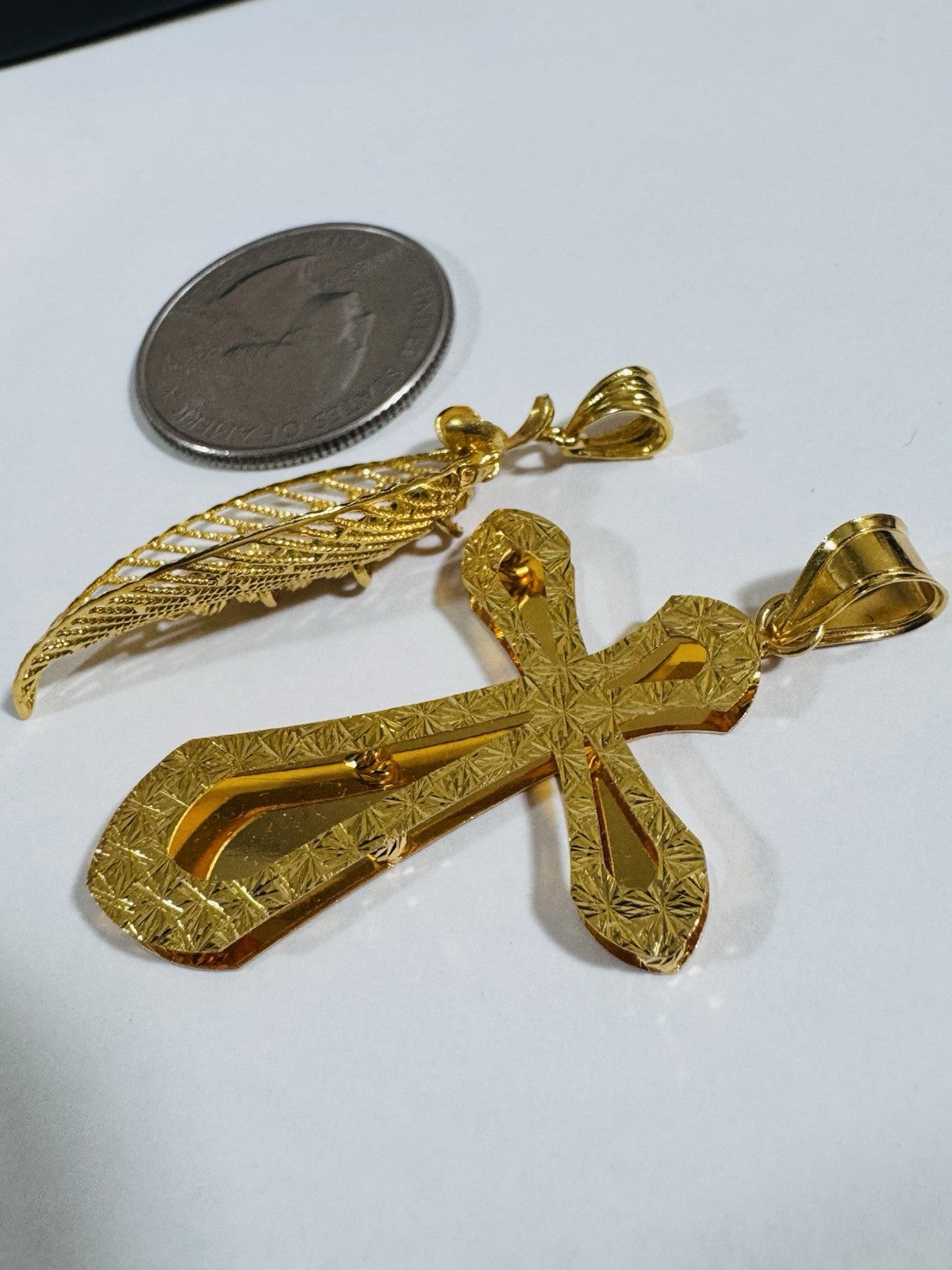 Solid 22K 916 Fine Real Gold Two (2) Set Flower Leaf & Cross Pendant 7.34g