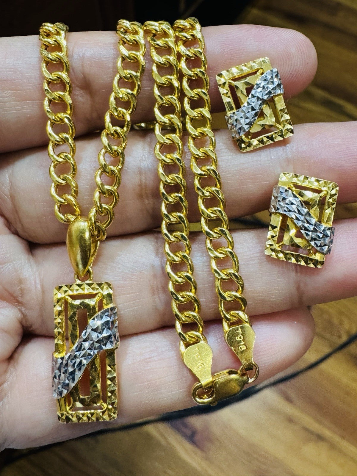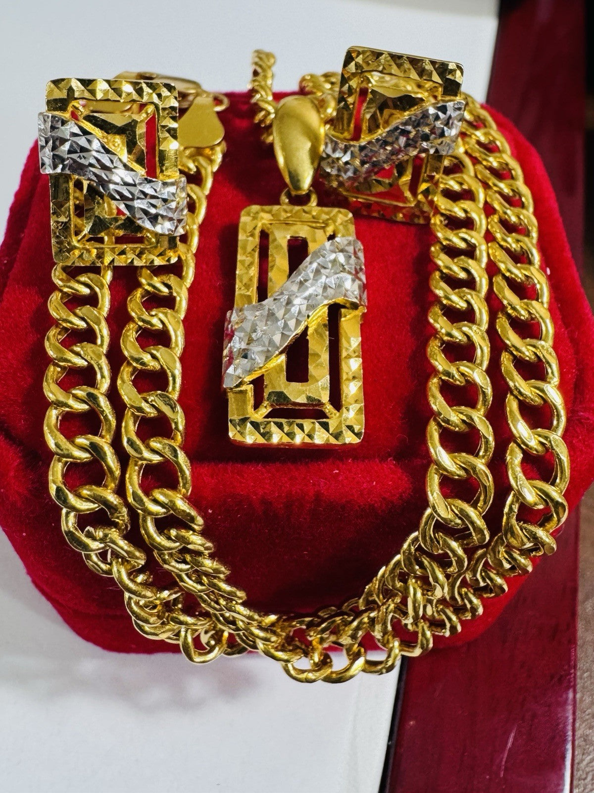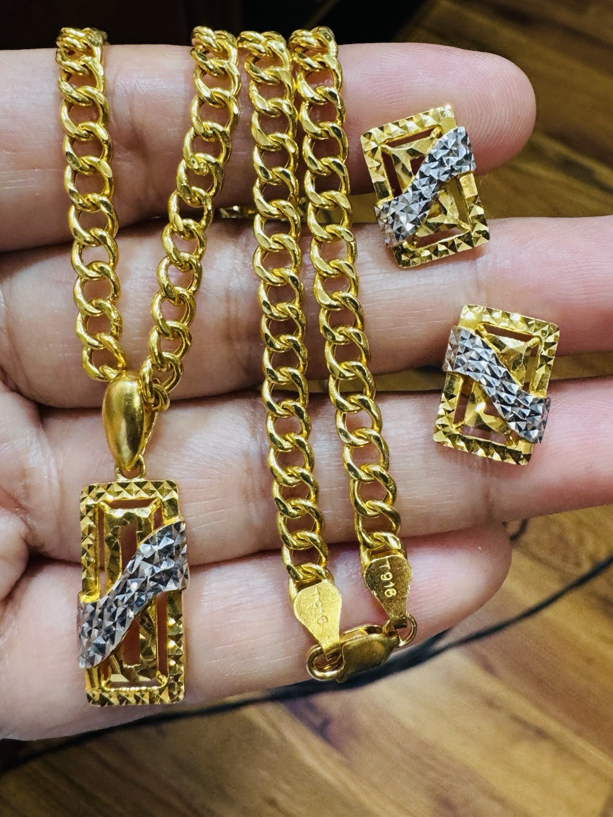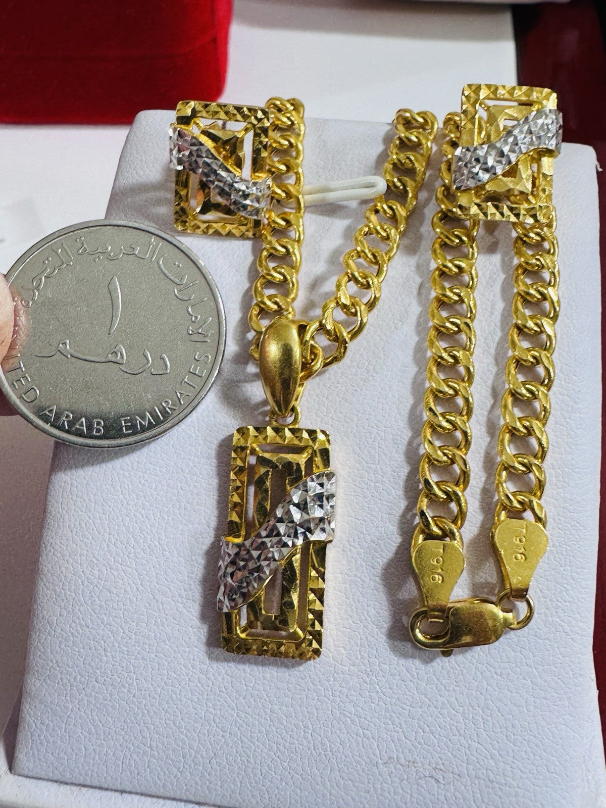 * Hello You are buying Real Brand New 22K 916 Fine Yellow Saudi Gold Set Two-tone earring Pendant with Necklace With 18.5” long 5.5mm 20.1 grams