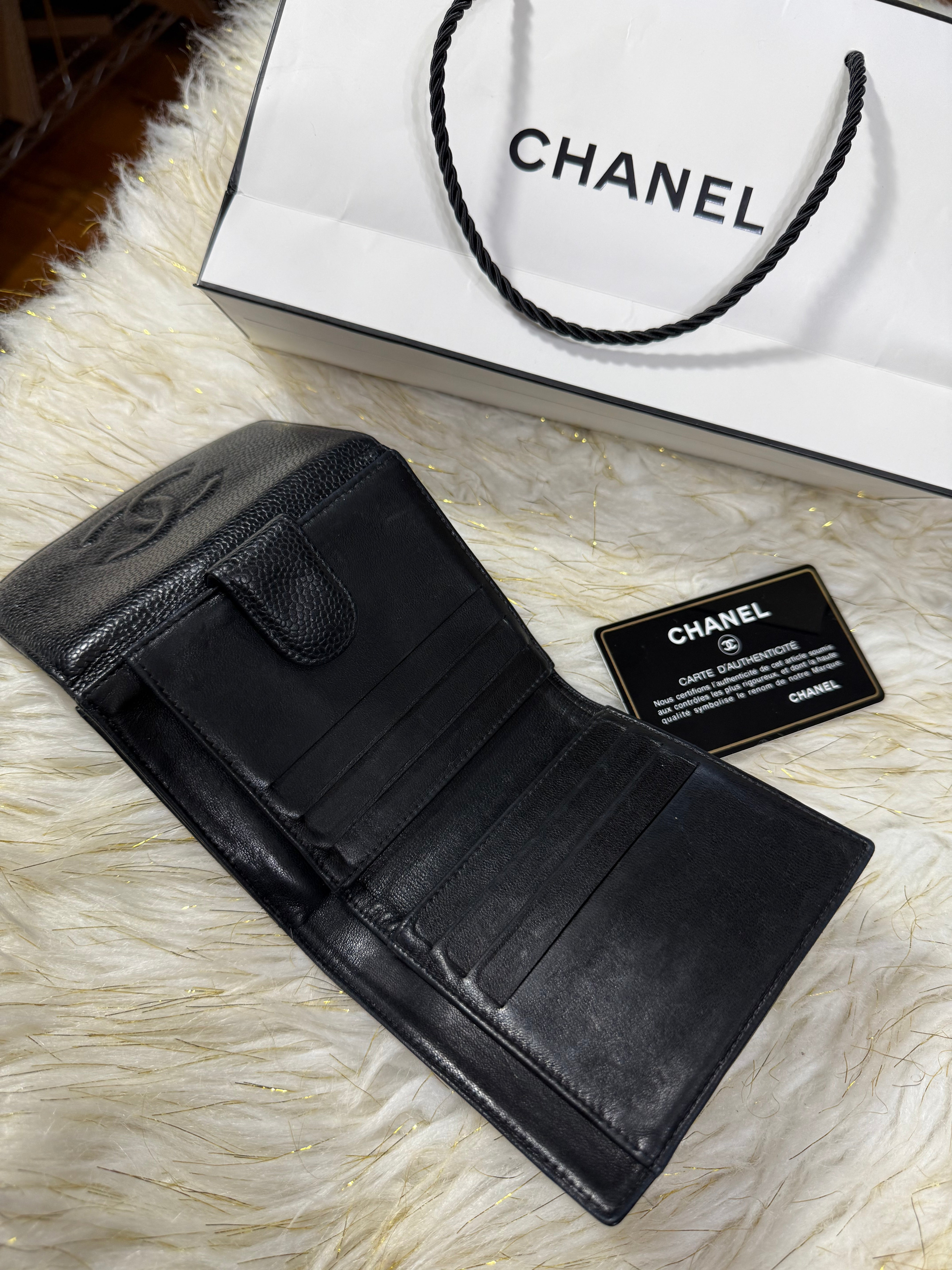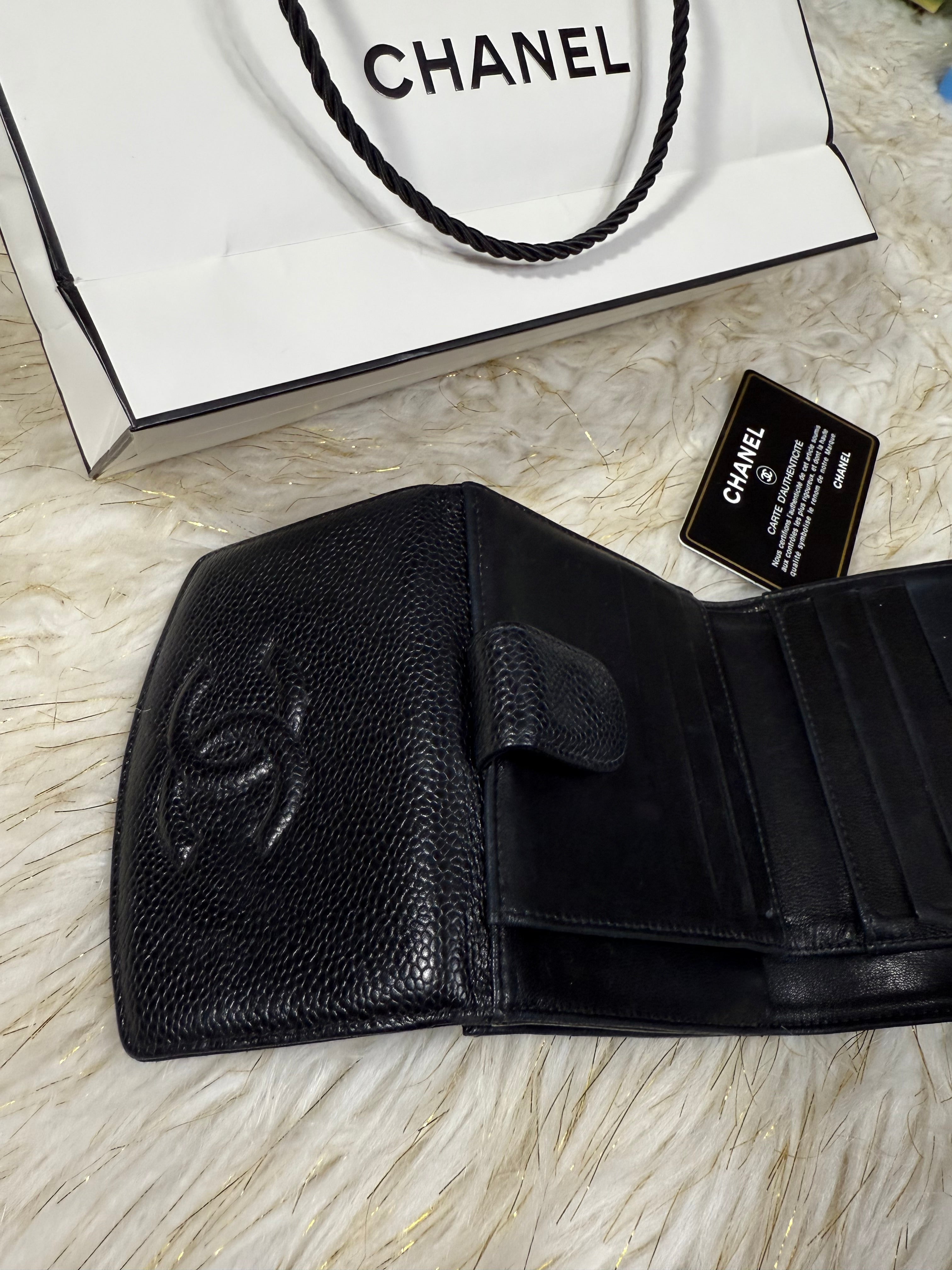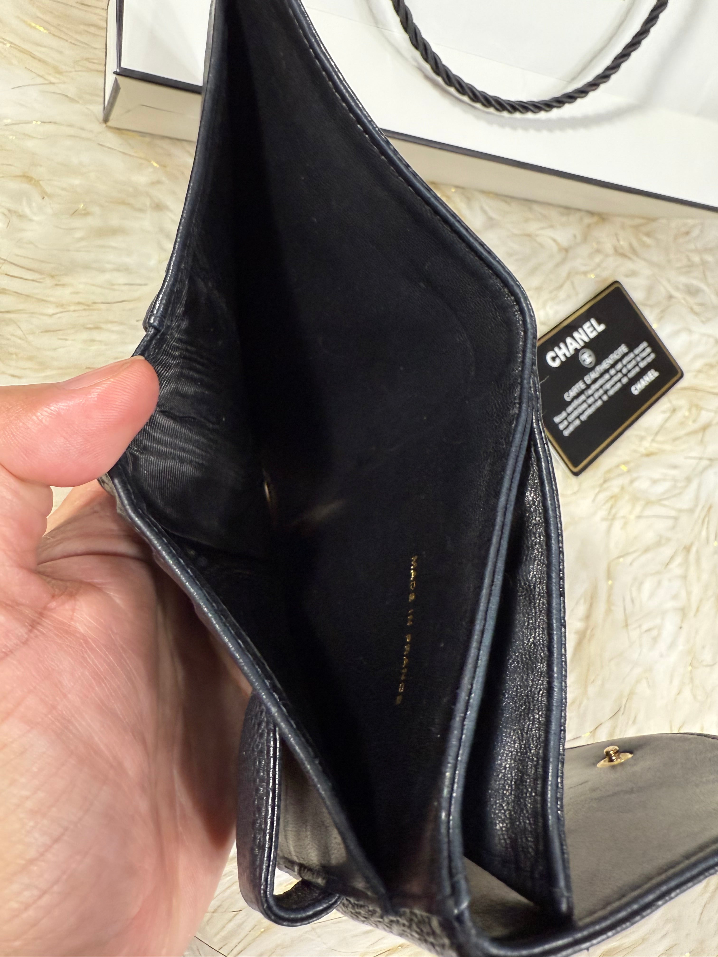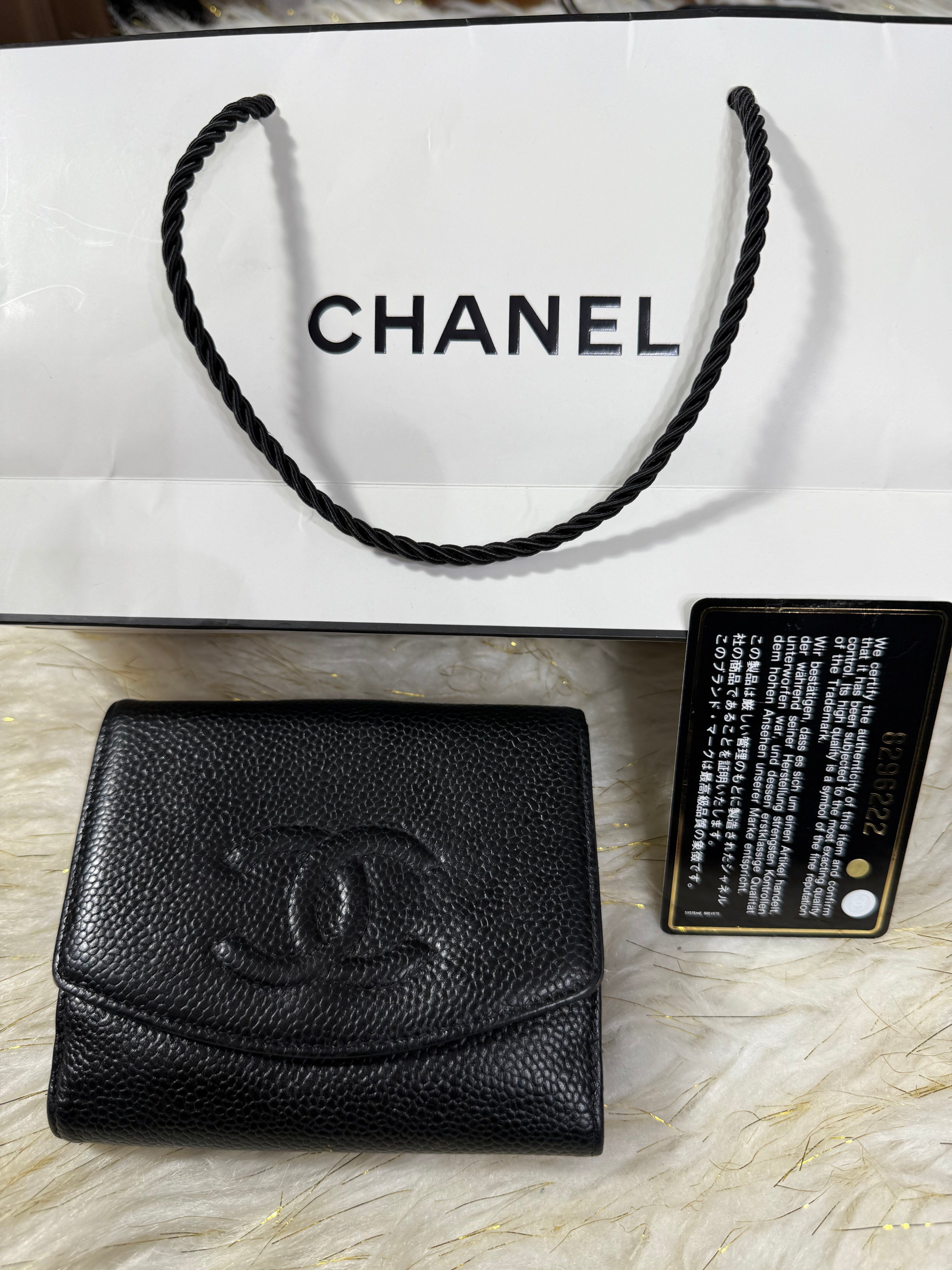 Authentic Preloved Chanel CC Black Small Bifold Calfskin wallet with Paperbag and card authenticity.