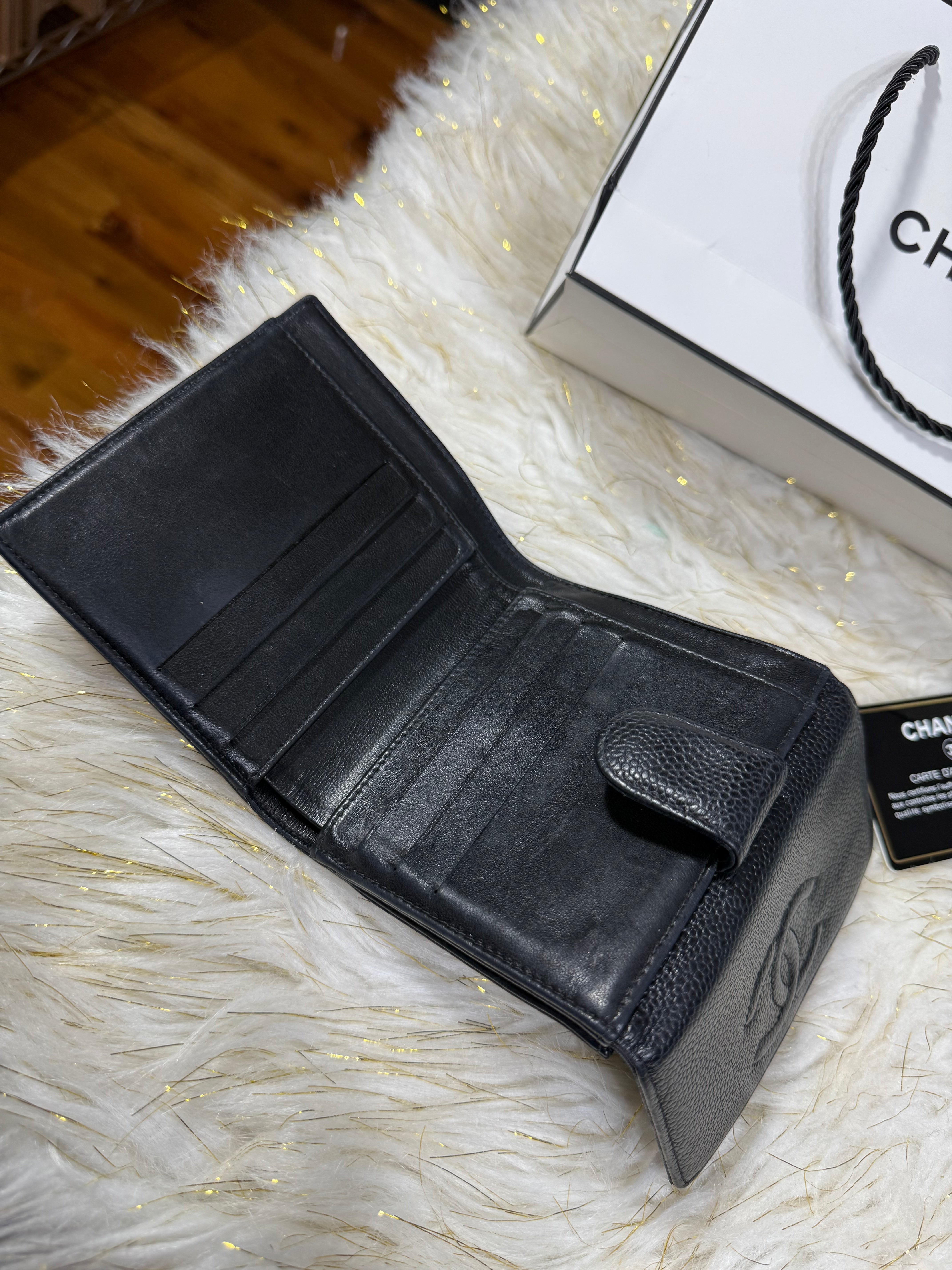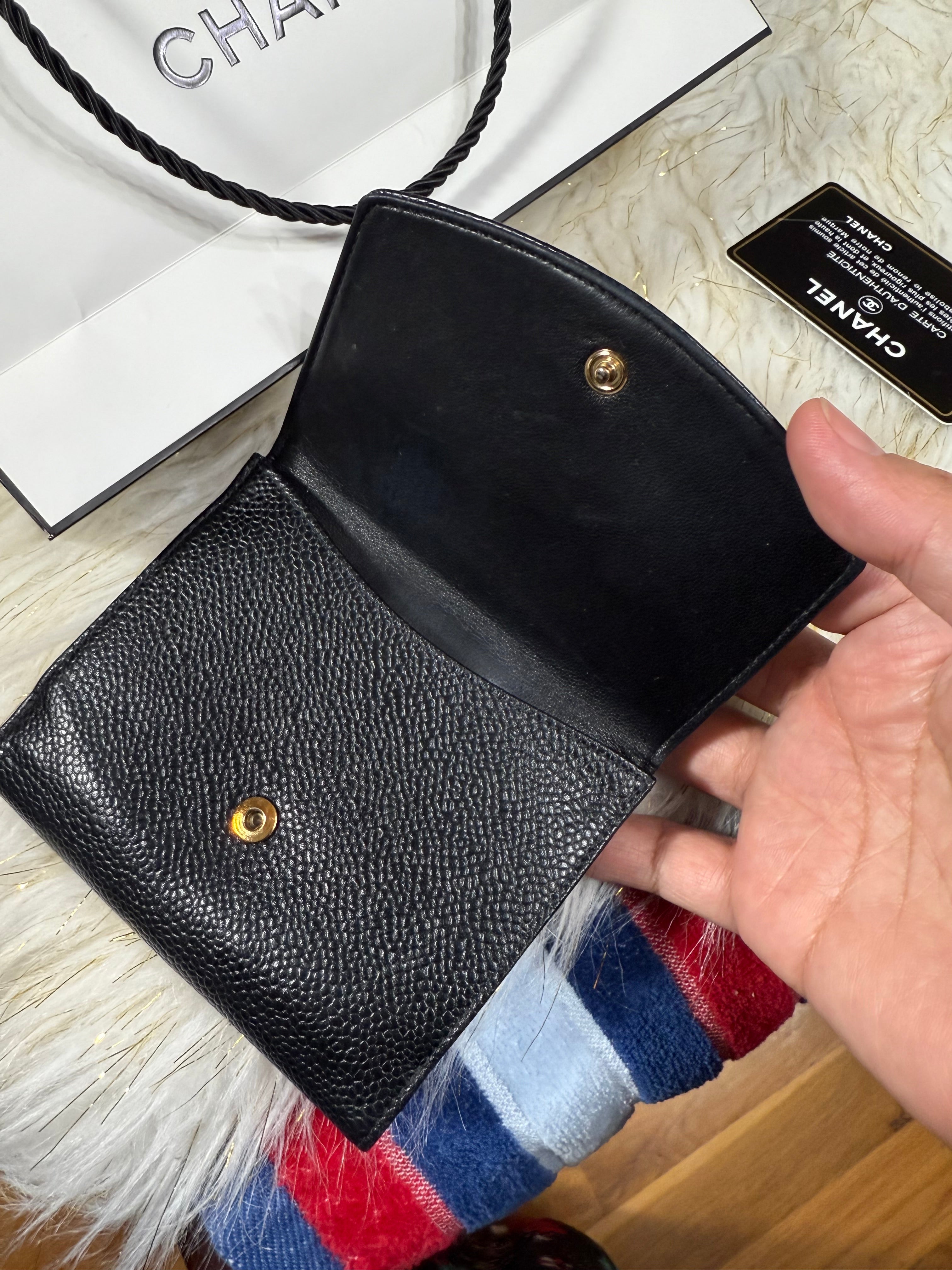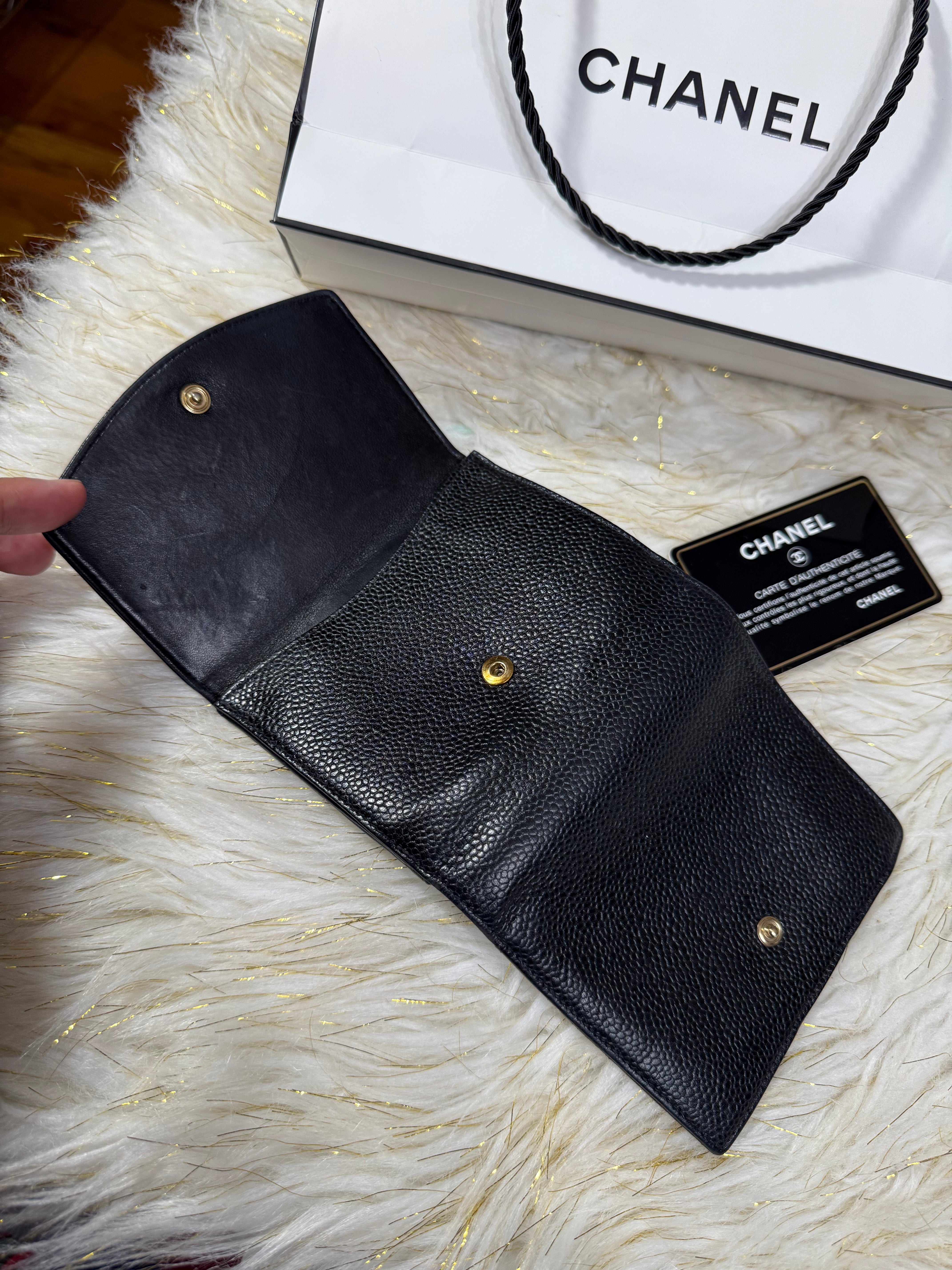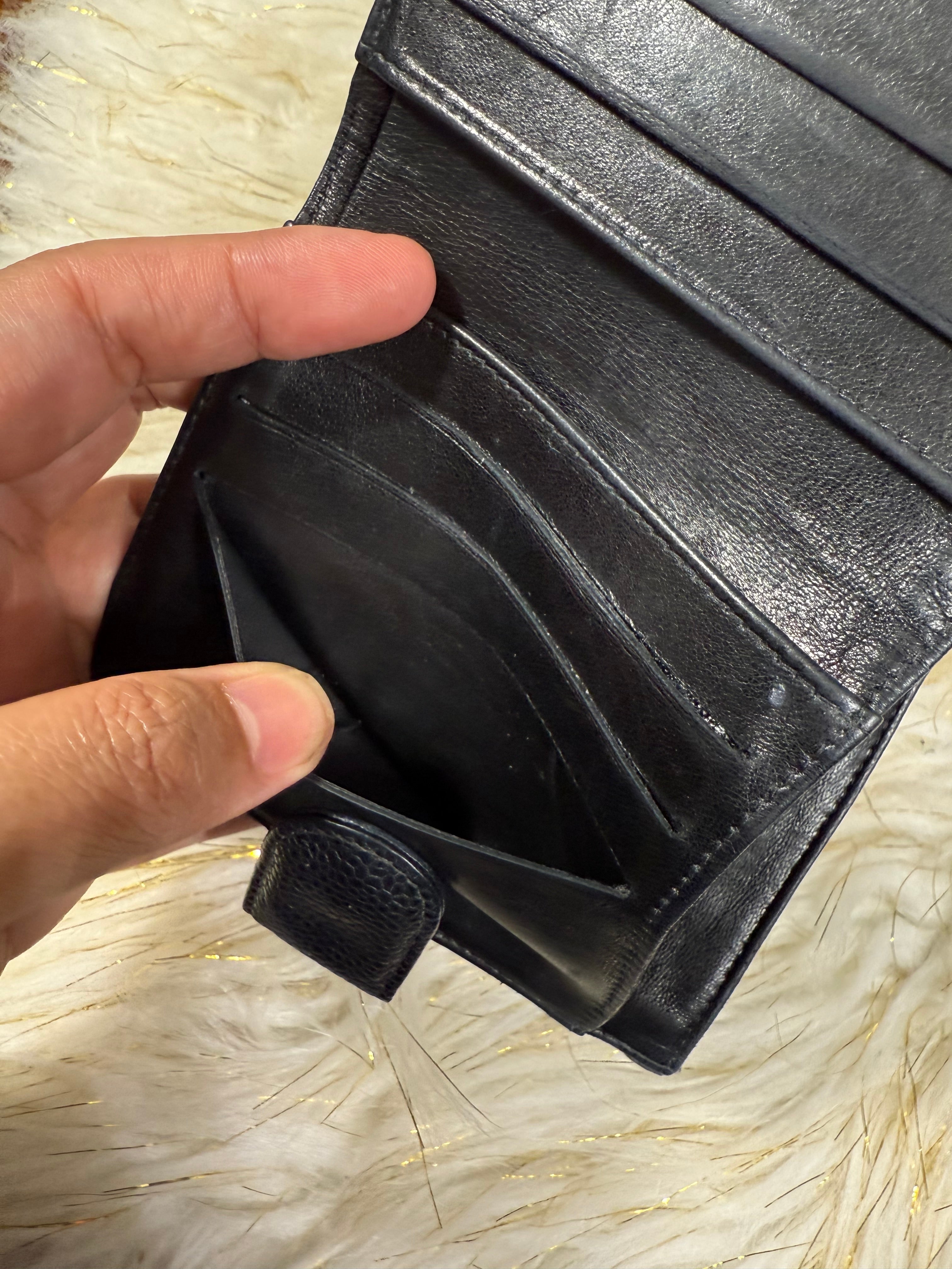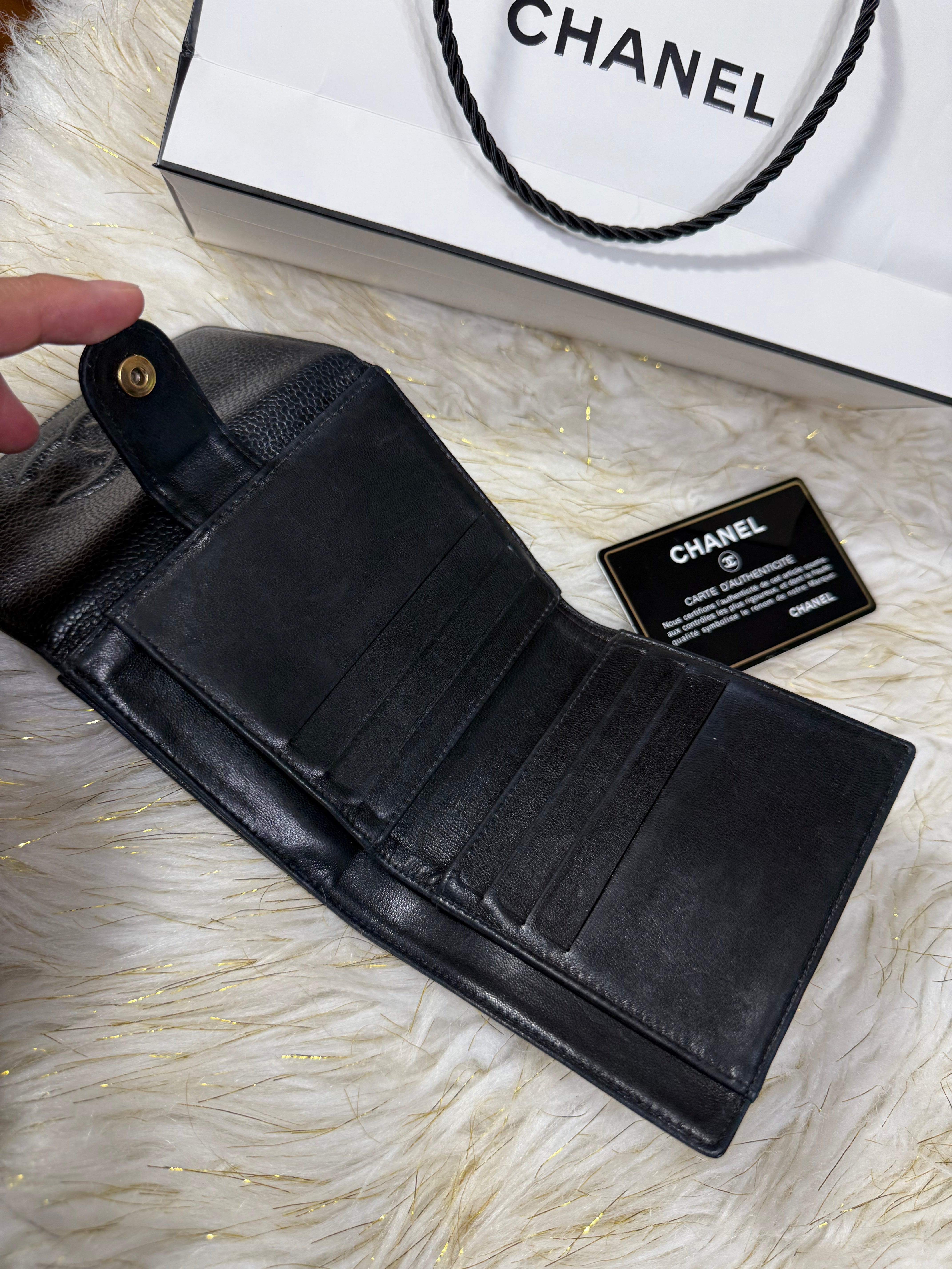 Authentic Preloved Chanel CC Black Small Bifold Calfskin wallet with Paperbag and card authenticity.