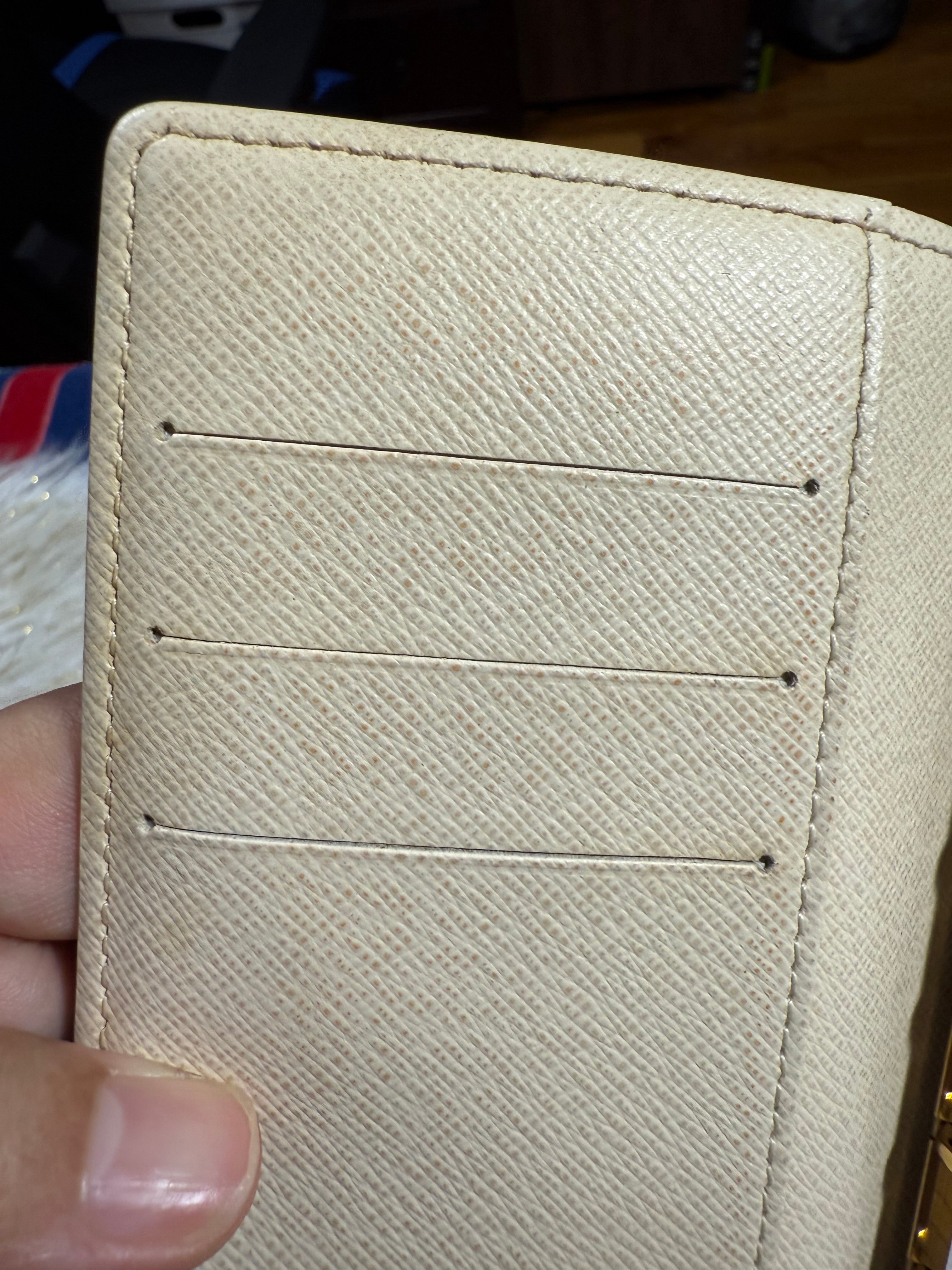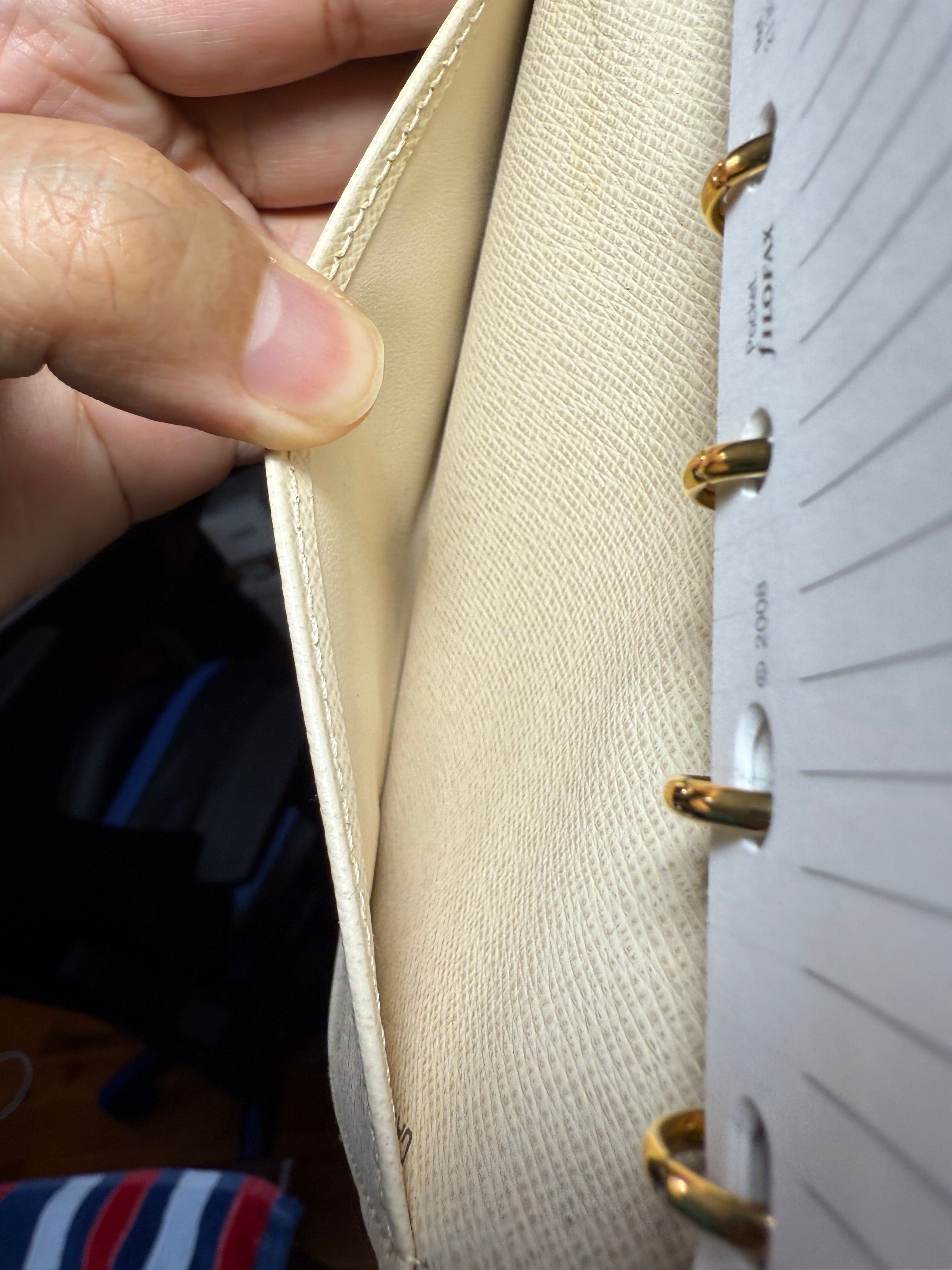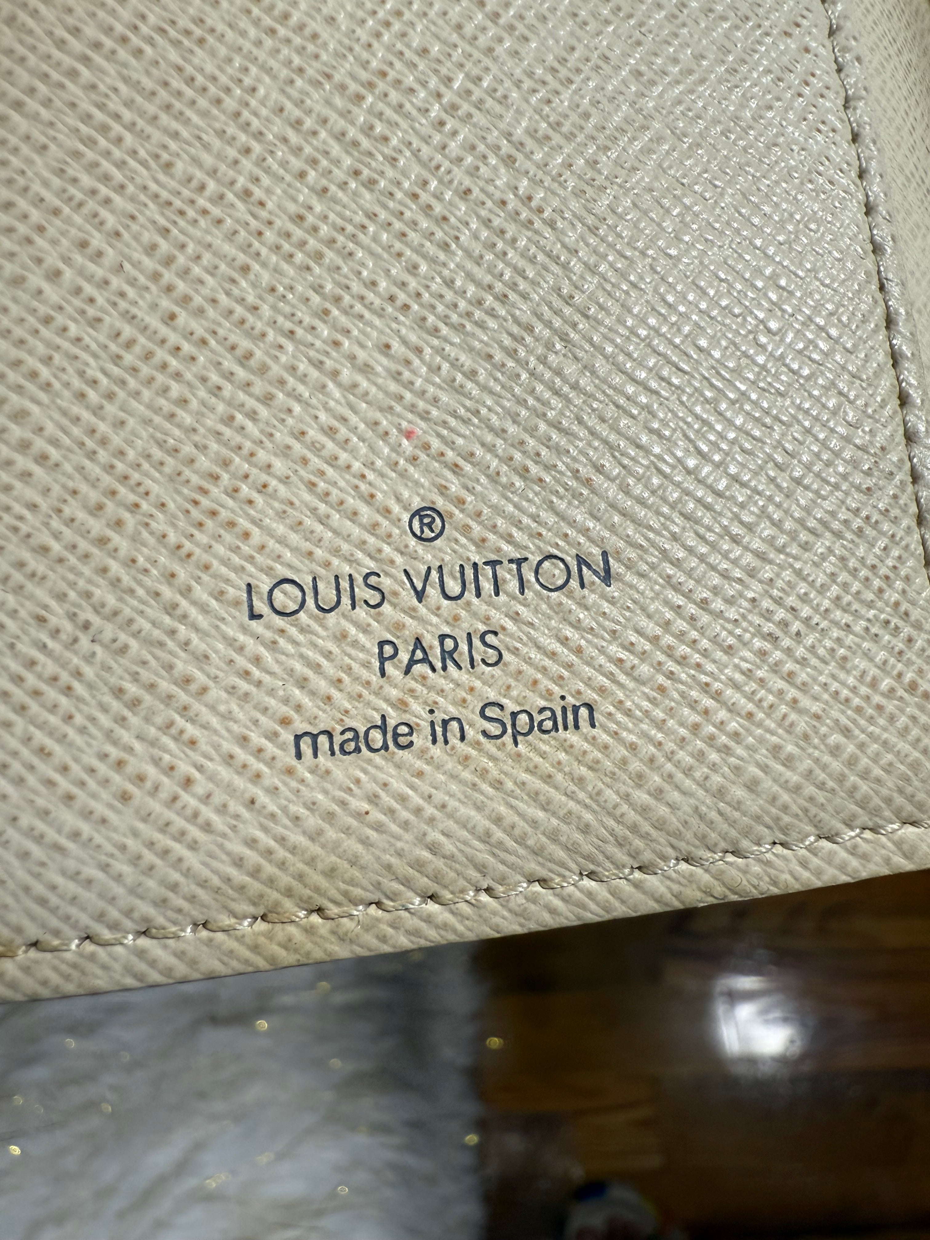 Elegant Louis Vuitton notebook cover in White beige. Features card slots and a snap closure.