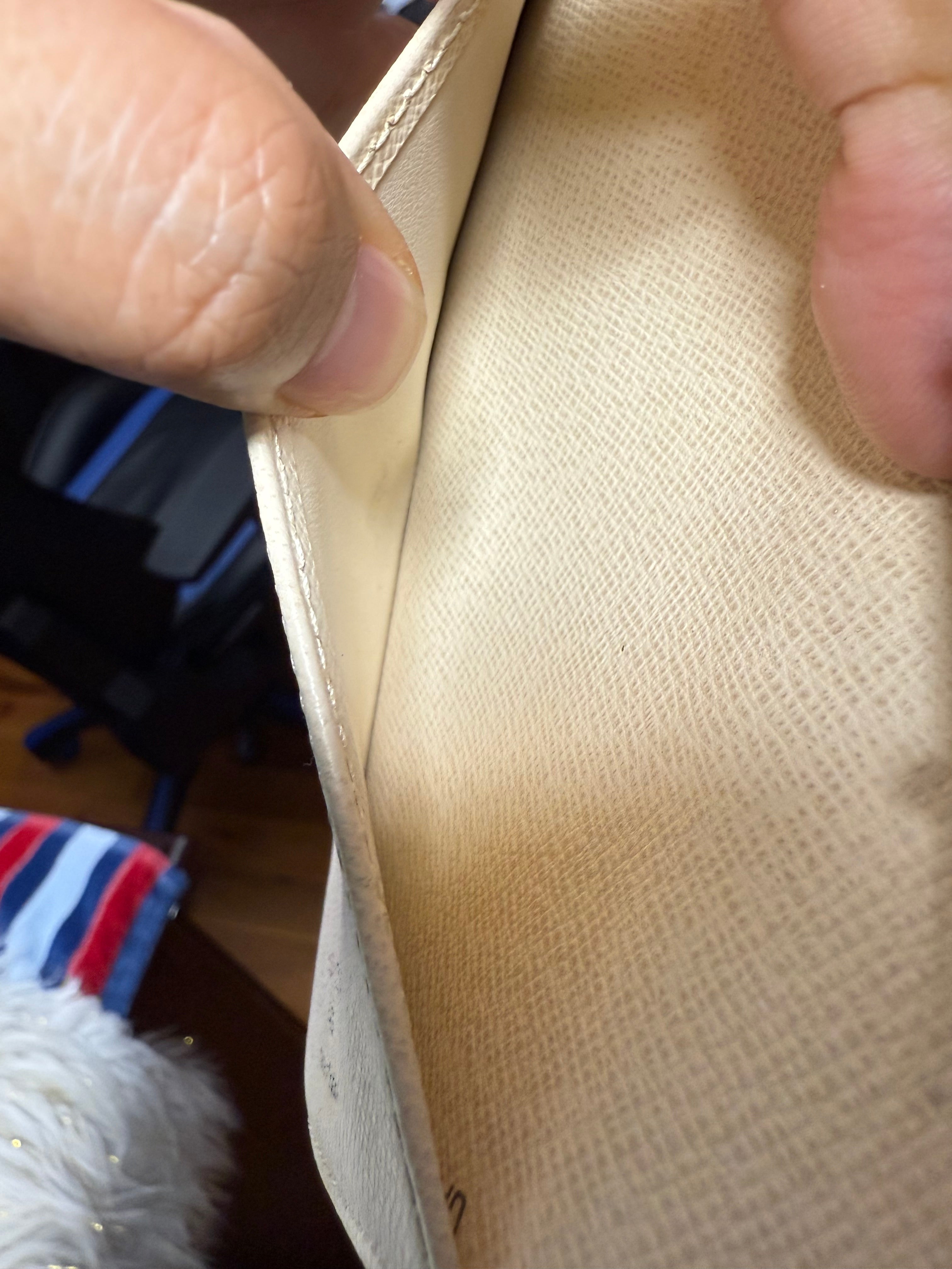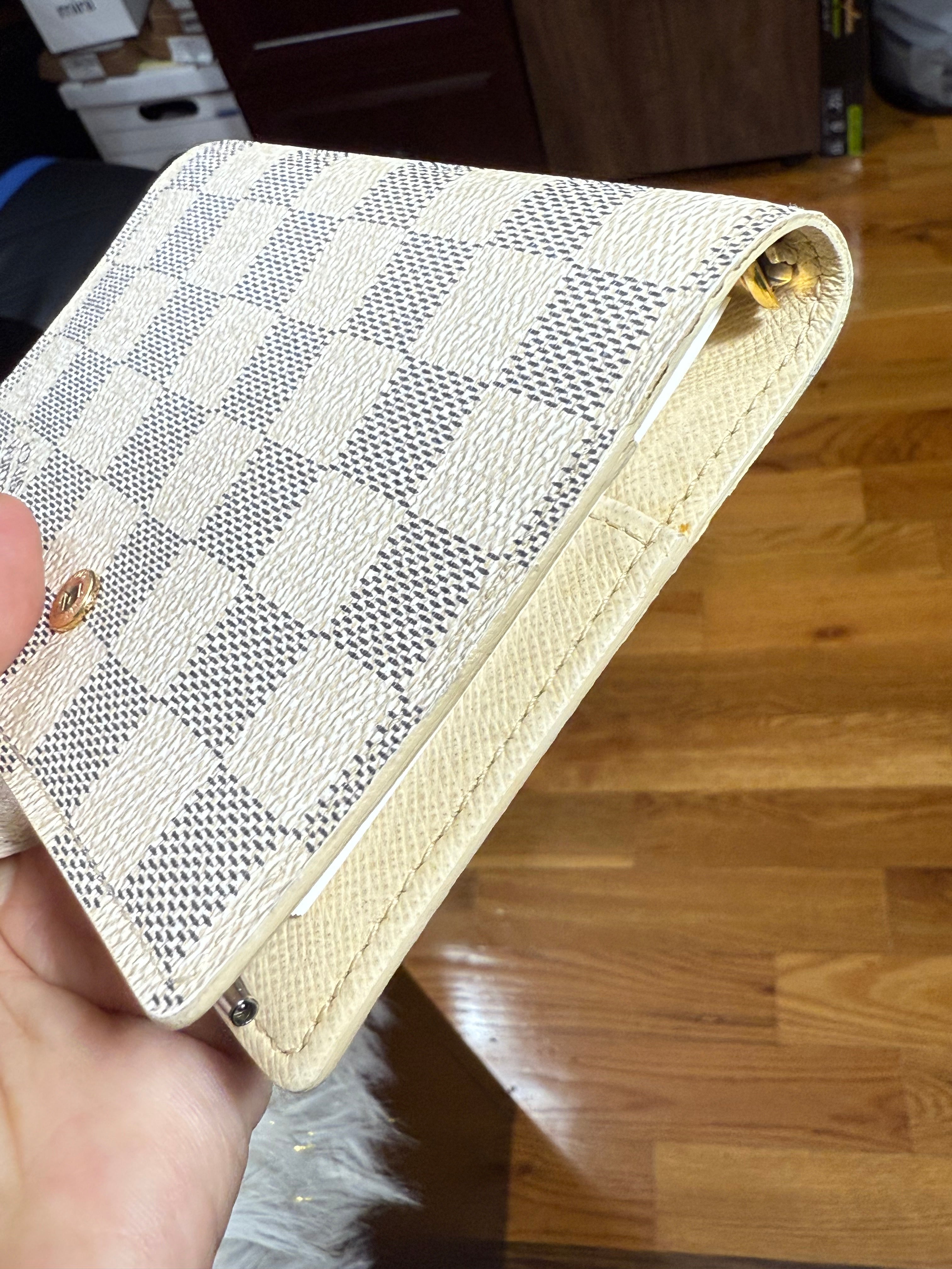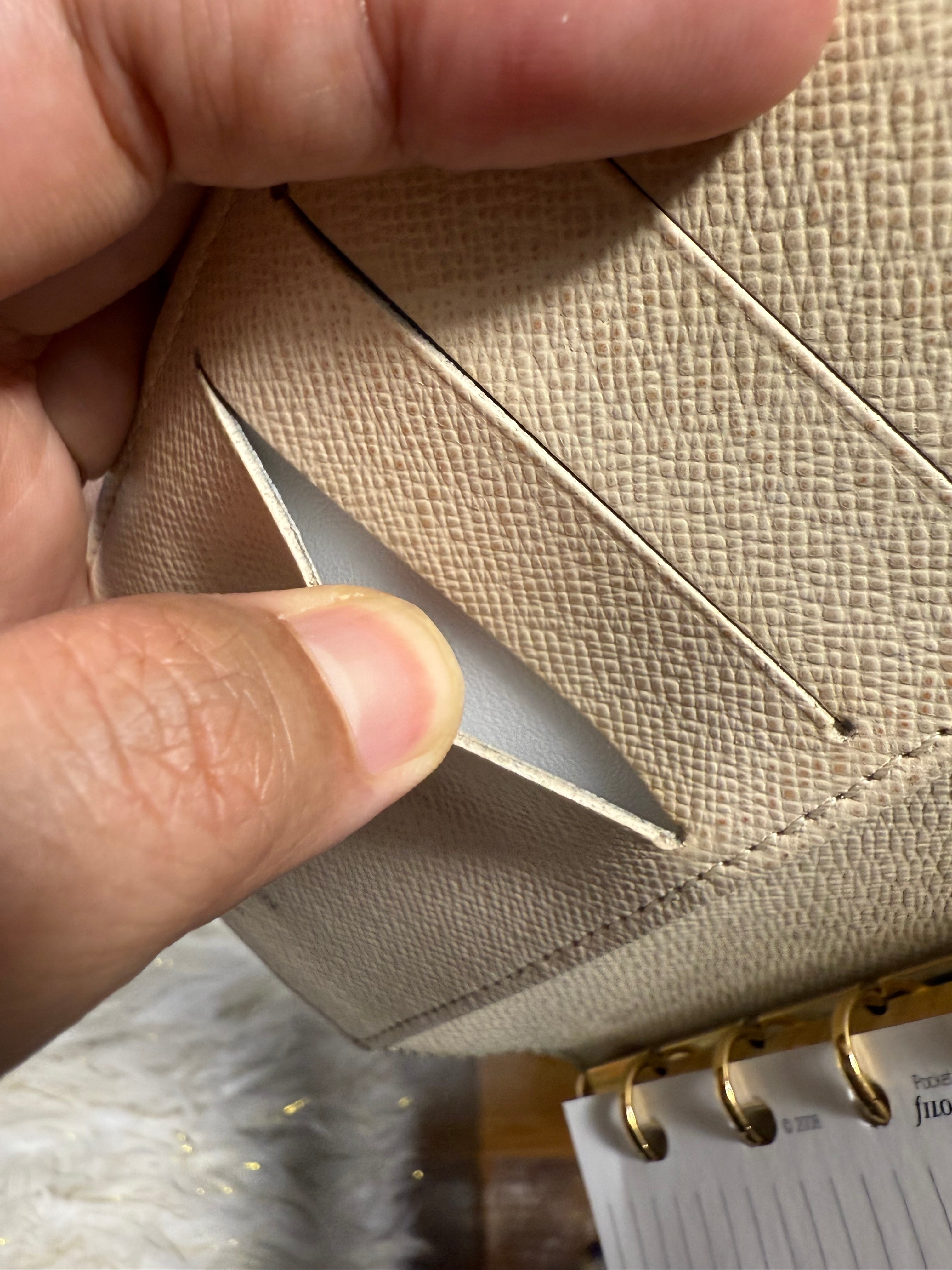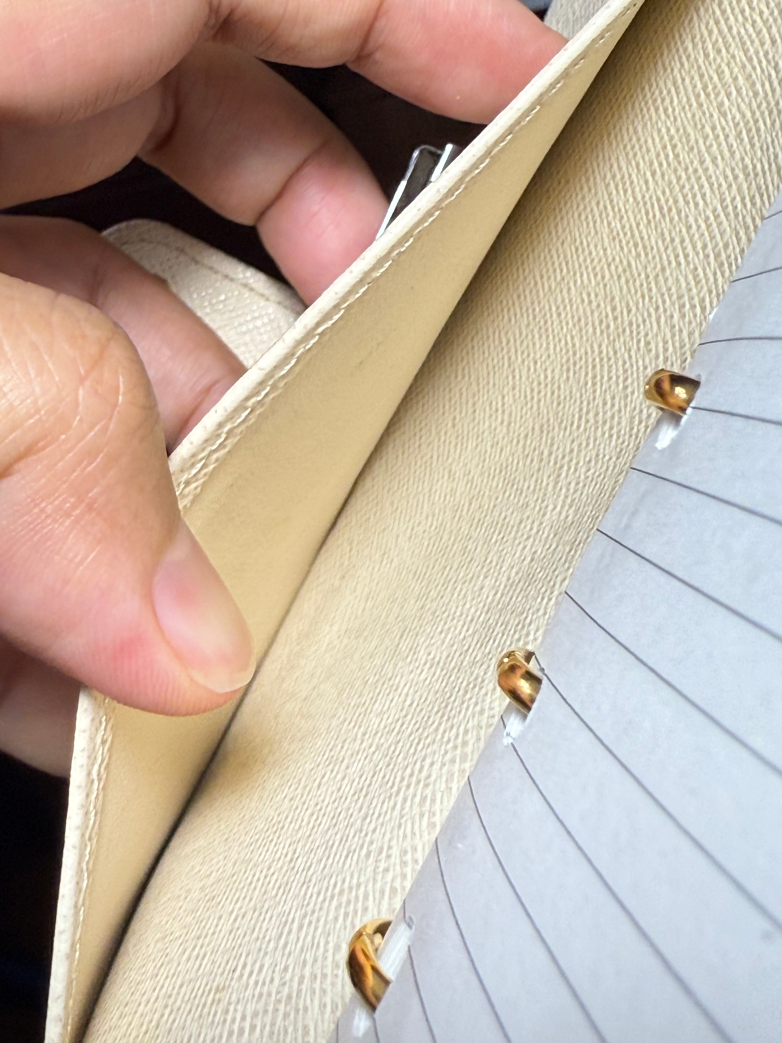 Elegant Louis Vuitton notebook cover in White beige. Features card slots and a snap closure.