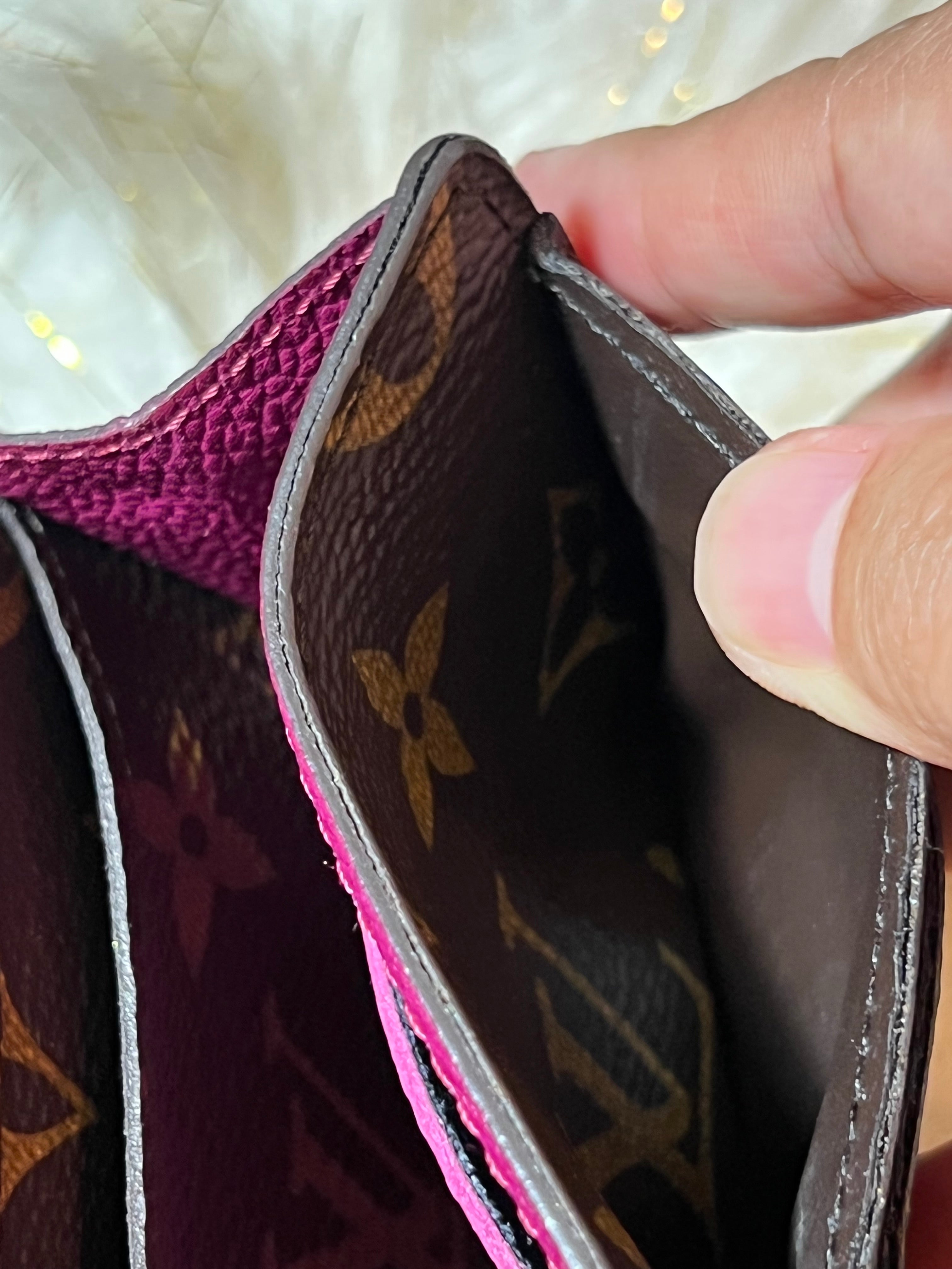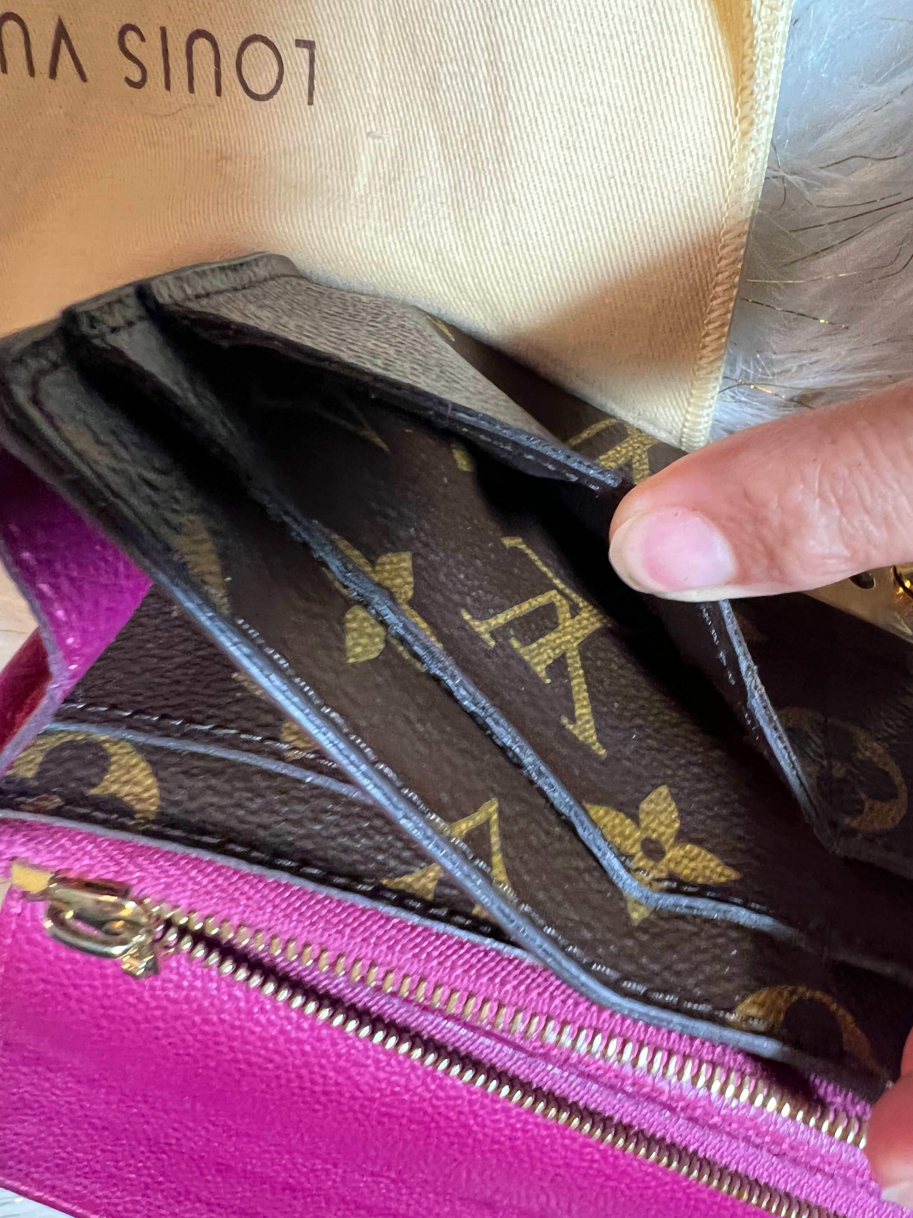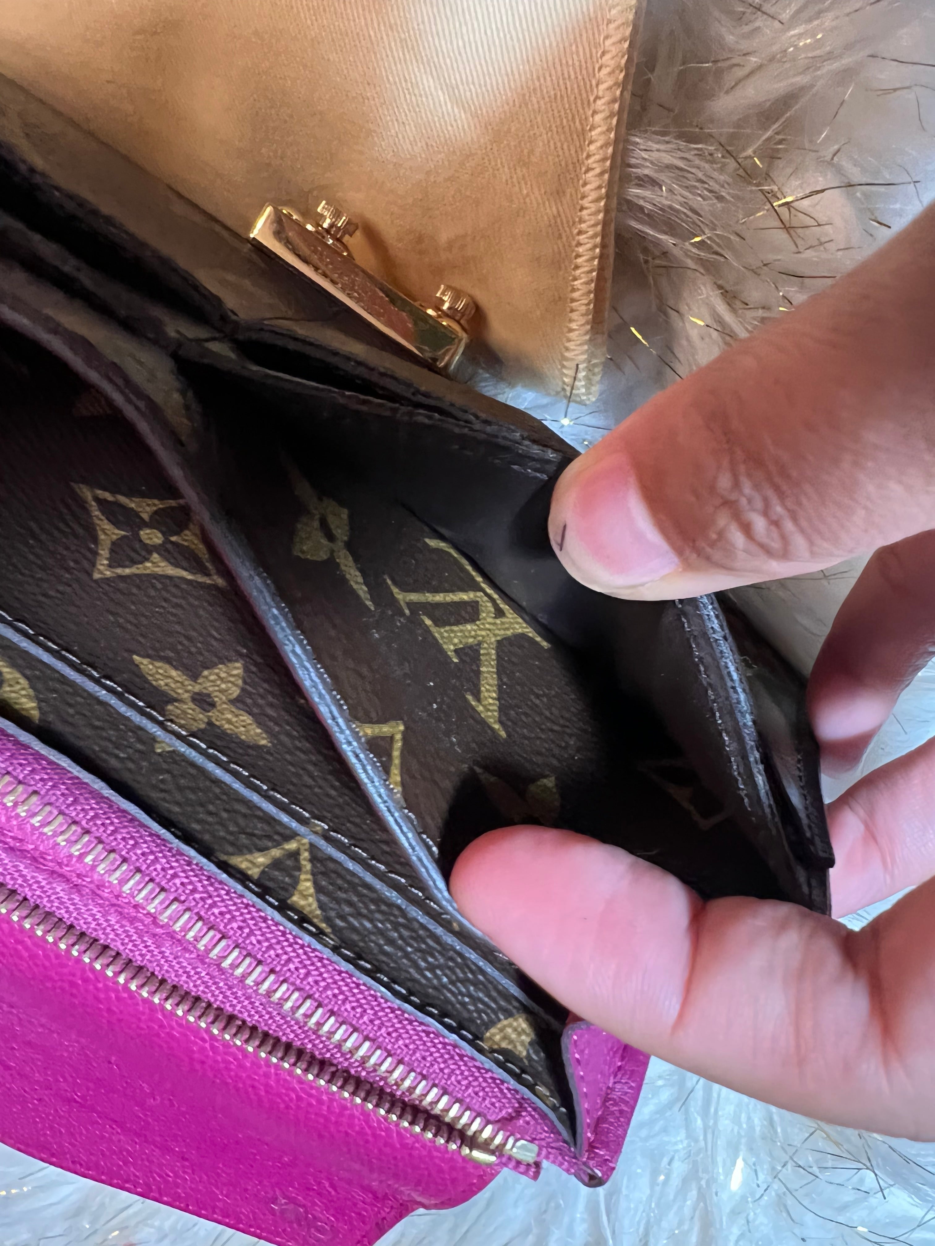 Elevate your style with this Louis Vuitton wallet. Featuring a classic Fuchsia brown monogram design, it's perfect for any occasion. The interior adds a pop of color with its vibrant pink lining. A must-have accessory for fashion enthusiasts.