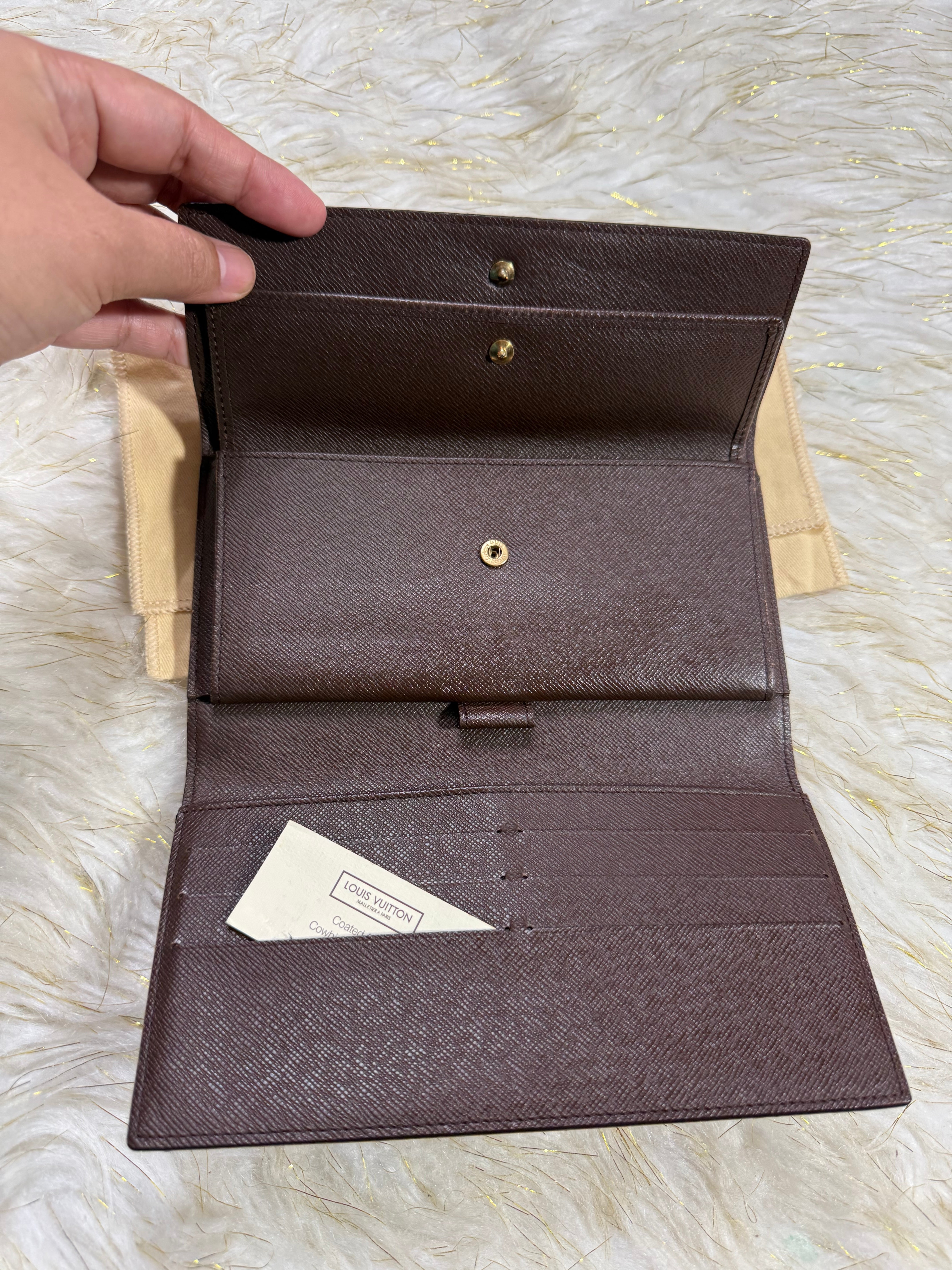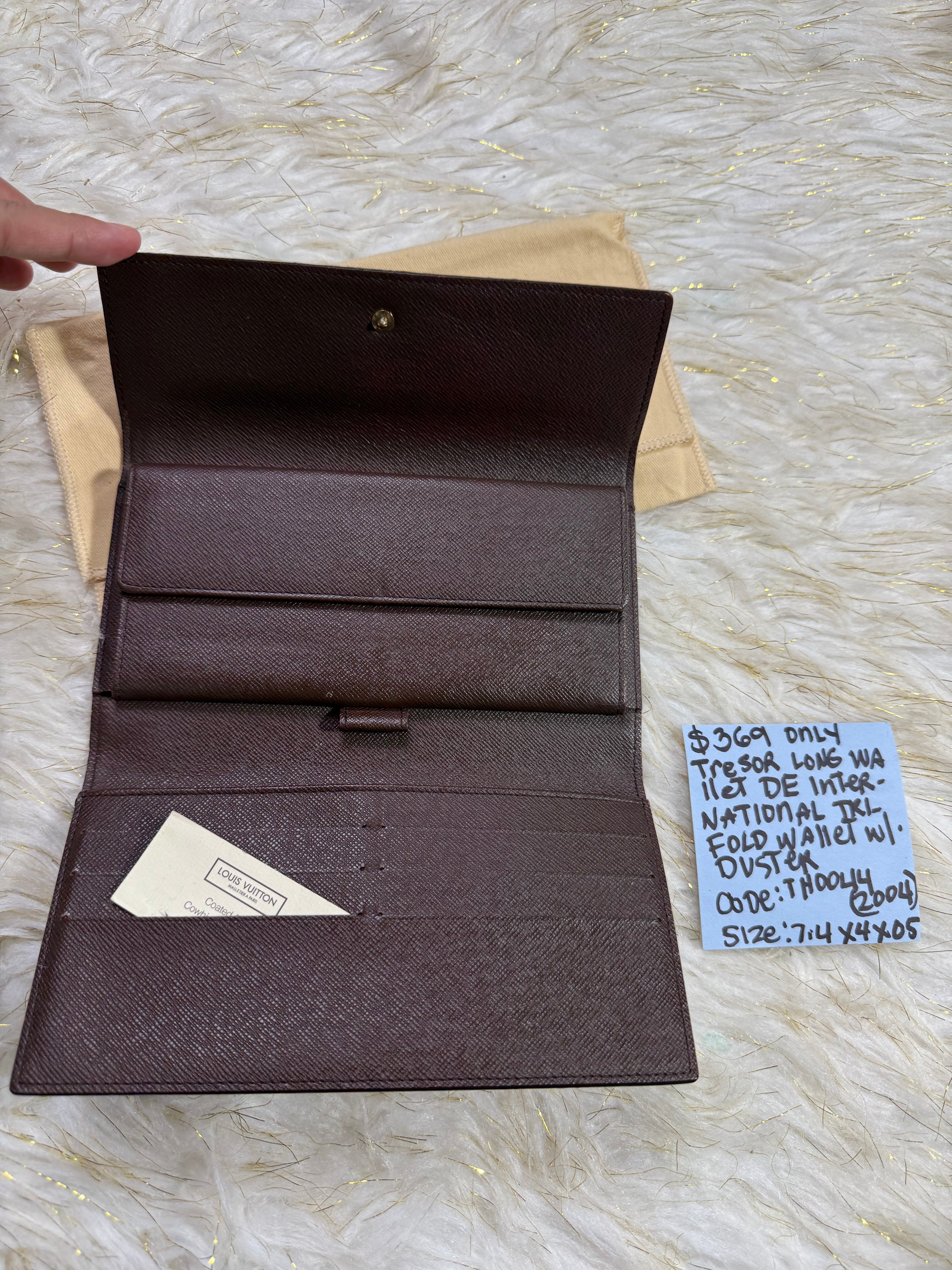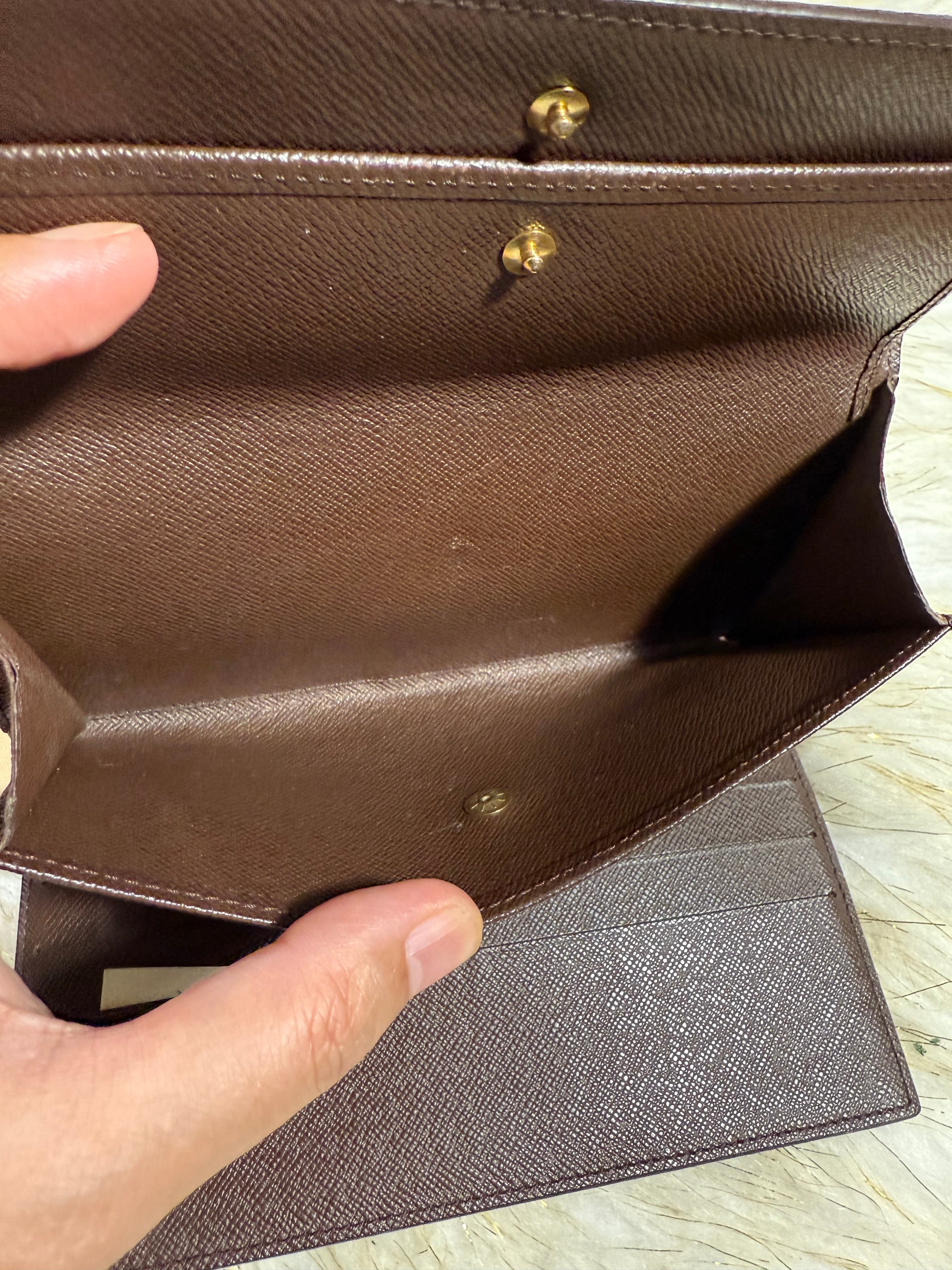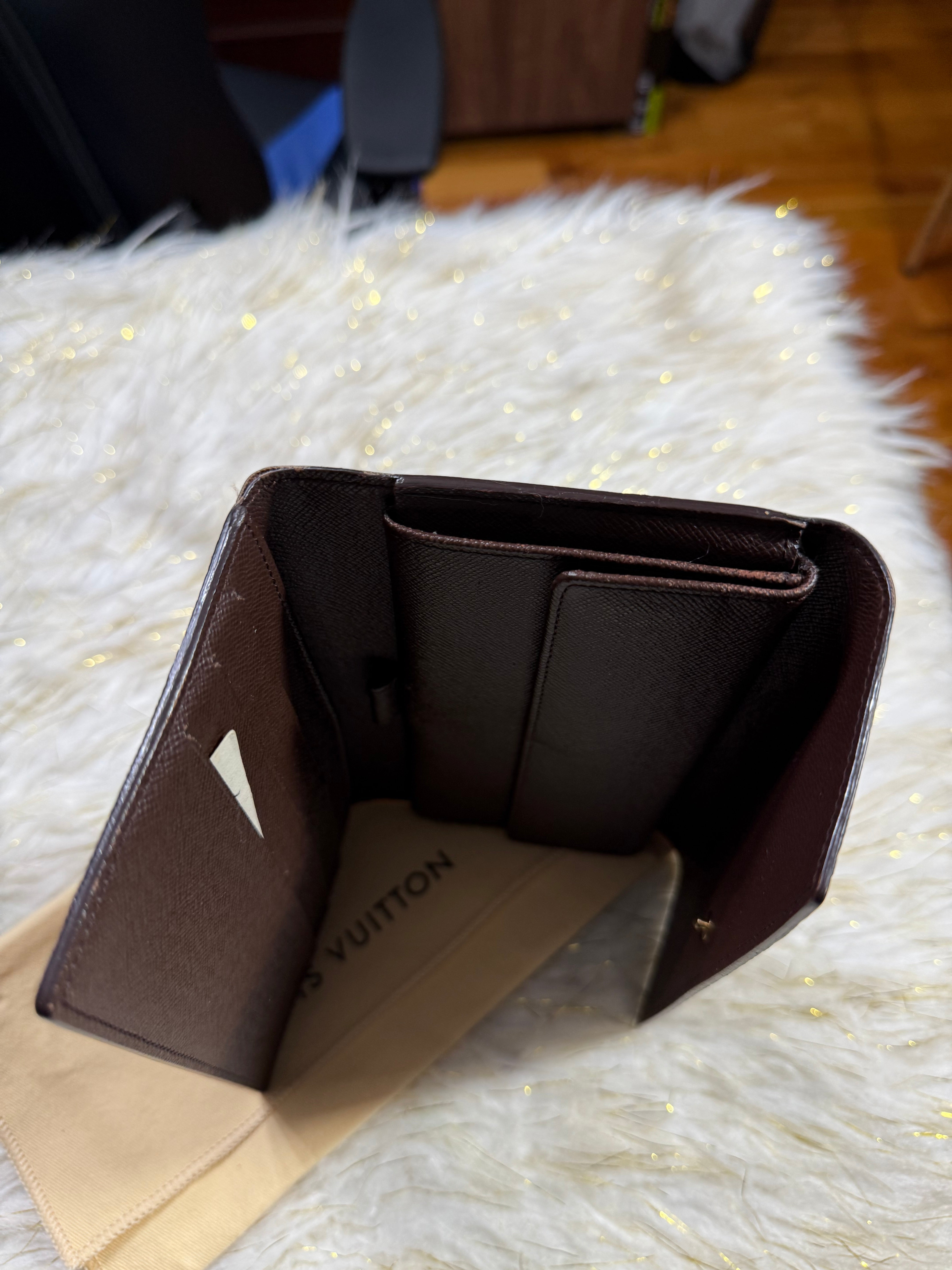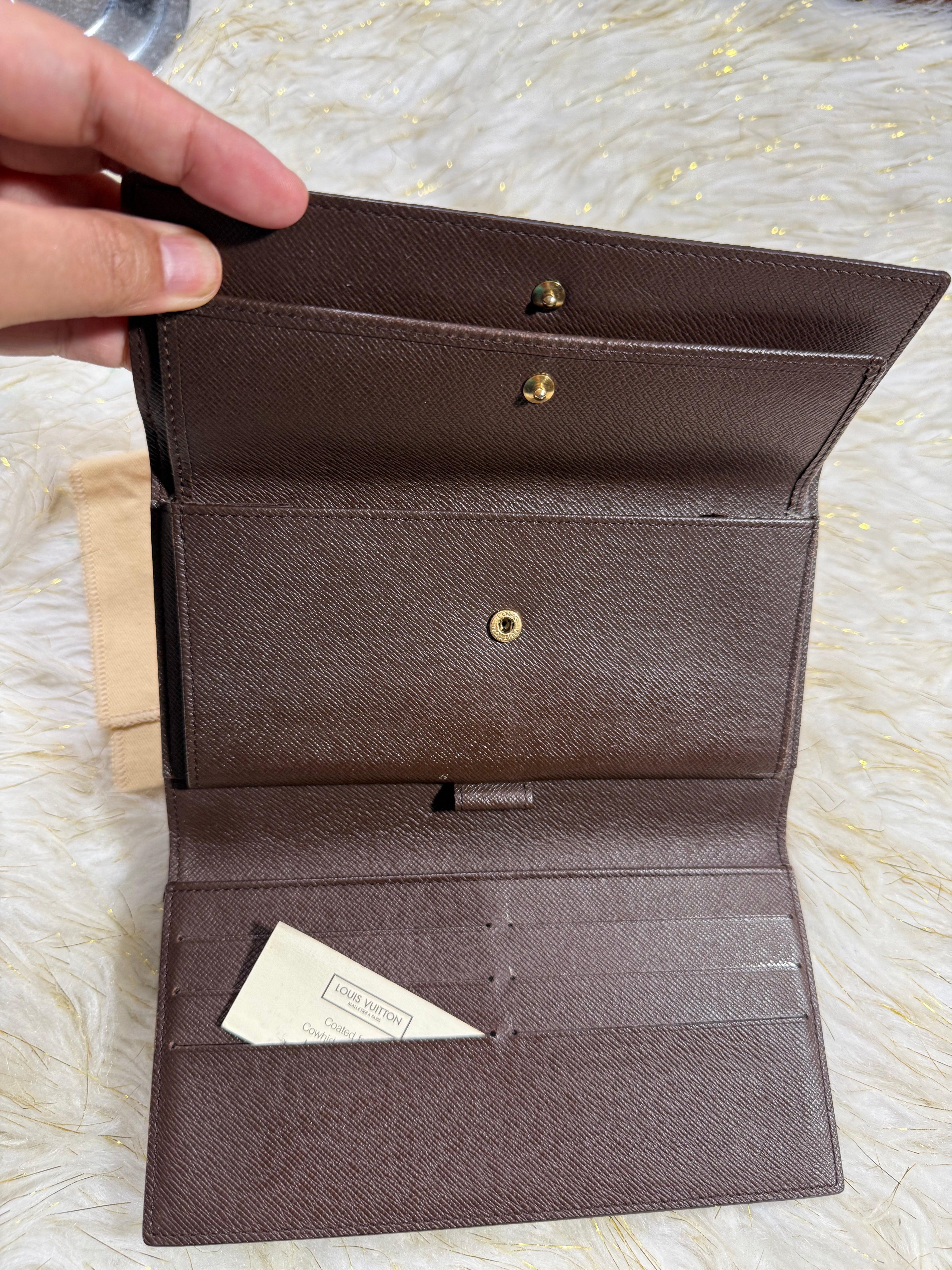 Check this Preloved Louis Vuitton Tresor Trifold DE Damier ebeneu wallet if you want long wallet this one is so perfect for ur bag to be match With duster included.
