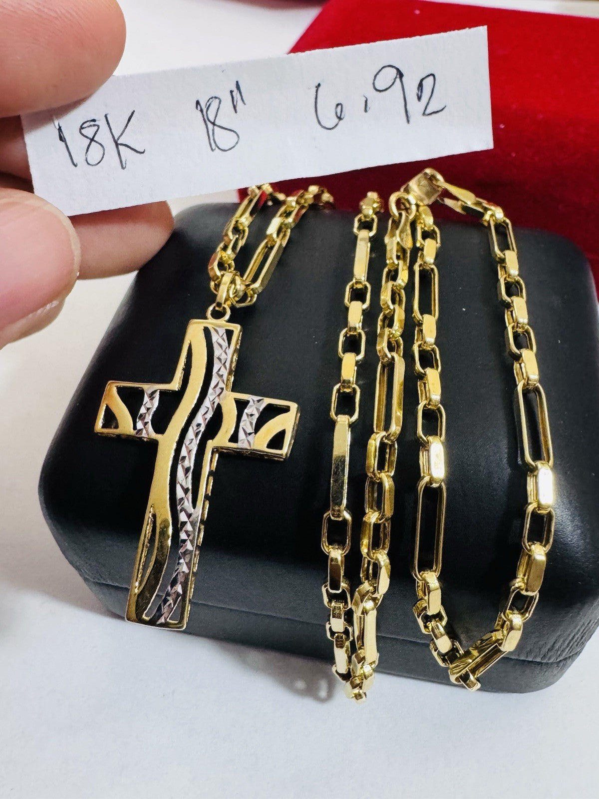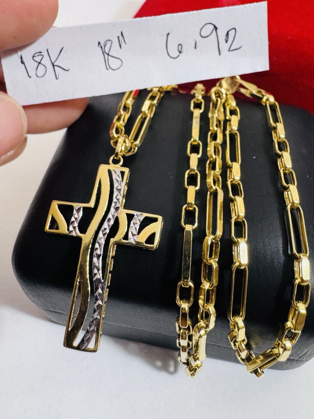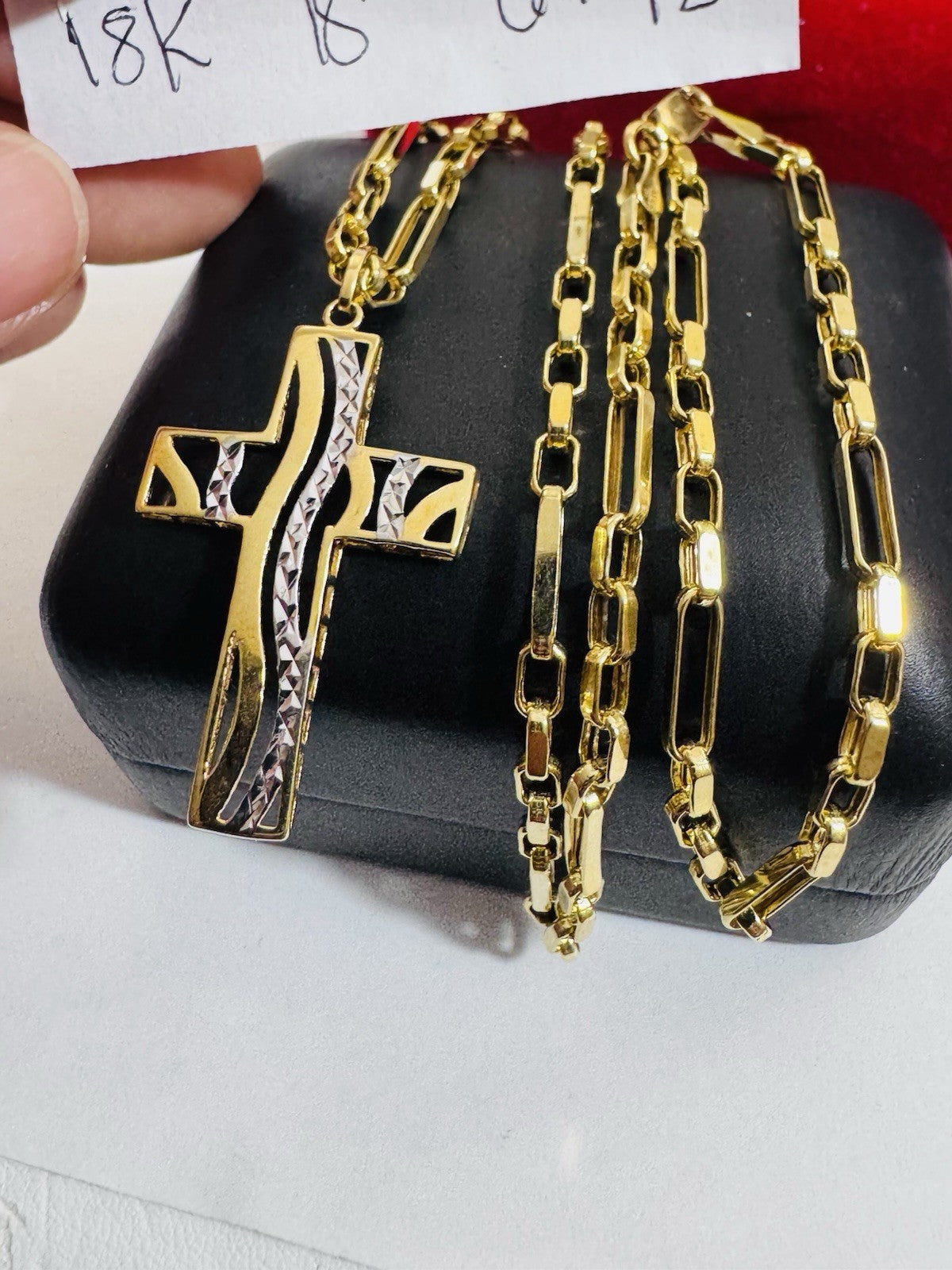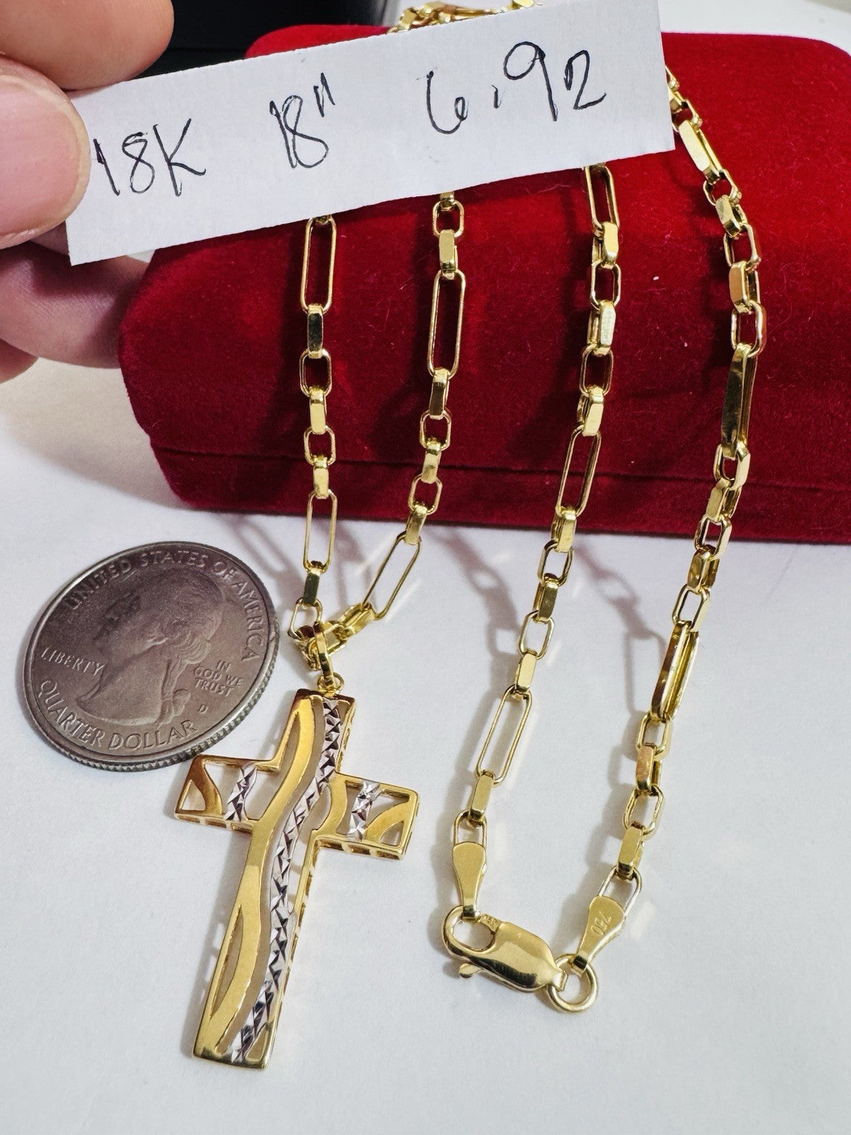 18K 750 Fine Genuine Real Pure Gold Two tone Cross Necklace 18” inch 3mm 6.9g