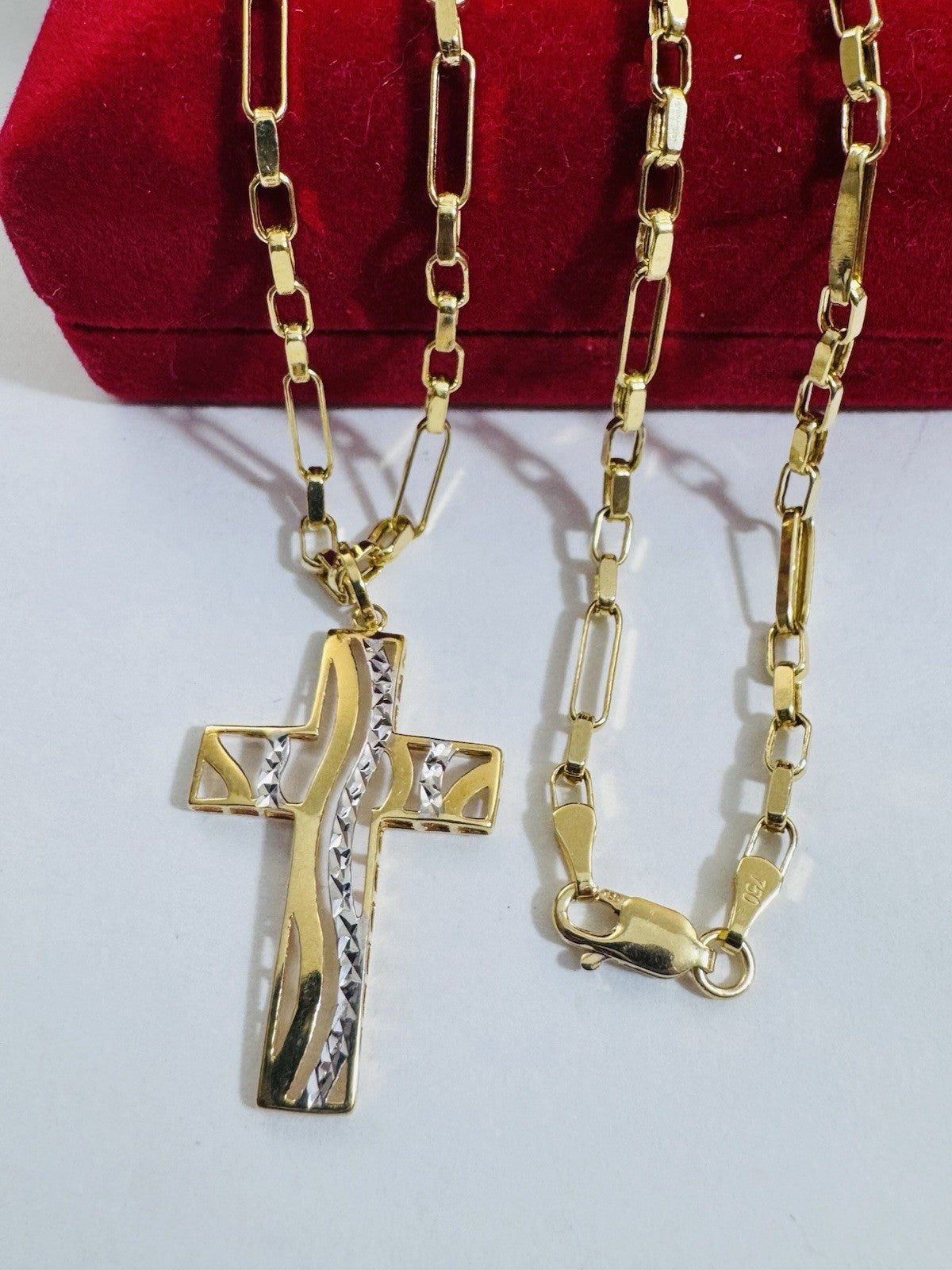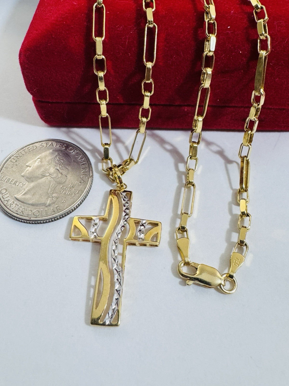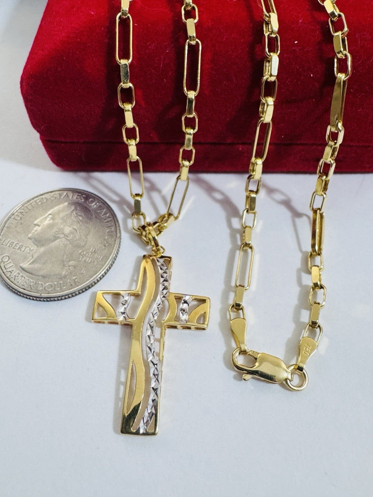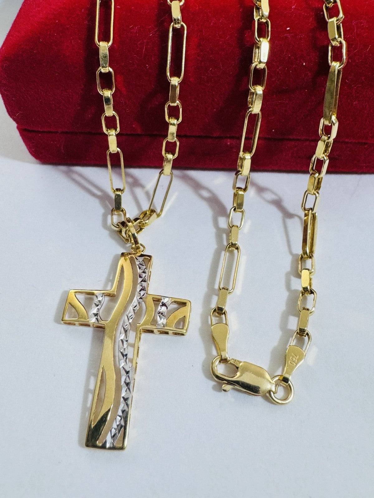 18K 750 Fine Genuine Real Pure Gold Two tone Cross Necklace 18” inch 3mm 6.9g
