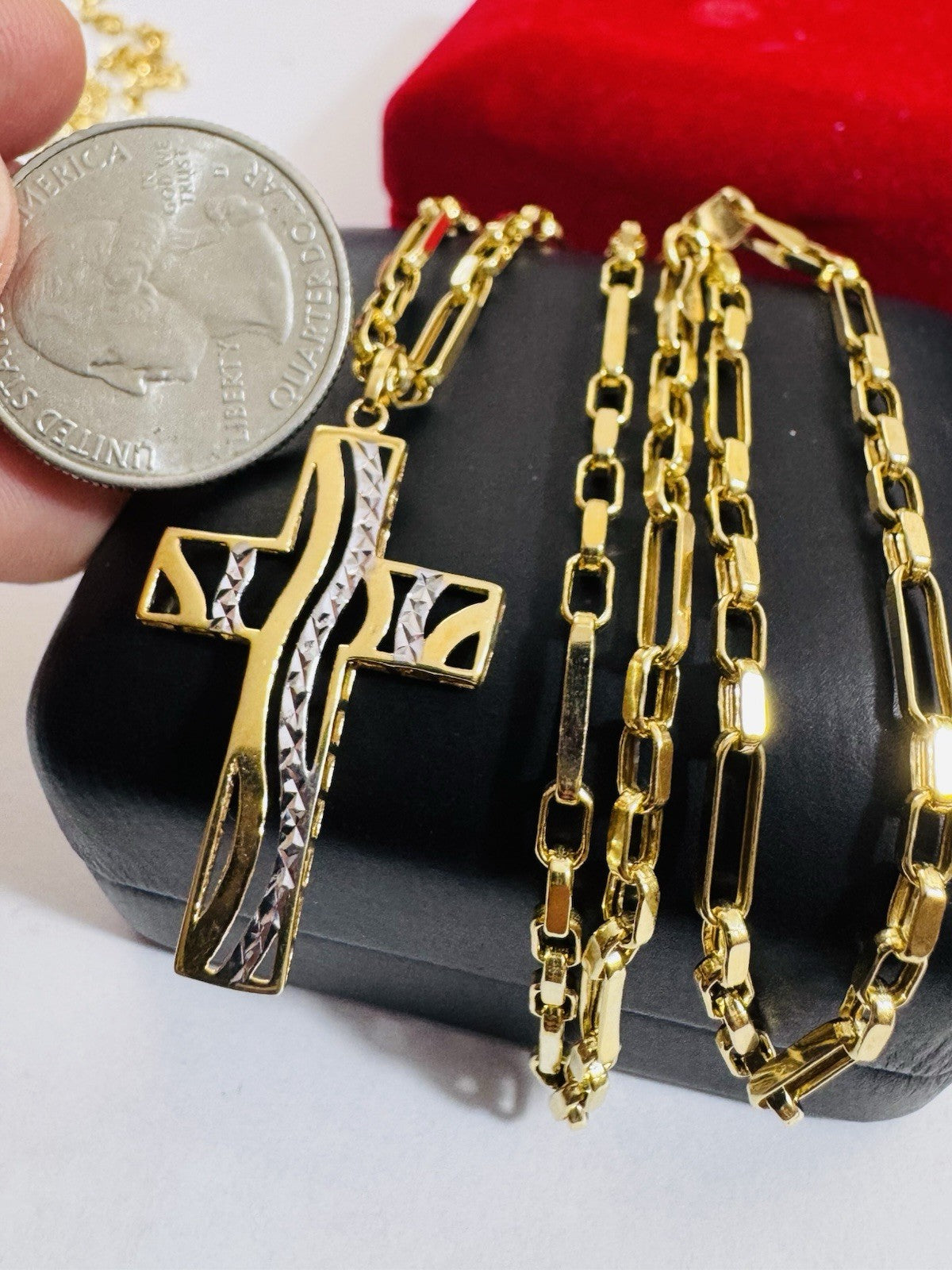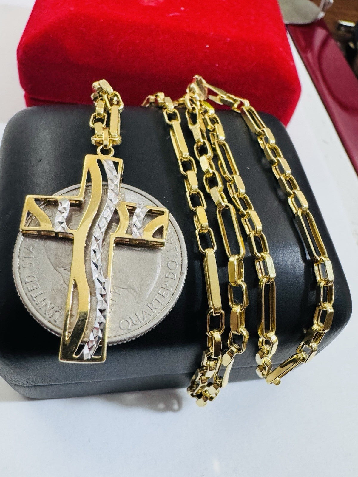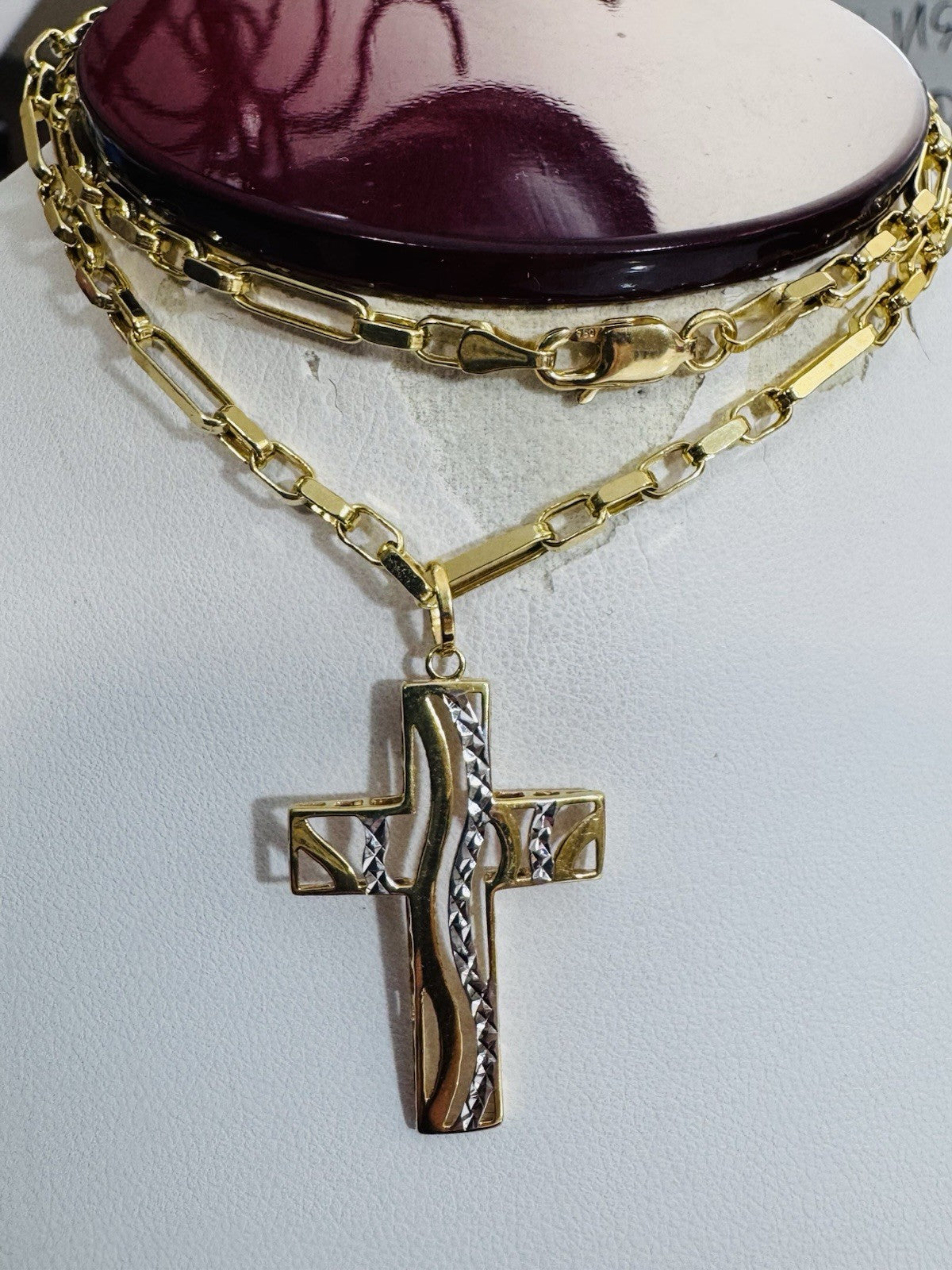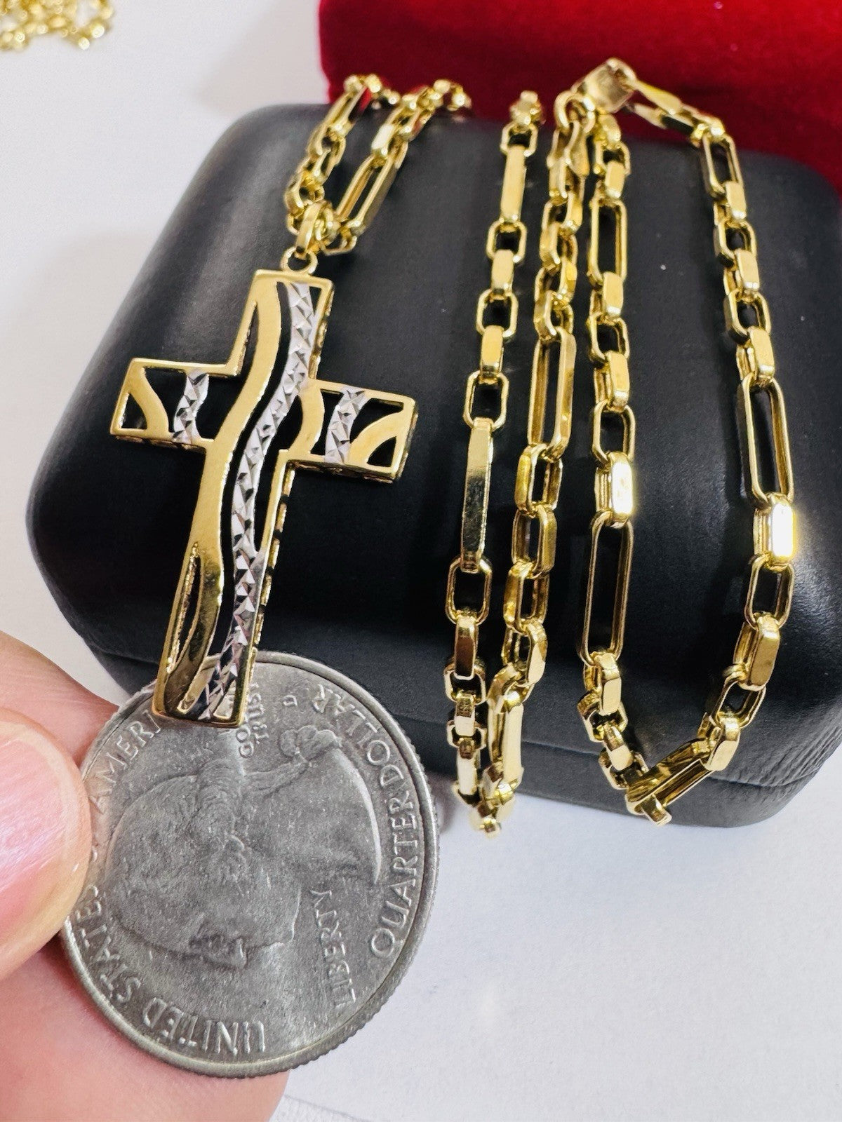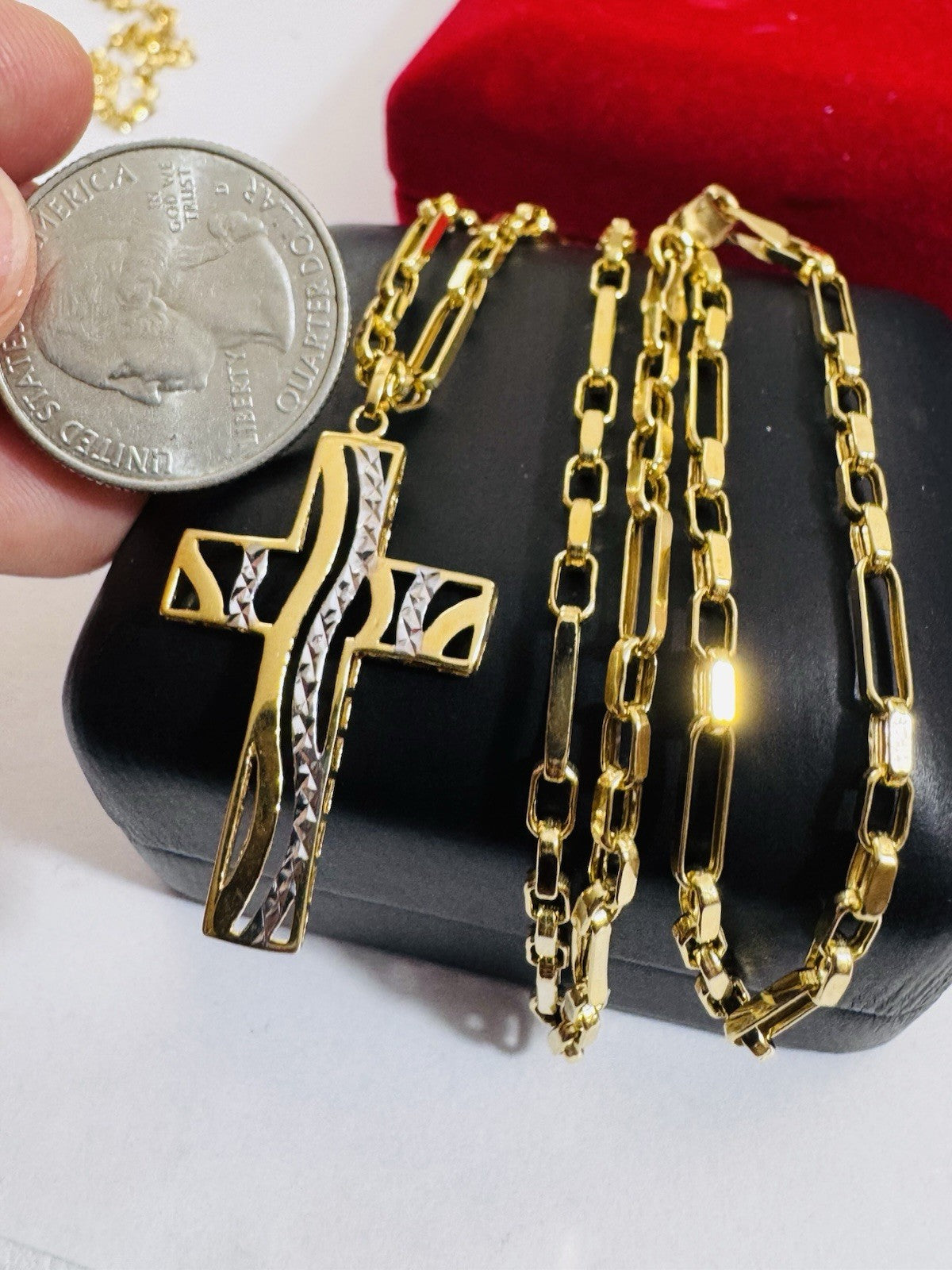 18K 750 Fine Genuine Real Pure Gold Two tone Cross Necklace 18” inch 3mm 6.9g