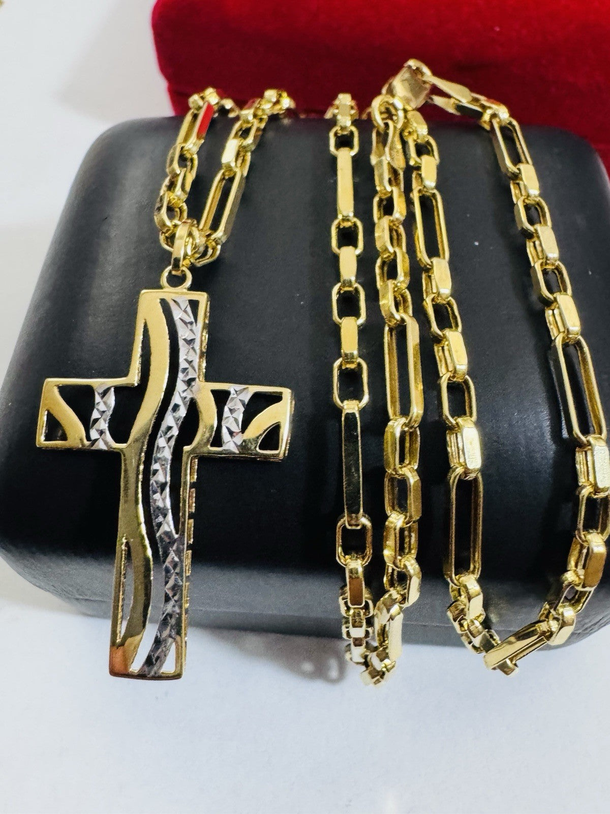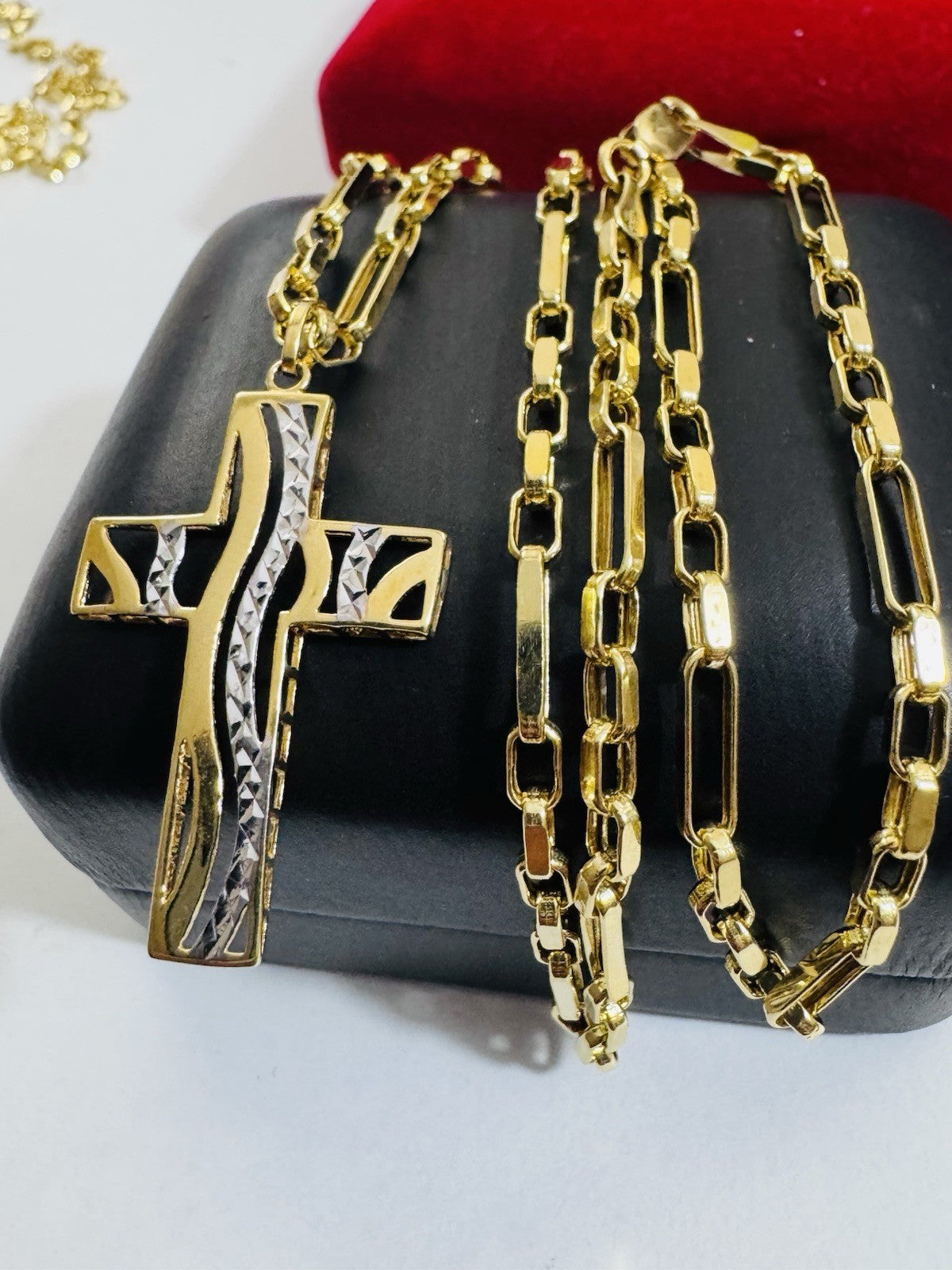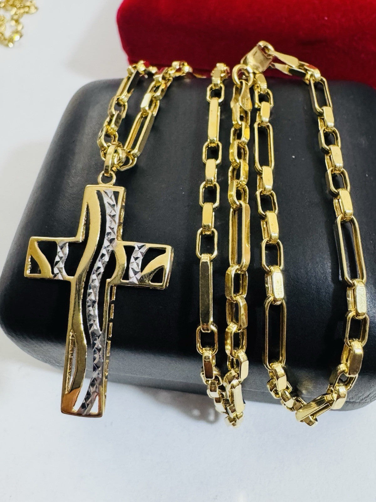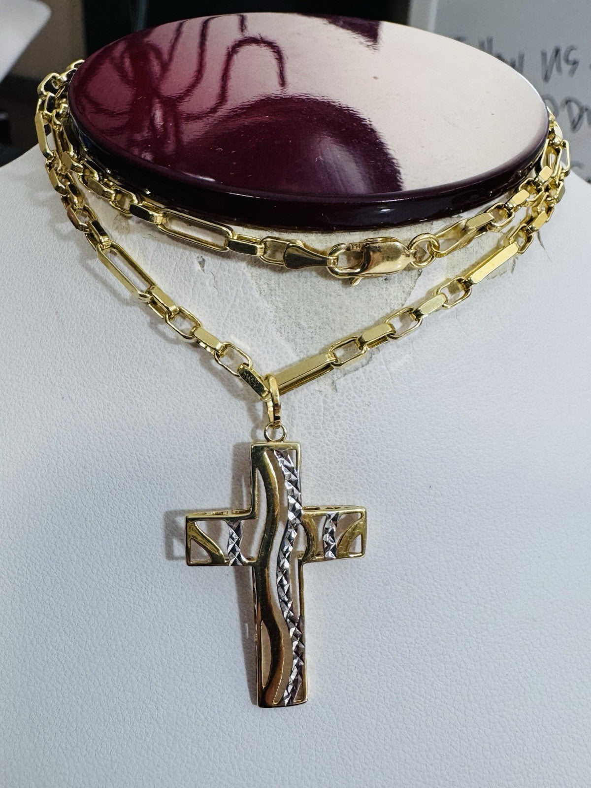 18K 750 Fine Genuine Real Pure Gold Two tone Cross Necklace 18” inch 3mm 6.9g