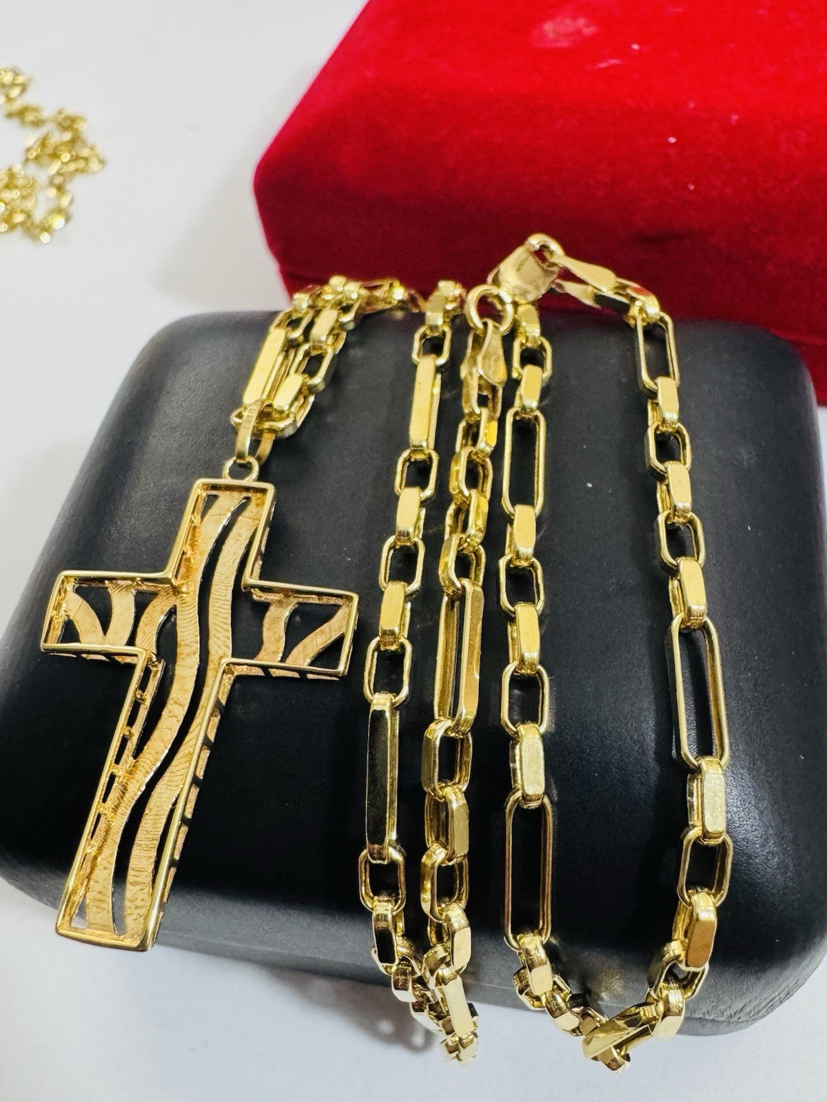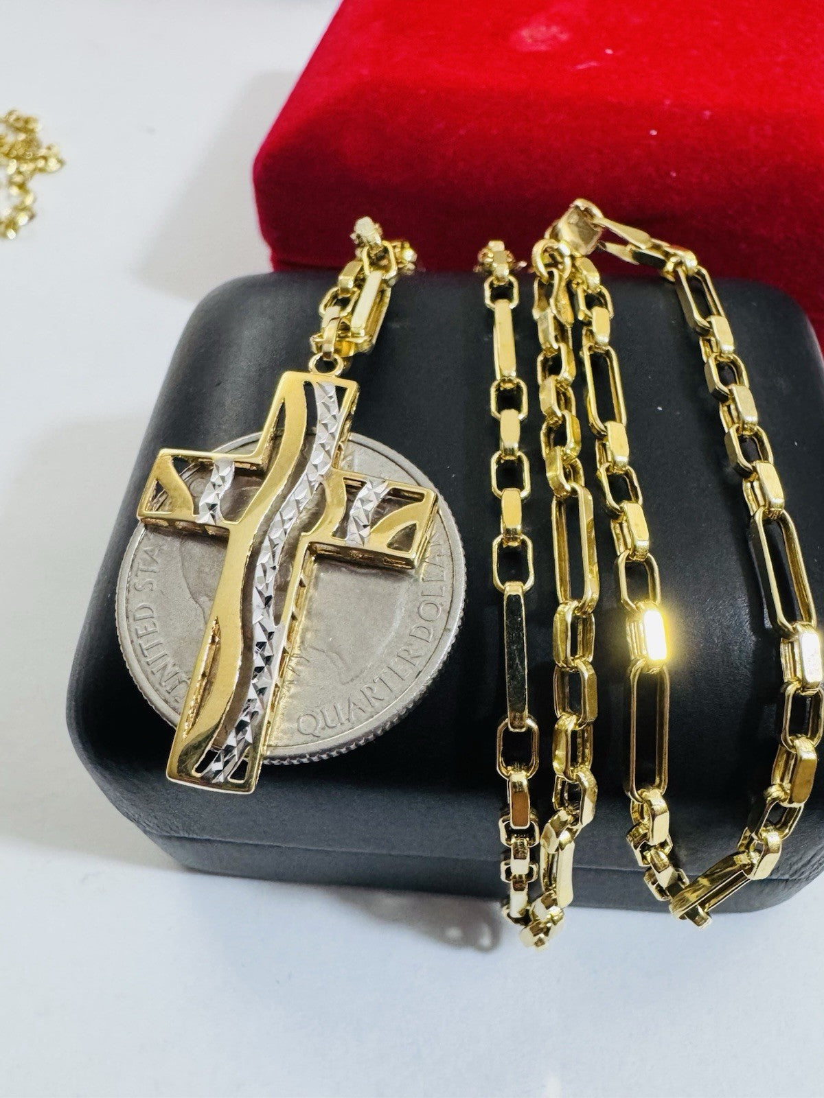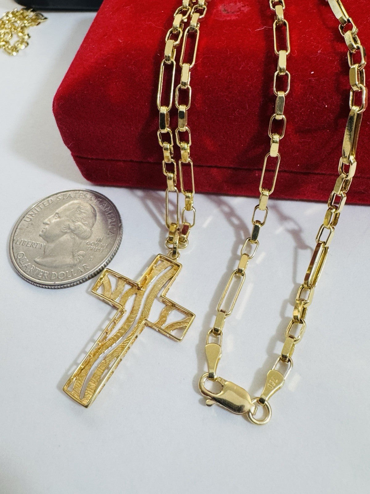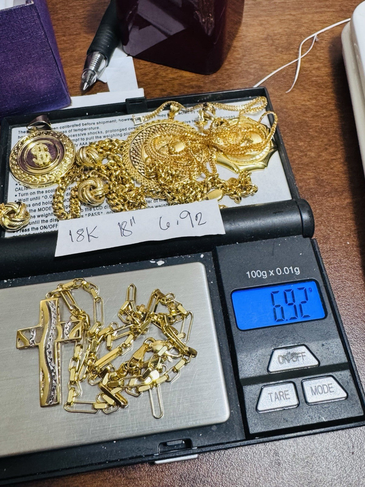 18K 750 Fine Genuine Real Pure Gold Two tone Cross Necklace 18” inch 3mm 6.9g